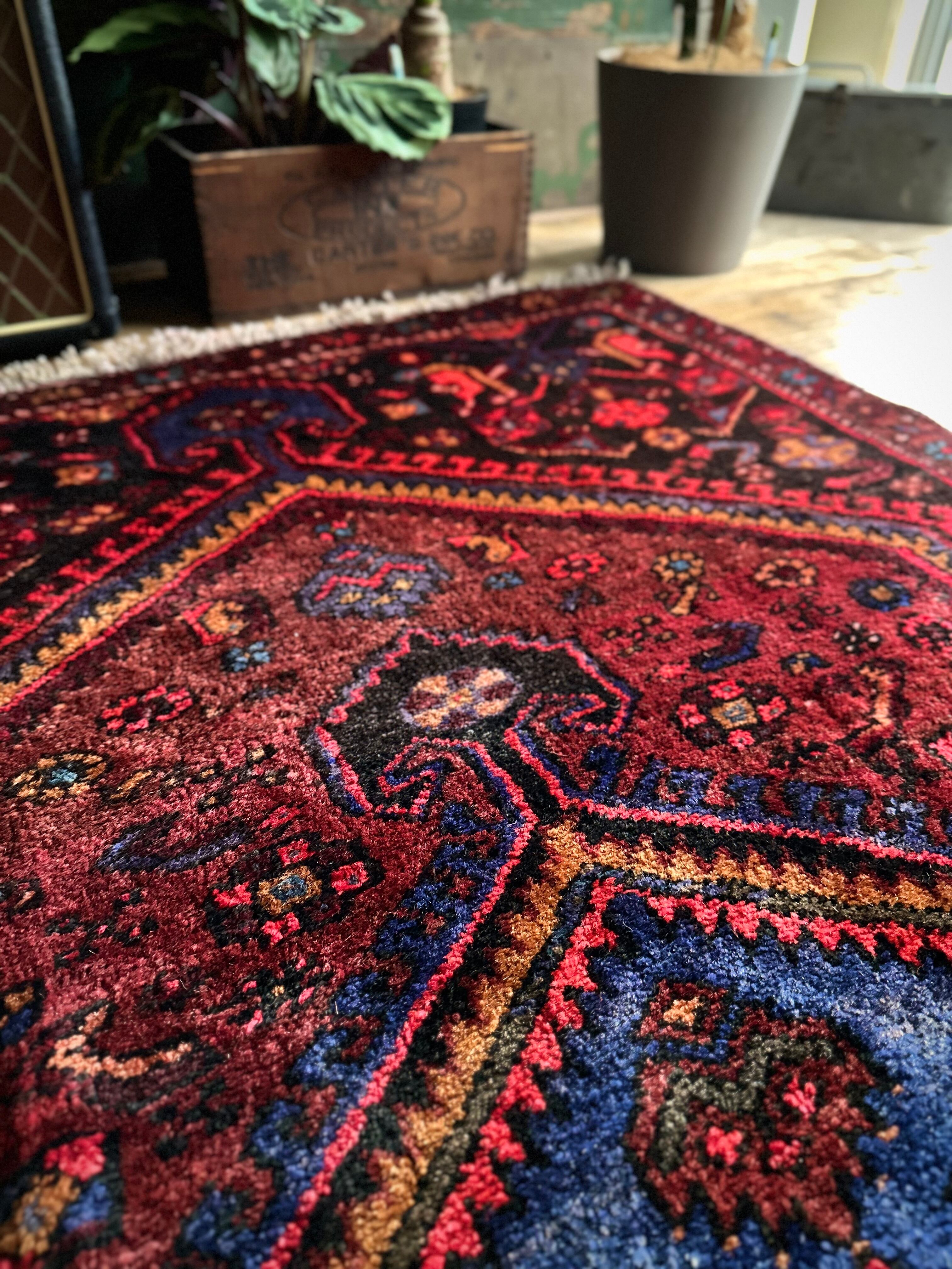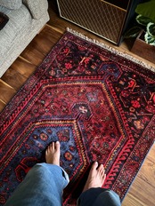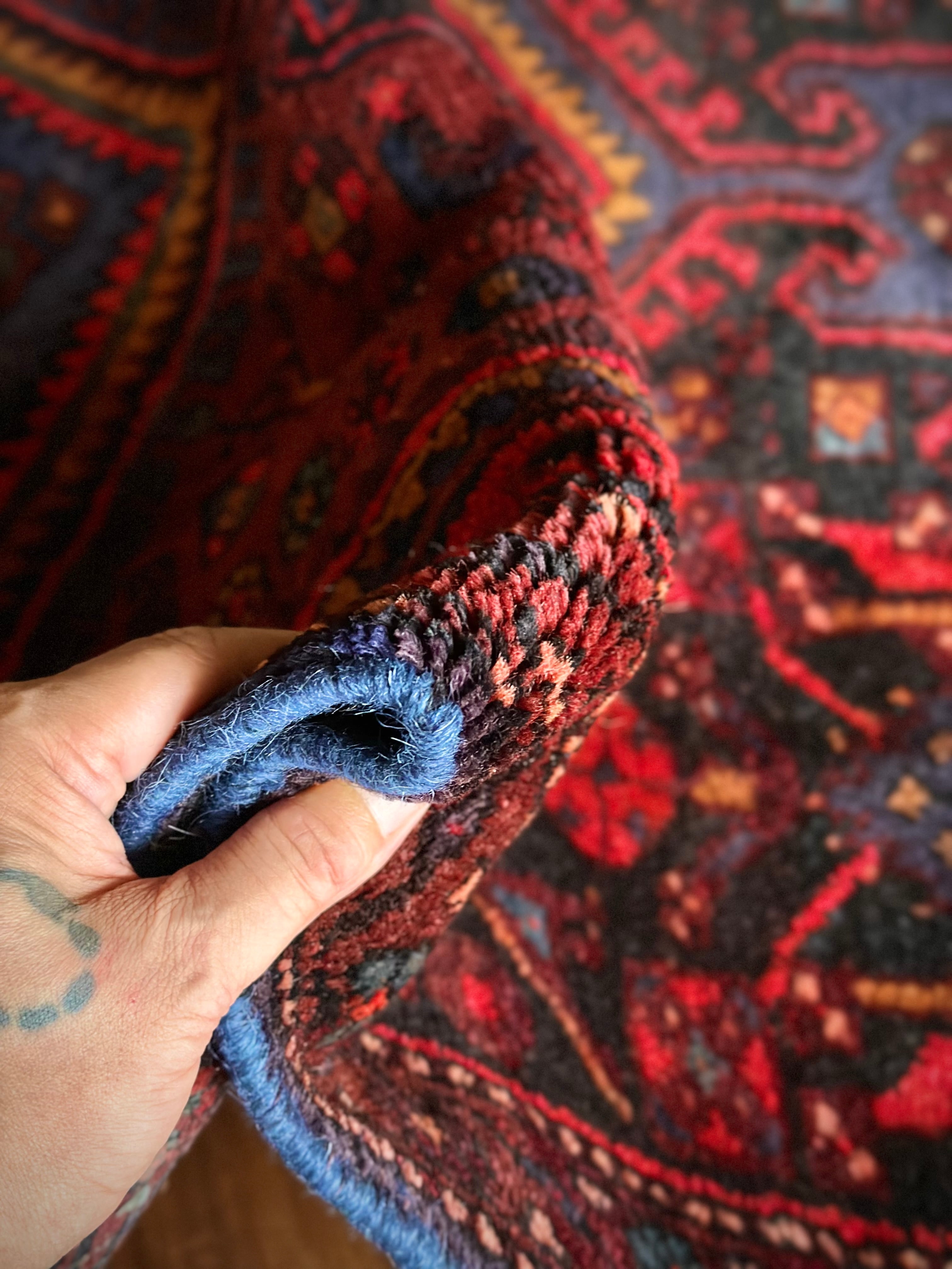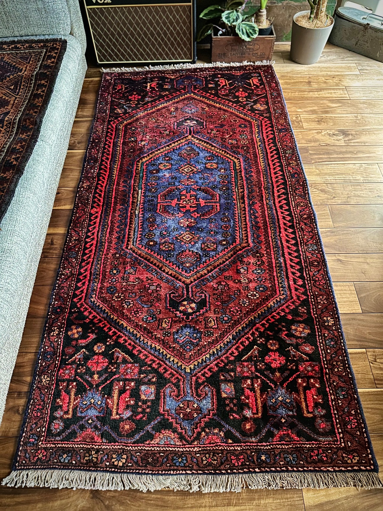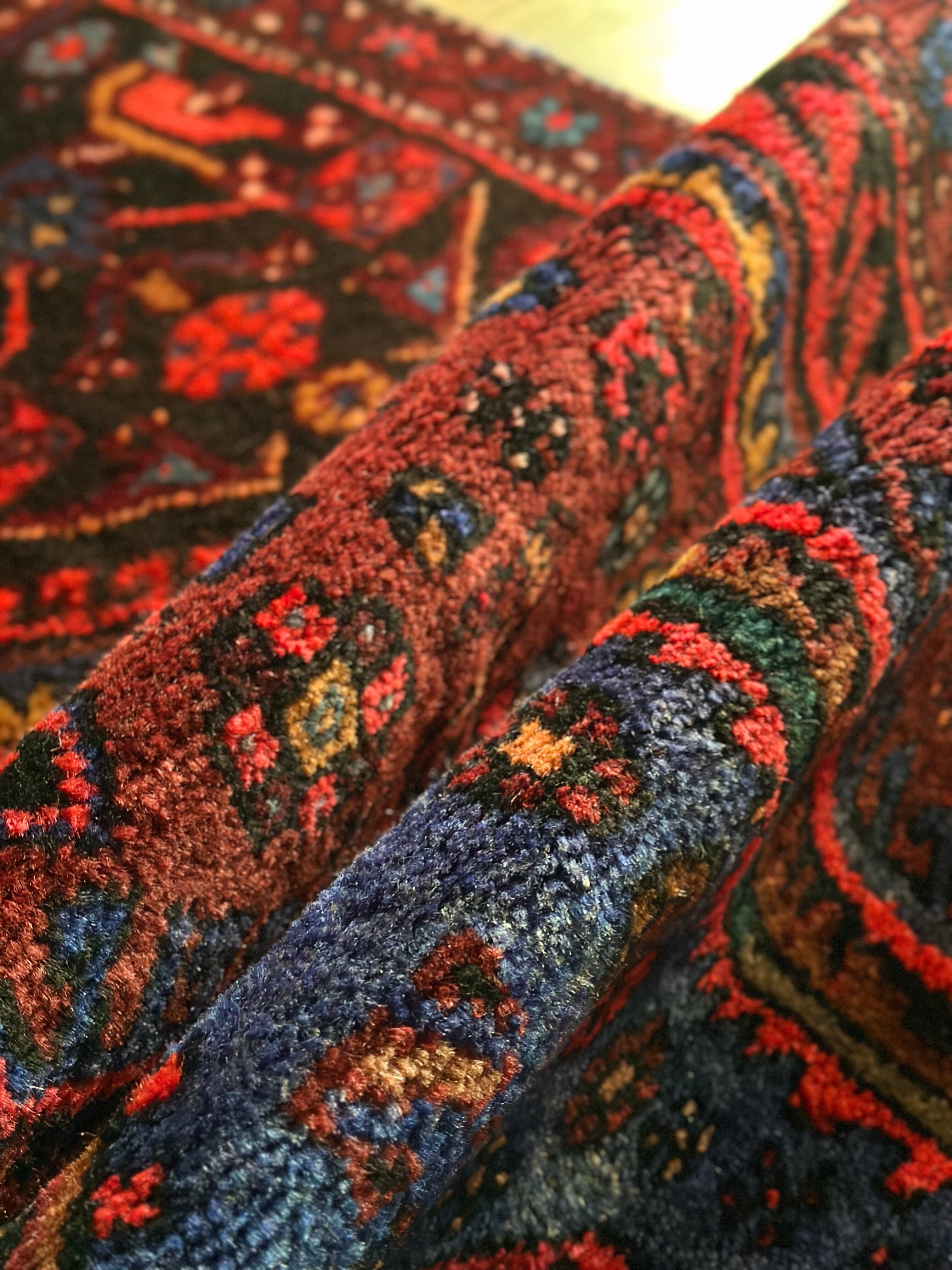 織りはハマダン産と同じくガシッとしたシングル・ウェフトで、10ミリという分厚さに密度がありパイル自体もフサフサした1枚となり、大きさに的には三人掛けソファ前やベッドサイドに適したサイズ感になります。