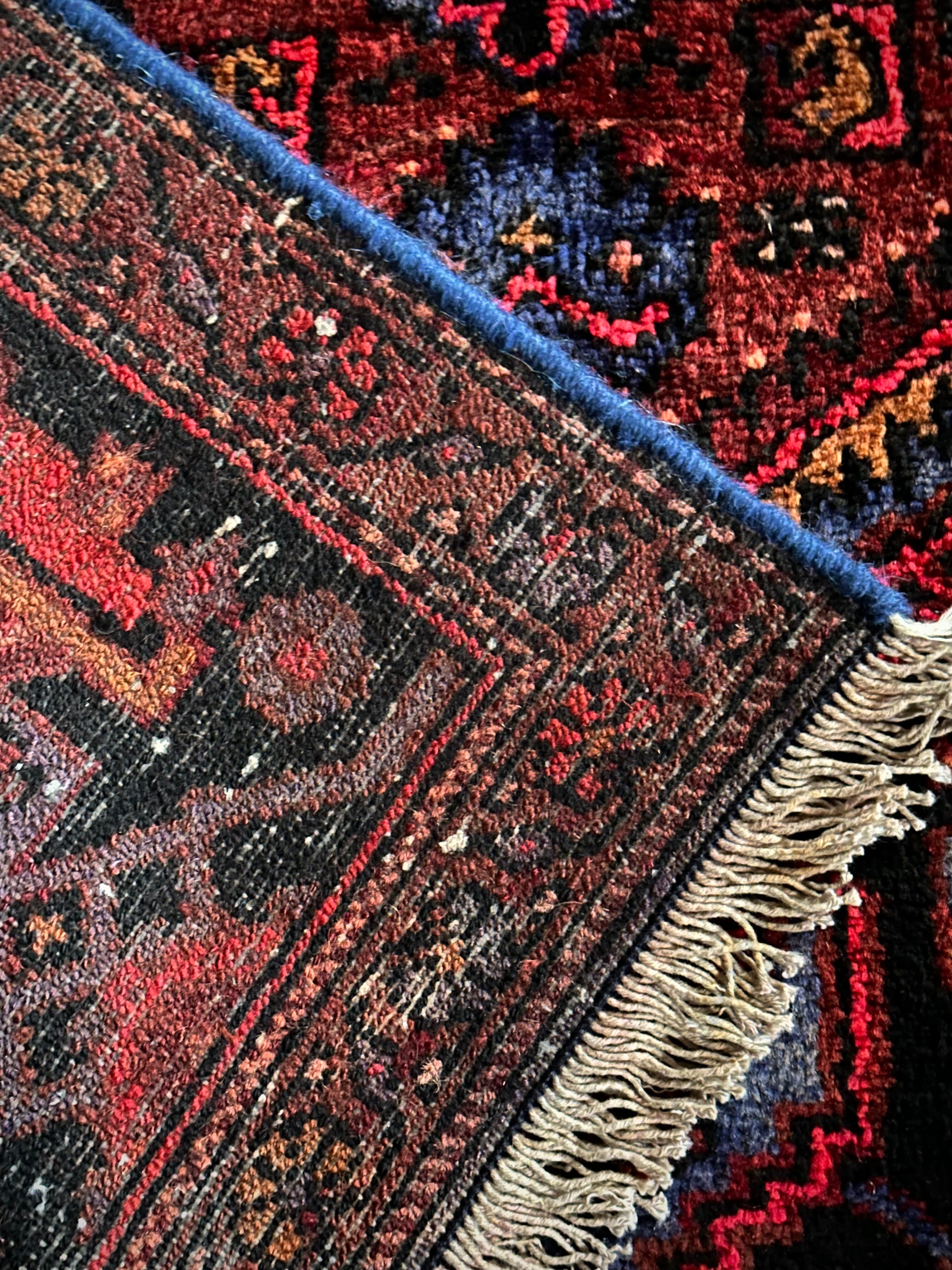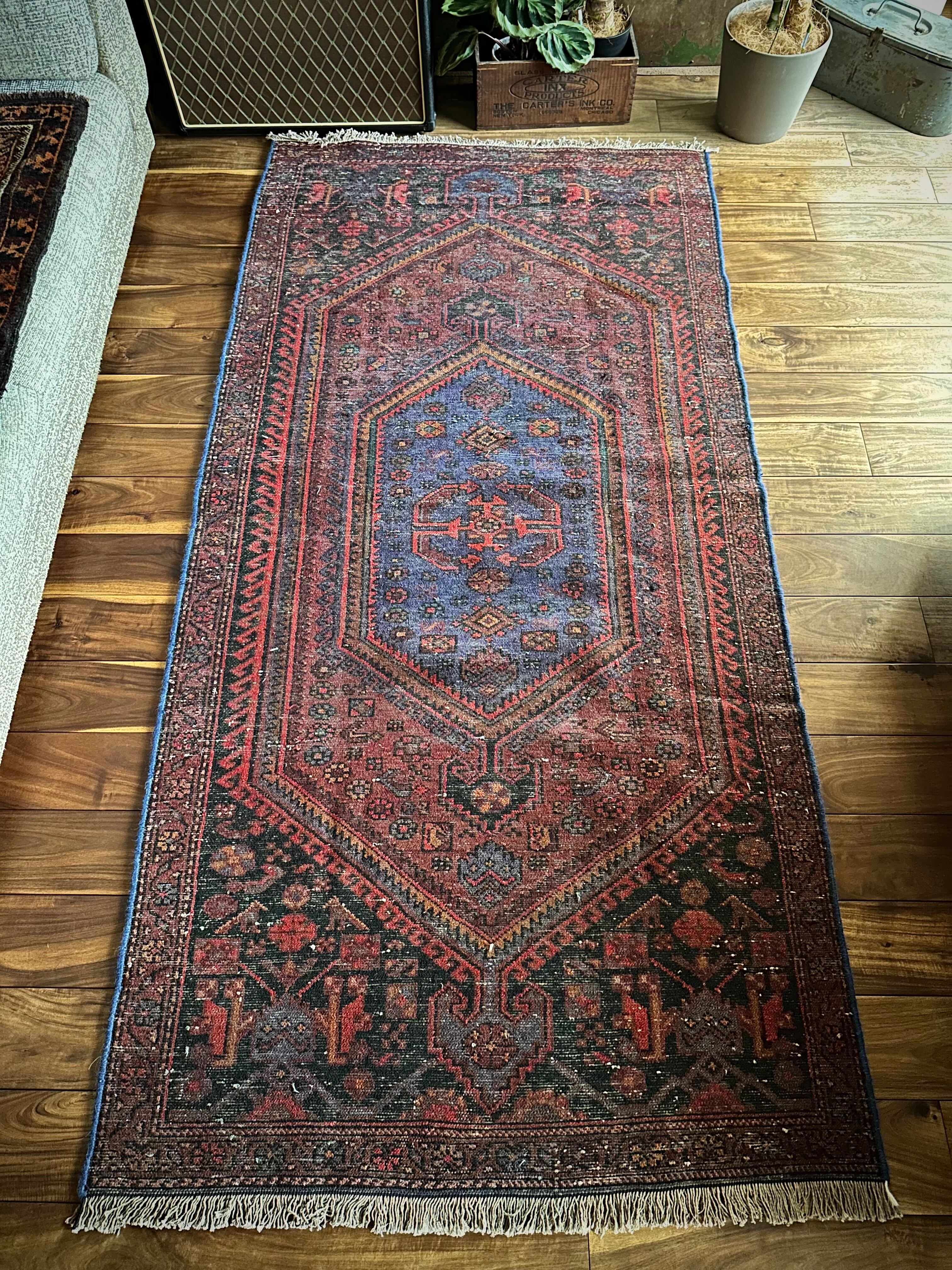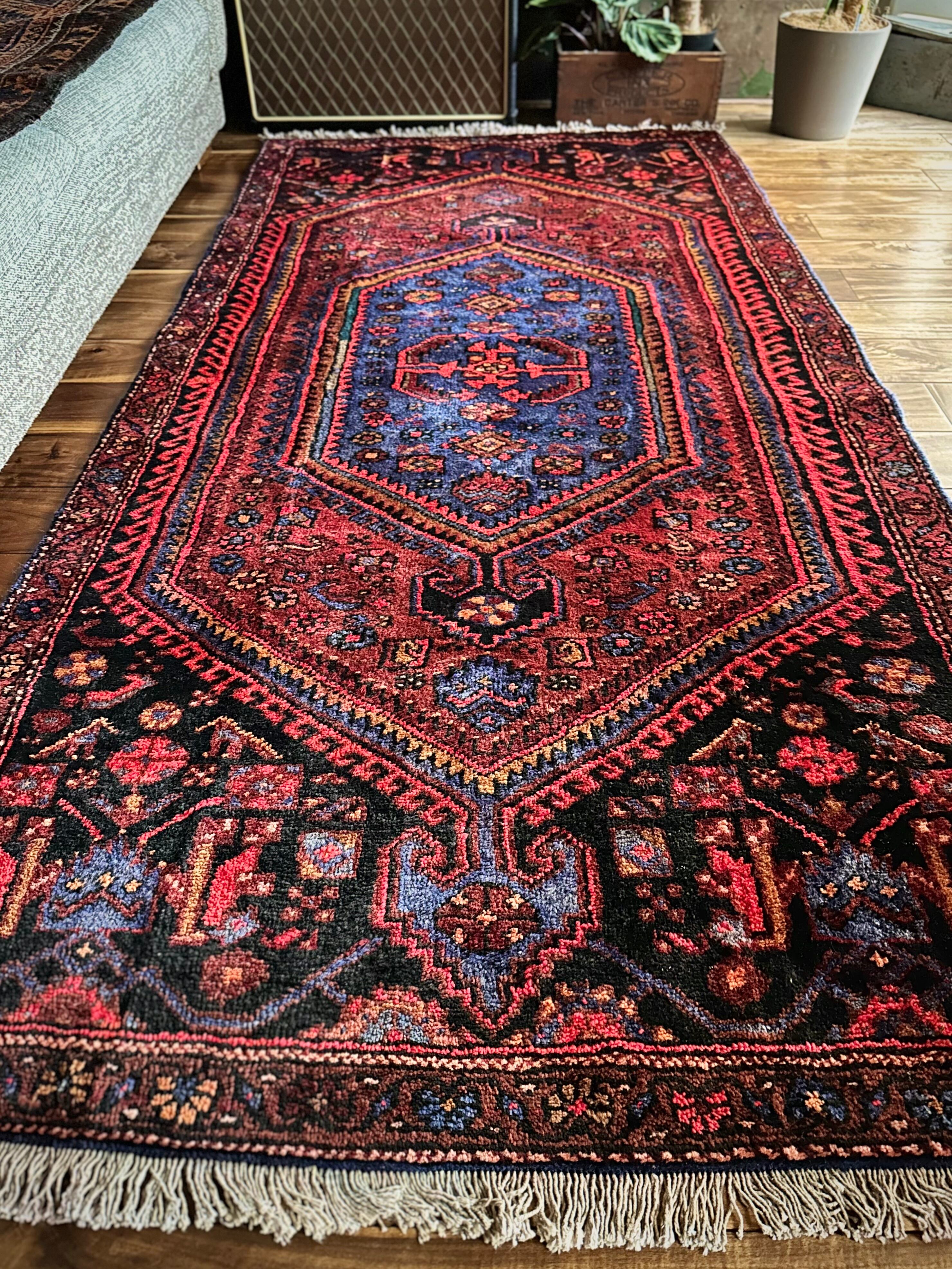 ブラック&ブルーにバーガンディの渋い色合いでまとめられたイラン西部に位置するザンジャンからのヴィレッジラグで、その土地ならではの六角形のメダリオンが特徴的なかっこいい1枚になります。