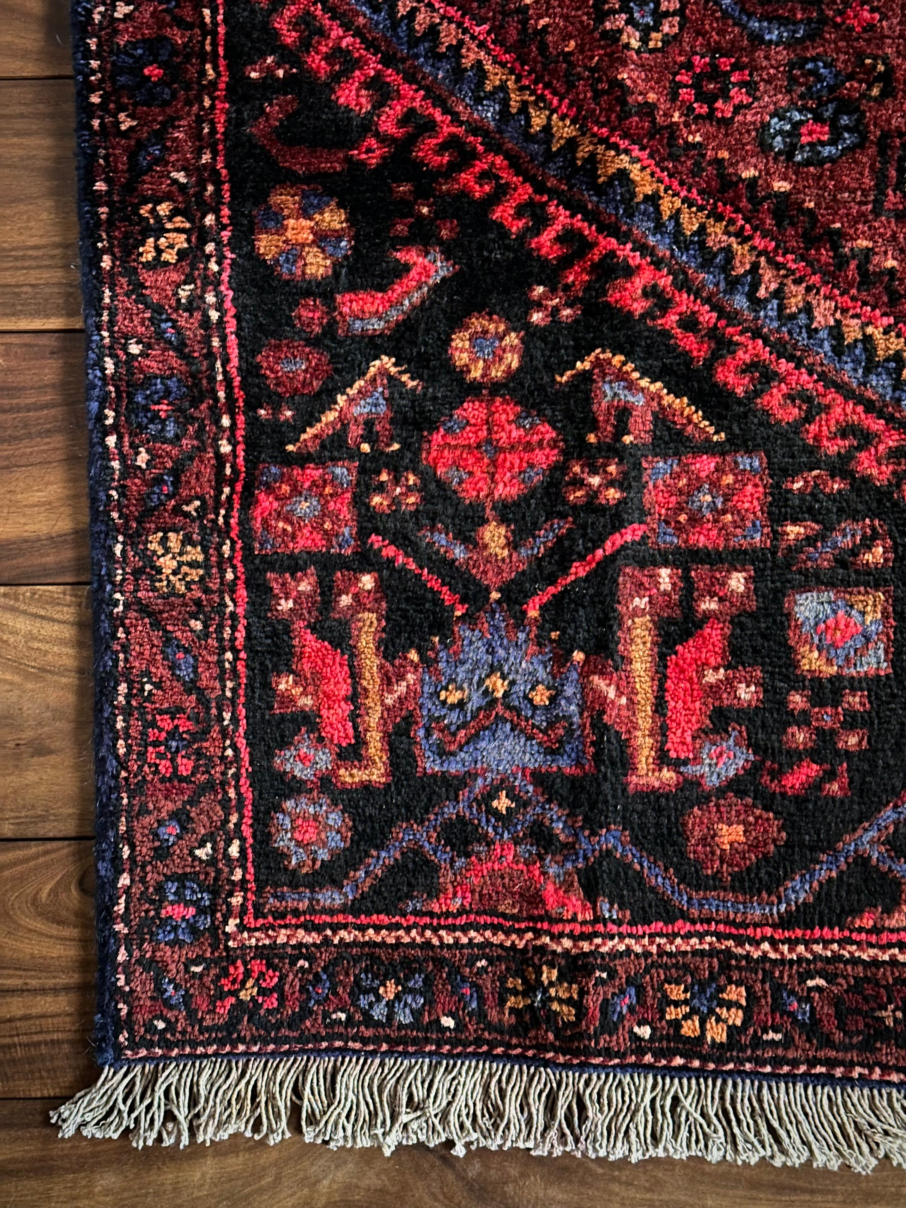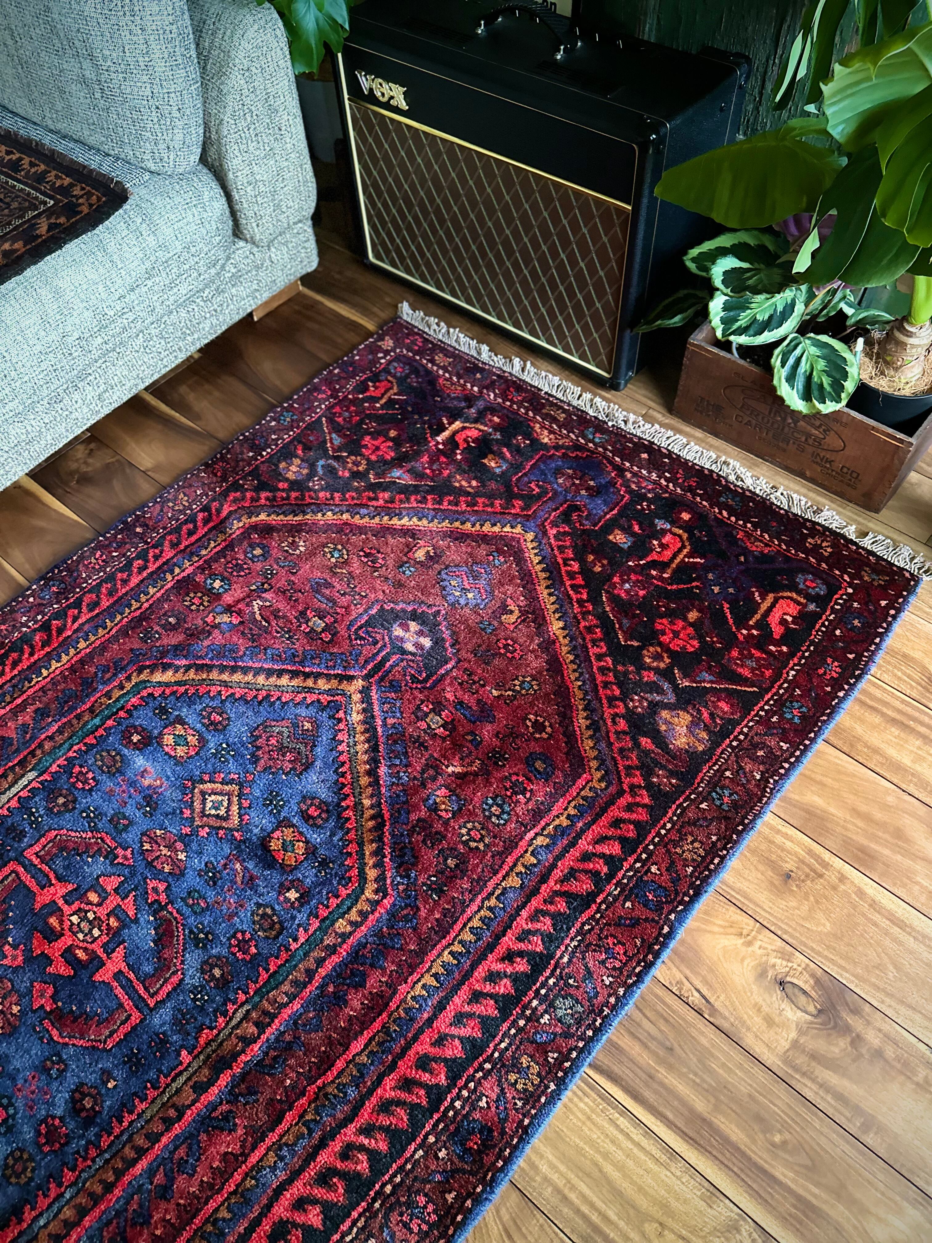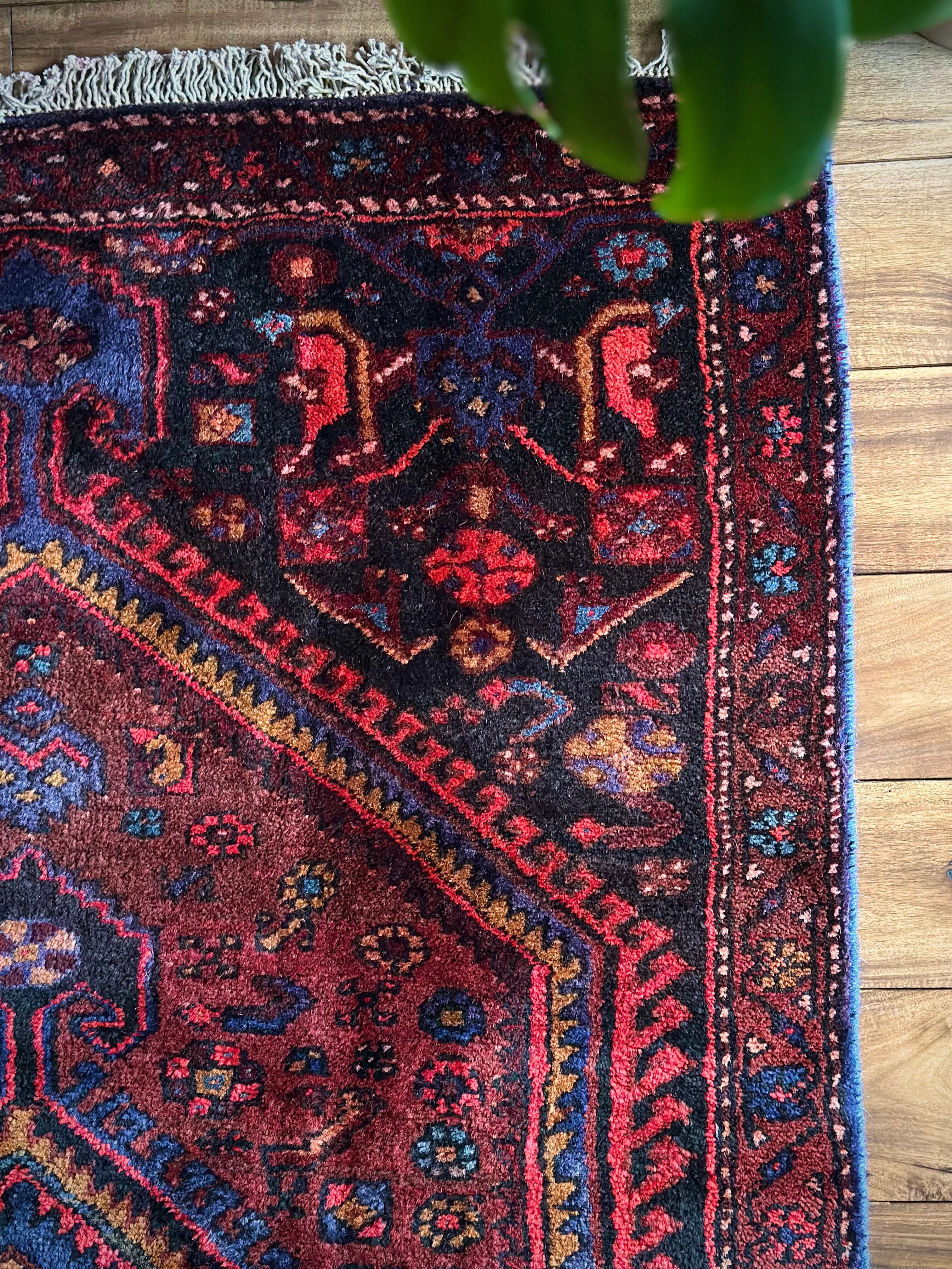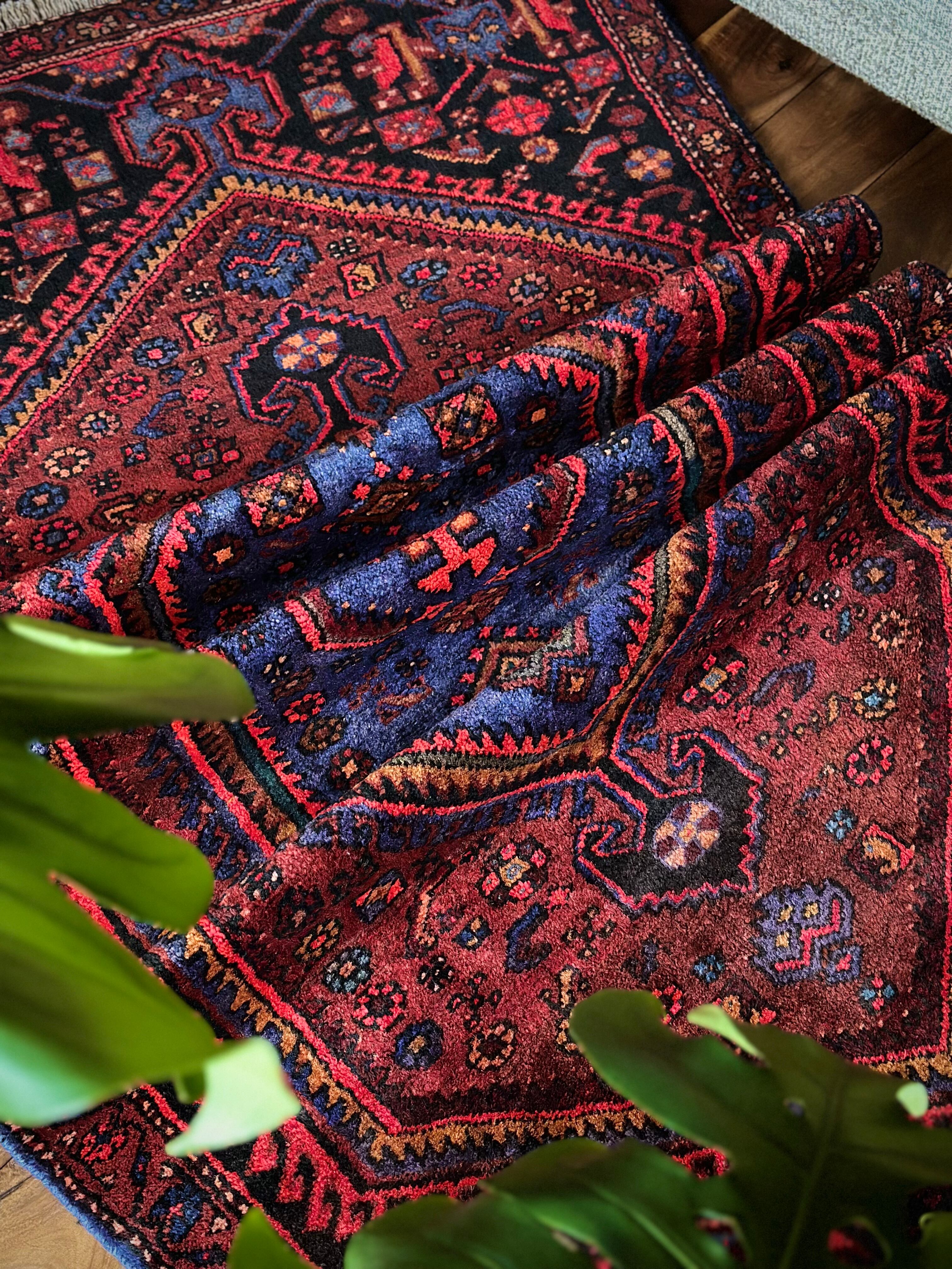 ブラック&ブルーにバーガンディの渋い色合いでまとめられたイラン西部に位置するザンジャンからのヴィレッジラグで、その土地ならではの六角形のメダリオンが特徴的なかっこいい1枚になります。