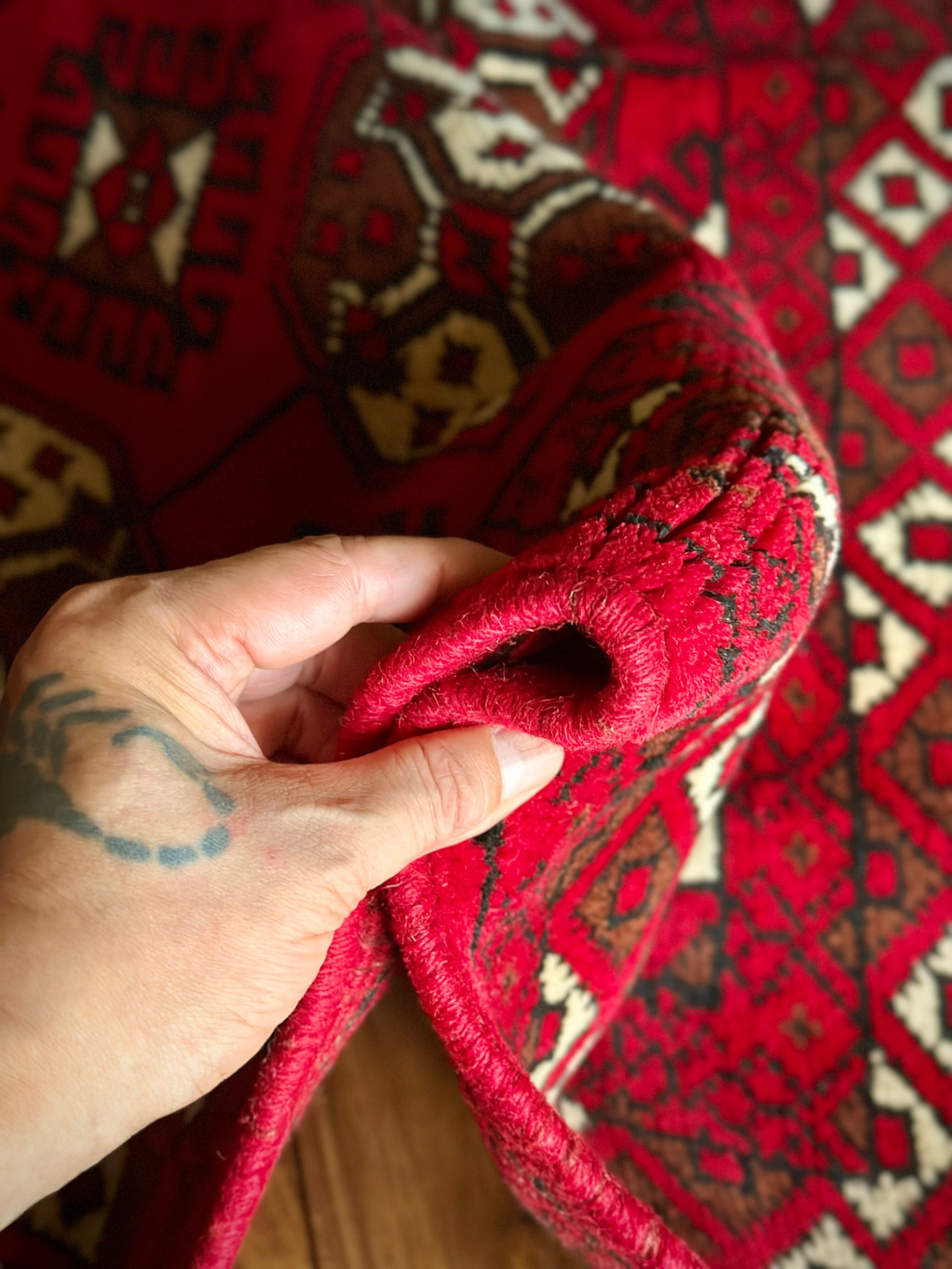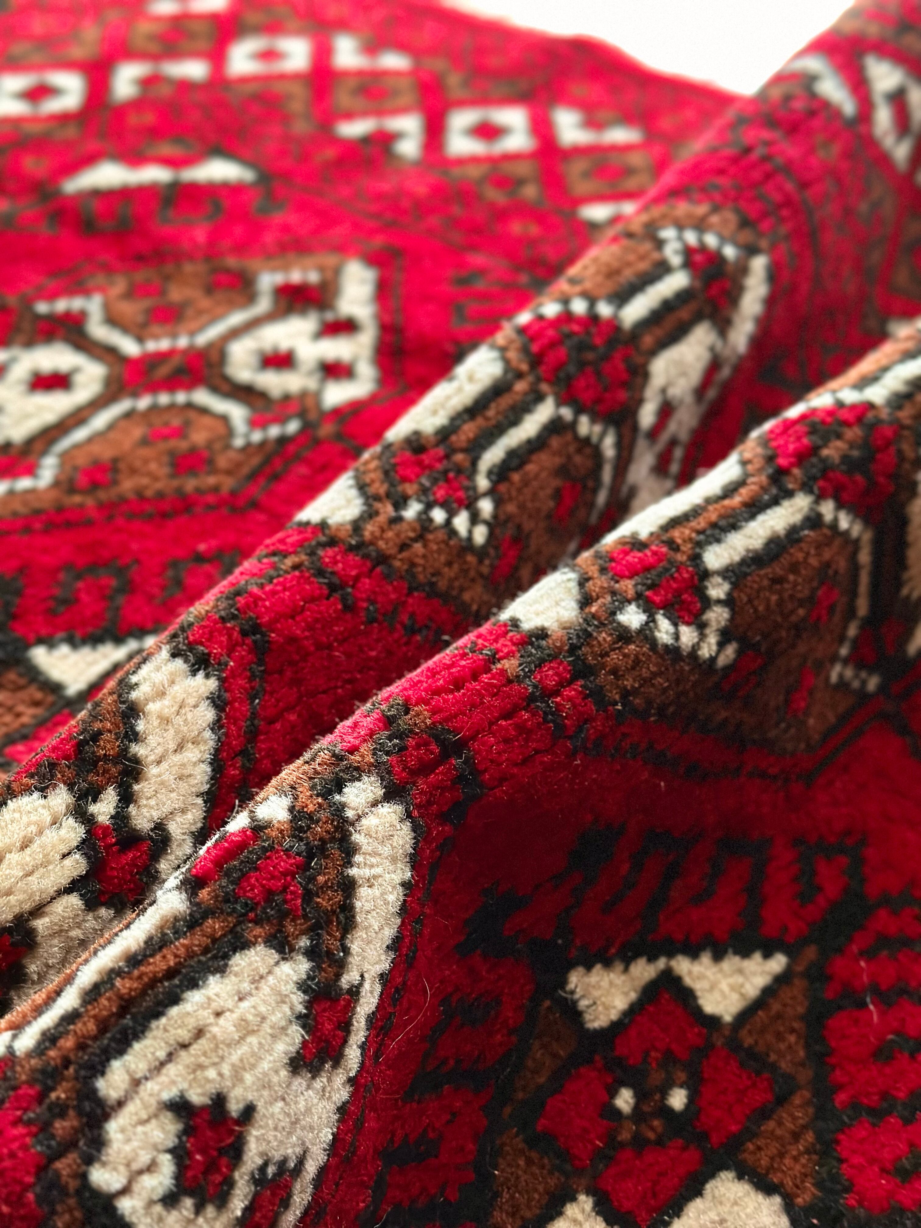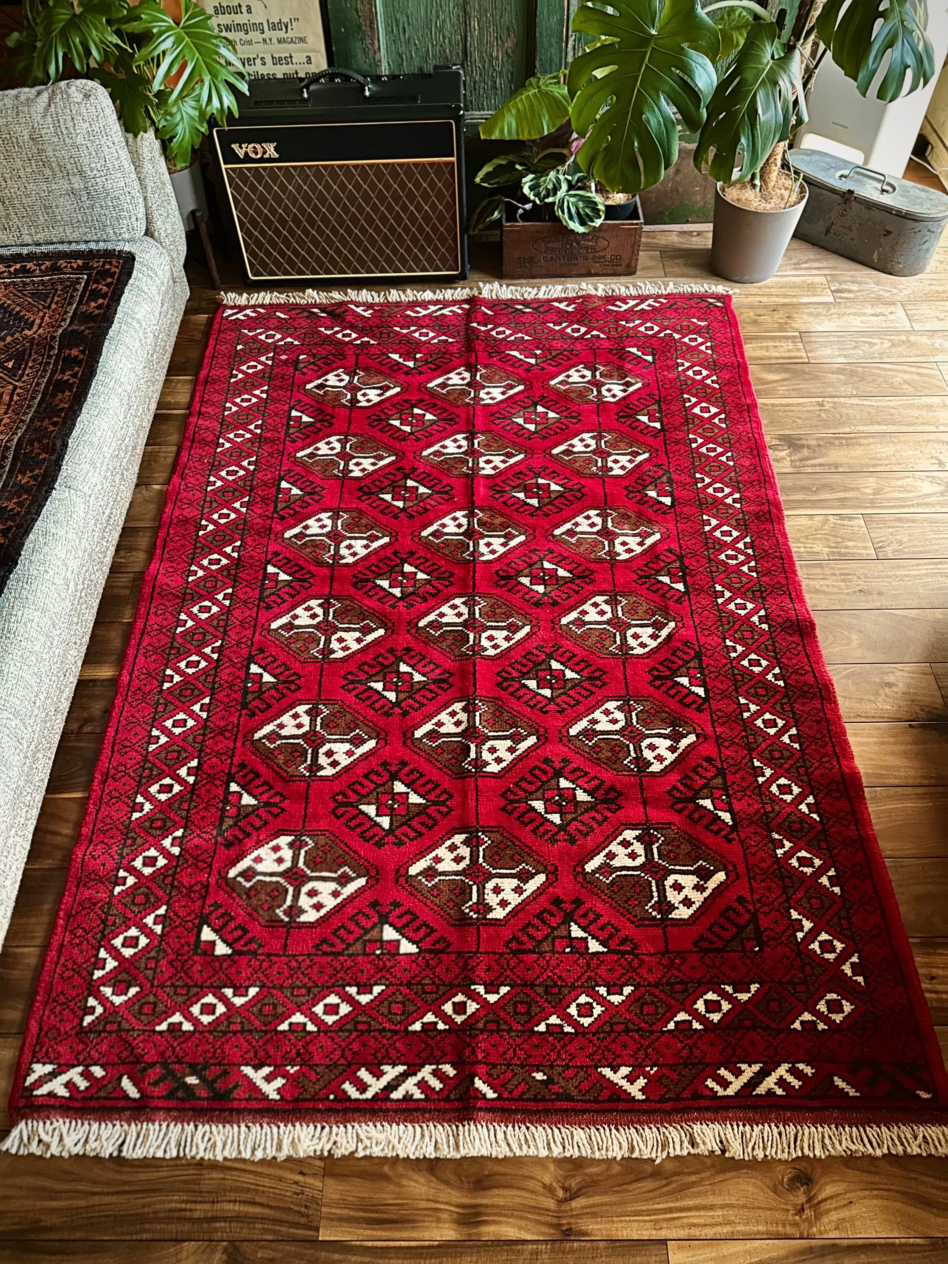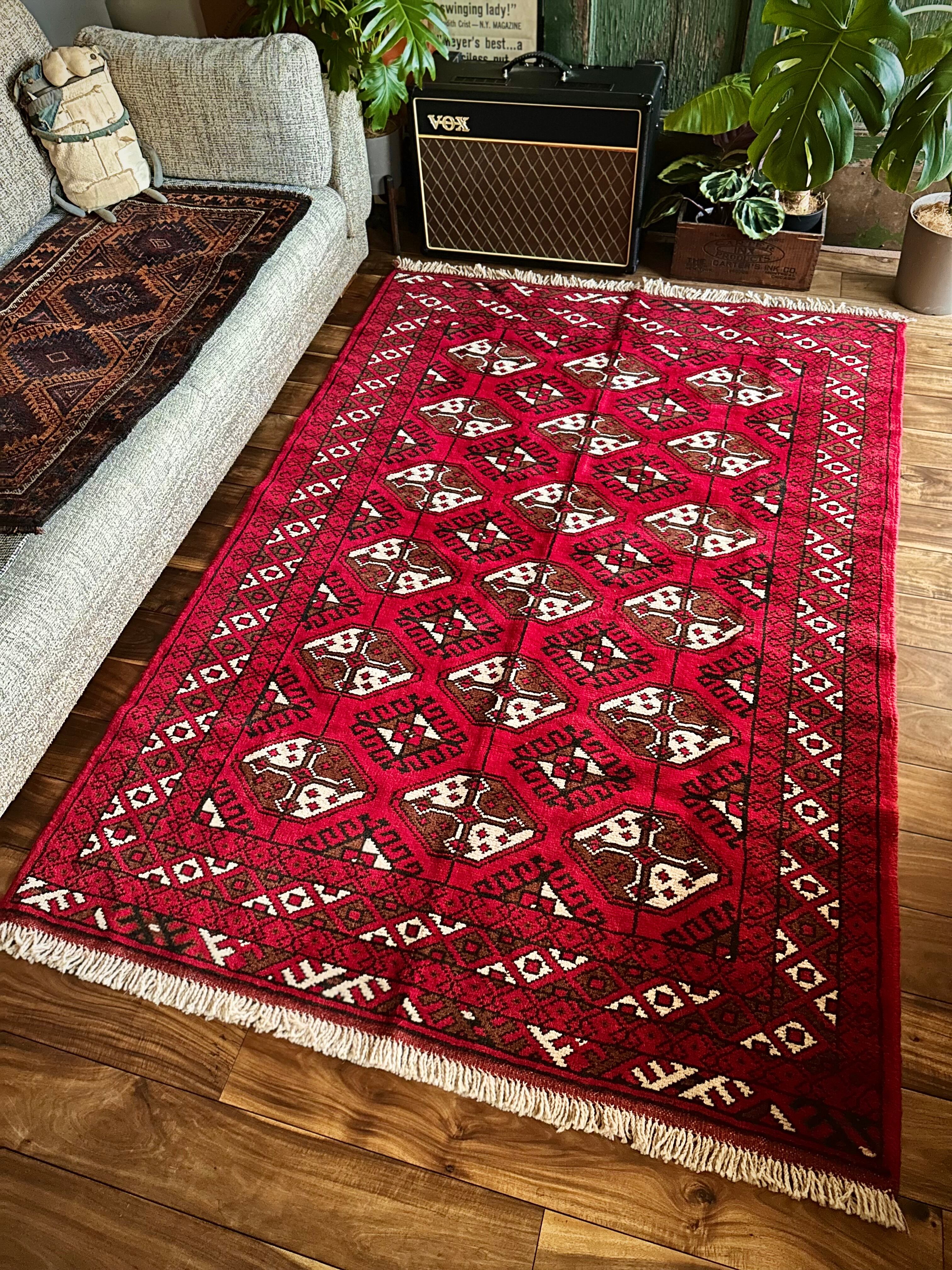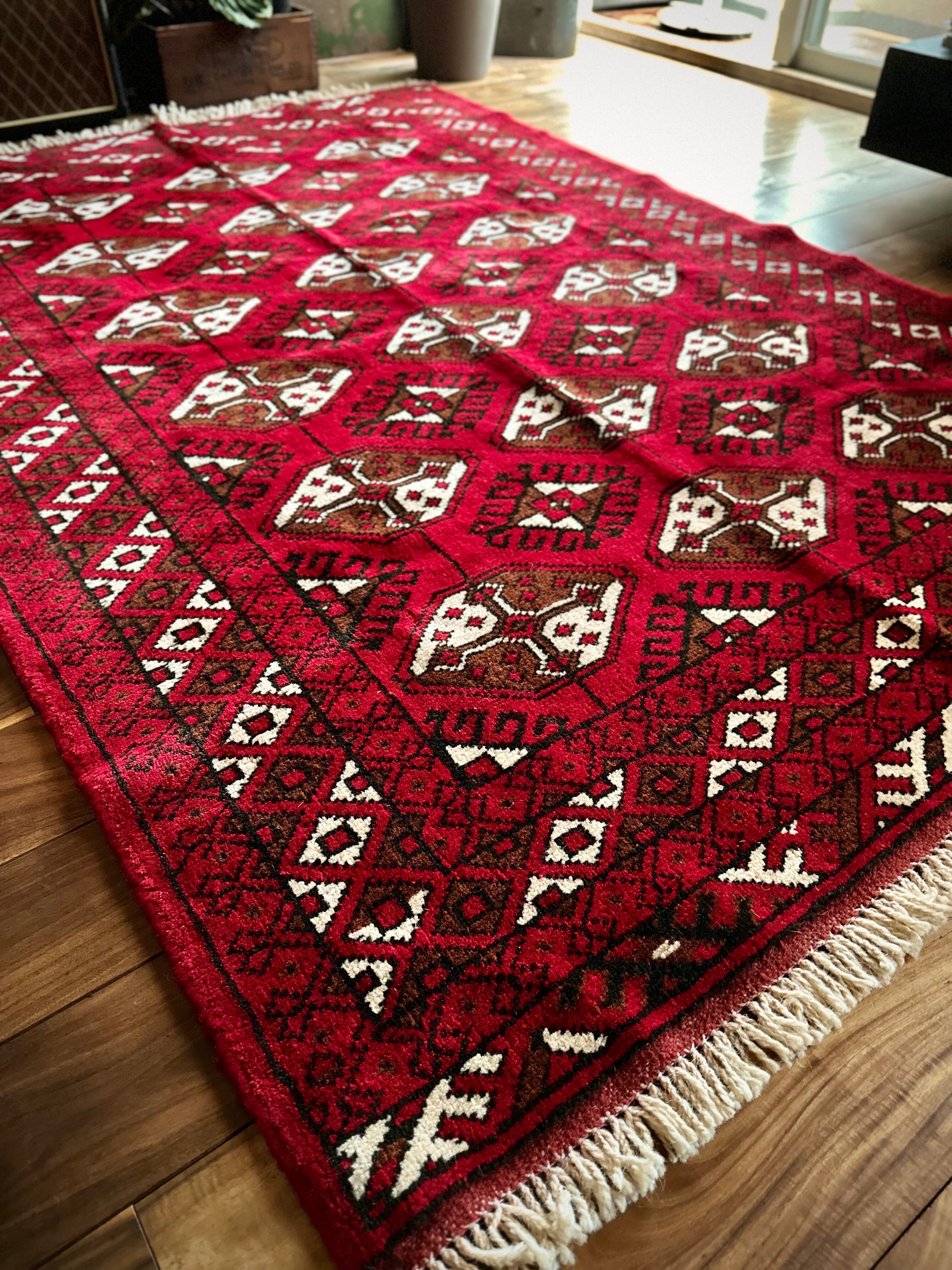 大判サイズのトルキャマン・レッドが眩し過ぎるイラン北東部に居住するトルクメン族のトライバルラグで、デフォルメされたギュルの連続紋様にフックドメダリオンが合わさった、騎馬民族でもあるトルクメンらしい柄の1枚になります。