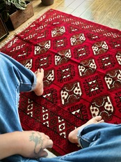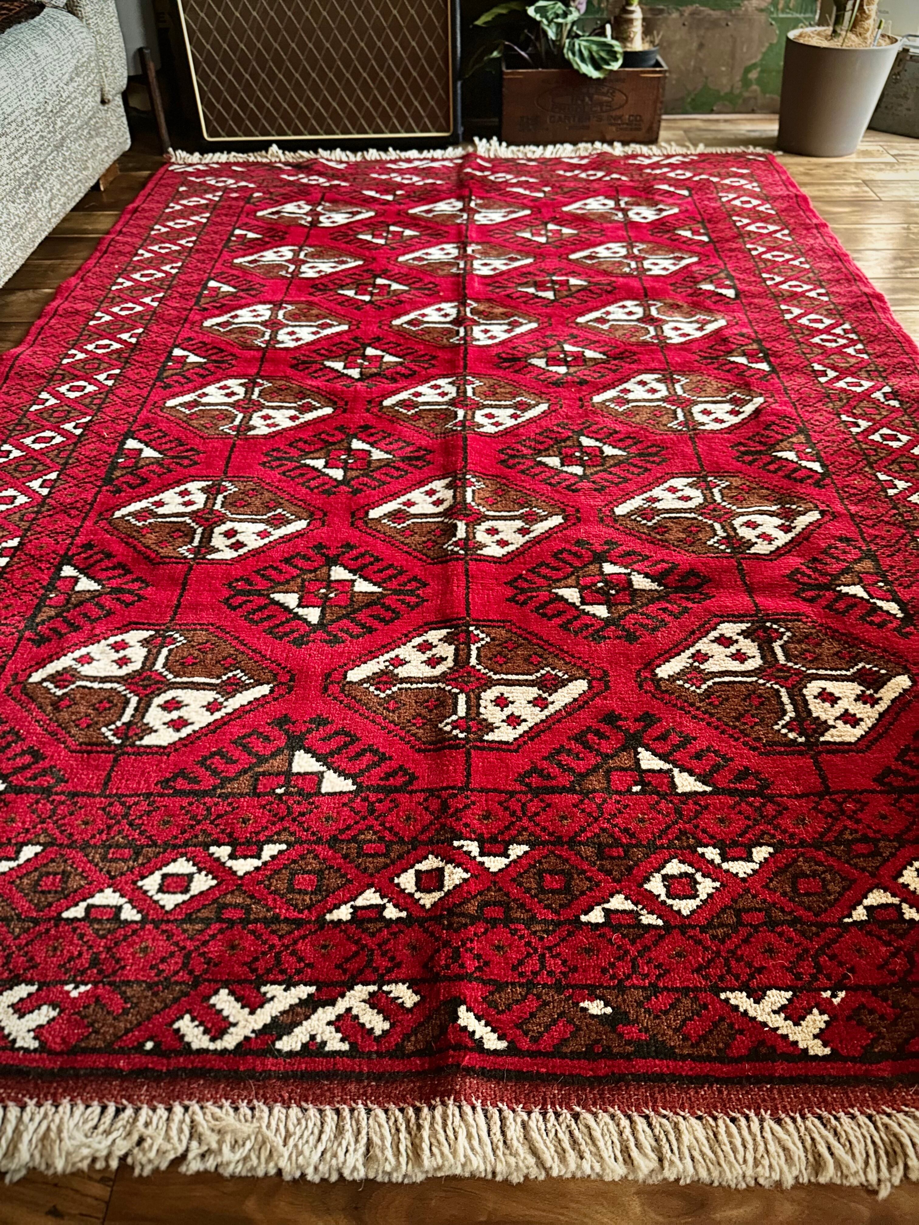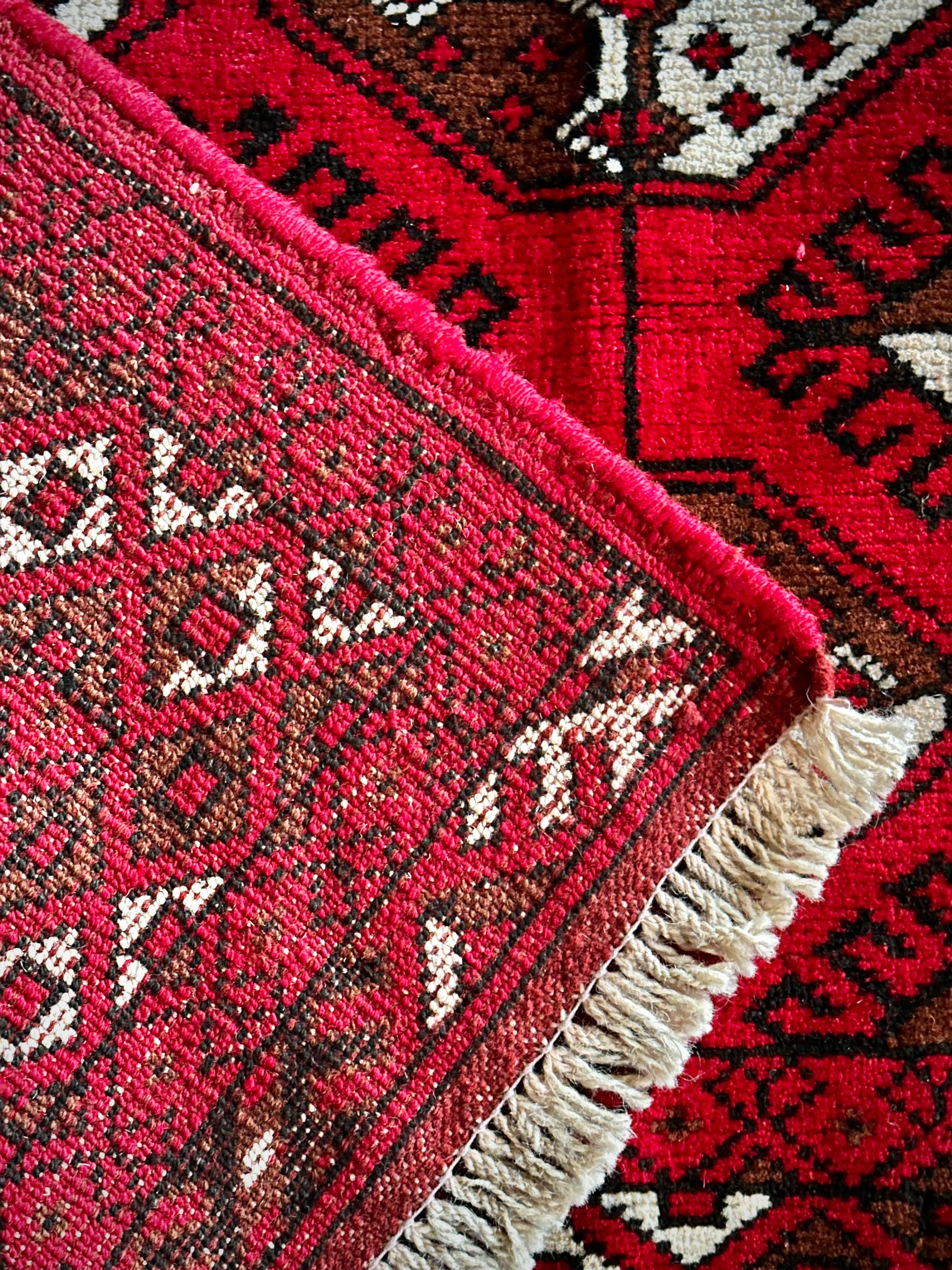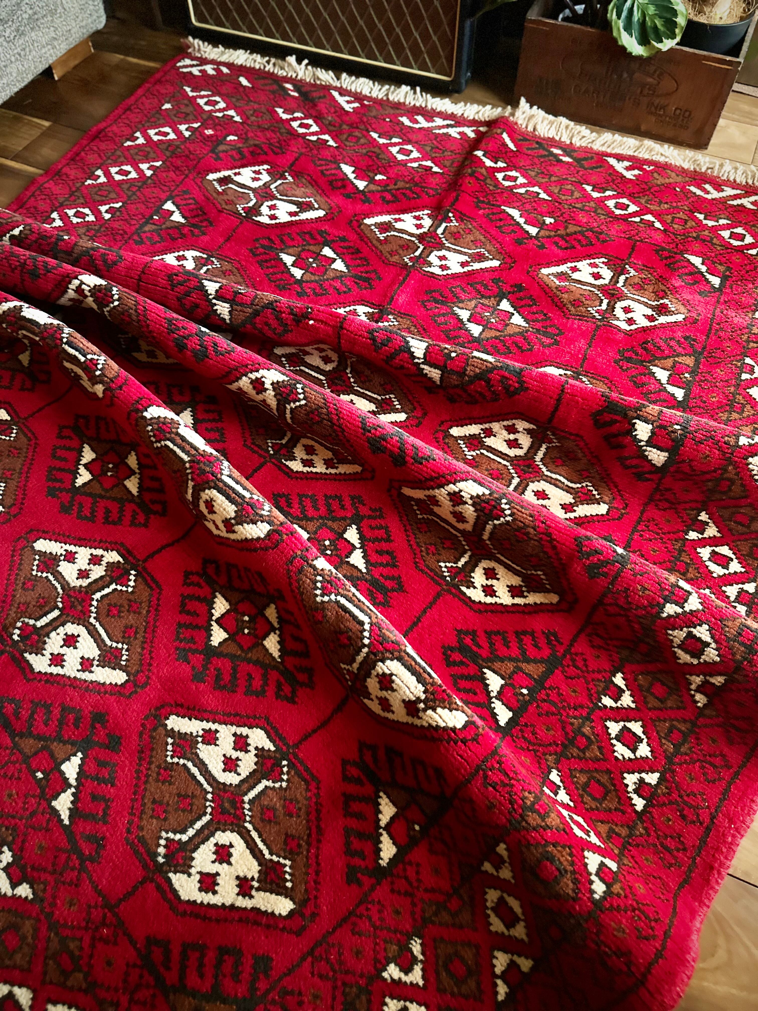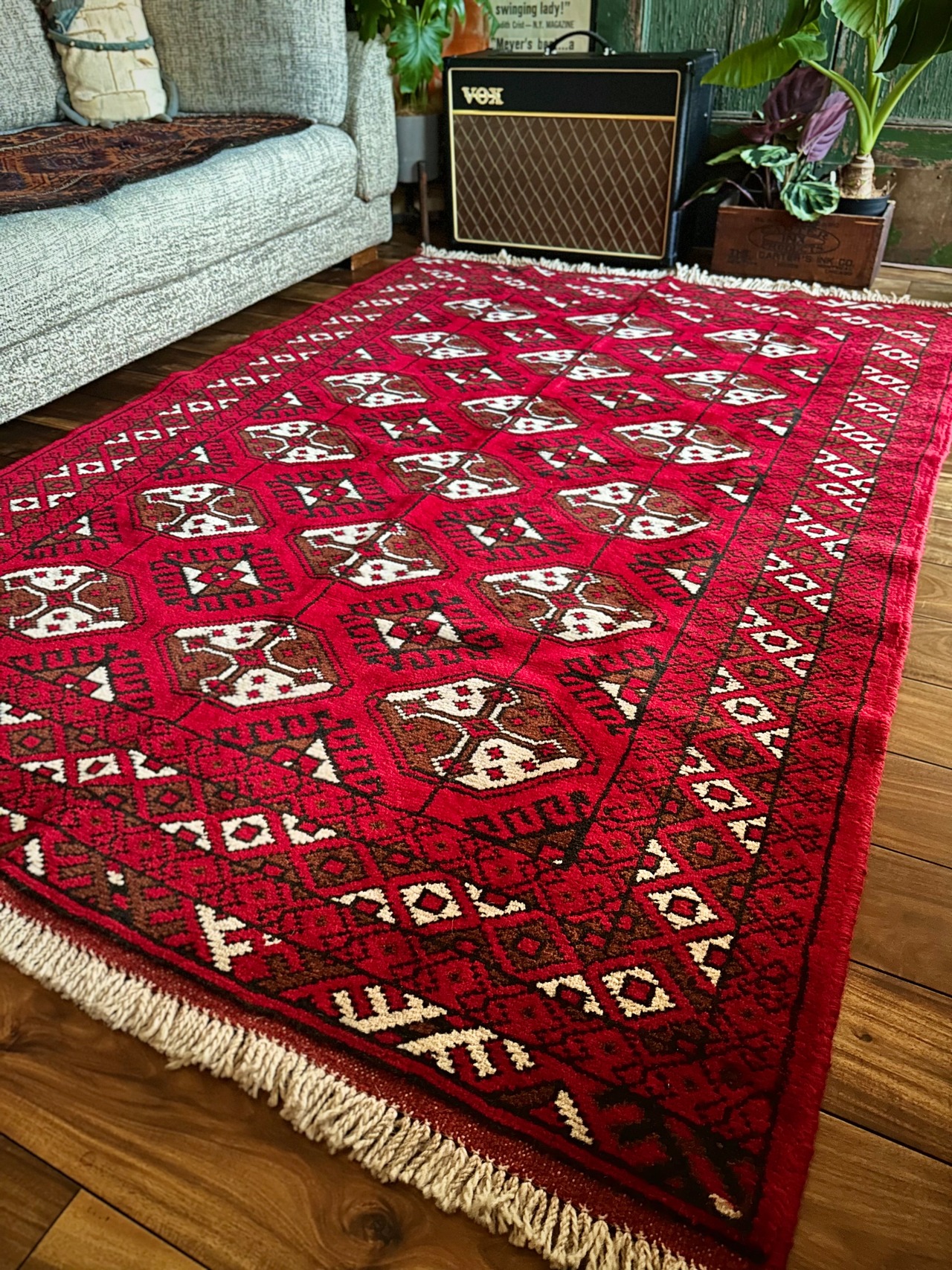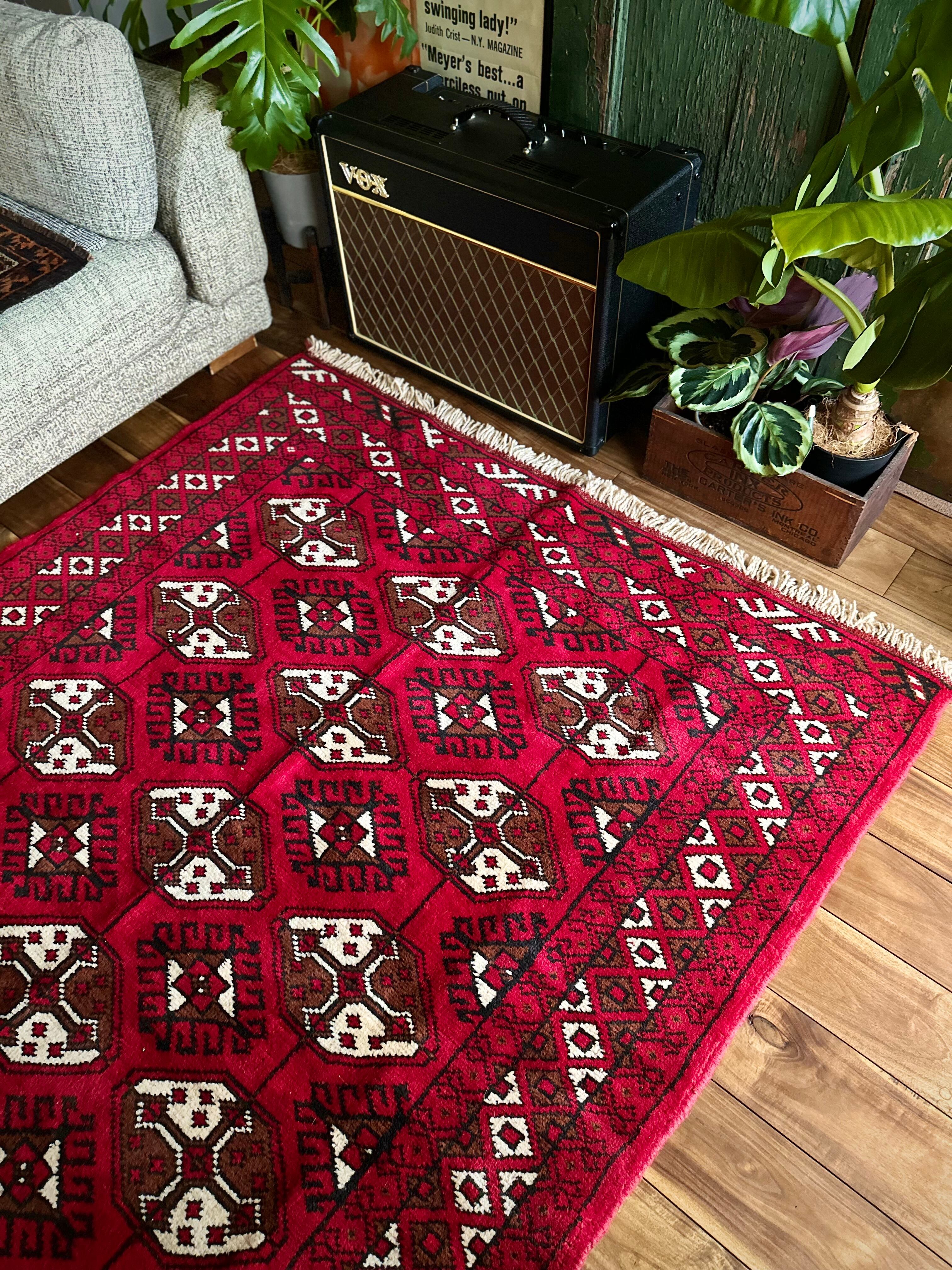 大判サイズのトルキャマン・レッドが眩し過ぎるイラン北東部に居住するトルクメン族のトライバルラグで、デフォルメされたギュルの連続紋様にフックドメダリオンが合わさった、騎馬民族でもあるトルクメンらしい柄の1枚になります。