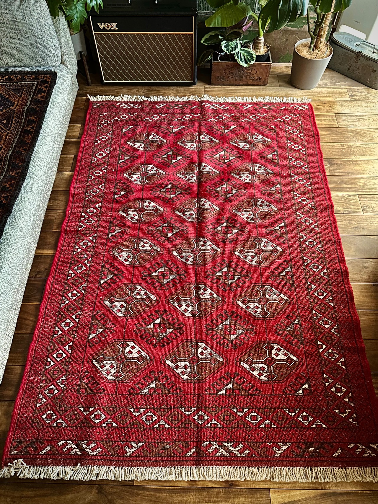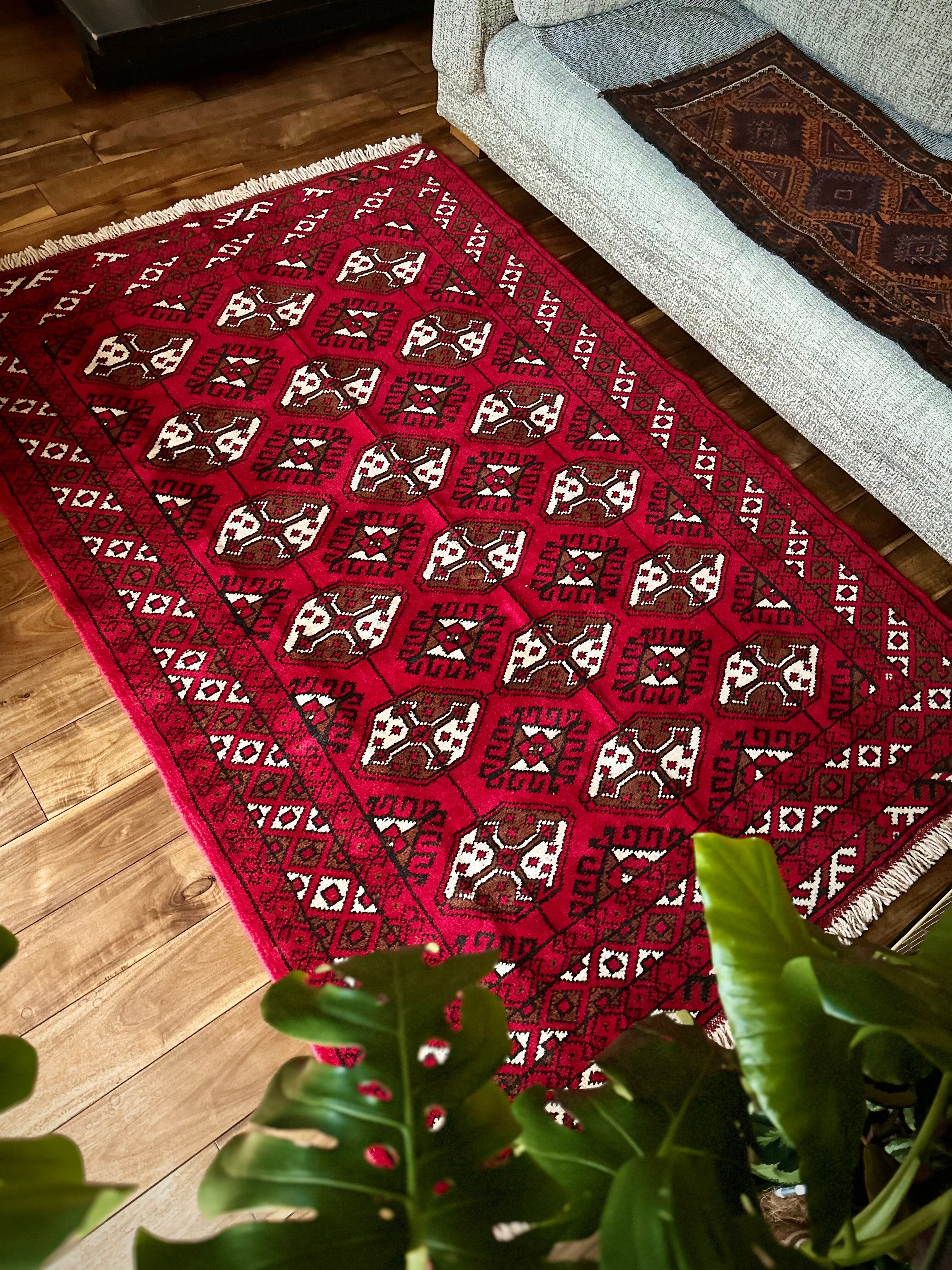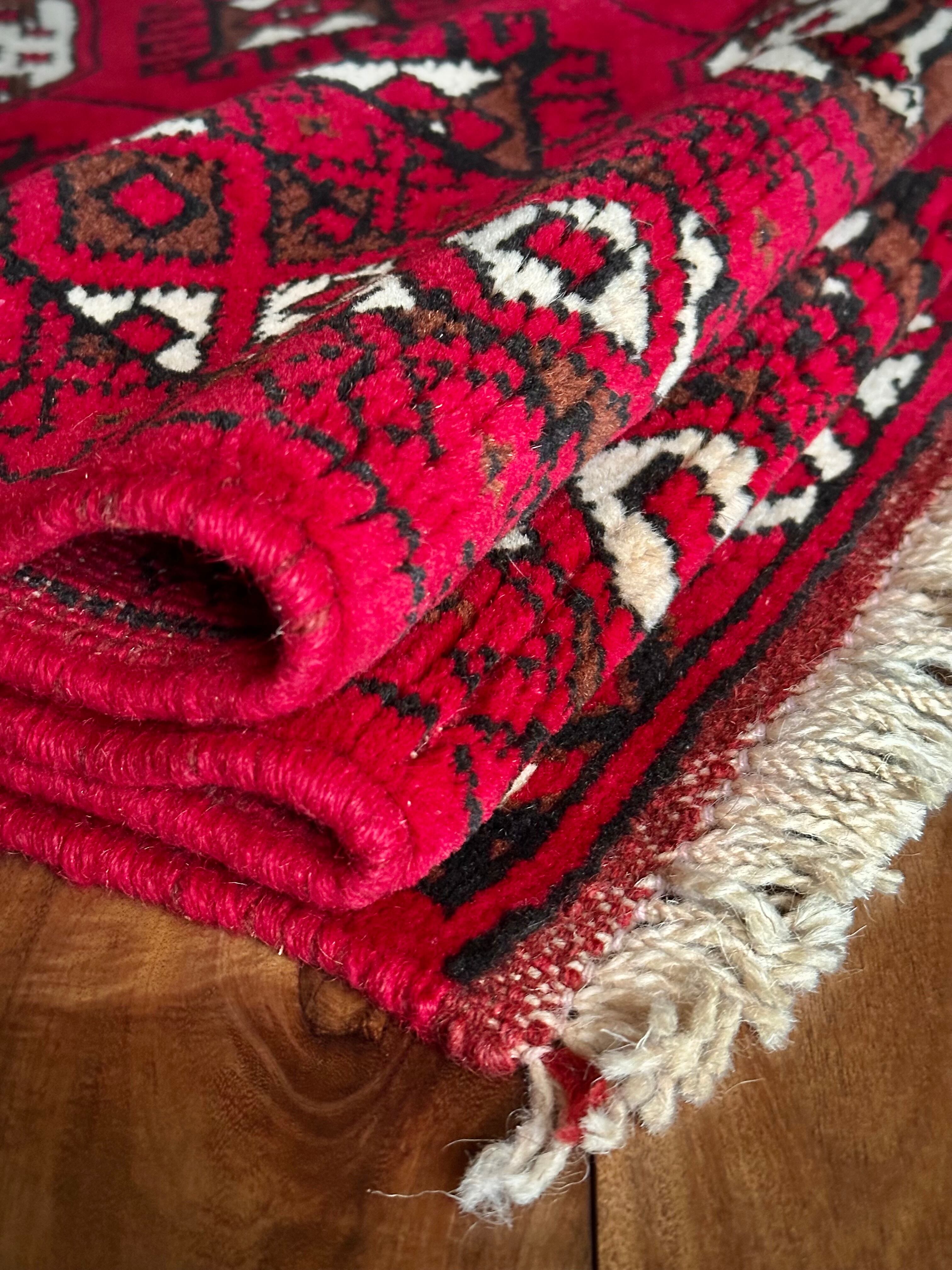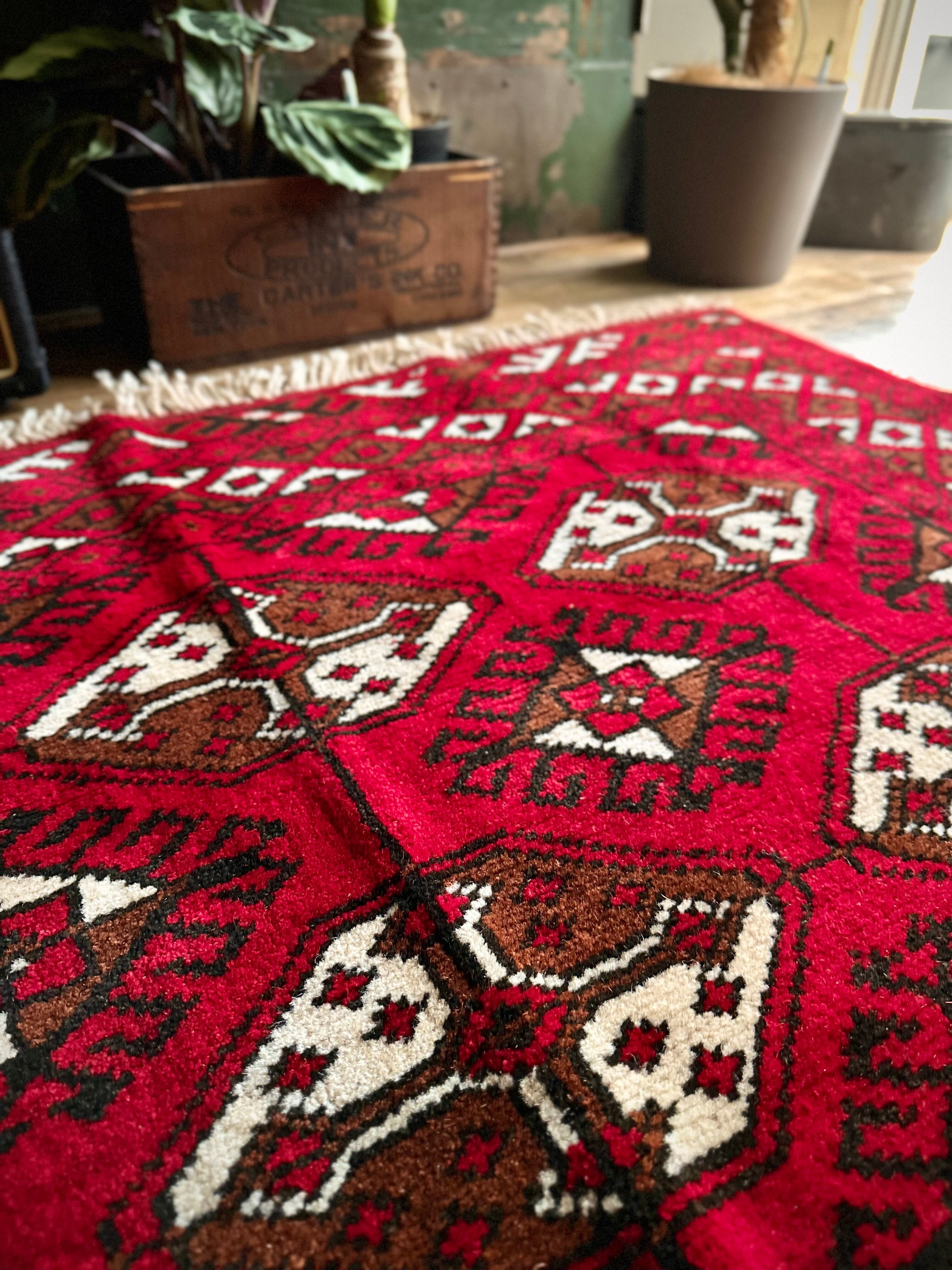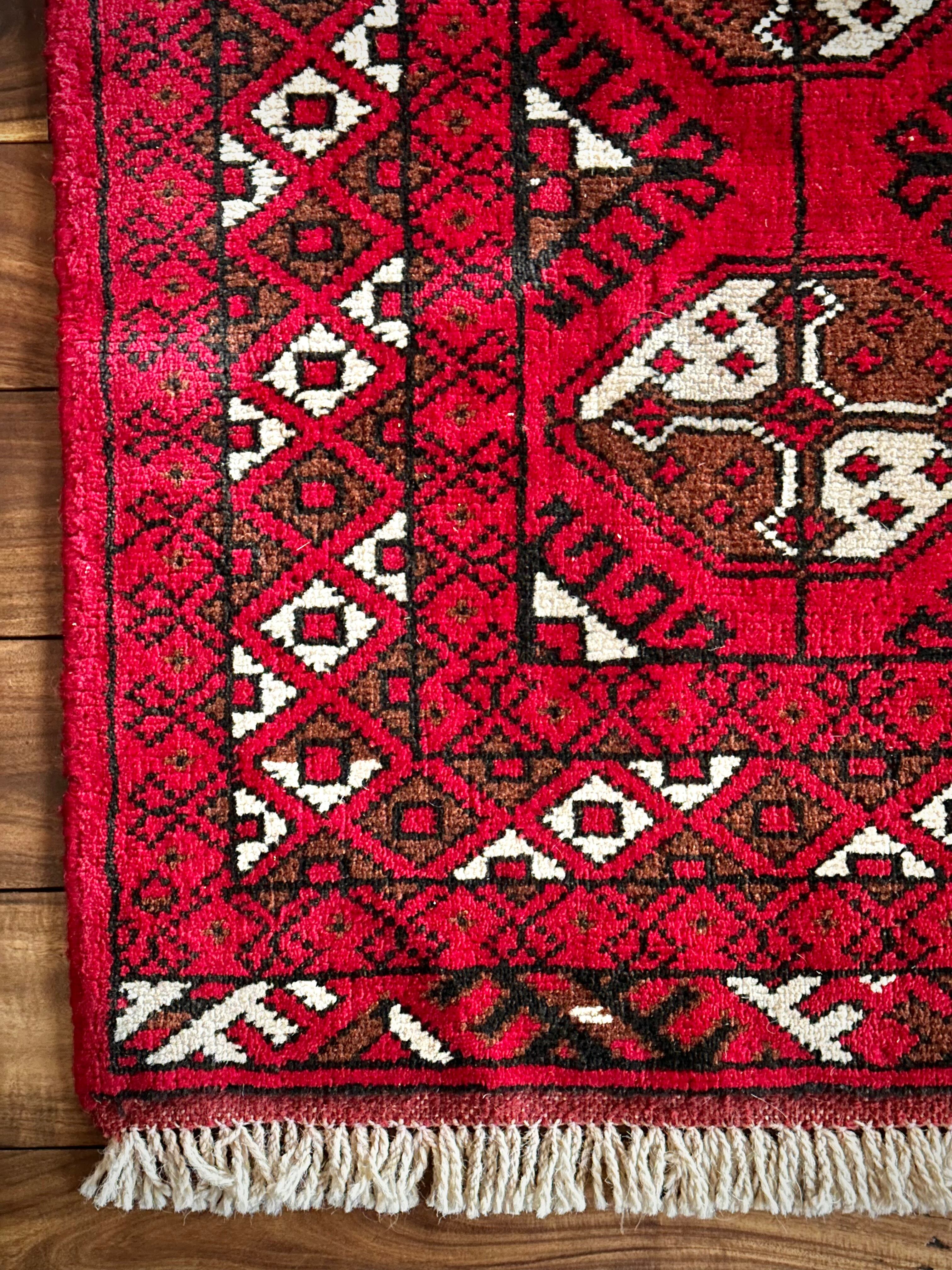 大判サイズのトルキャマン・レッドが眩し過ぎるイラン北東部に居住するトルクメン族のトライバルラグで、デフォルメされたギュルの連続紋様にフックドメダリオンが合わさった、騎馬民族でもあるトルクメンらしい柄の1枚になります。