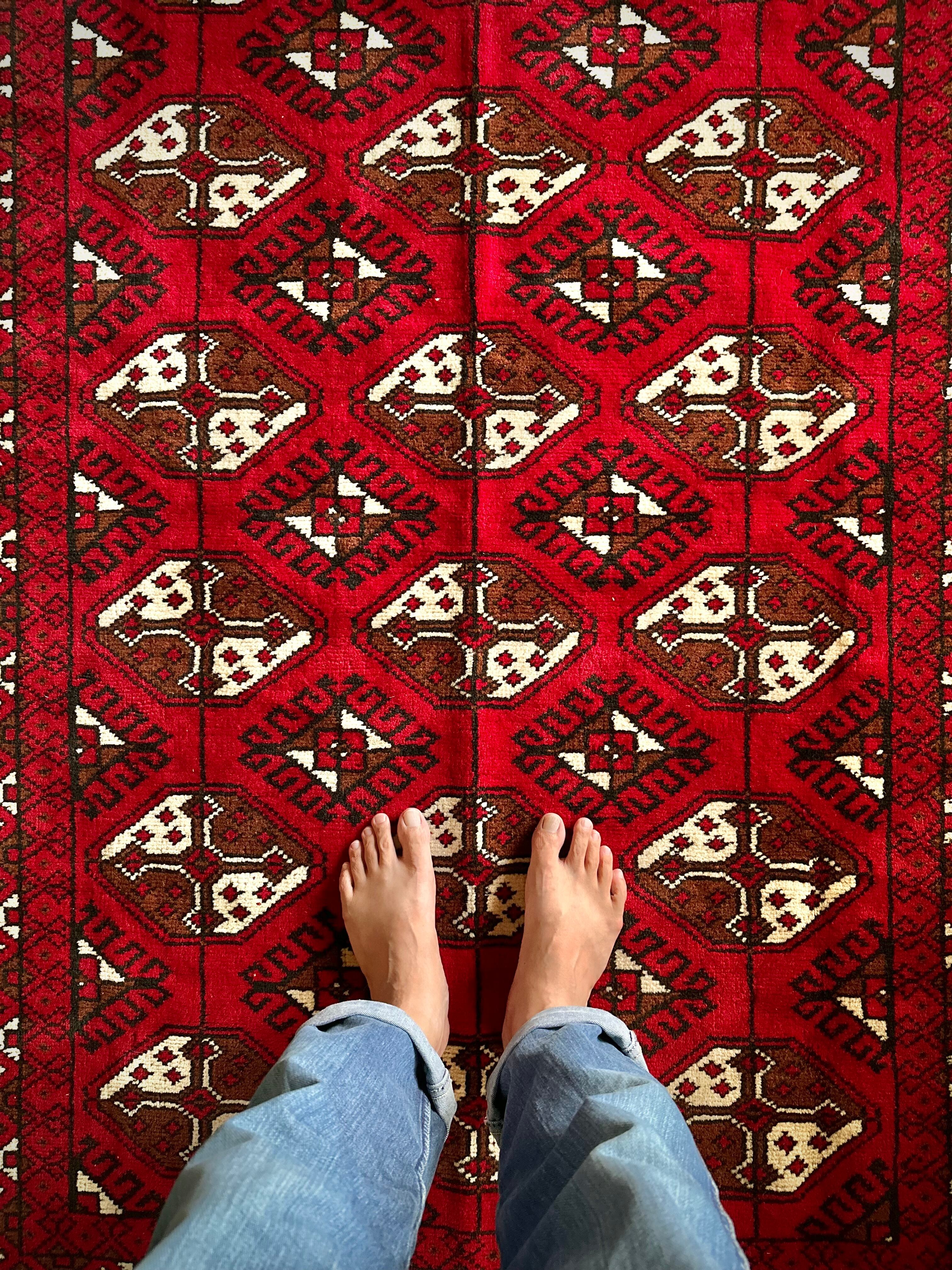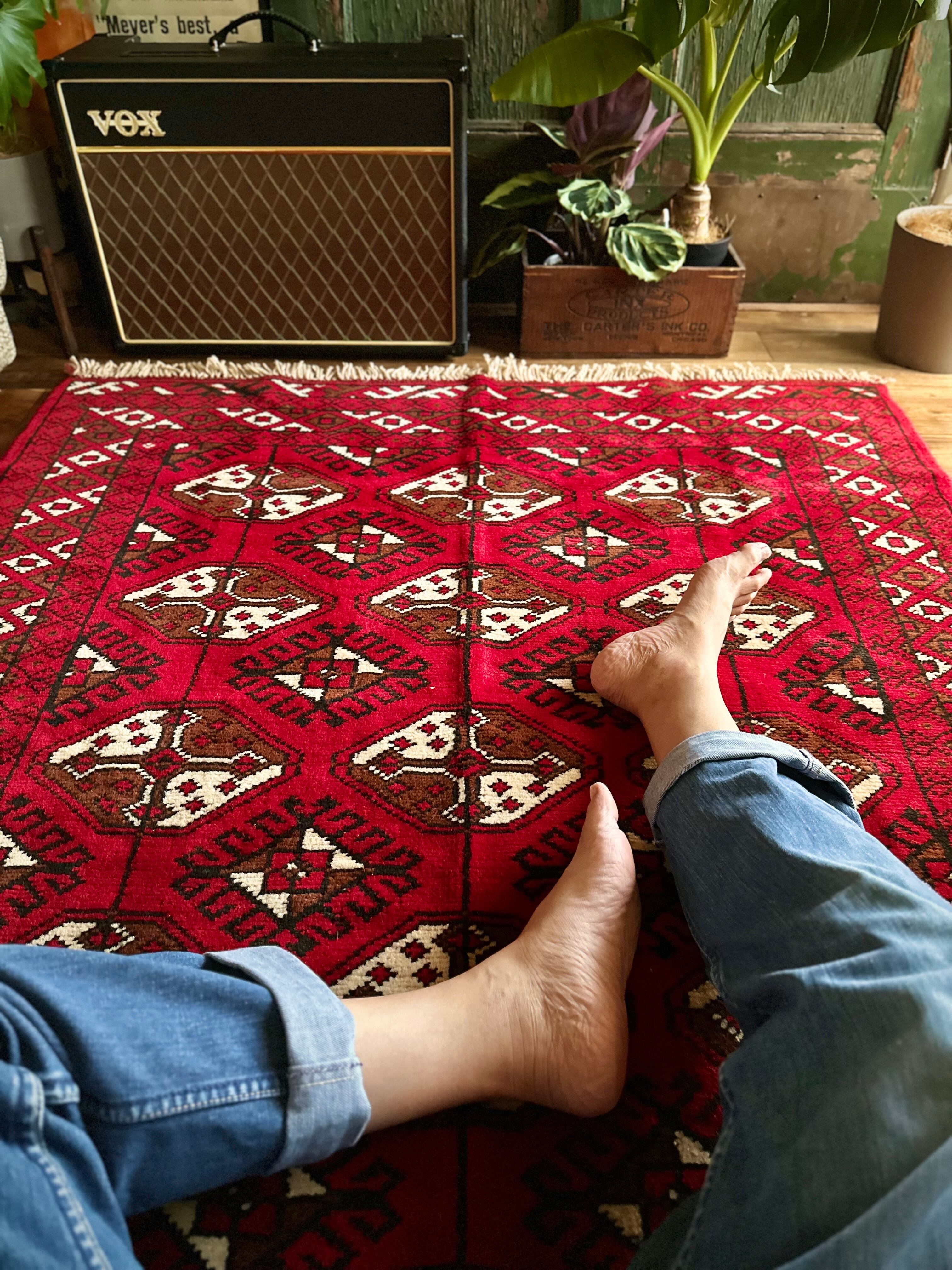 大きさは見たまんまのリビングサイズで三人掛けソファ前にテーブルを置いても充分な大きさでしょうか。意外にも130cmオーバーという横幅が希少で扱いやすく、経糸に羊毛が使われた柔らかな1枚に、特筆すべきは織りの細かさ故の1cmはあろうかという厚みで、その極上なパイルのフカフカな気持ち良さは素足でないと味わえません。