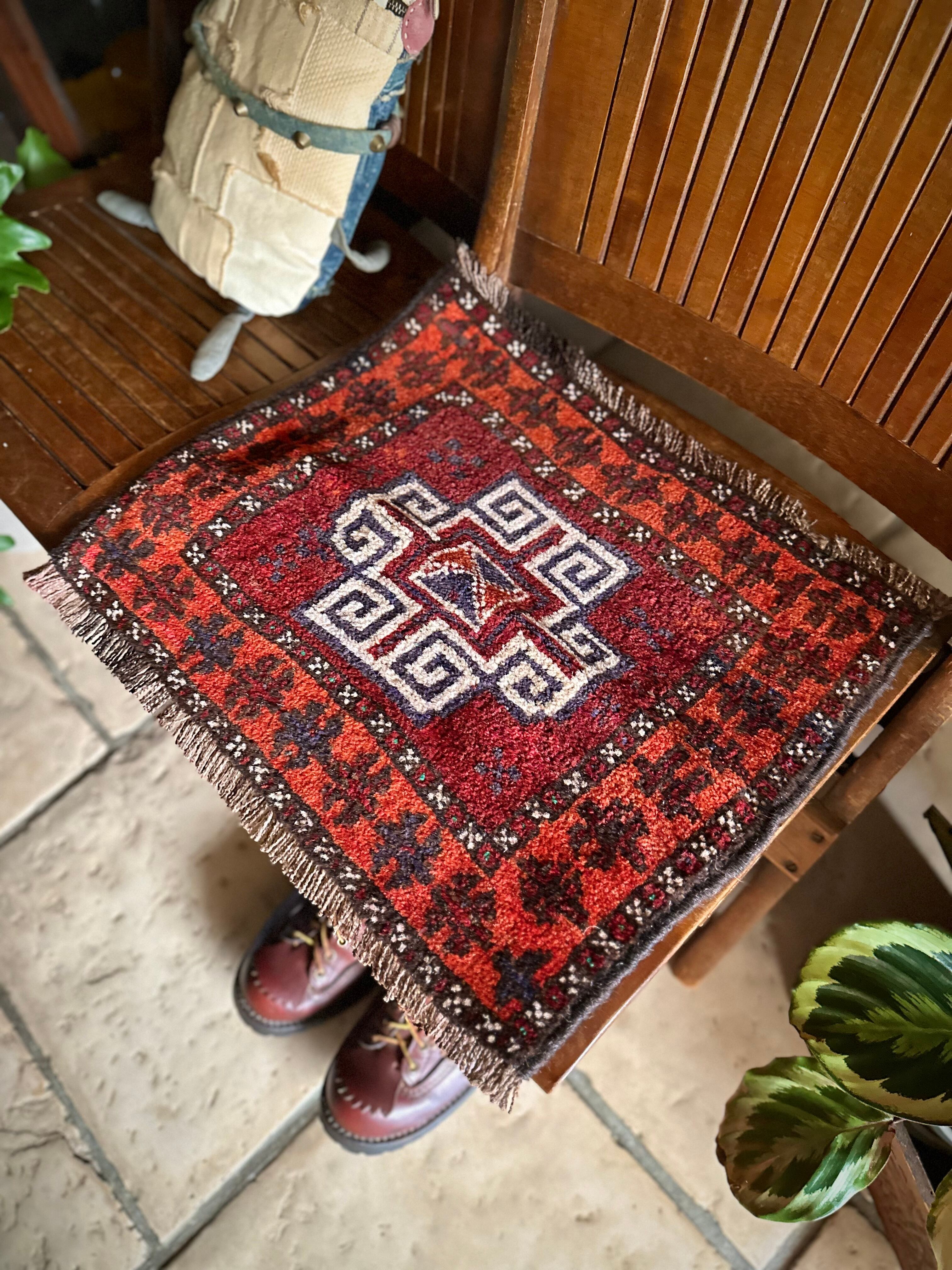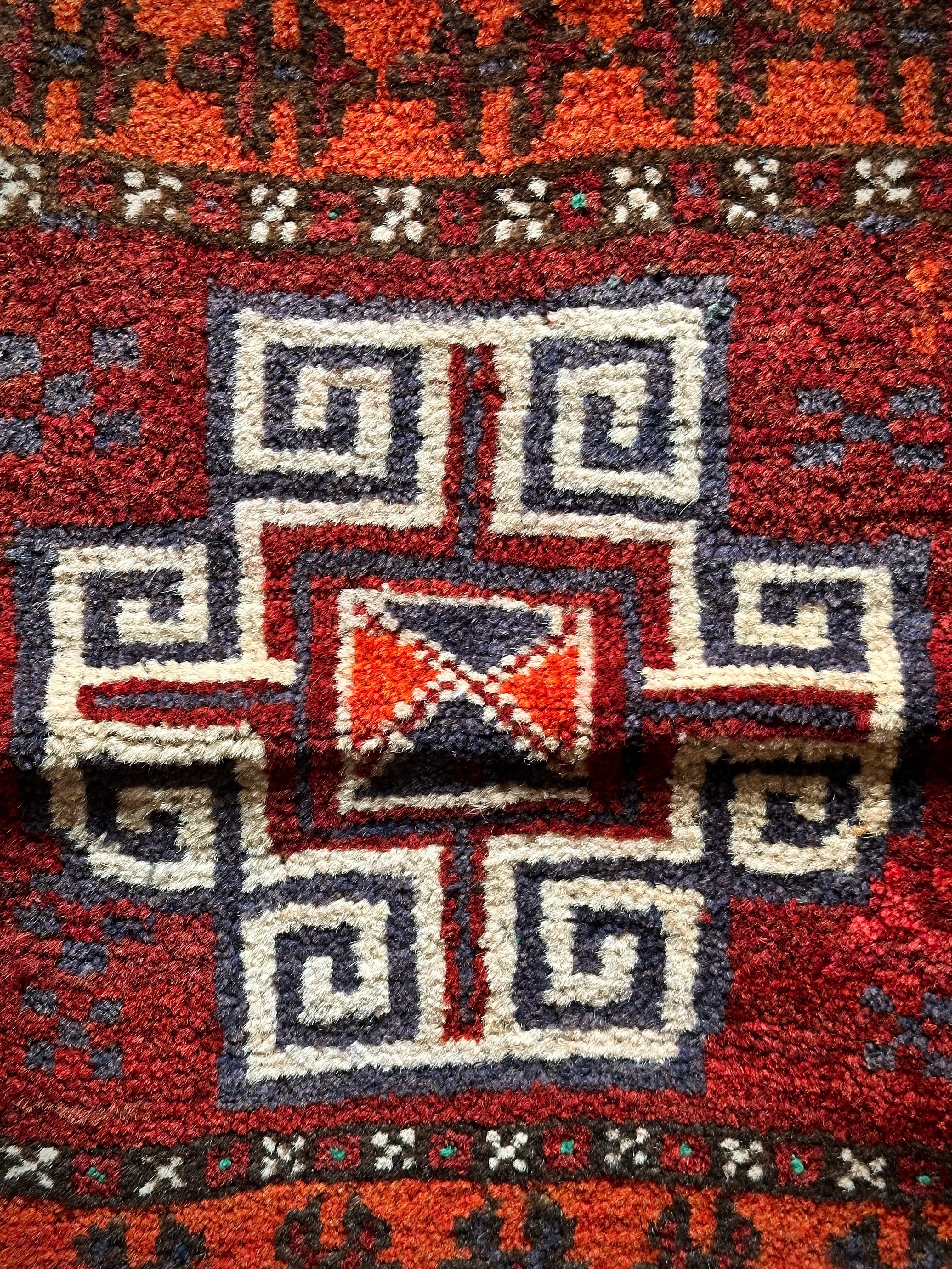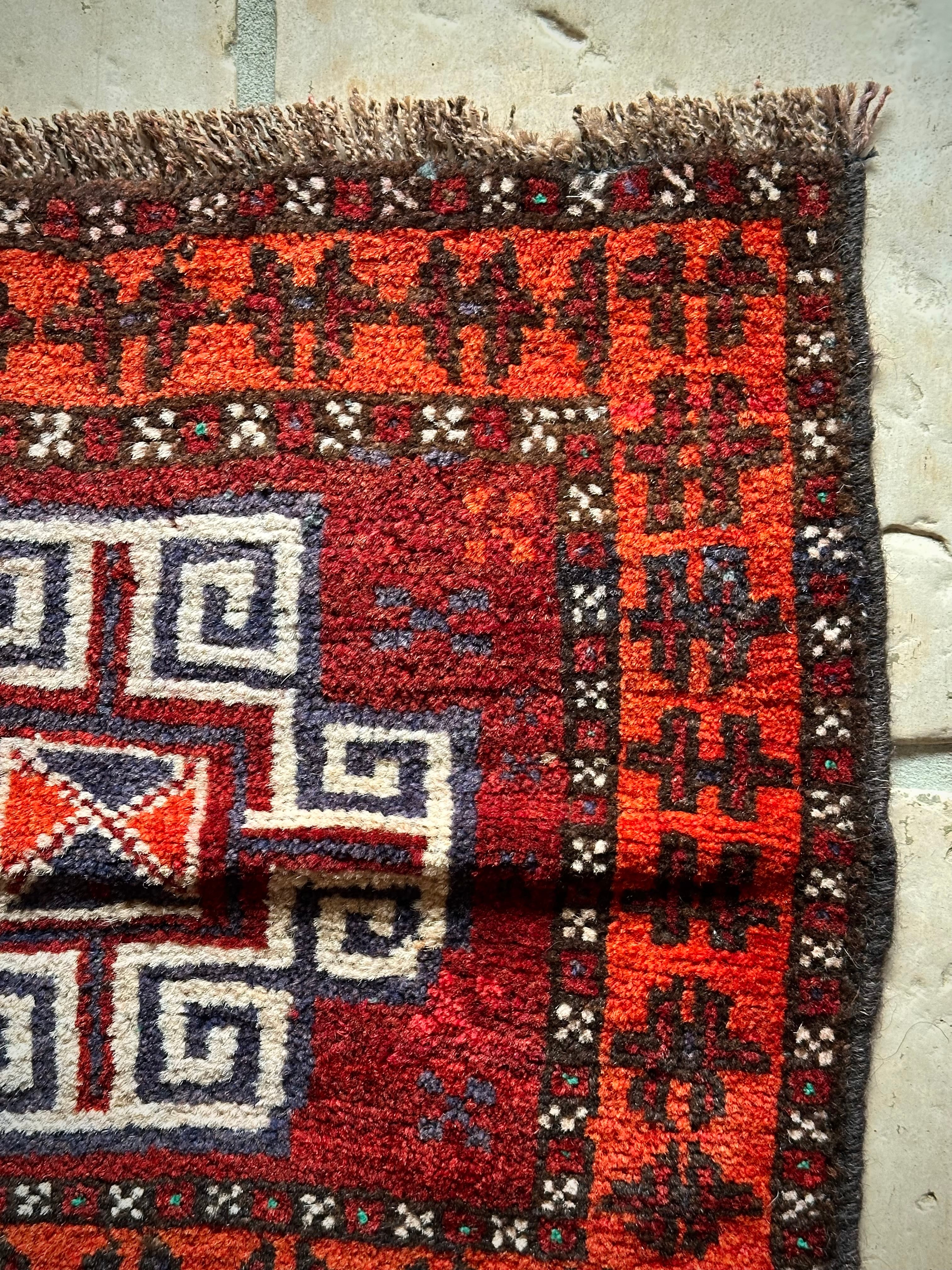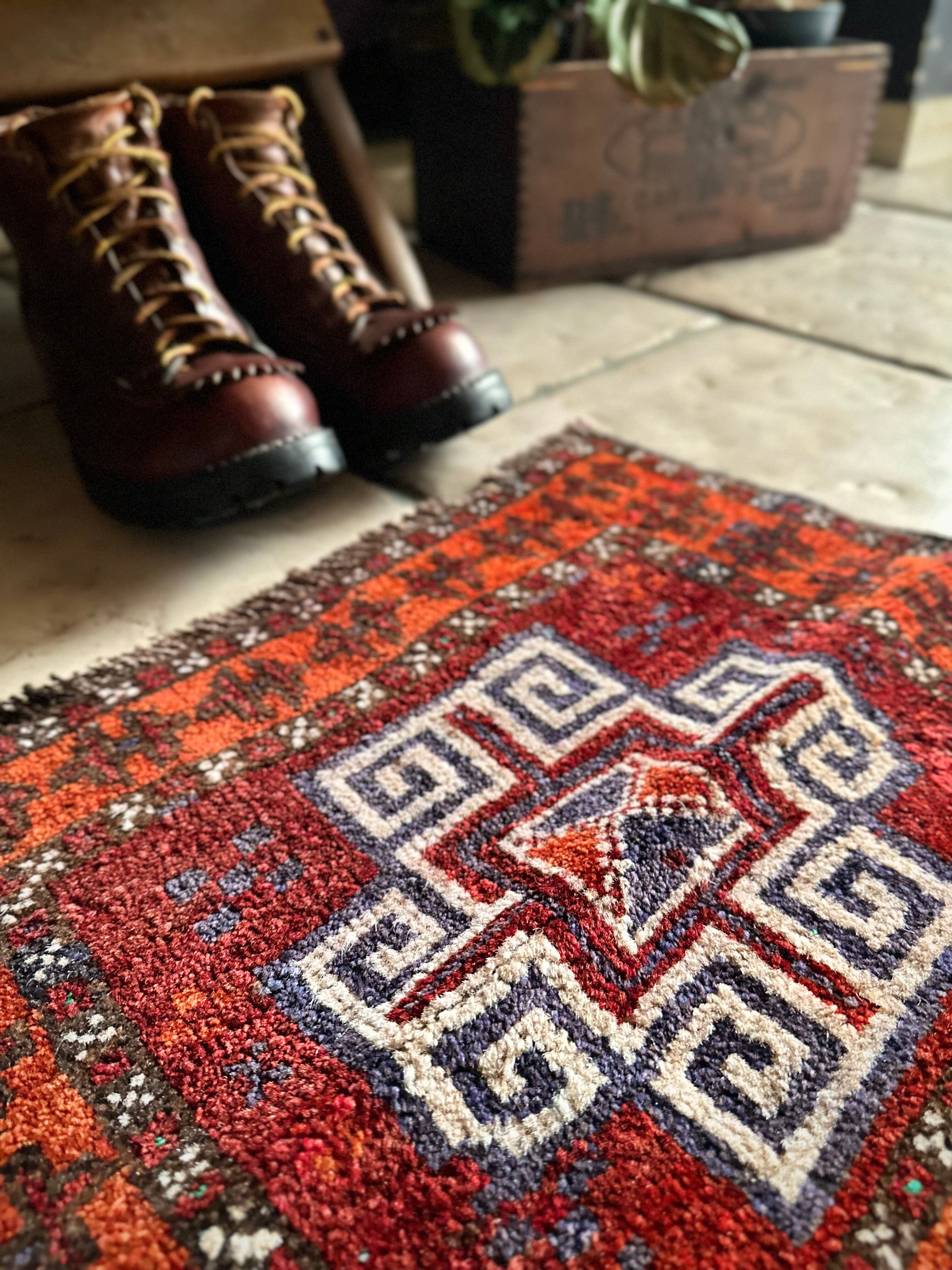 小振りなサイズにバーガンディとテラコッタの色合いがヘラート産バルーチらしいトライバルラグで、元々はホルジンと呼ばれるラクダやロバの背に跨がせるサドルバッグの表皮をラグに仕立て直したモノになり、本来なら2対セットの内の片側だけになります。