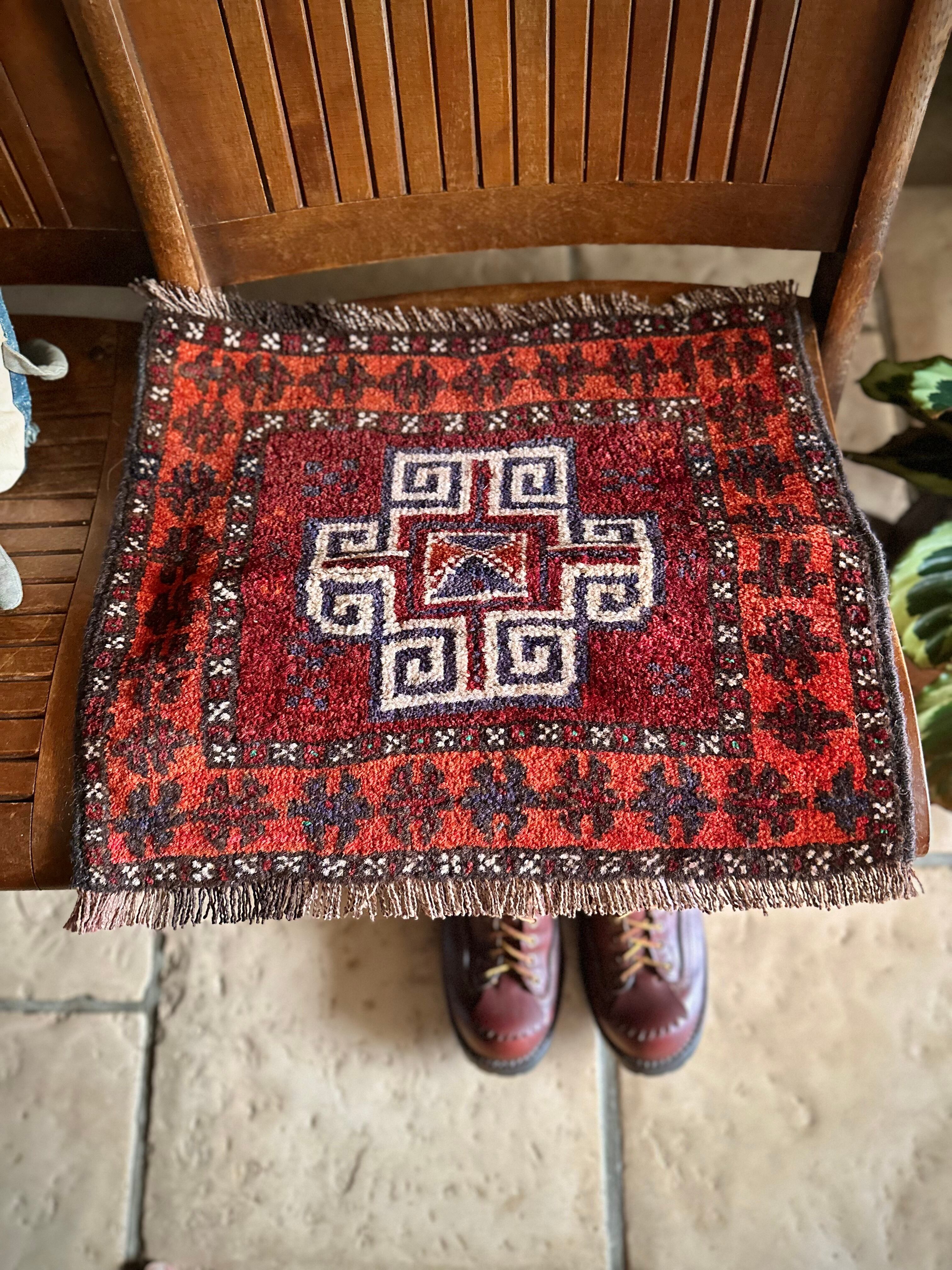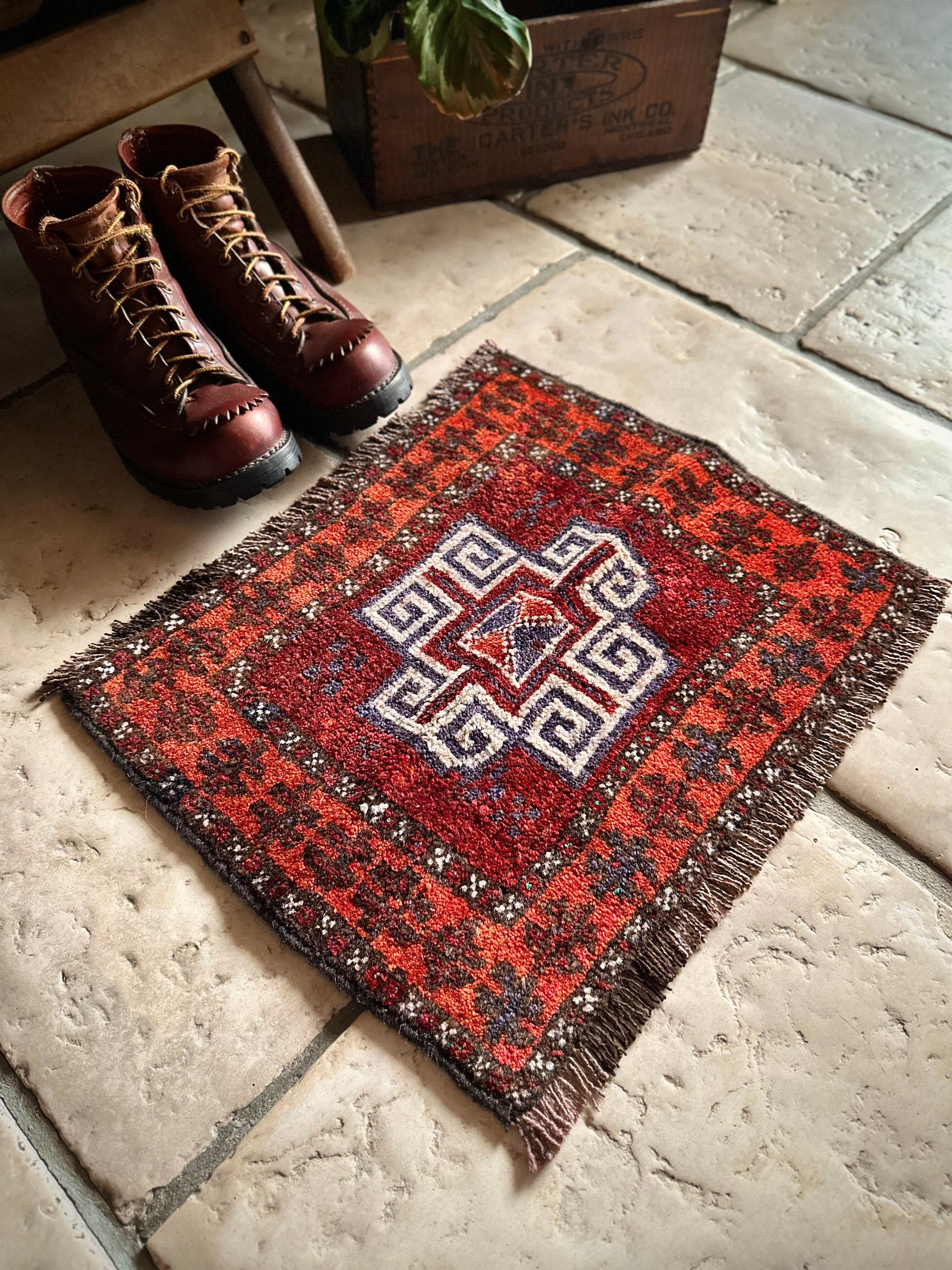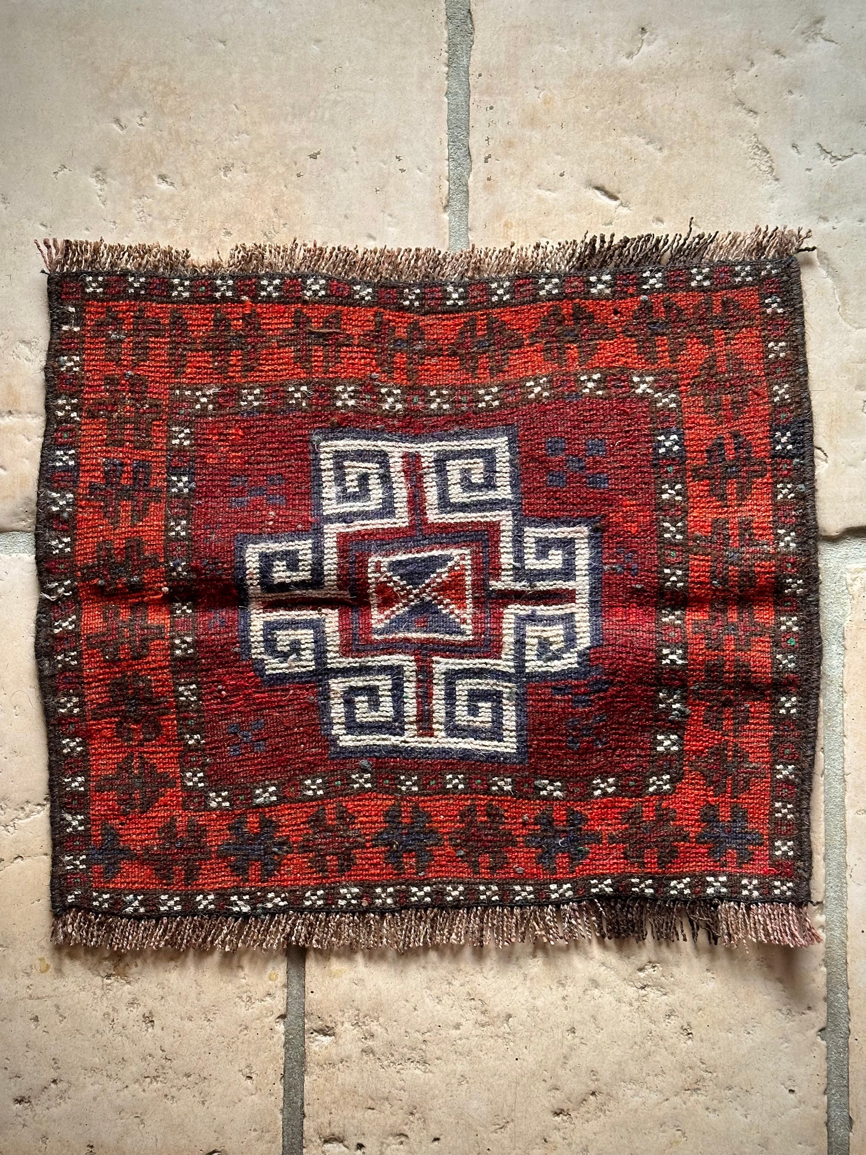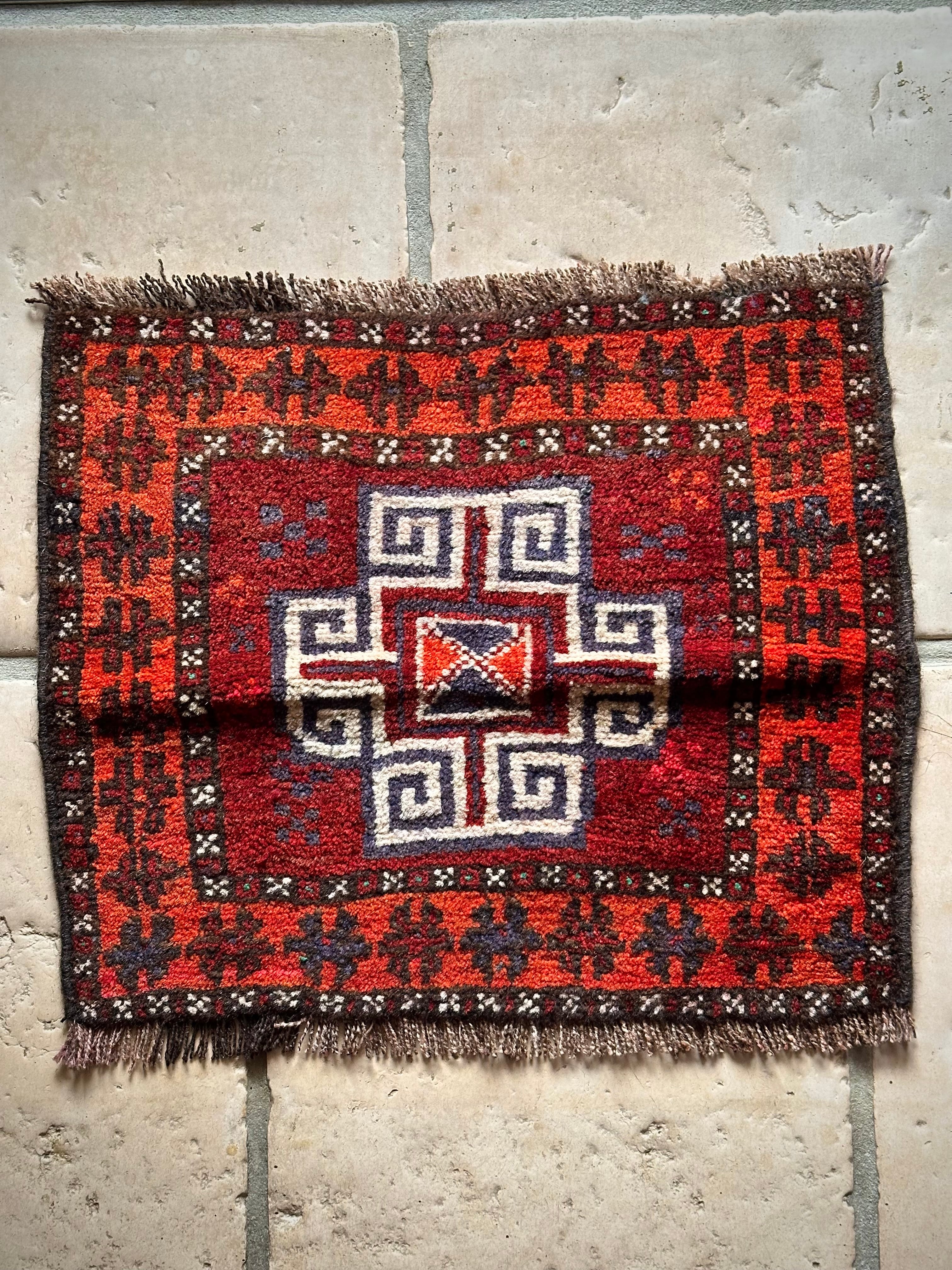 小振りなサイズにバーガンディとテラコッタの色合いがヘラート産バルーチらしいトライバルラグで、元々はホルジンと呼ばれるラクダやロバの背に跨がせるサドルバッグの表皮をラグに仕立て直したモノになり、本来なら2対セットの内の片側だけになります。