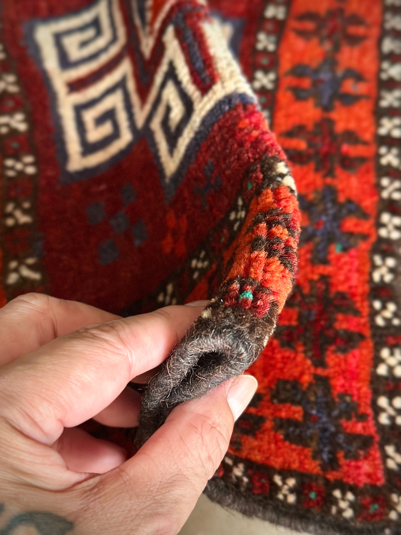 経年としては35年とそれなりのヴィンテージ品になりますが、バッグとして使用していた為に目立つ経年劣化もなく、パイル自体は長くはありませんが、ざっくりとした織りで柔らかな手触りになります。また特に目立つダメージやリペア箇所が見当たらないグッドなコンディションで、トライバルラグ初心者の方でも気軽に取り入れてもらえます。