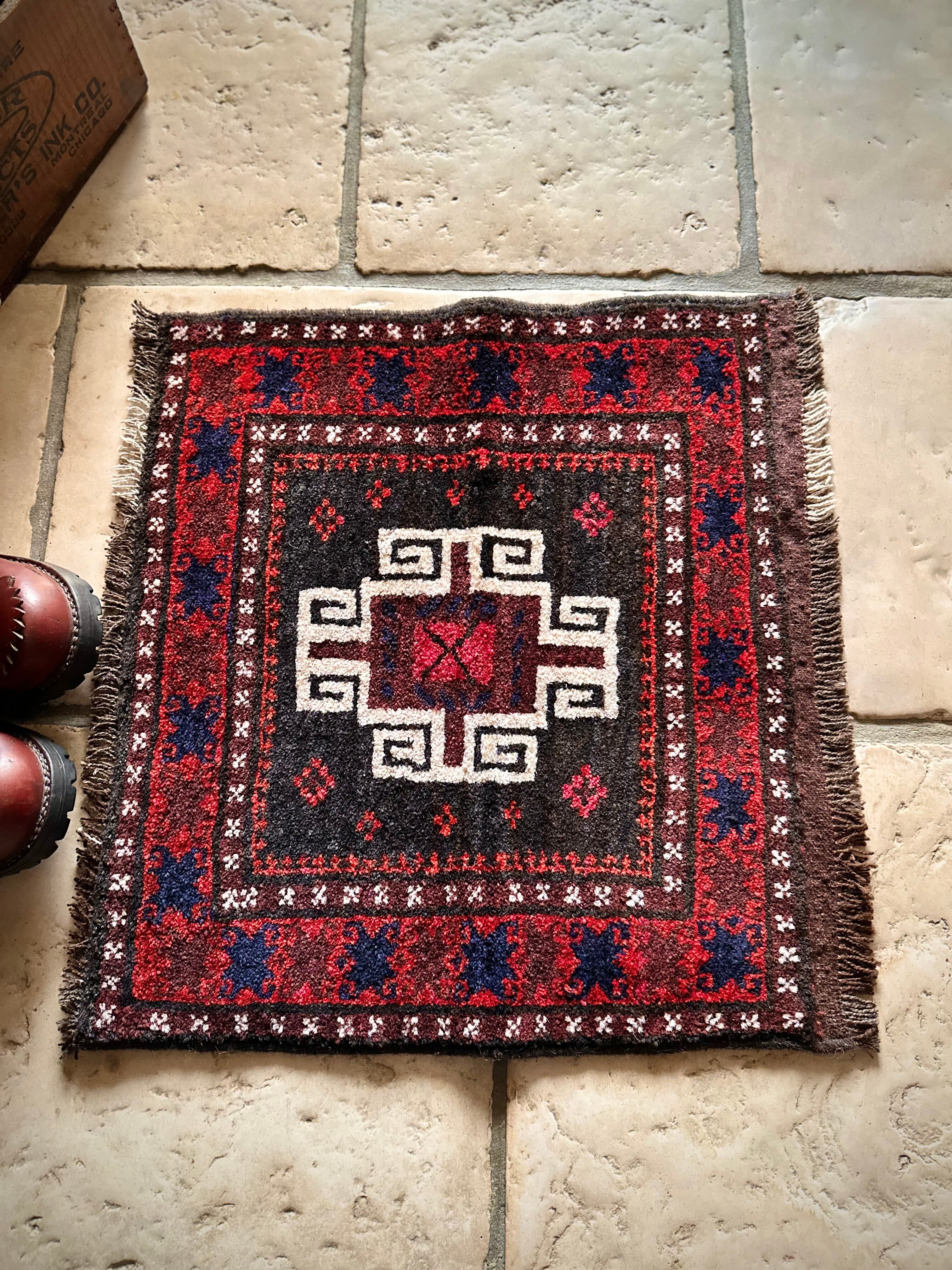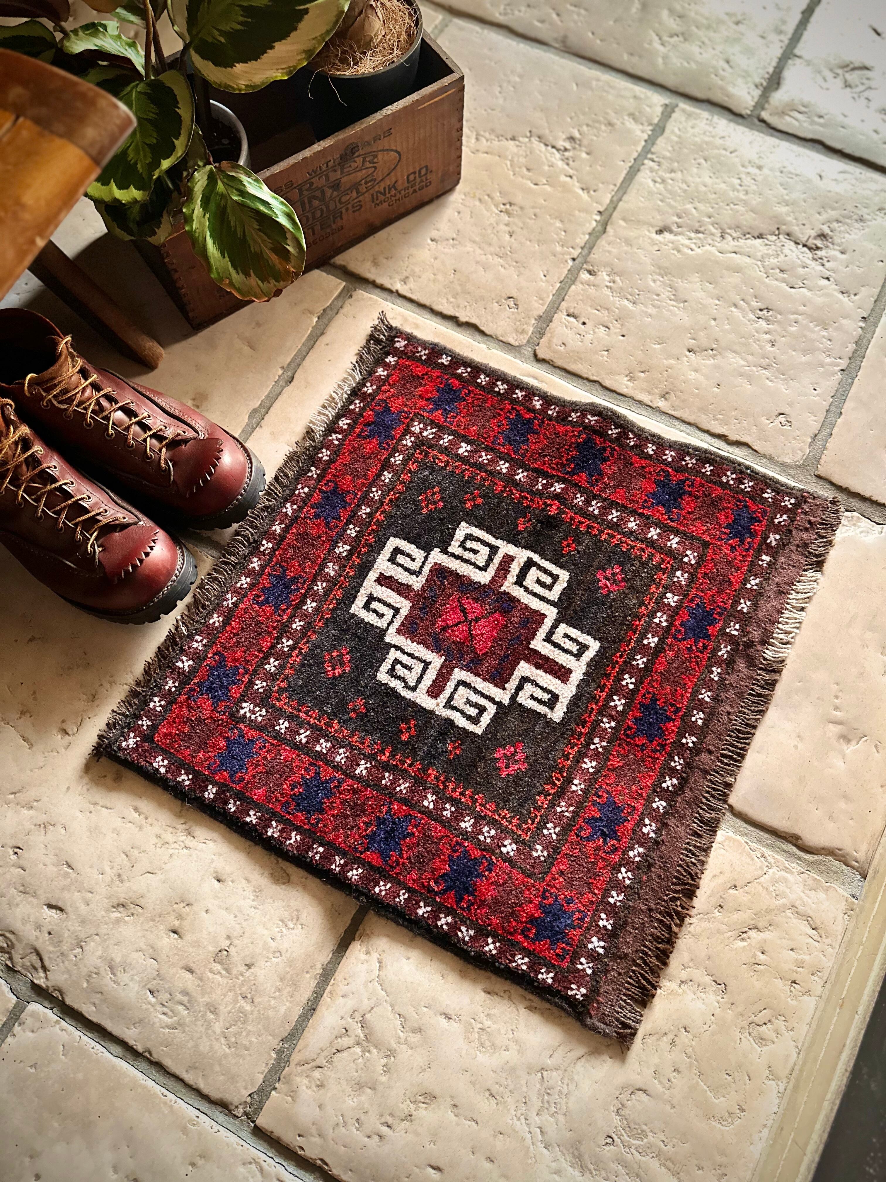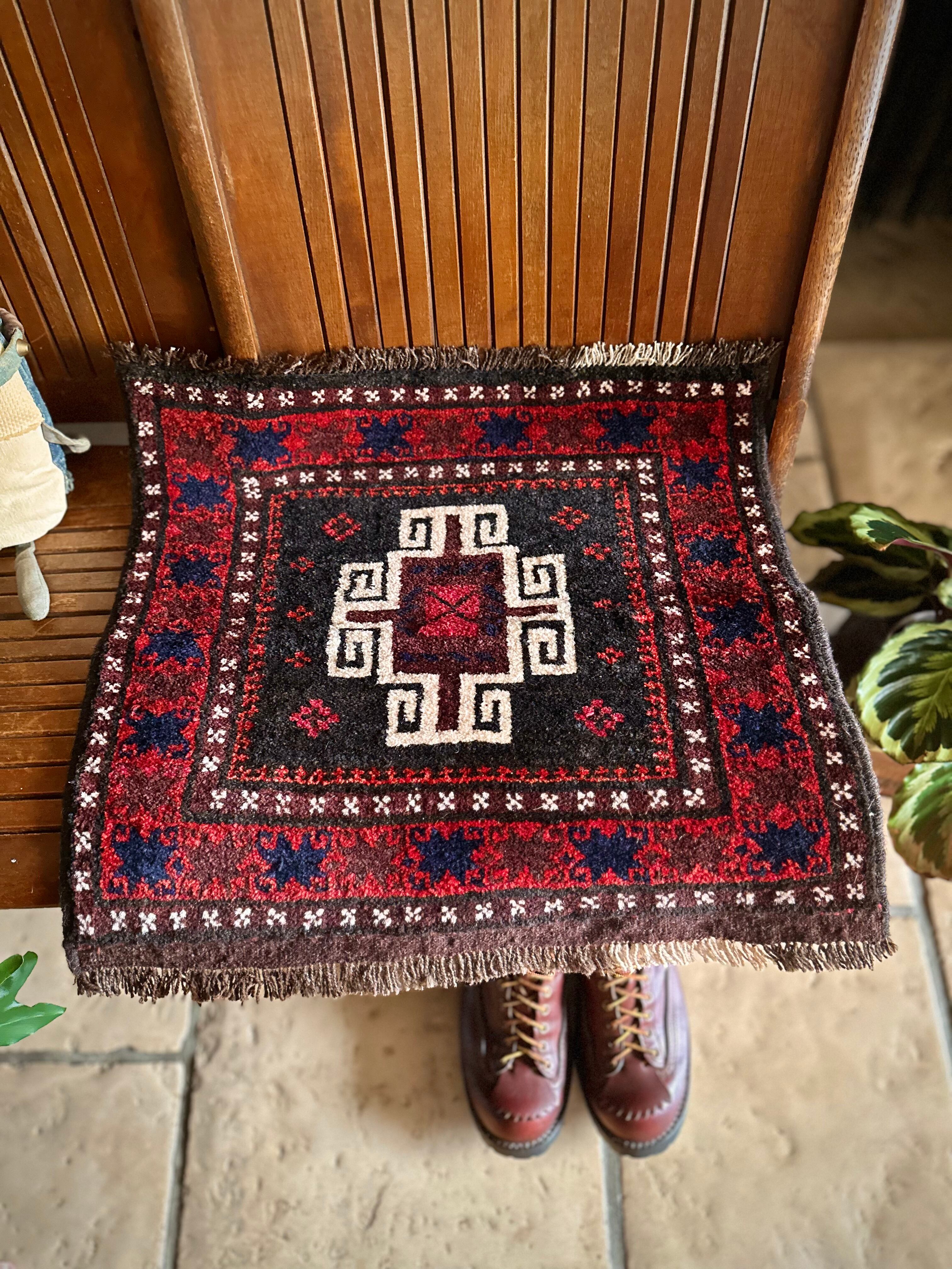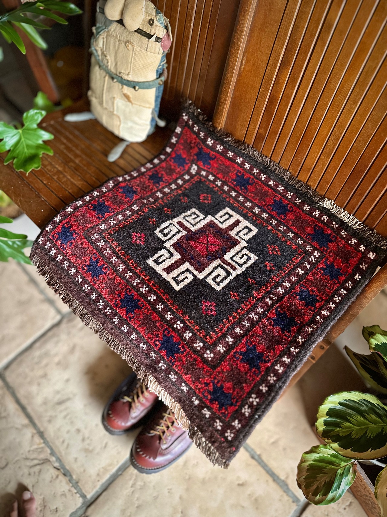 小振りなサイズながらもブラック&レッドのかっこいい色合いに、ホワイトで浮き彫りにされた模様がヘラート産バルーチらしいトライバルラグで、元々はホルジンと呼ばれるラクダやロバの背に跨がせるサドルバッグの表皮をラグに仕立て直したモノになり、本来なら2対セットの内の片側だけになります。