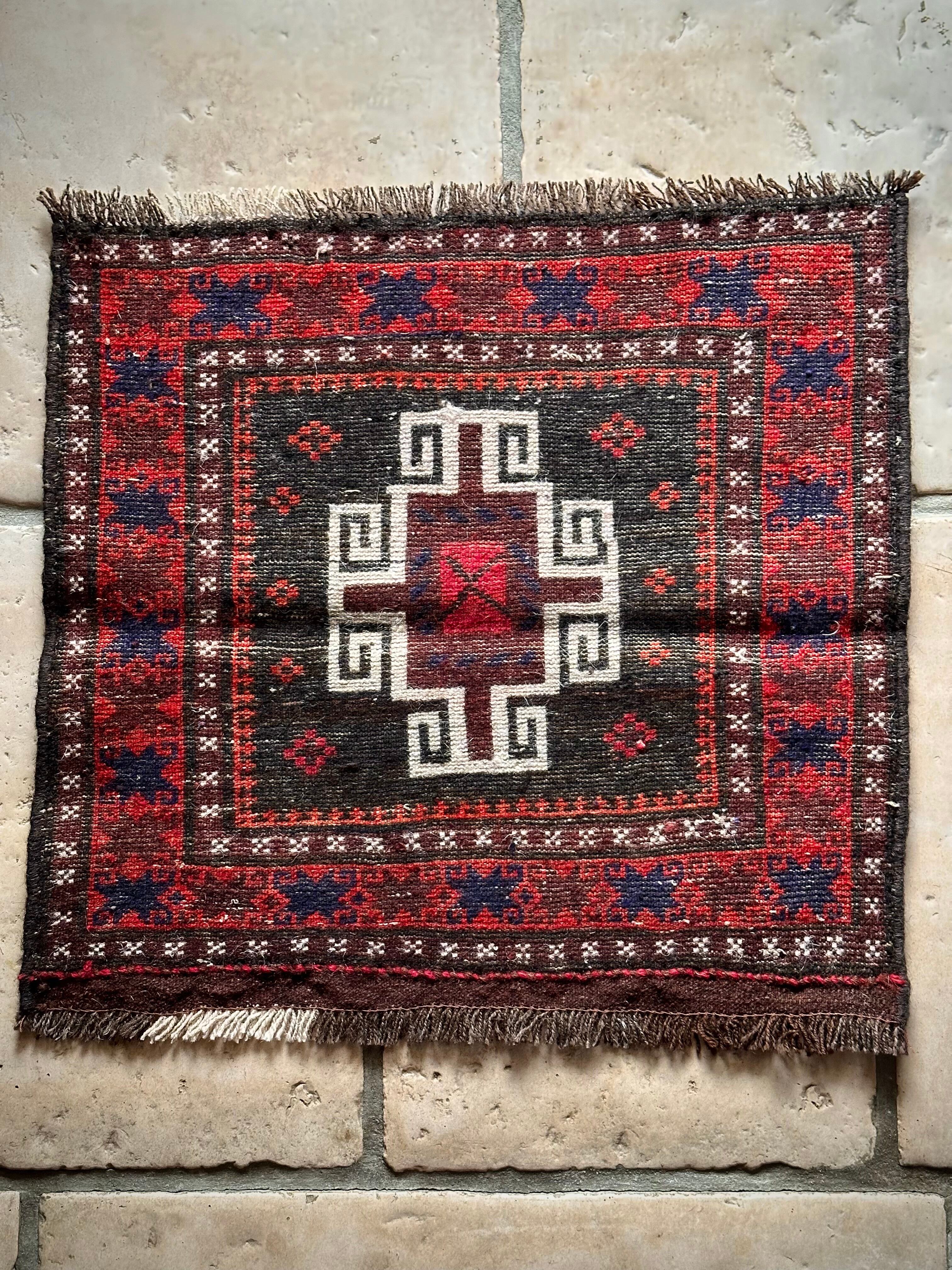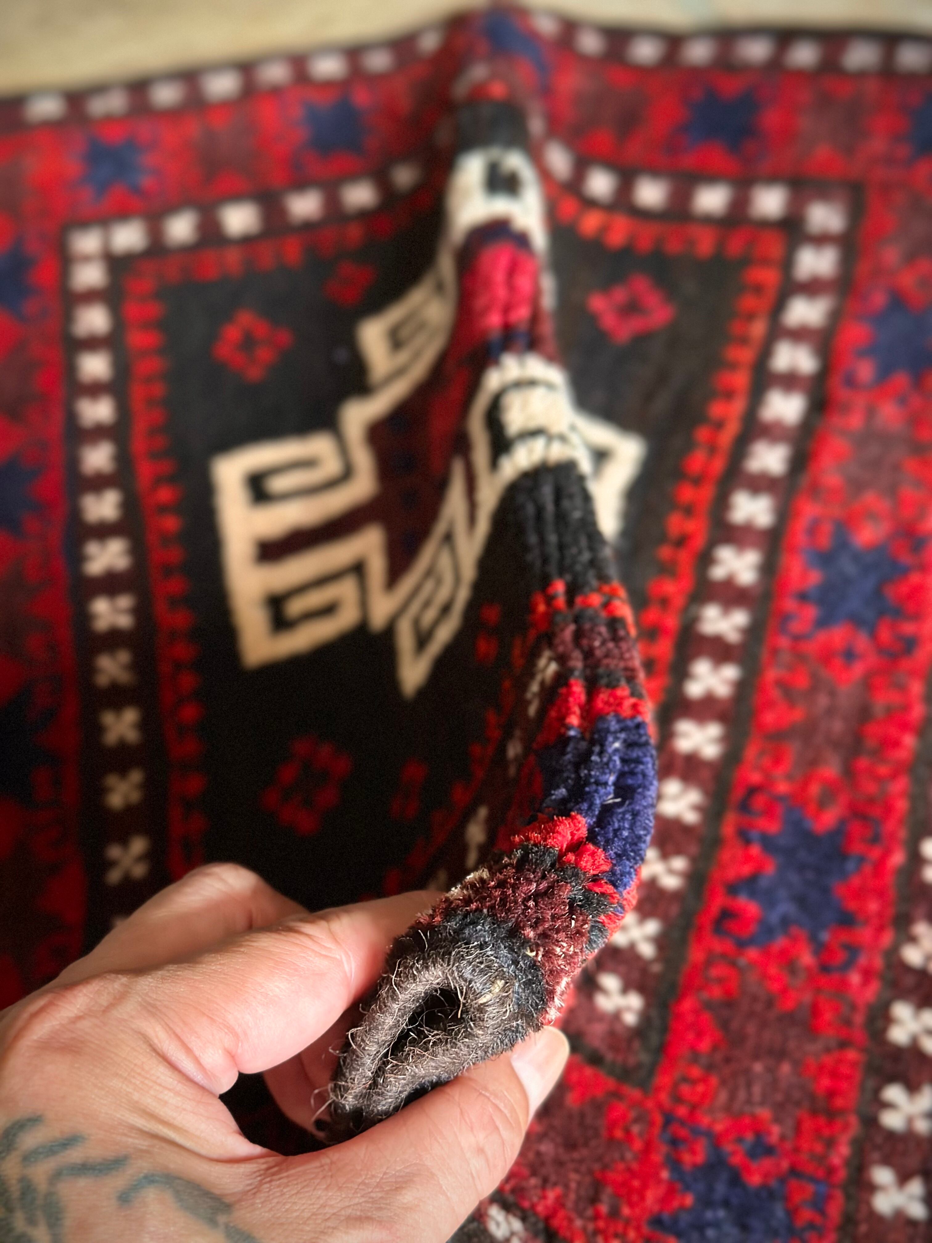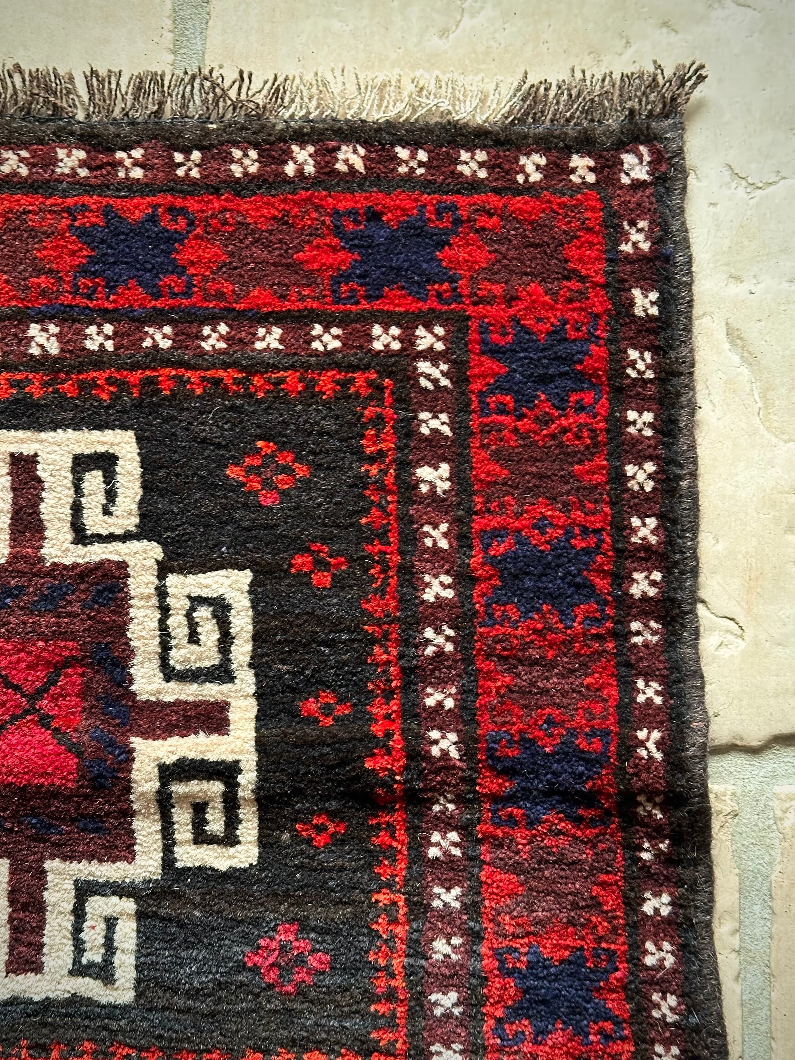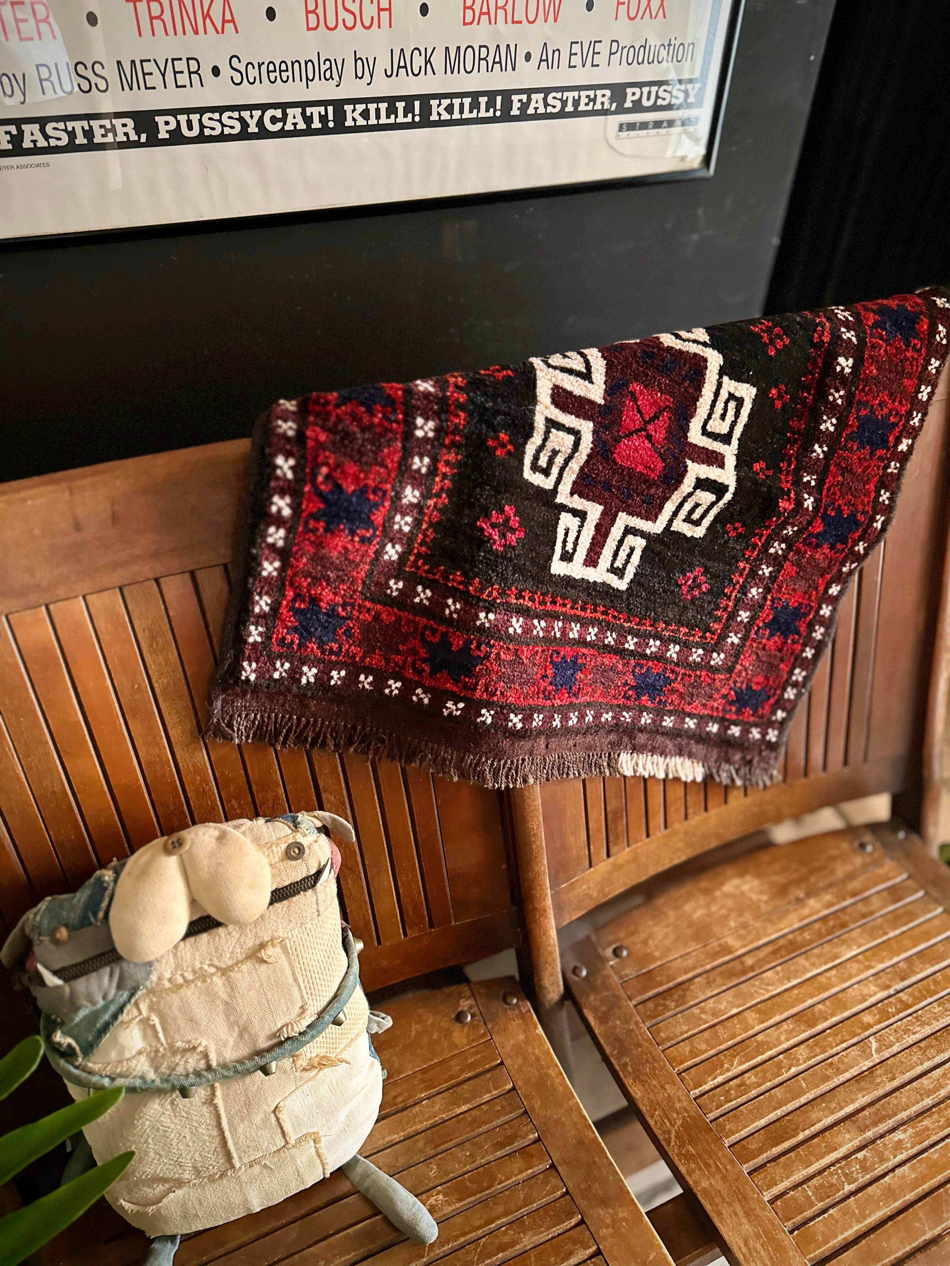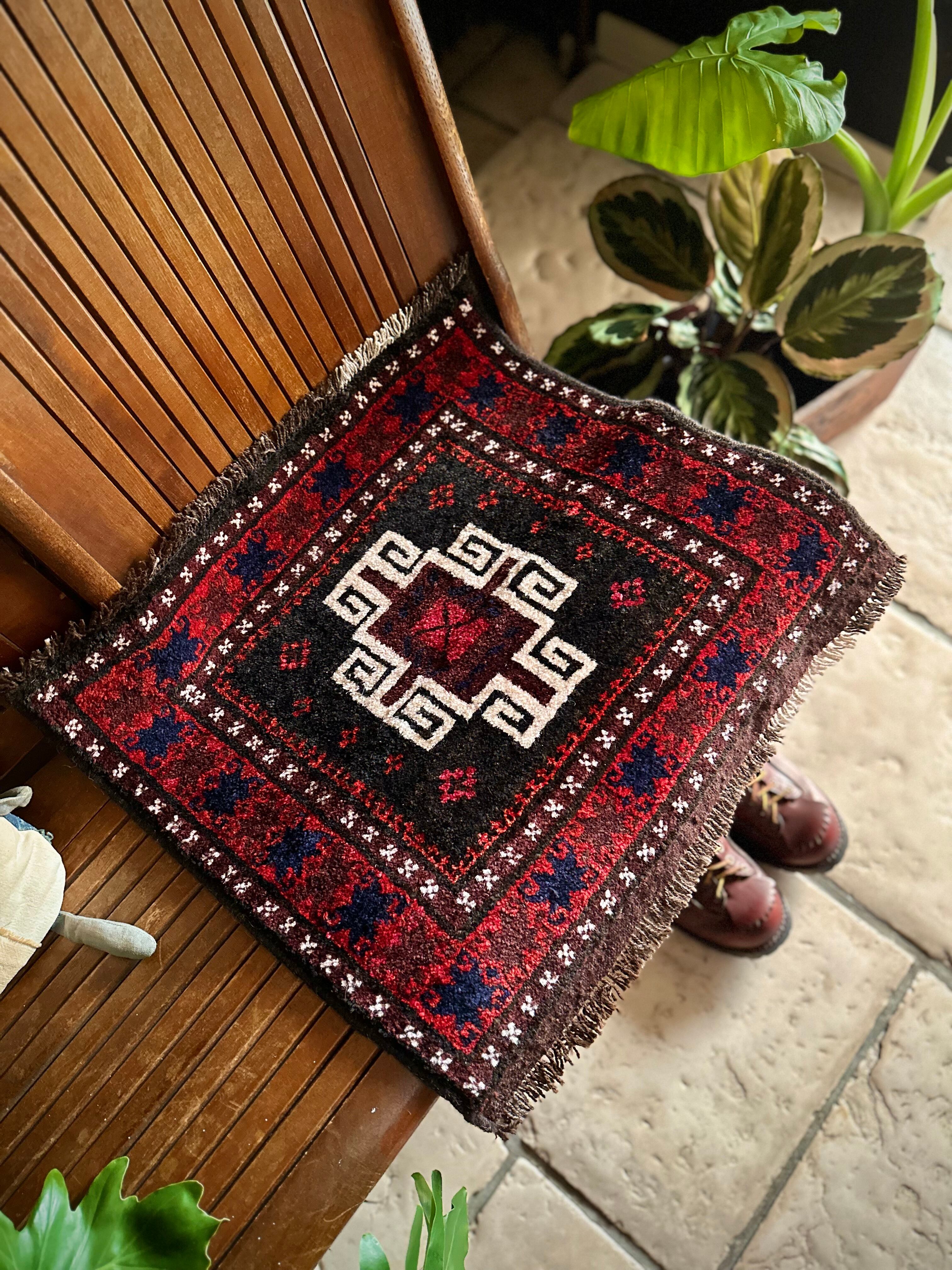 小振りなサイズながらもブラック&レッドのかっこいい色合いに、ホワイトで浮き彫りにされた模様がヘラート産バルーチらしいトライバルラグで、元々はホルジンと呼ばれるラクダやロバの背に跨がせるサドルバッグの表皮をラグに仕立て直したモノになり、本来なら2対セットの内の片側だけになります。