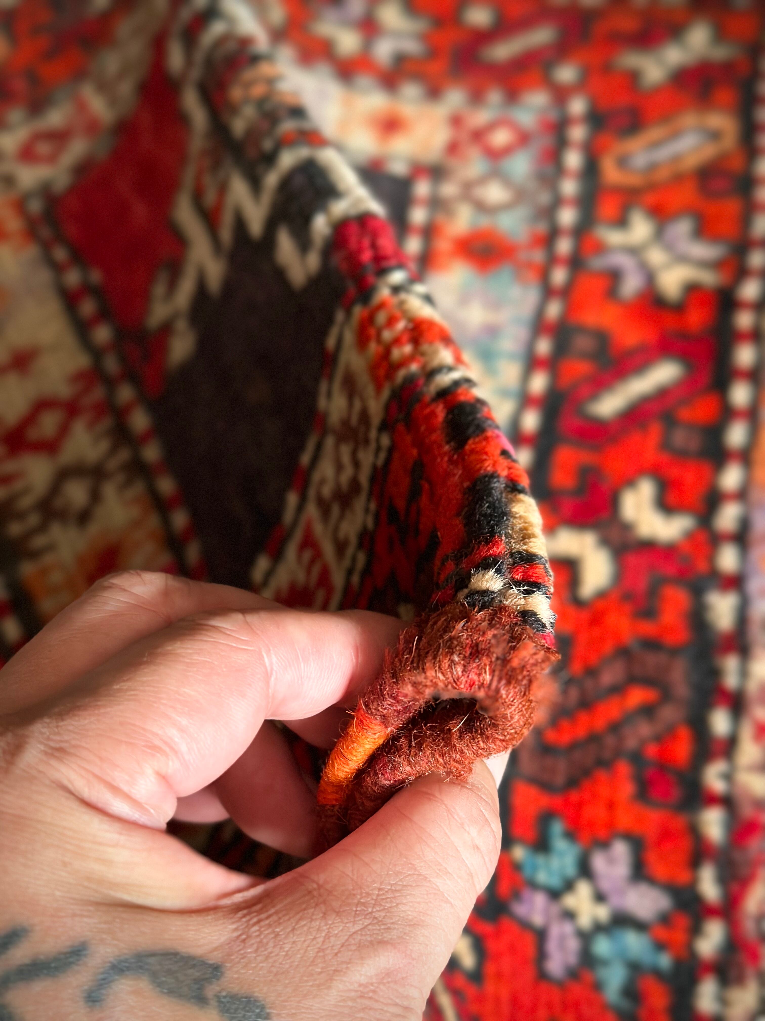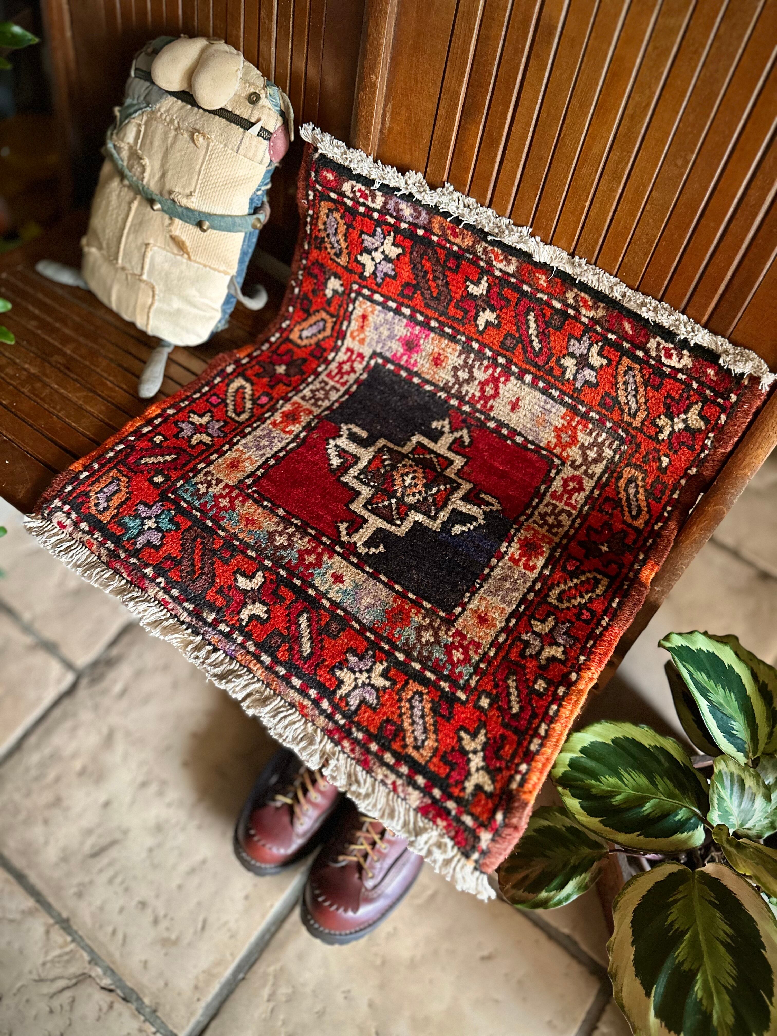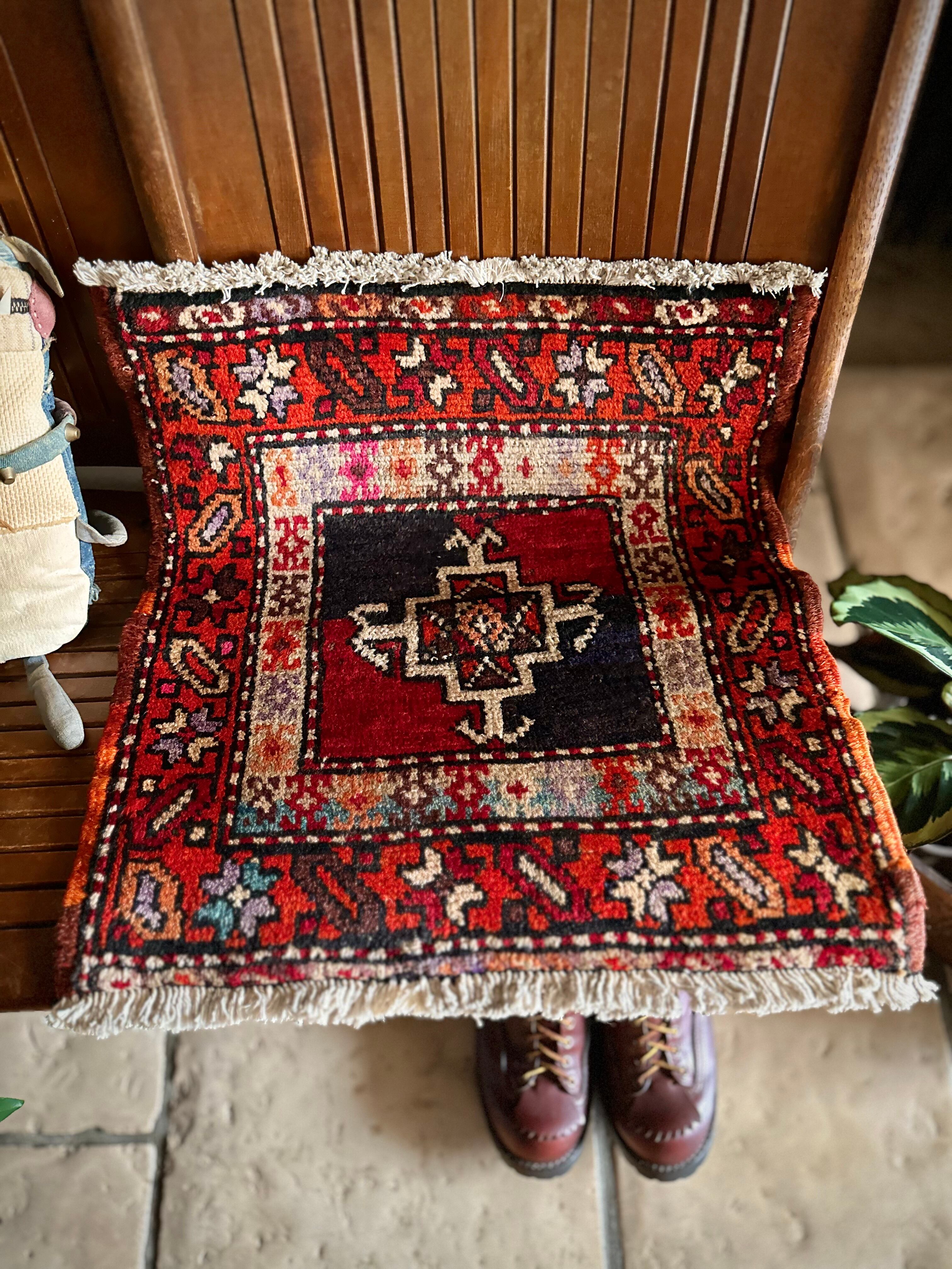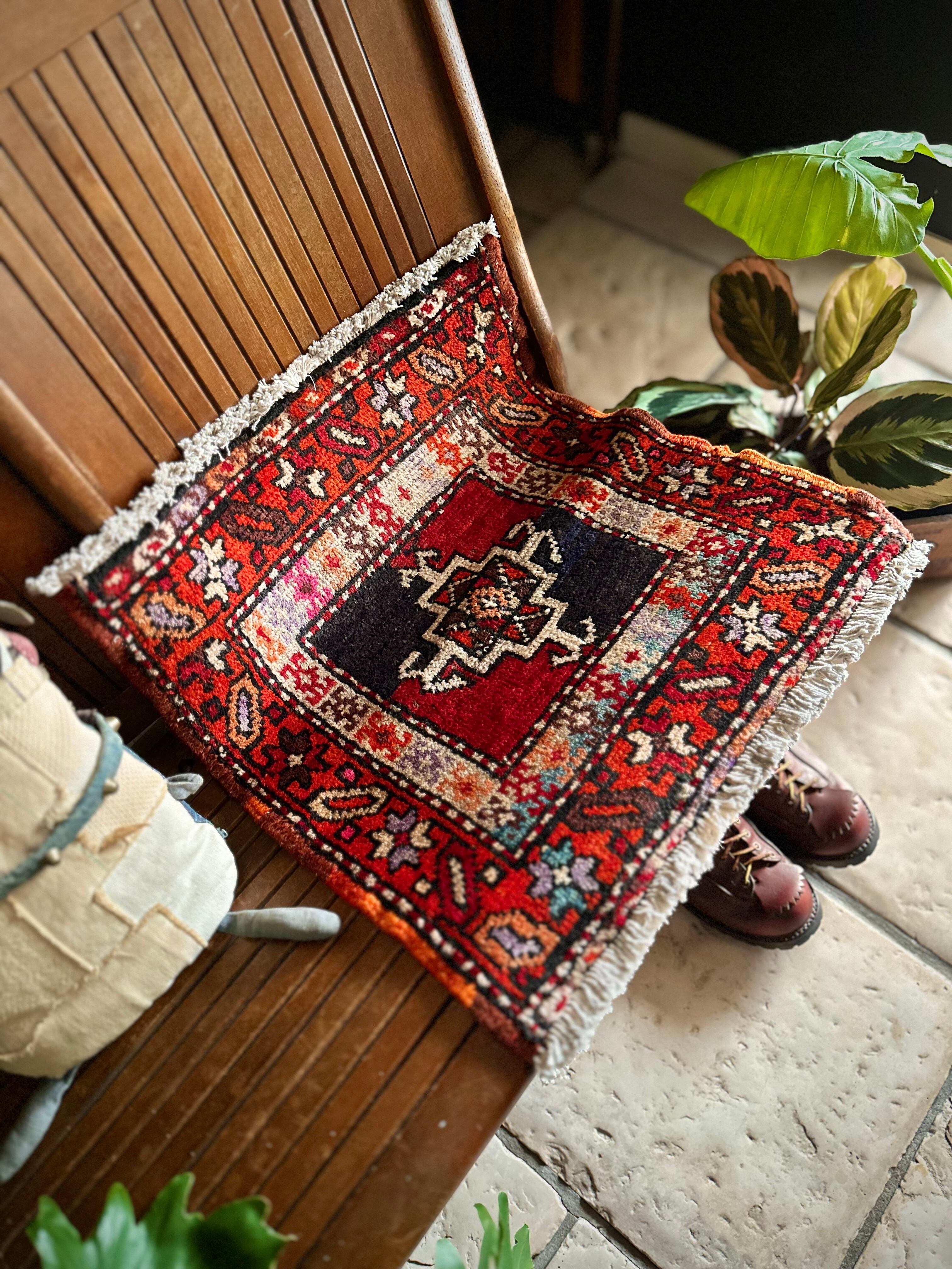 トルコからイラン北西部に跨る山岳地帯に古くから先住民族として遊牧するクルド族からのトライバルラグで、元々はホルジンと呼ばれるラクダやロバの背に跨がせるサドルバッグの表皮をラグに仕立て直したモノになり、本来なら2対セットの内の片側だけになります。