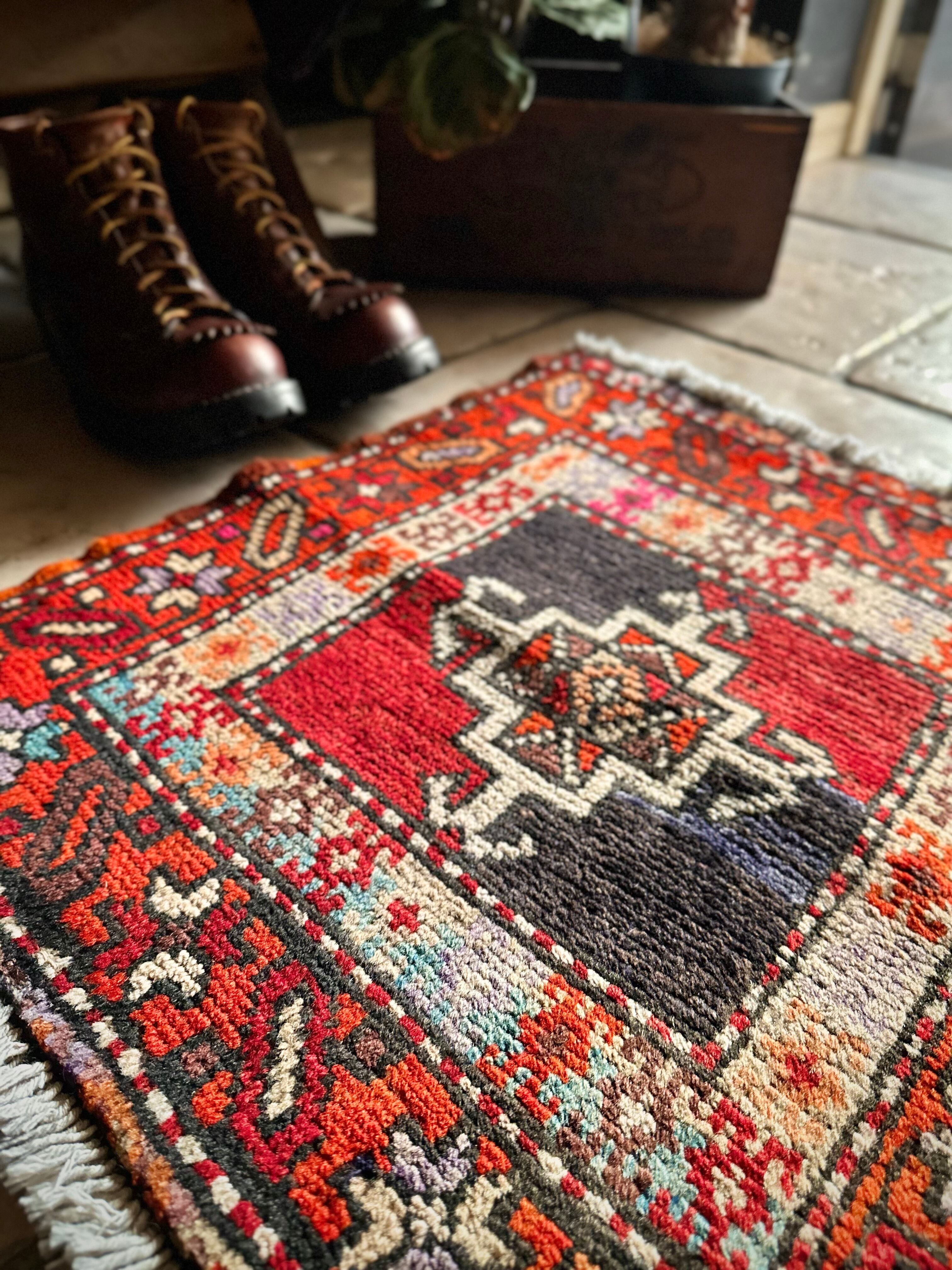 最後にラグそのものに関しては羊毛特有の匂いがあり、採寸は中央付近で計測していますが、手織りならではの歪みによる誤差や水洗いクリーニングによる縮み、また草木染めによる経年劣化の色ムラなどがありますが、それもまたヴィンテージラグの魅力かとご理解ください。