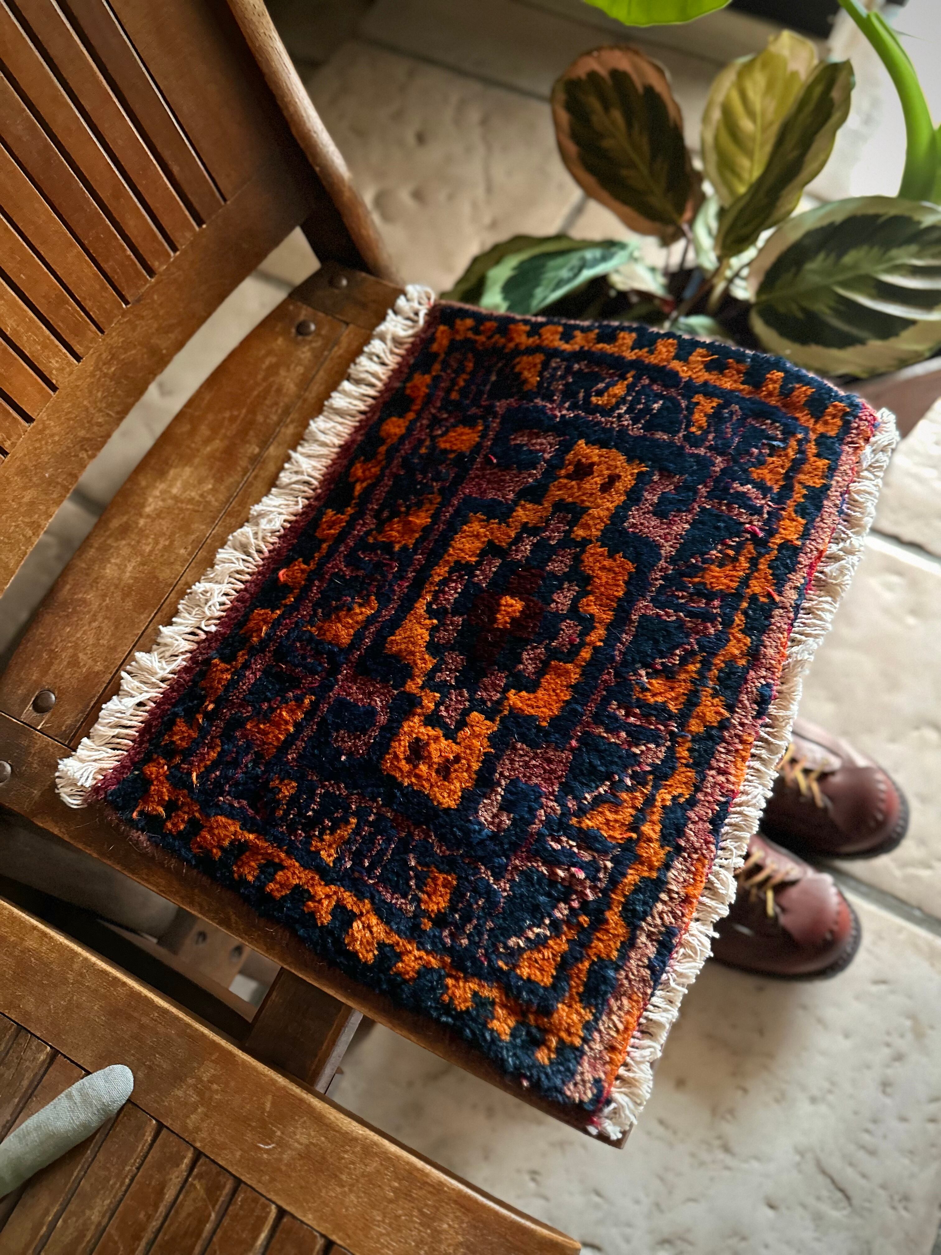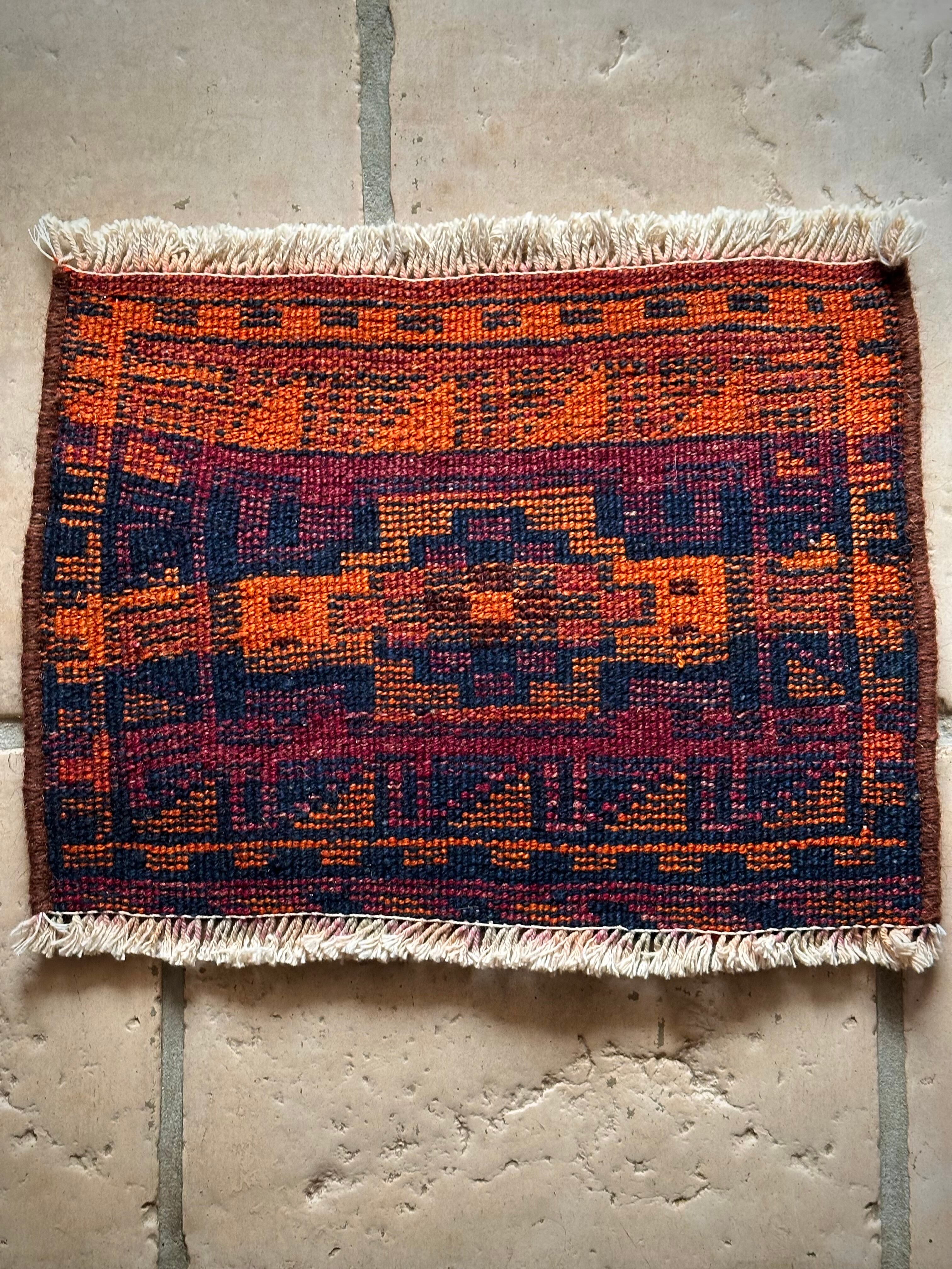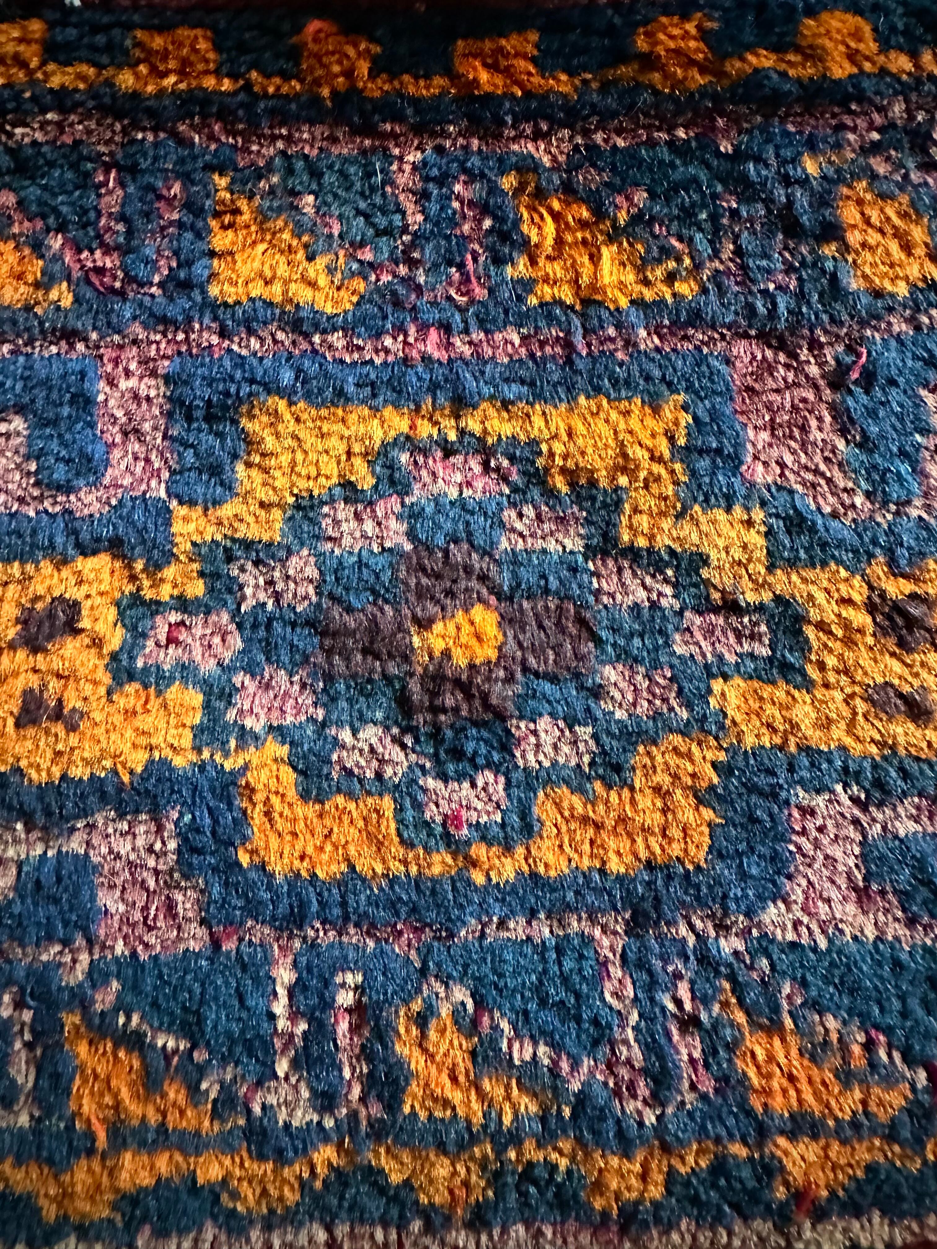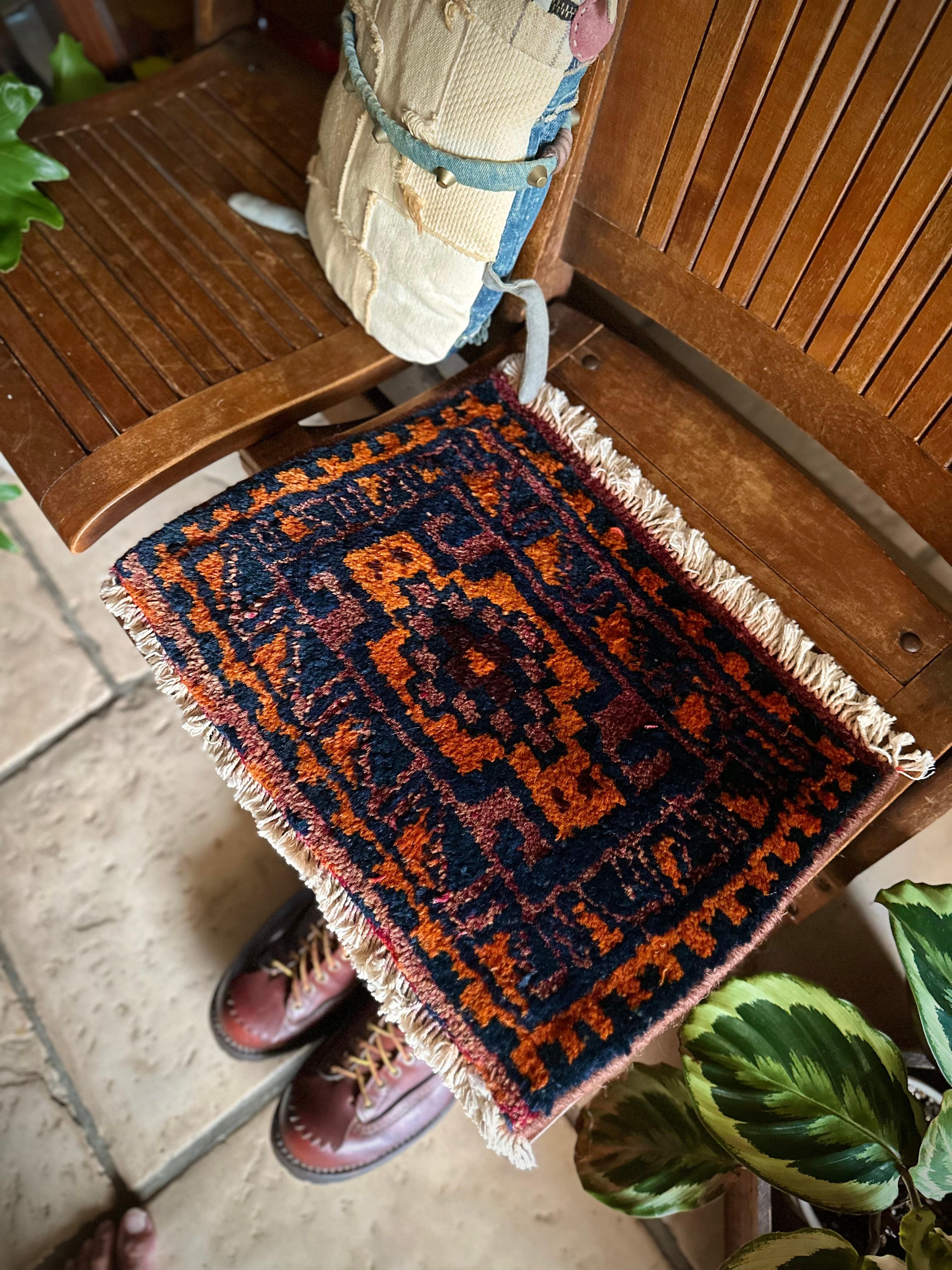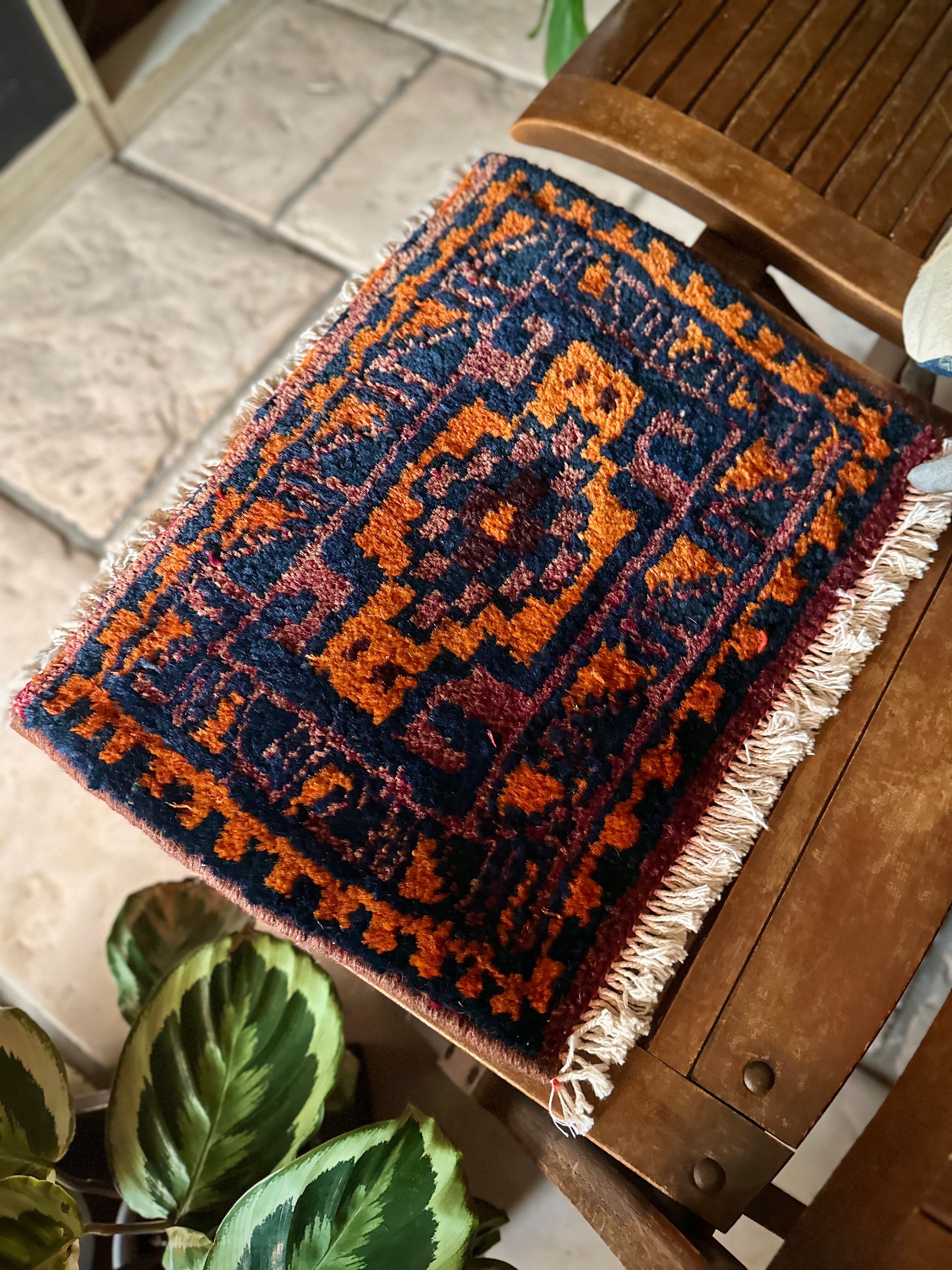 チャンテとは遊牧民が移動する際に用いる小振りな袋で、主に生活用品や家畜の飼い葉を収納する丈夫な手提げバッグになりますが、マチのない作り故に実用性がありませんので、パイル部分のみを小さな敷物として仕立て直したモノになり、ロリ族独特な毛足の長さにネイビーとオレンジが映えるプリミティブなミニラグになります。