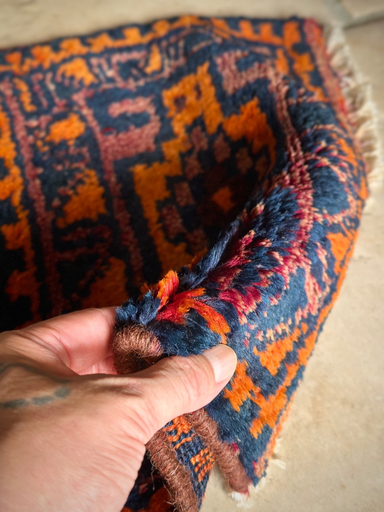 経年としては35年とそれなりのヴィンテージ品になりますが、バッグとして使用していた為に目立つ経年劣化もなく、ざっくりとした織りで柔らかな手触りになります。また特に目立つダメージやリペア箇所が見当たらないグッドなコンディションで、トライバルラグ初心者の方でも気軽に取り入れてもらえます。