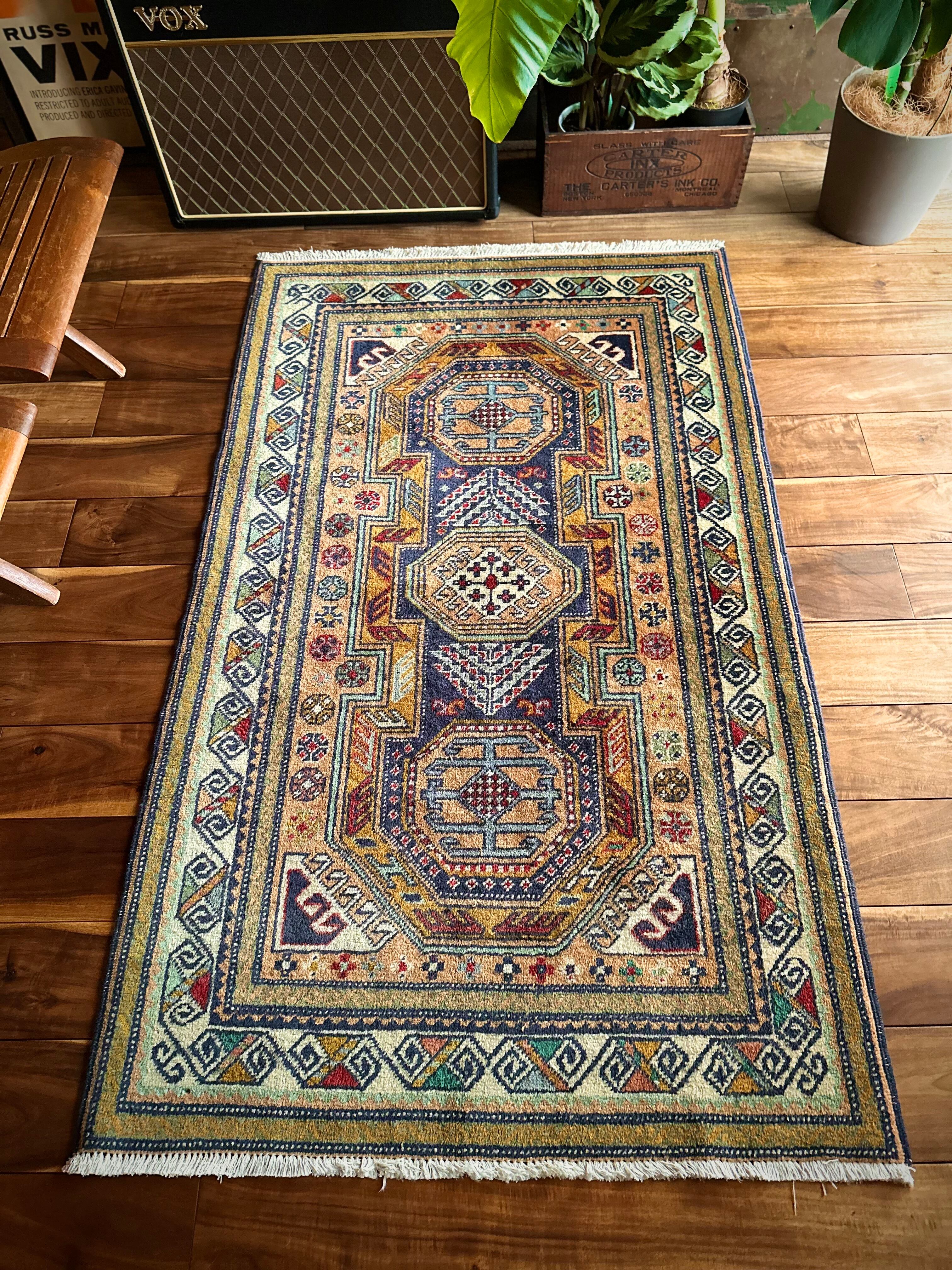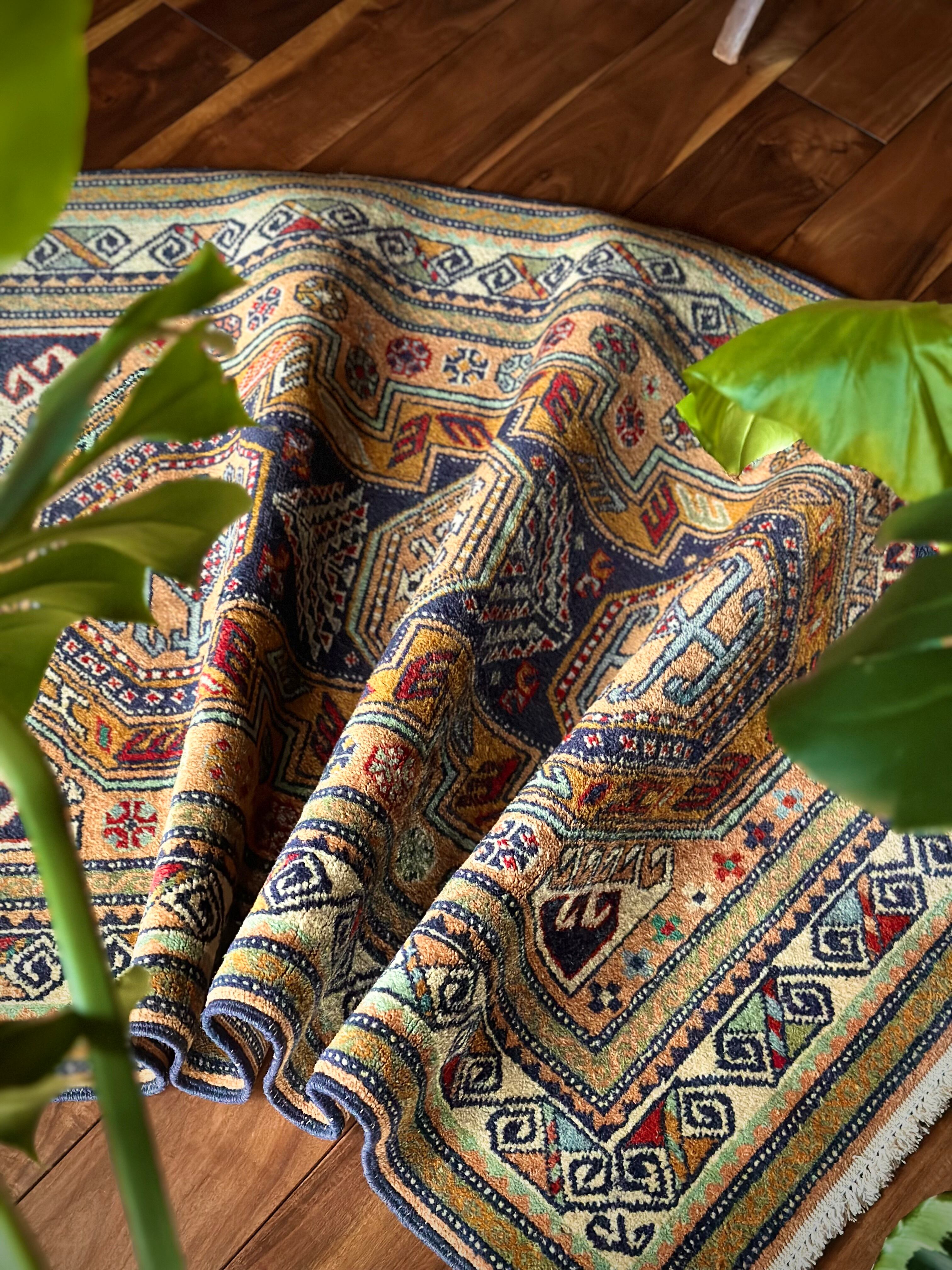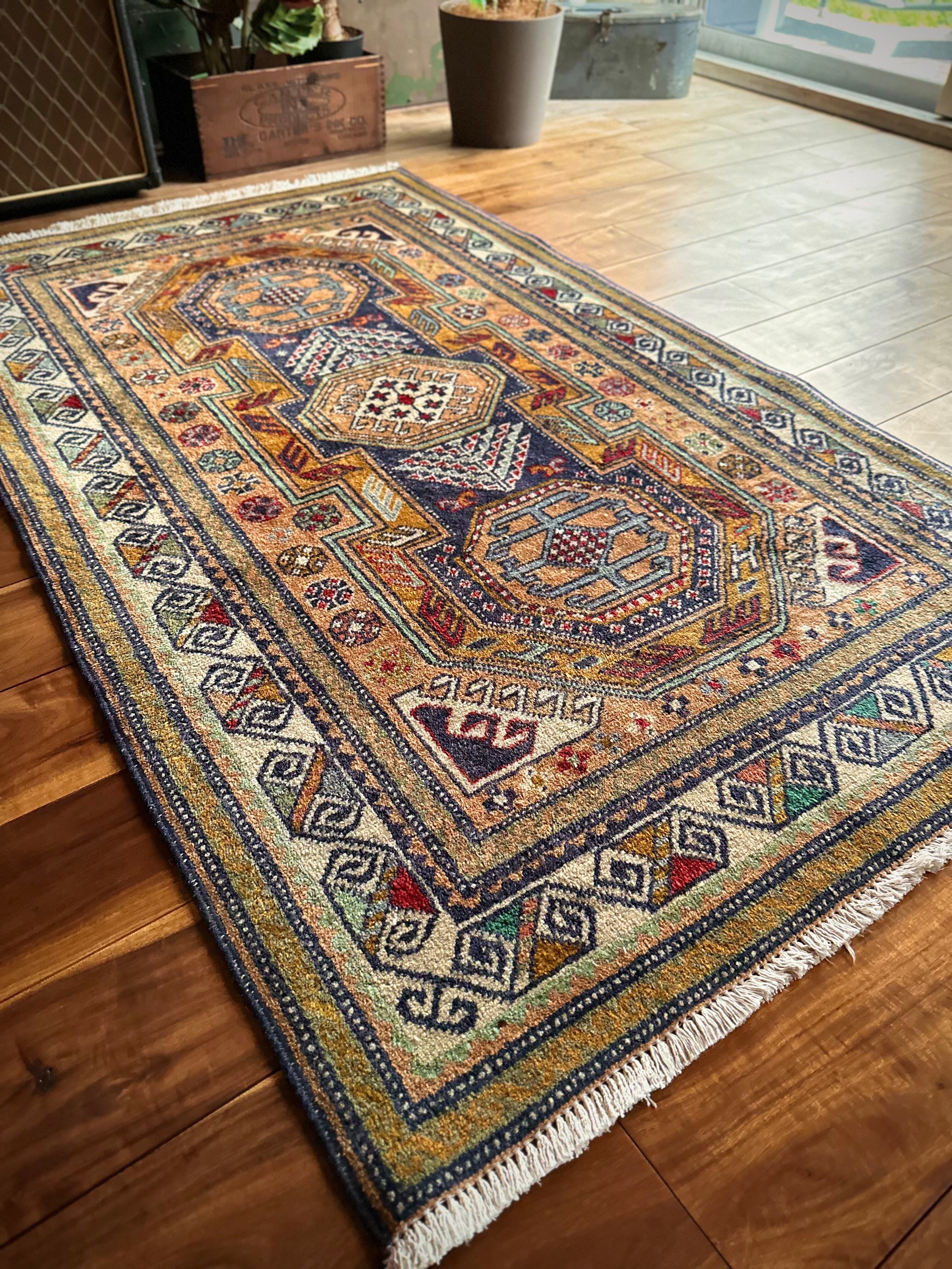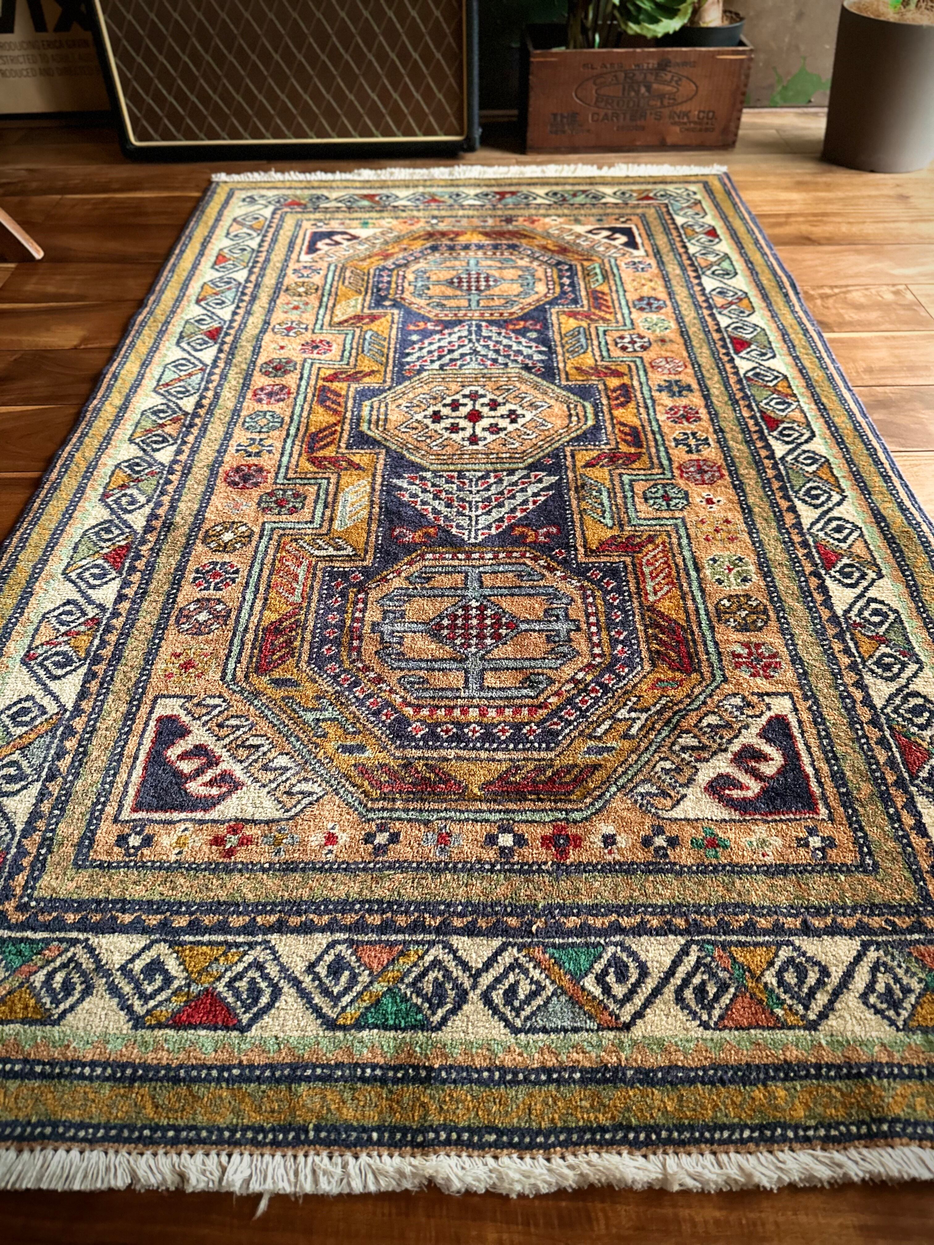 隣国トルコからアゼルバイジャン地方に通じる伝統的な絵柄にパキッとした輪郭がアルダビールらしい1枚で、色合い的にも合わせやすく広めの玄関や2人掛けソファ前に最適なミディアムサイズになります。