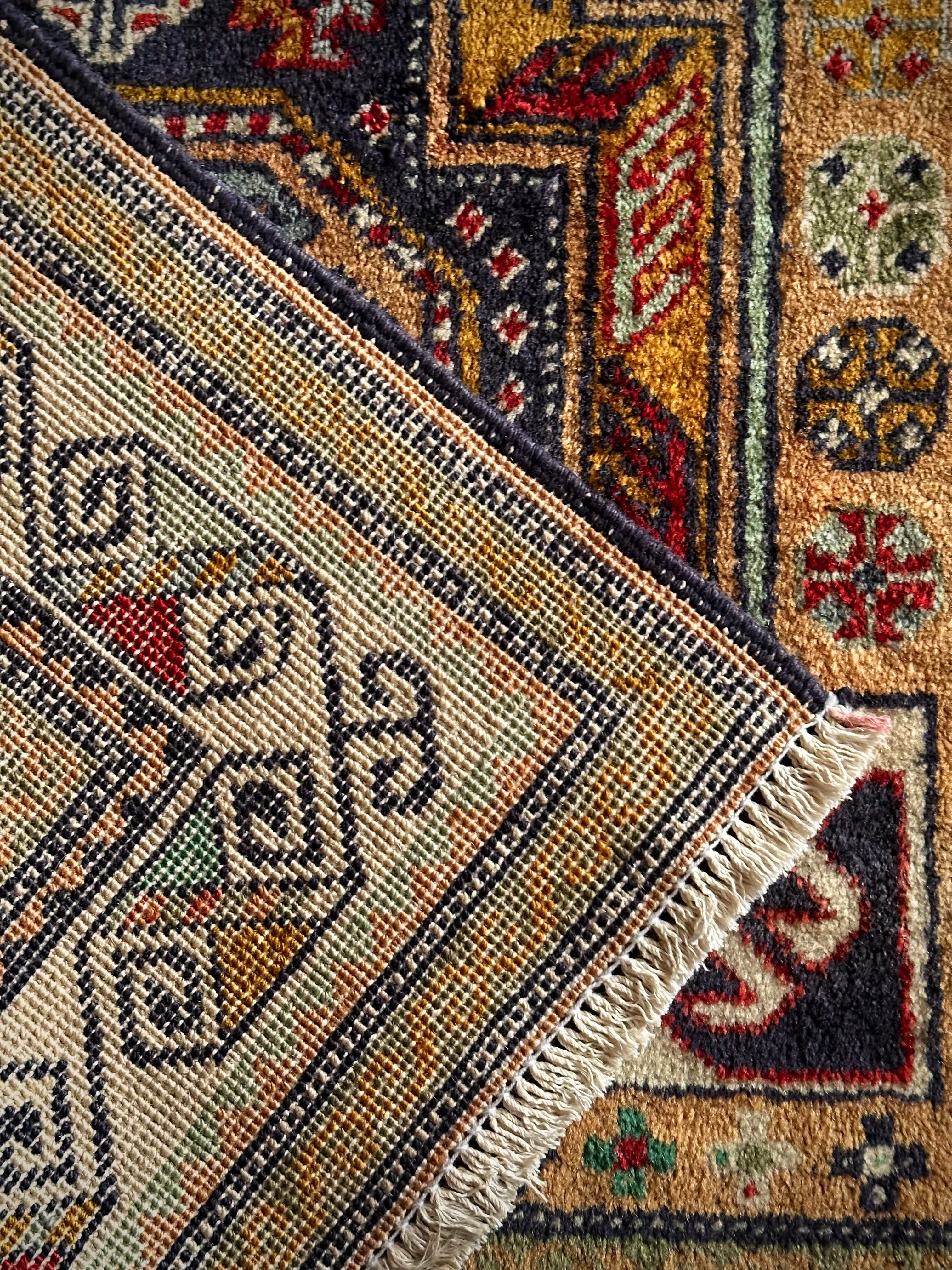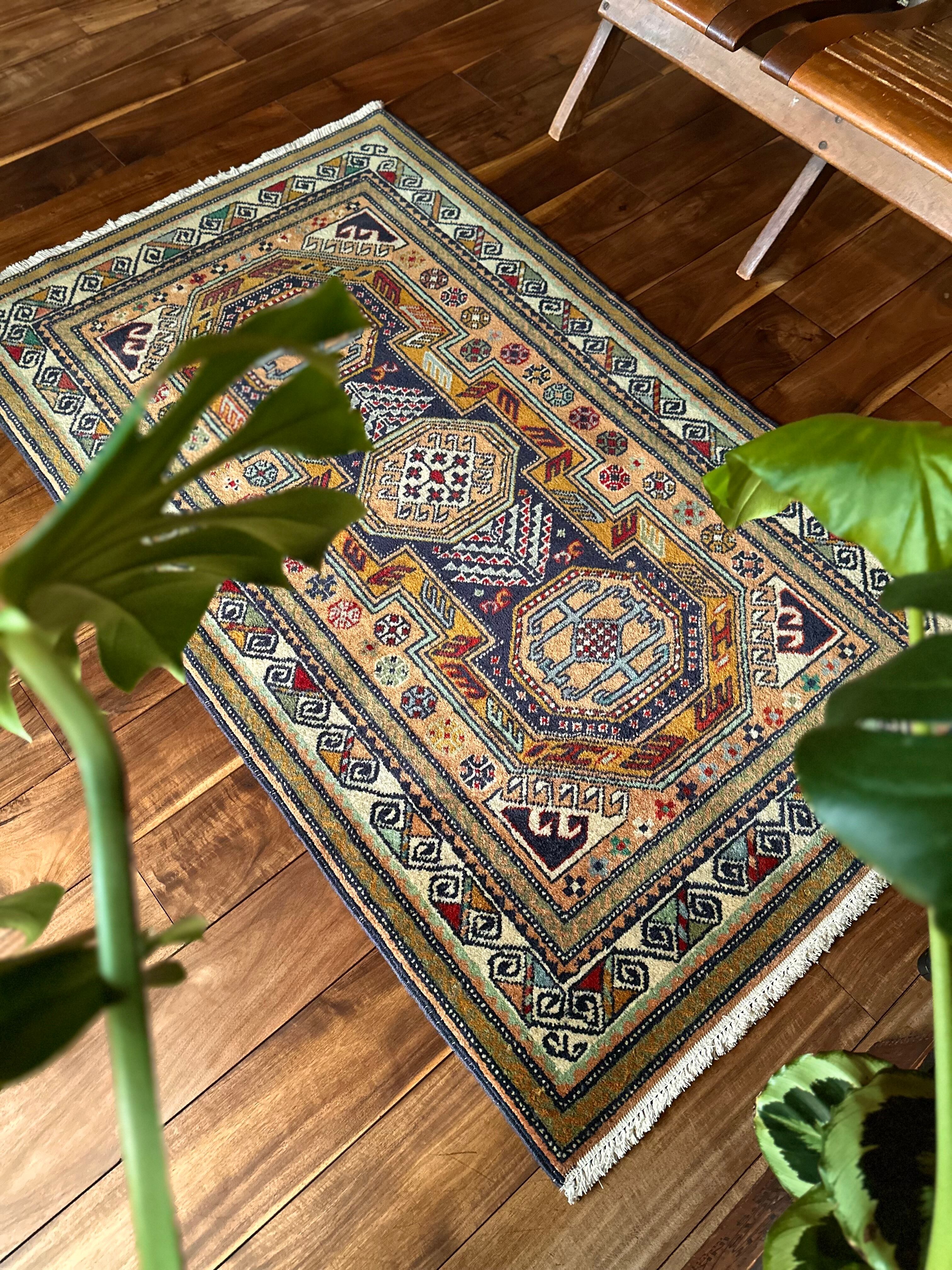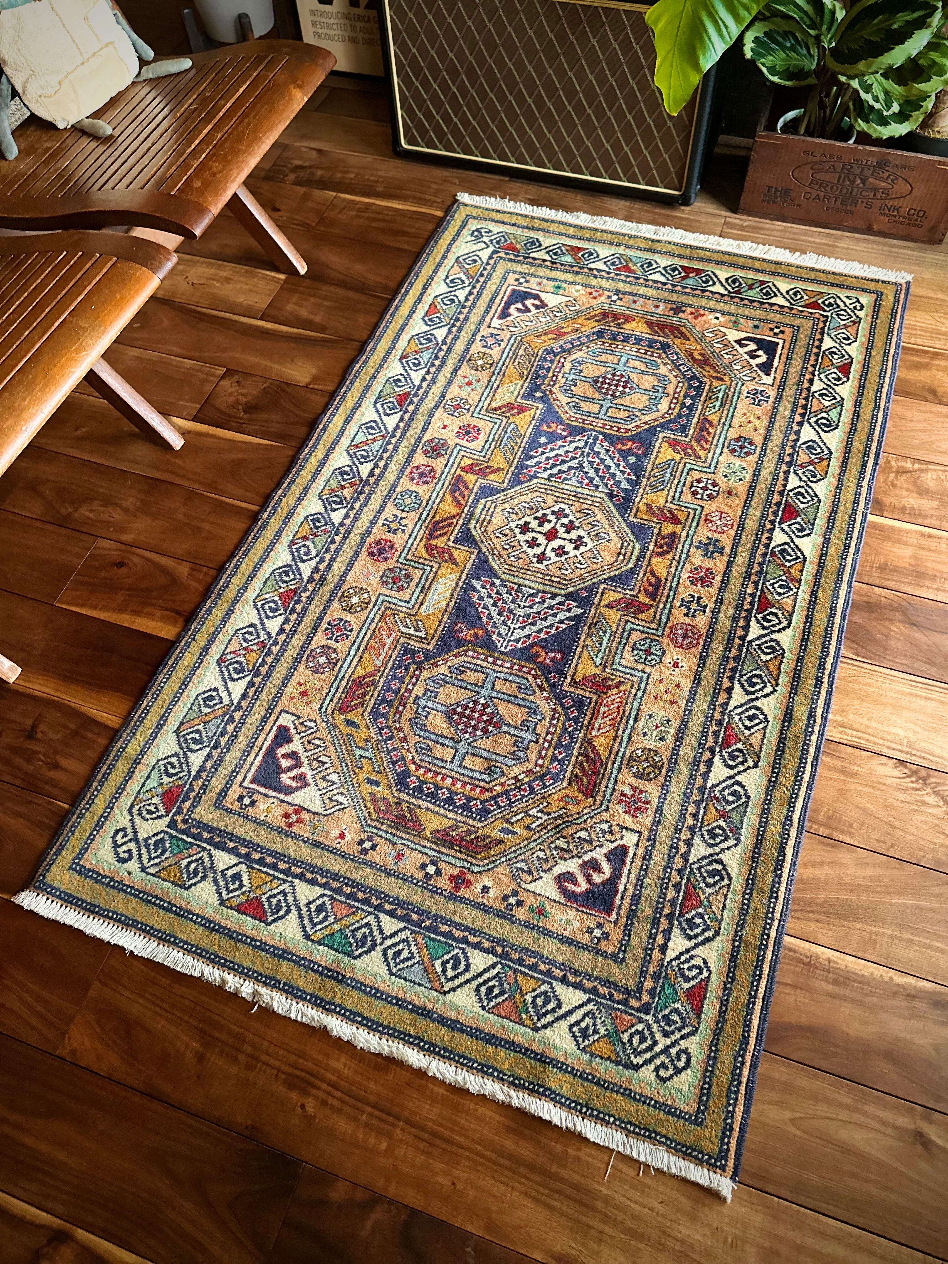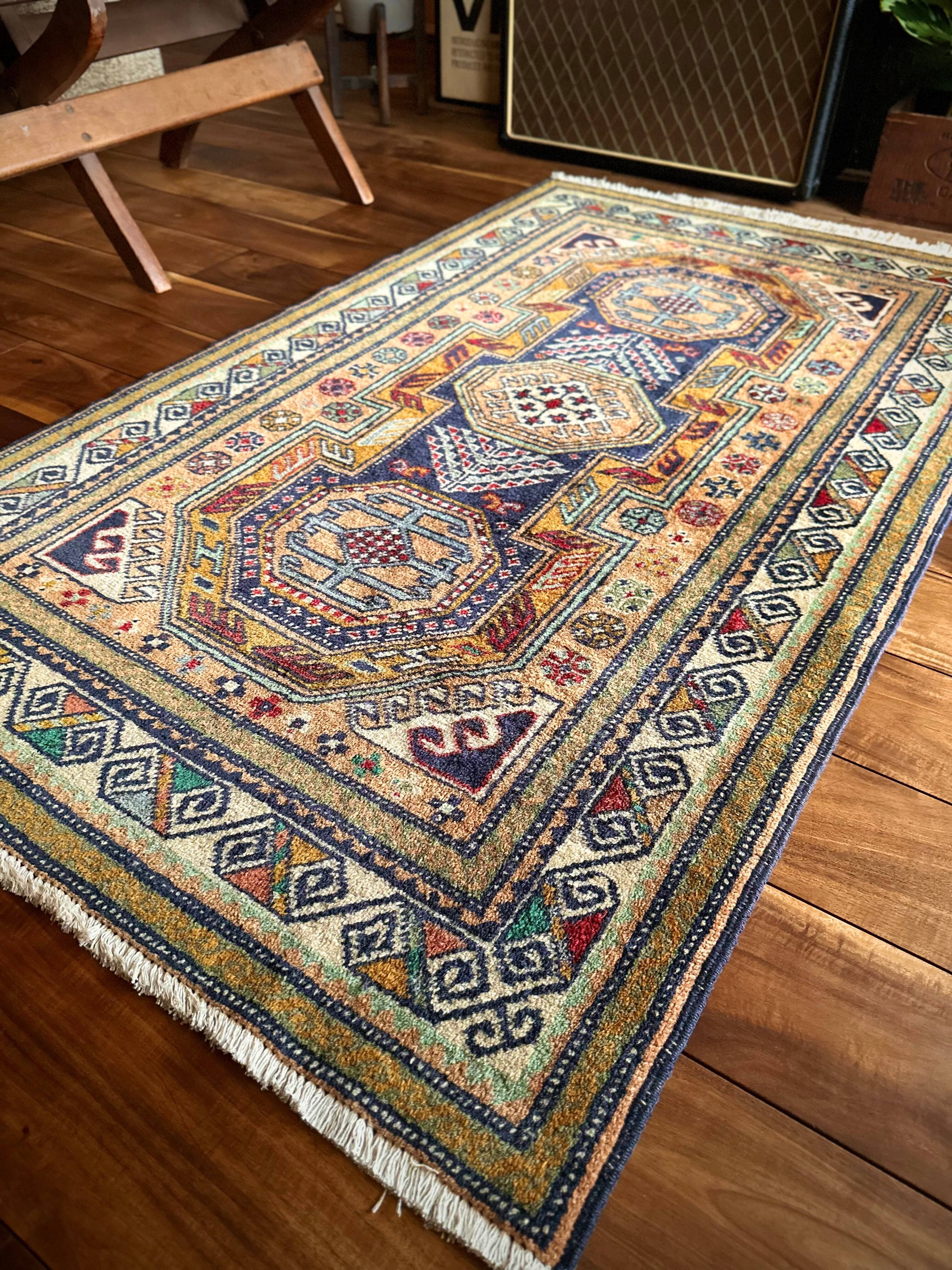 隣国トルコからアゼルバイジャン地方に通じる伝統的な絵柄にパキッとした輪郭がアルダビールらしい1枚で、色合い的にも合わせやすく広めの玄関や2人掛けソファ前に最適なミディアムサイズになります。