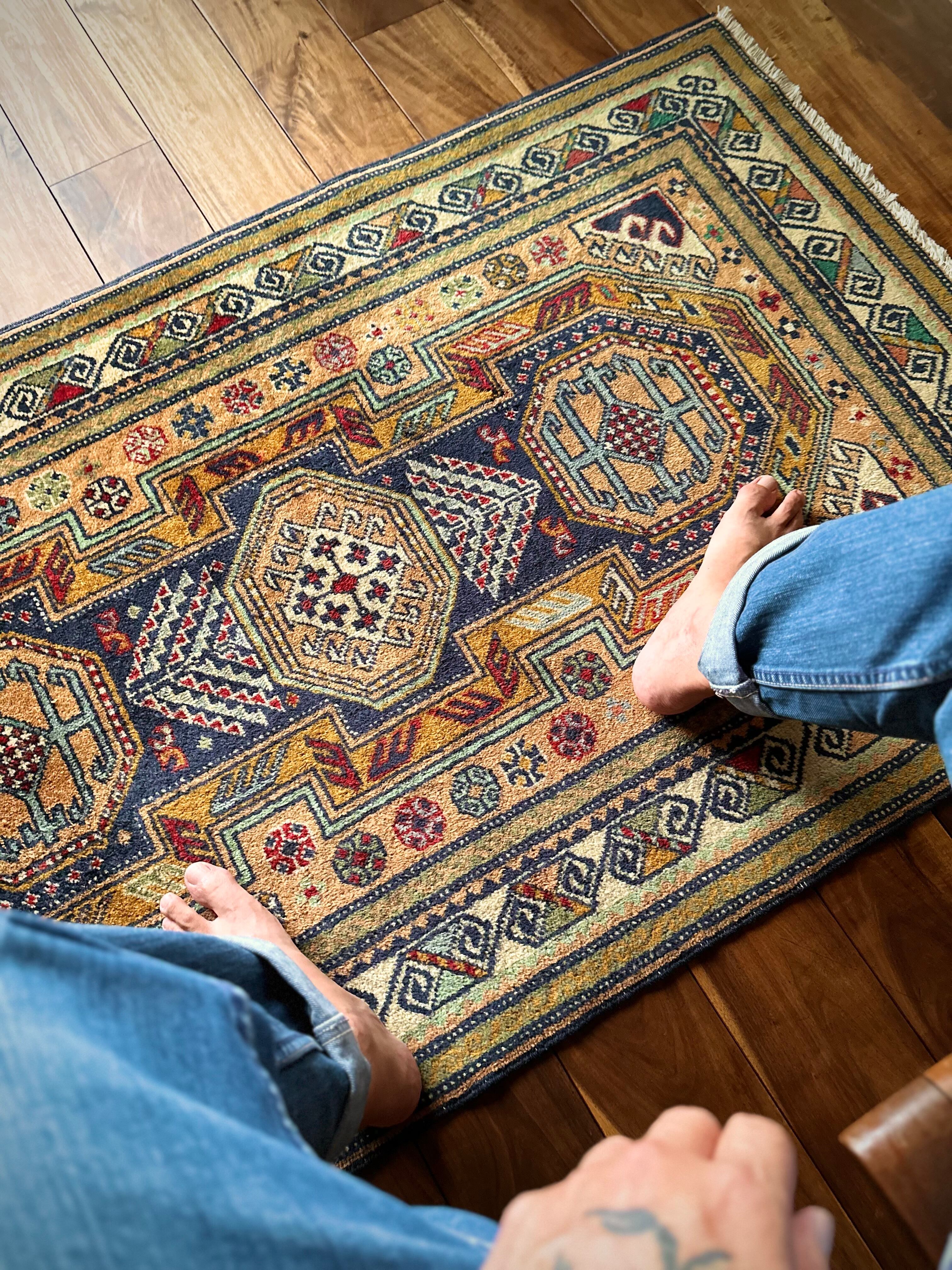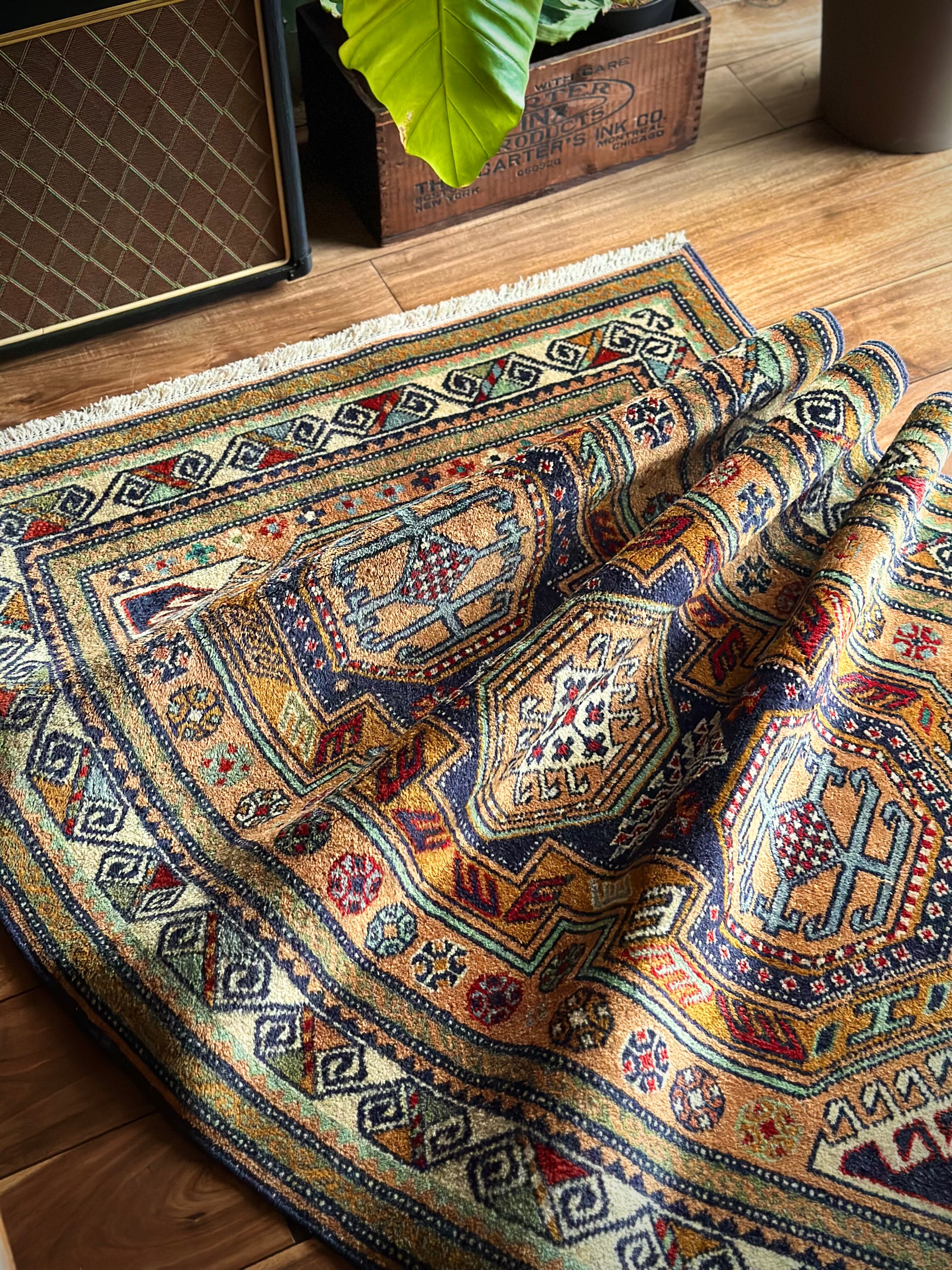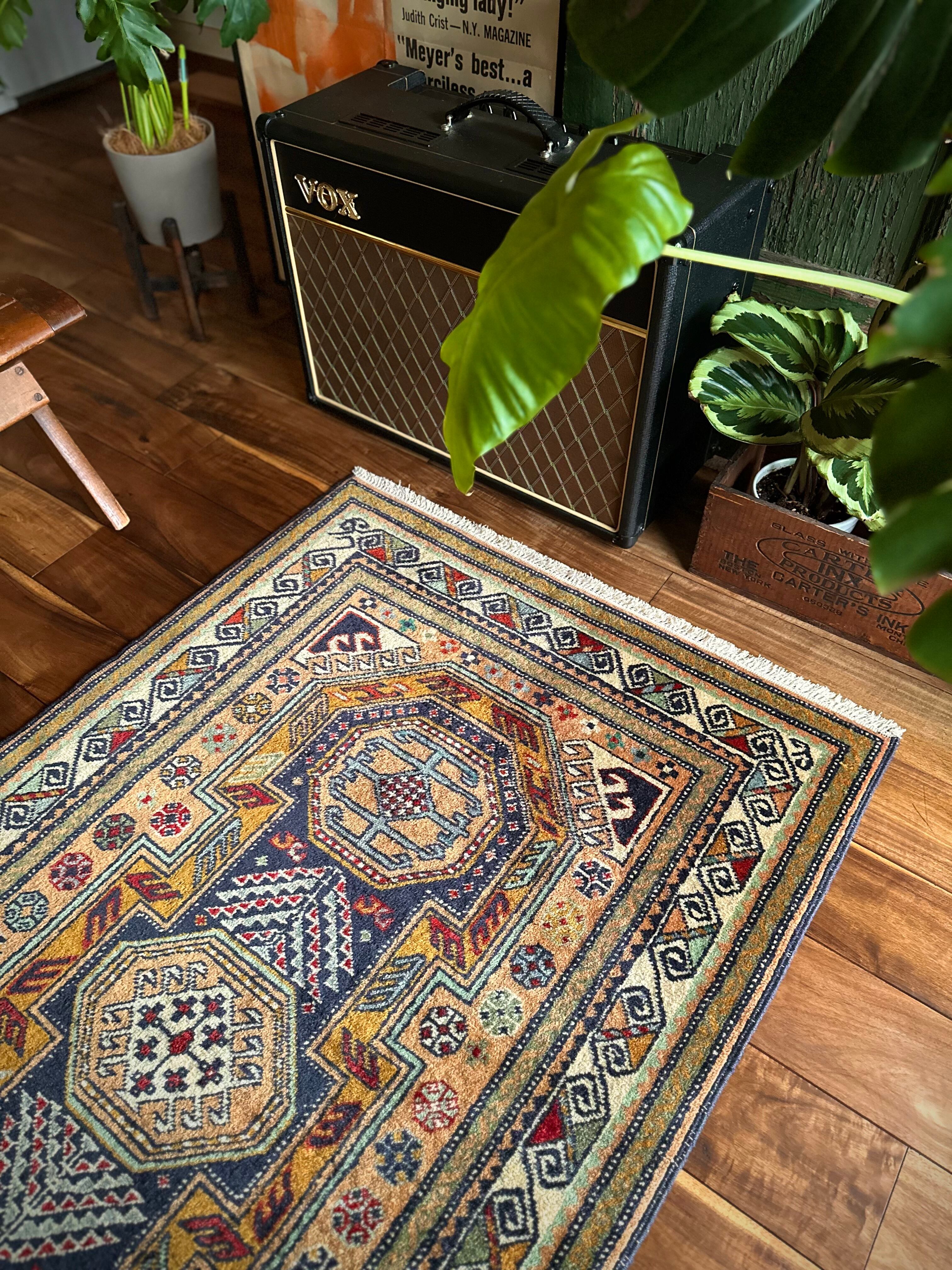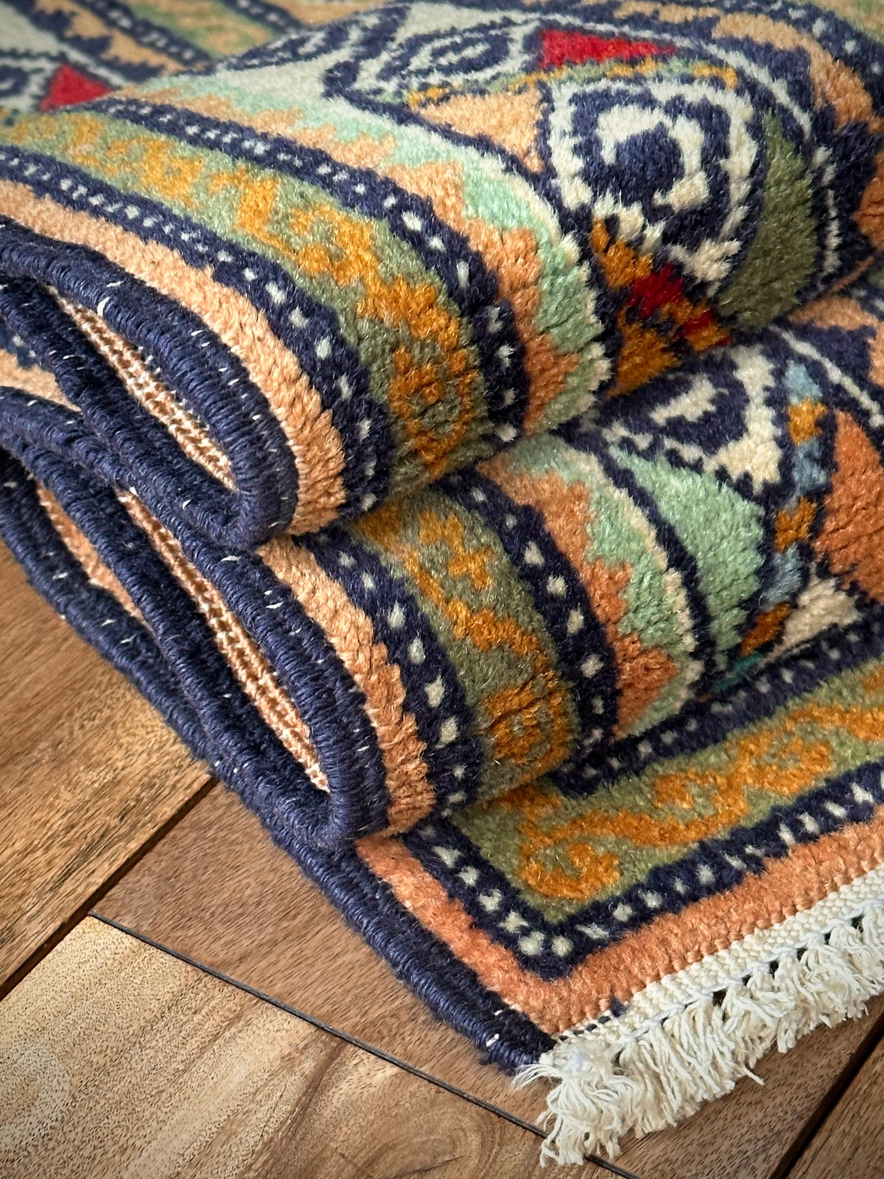 隣国トルコからアゼルバイジャン地方に通じる伝統的な絵柄にパキッとした輪郭がアルダビールらしい1枚で、色合い的にも合わせやすく広めの玄関や2人掛けソファ前に最適なミディアムサイズになります。