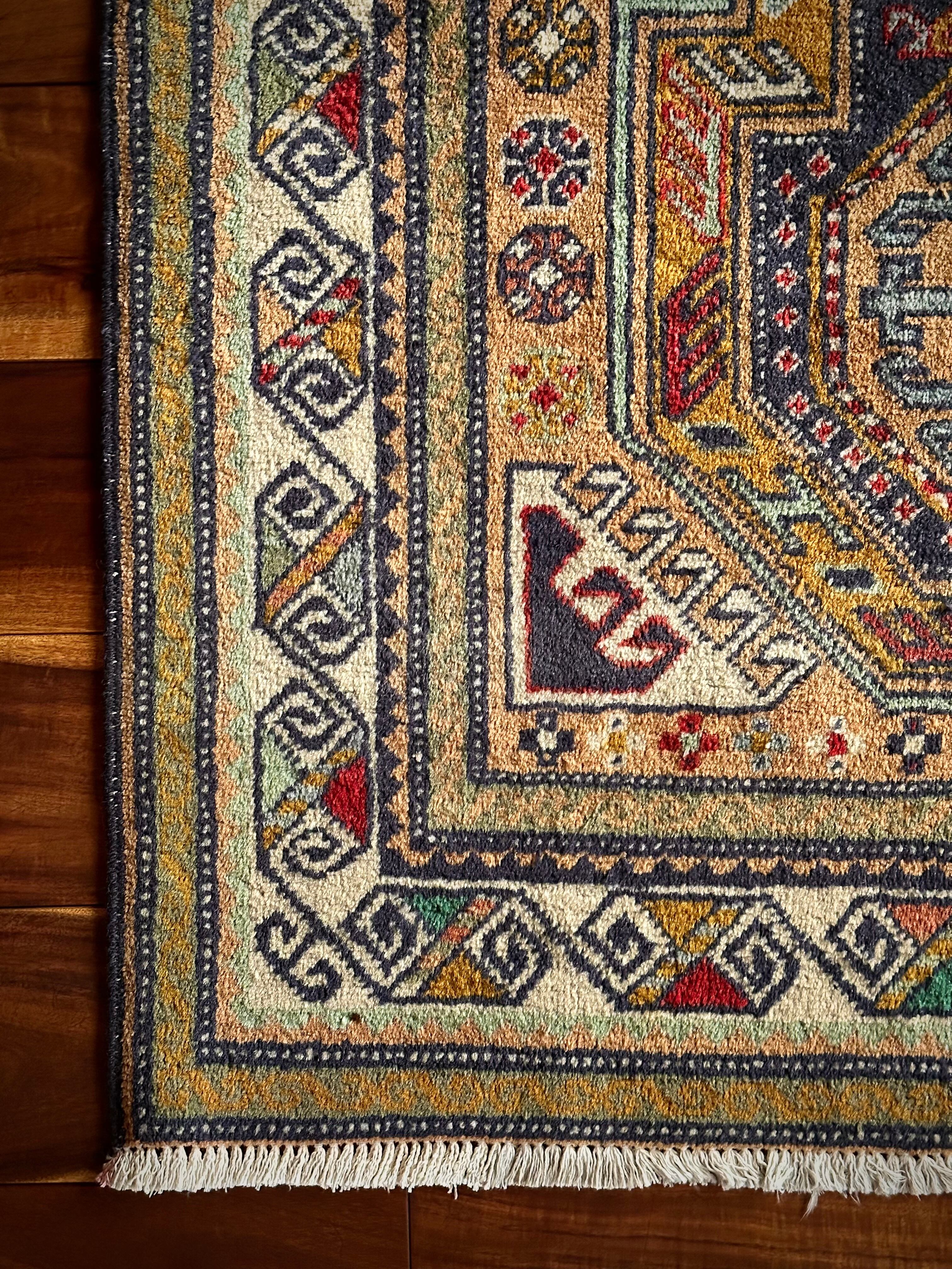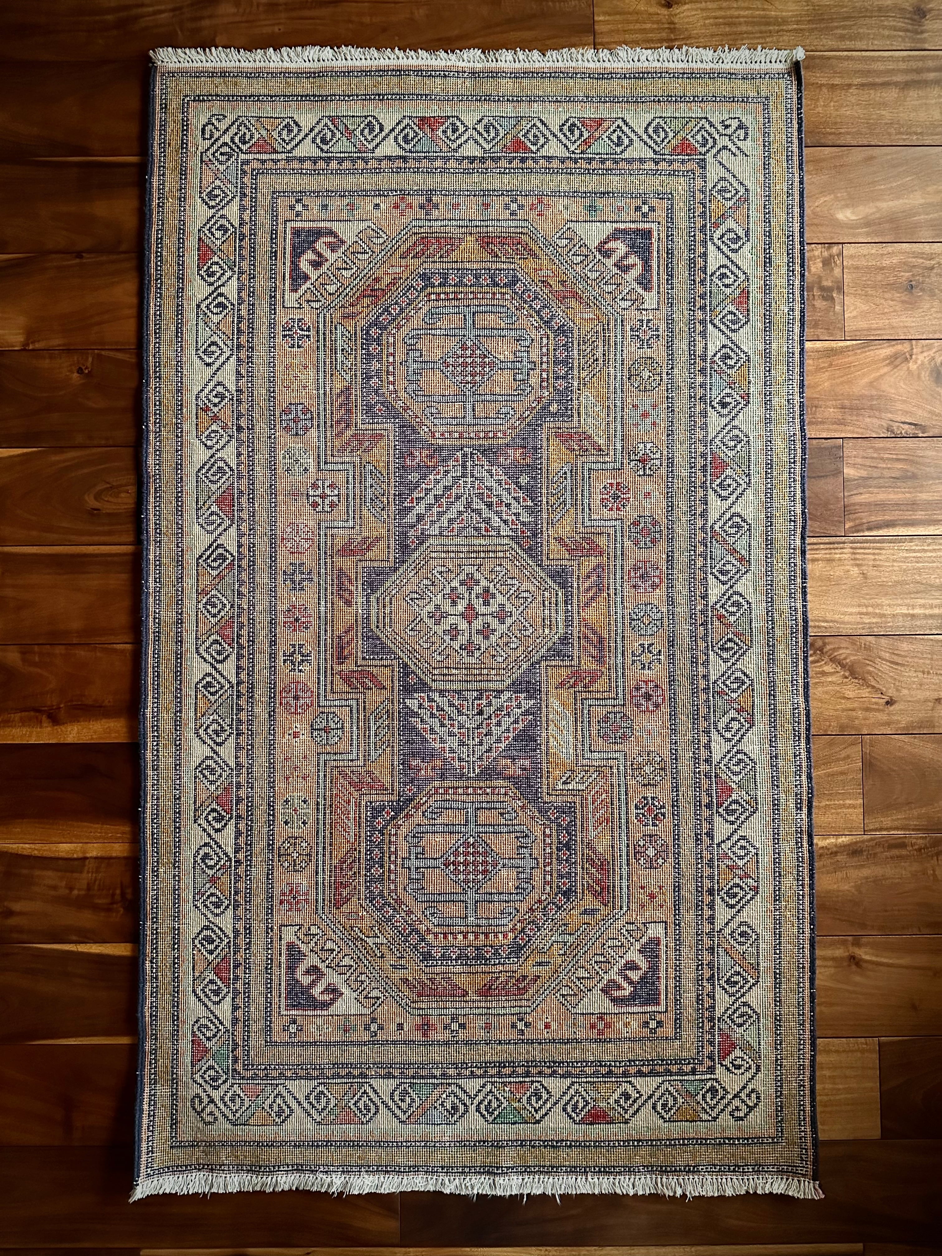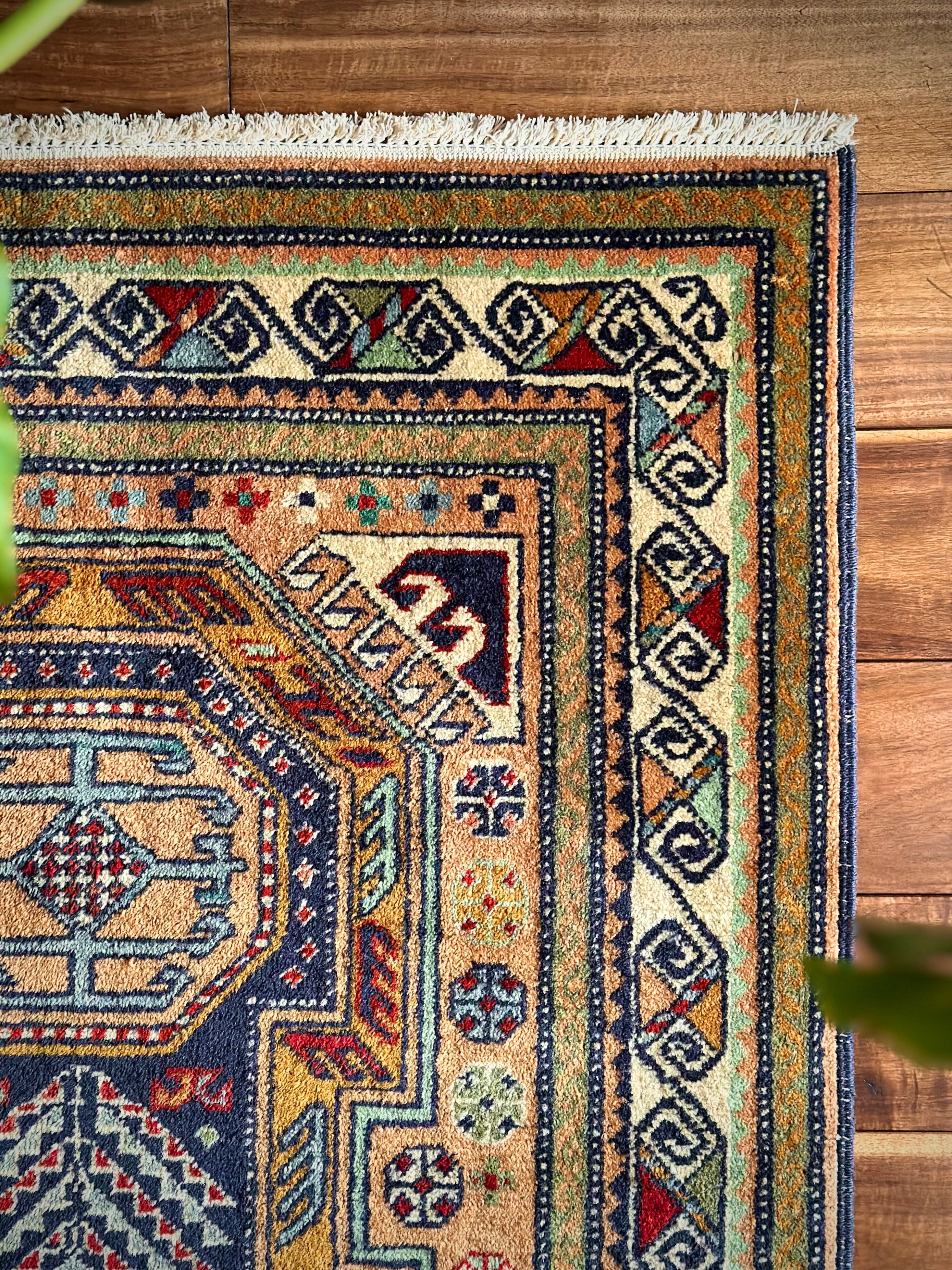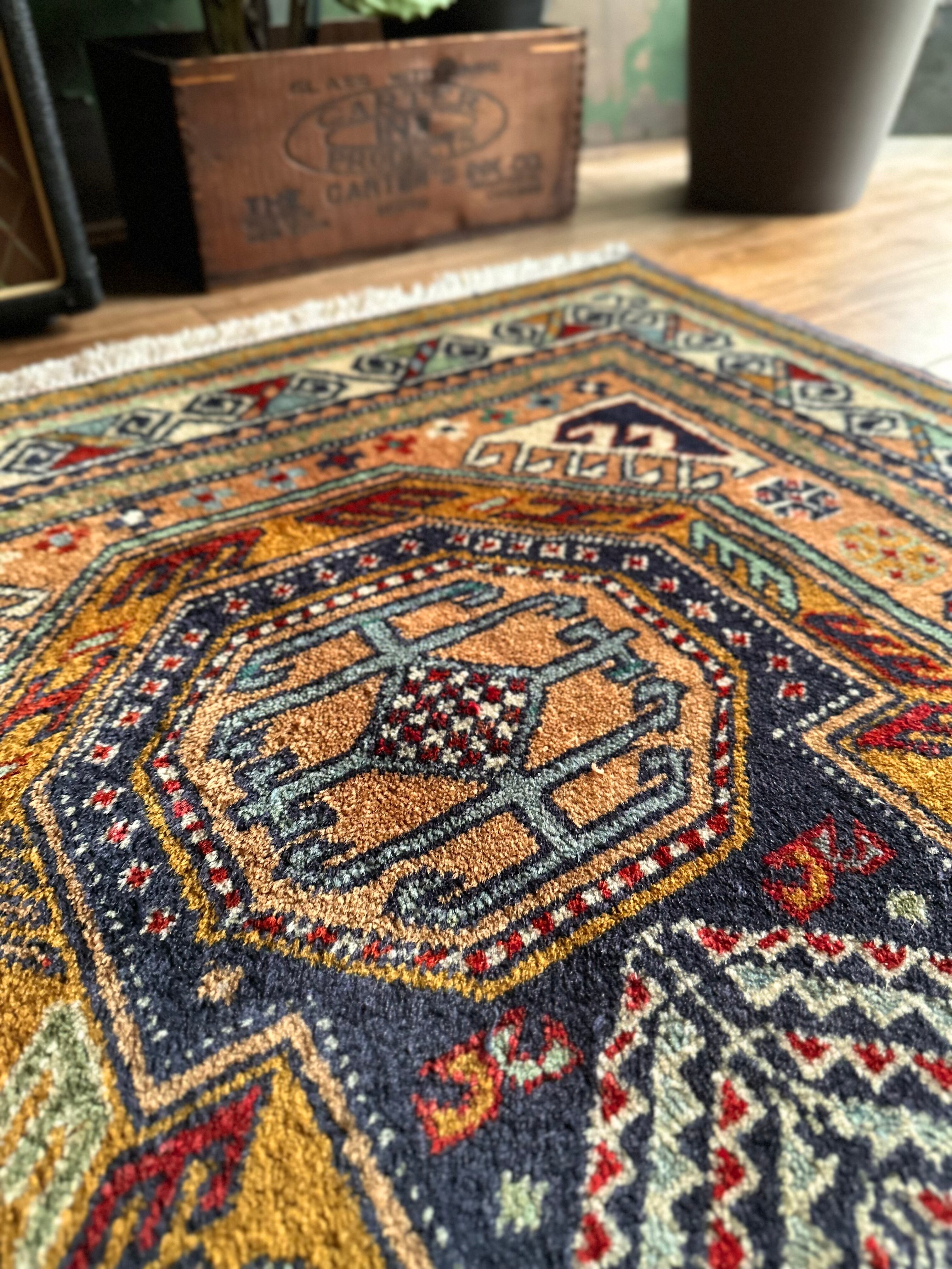 隣国トルコからアゼルバイジャン地方に通じる伝統的な絵柄にパキッとした輪郭がアルダビールらしい1枚で、色合い的にも合わせやすく広めの玄関や2人掛けソファ前に最適なミディアムサイズになります。