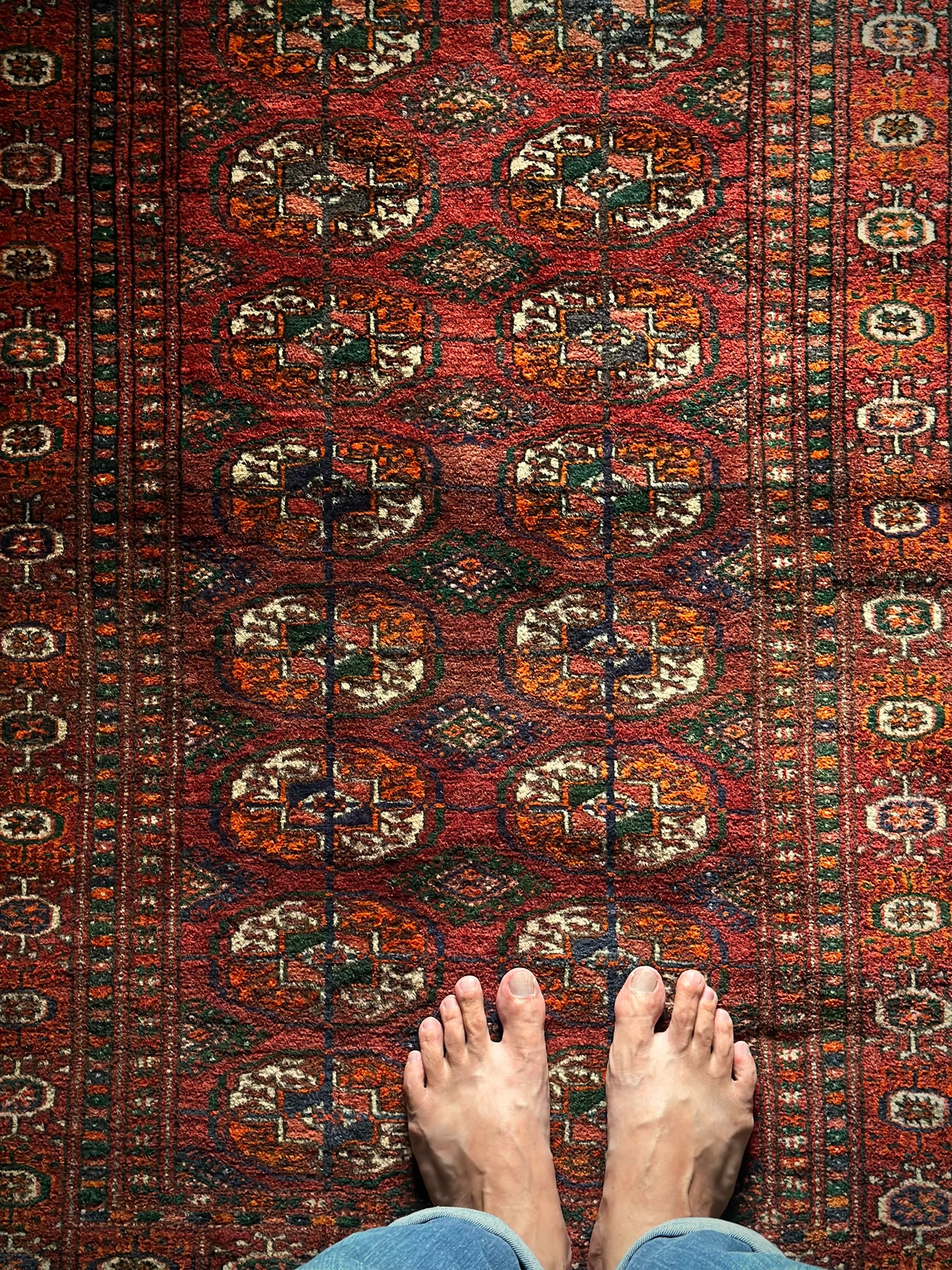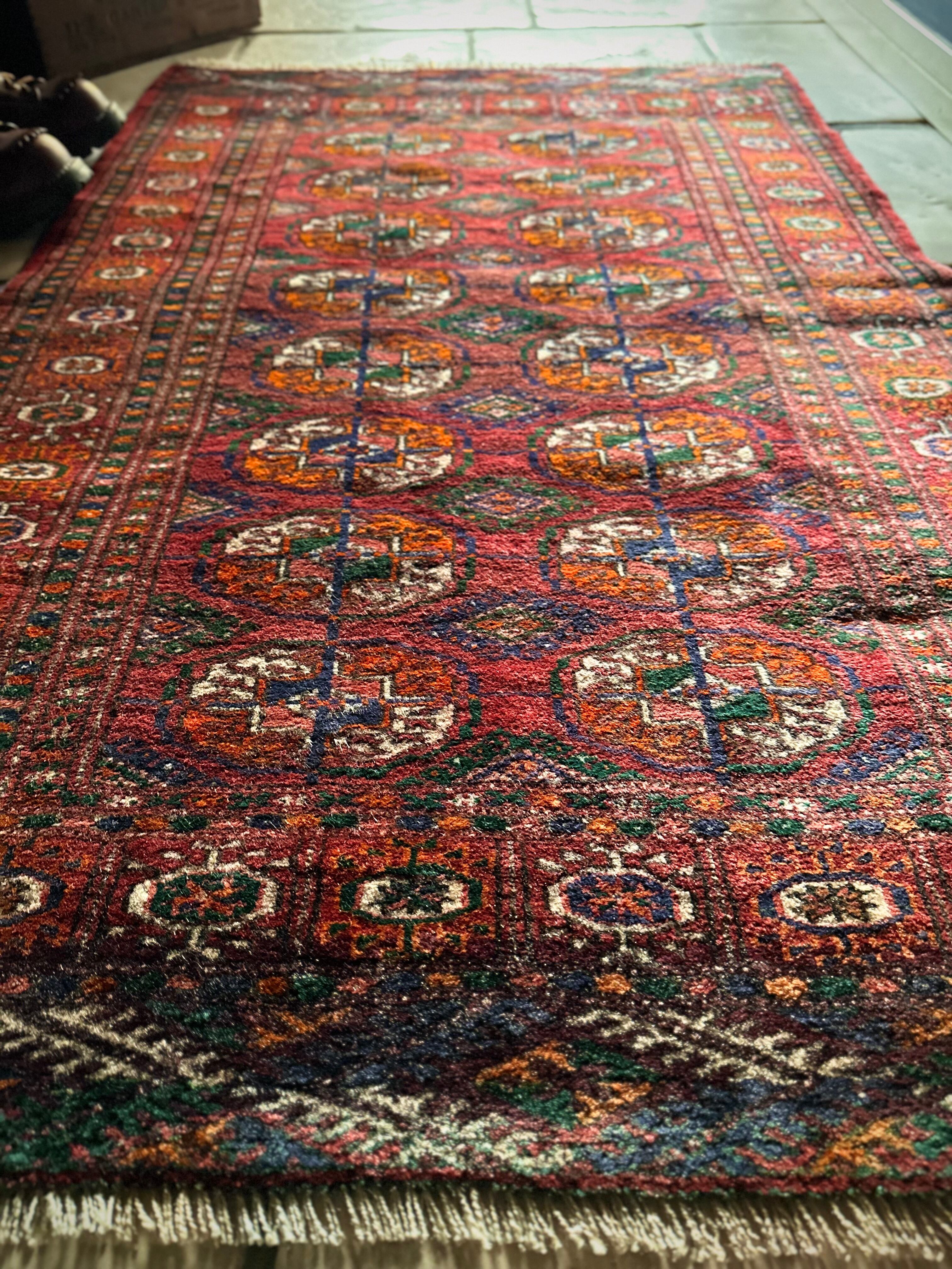 現在のトルクメン人の多くはその国名が示す通りにトルクメニスタンが主な居住区となりますが、その長い歴史とソビエト連邦下での東アジアから中央アジアに広く分布していて、こちらは最大勢力でもあるテッケ族が多く住むウズベキスタンで織られたトライバルラグになります。