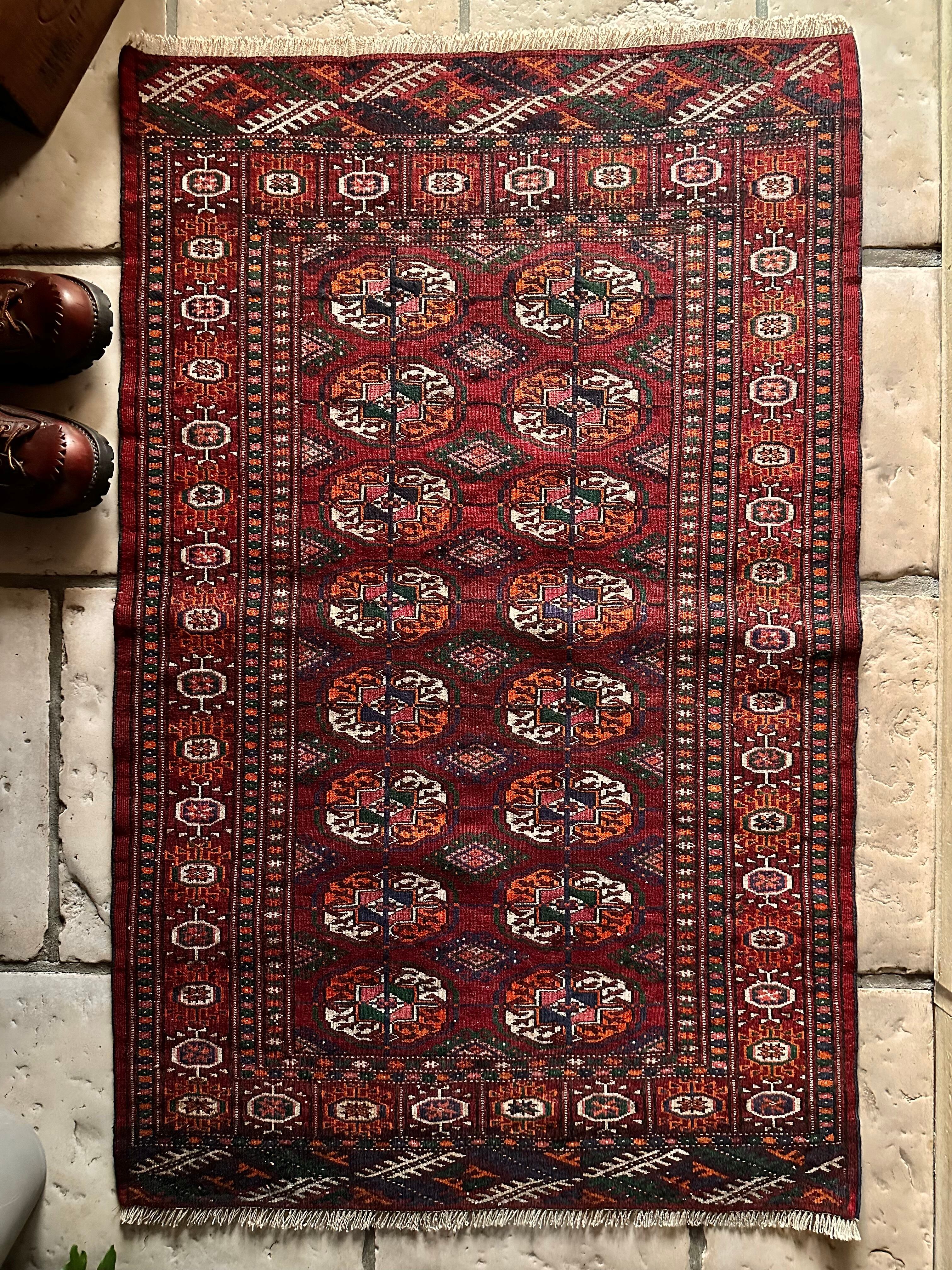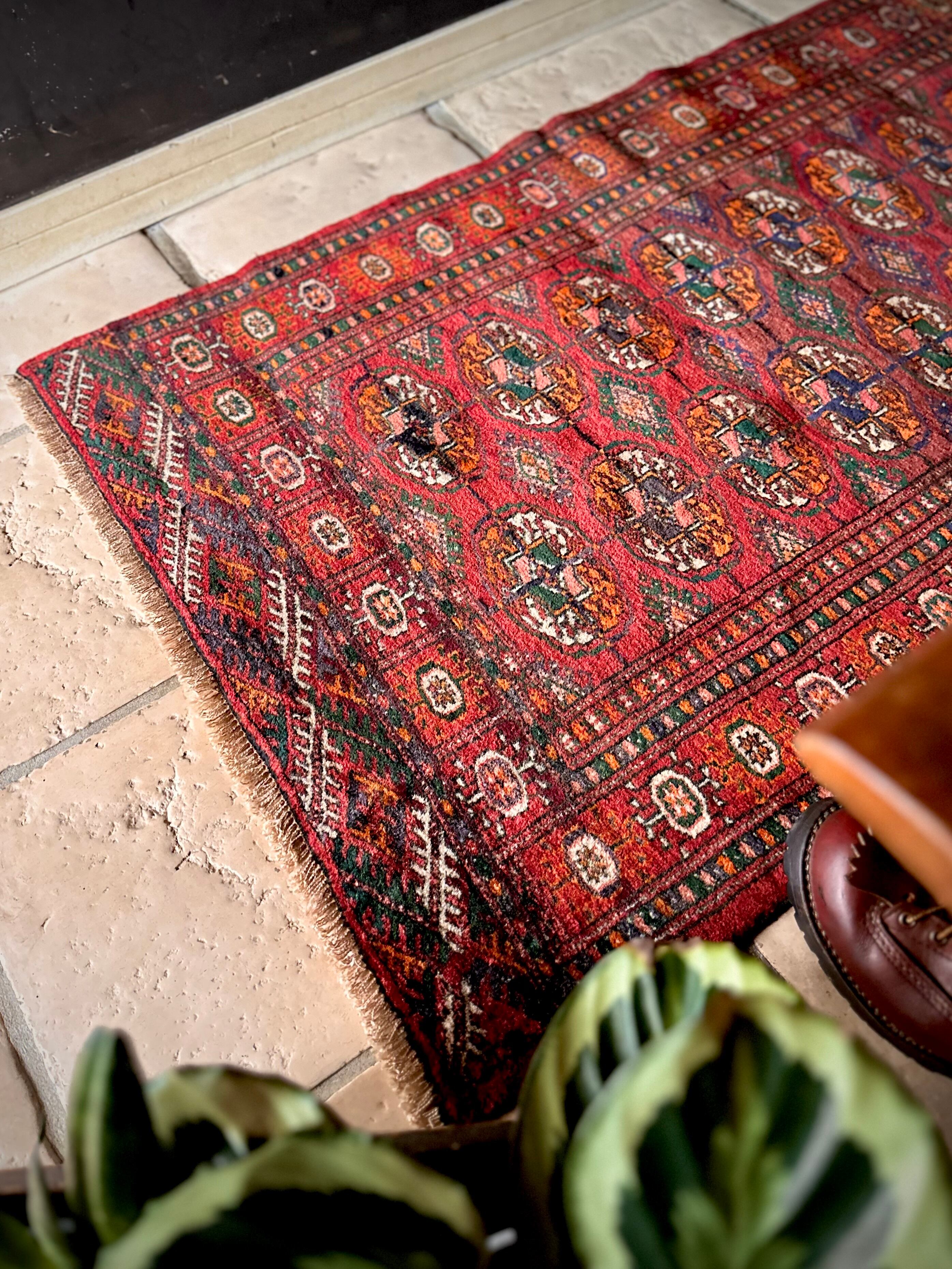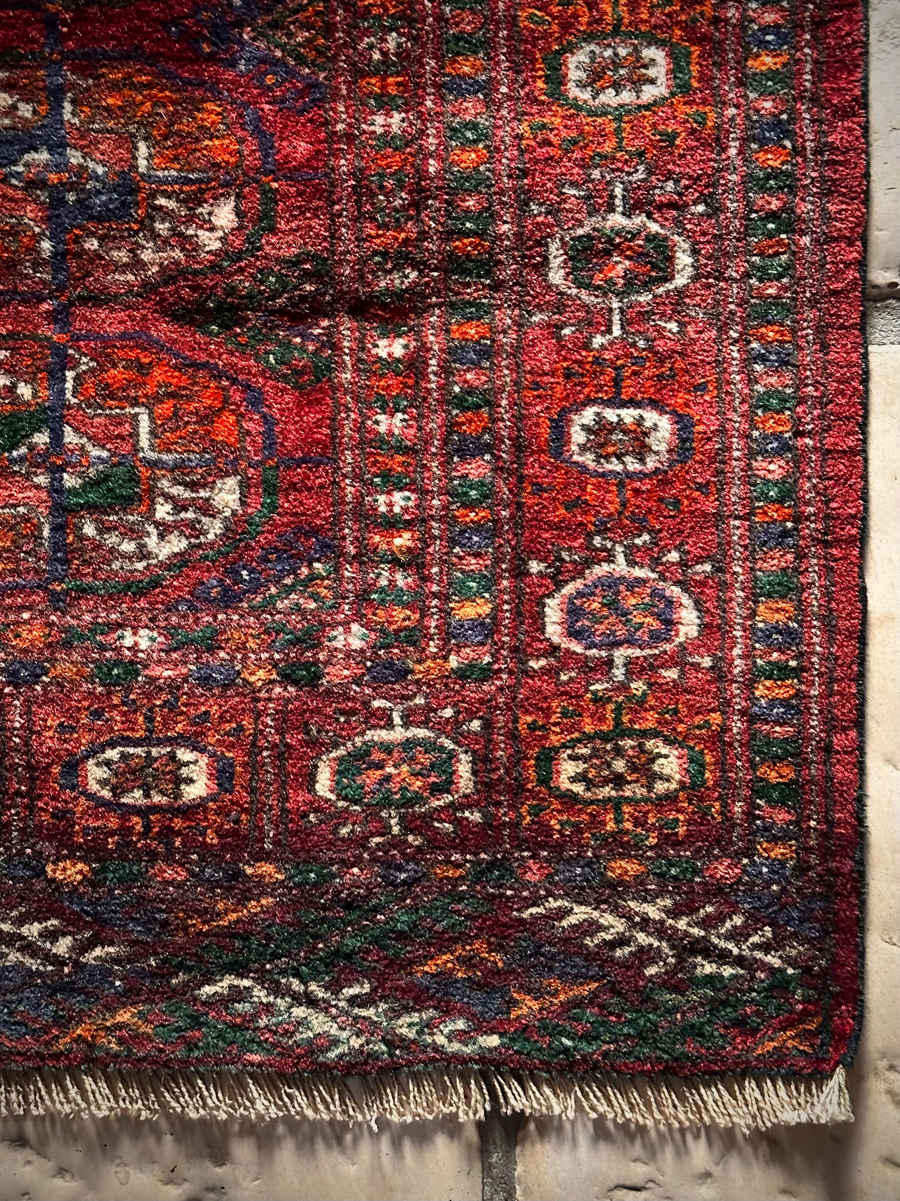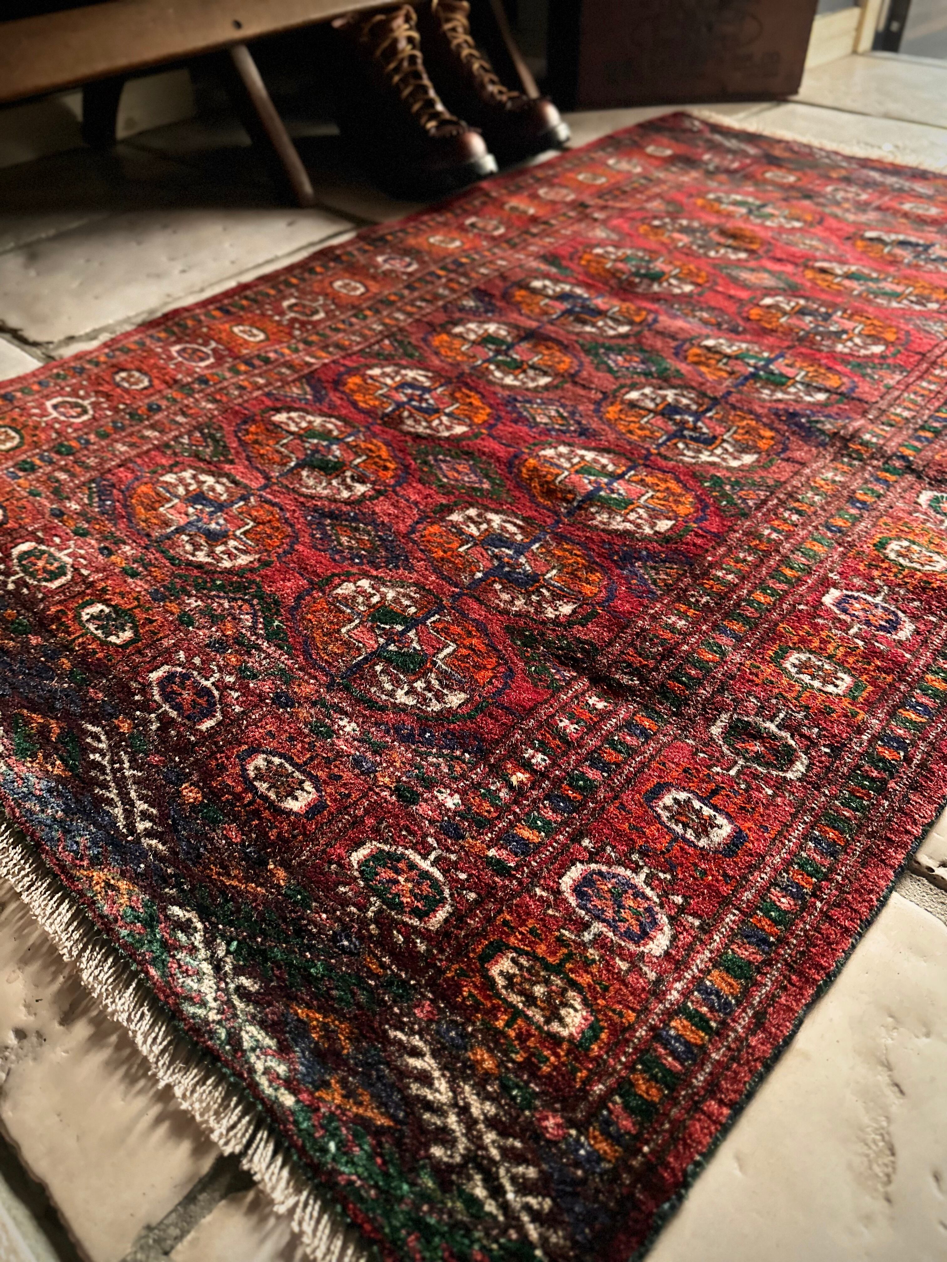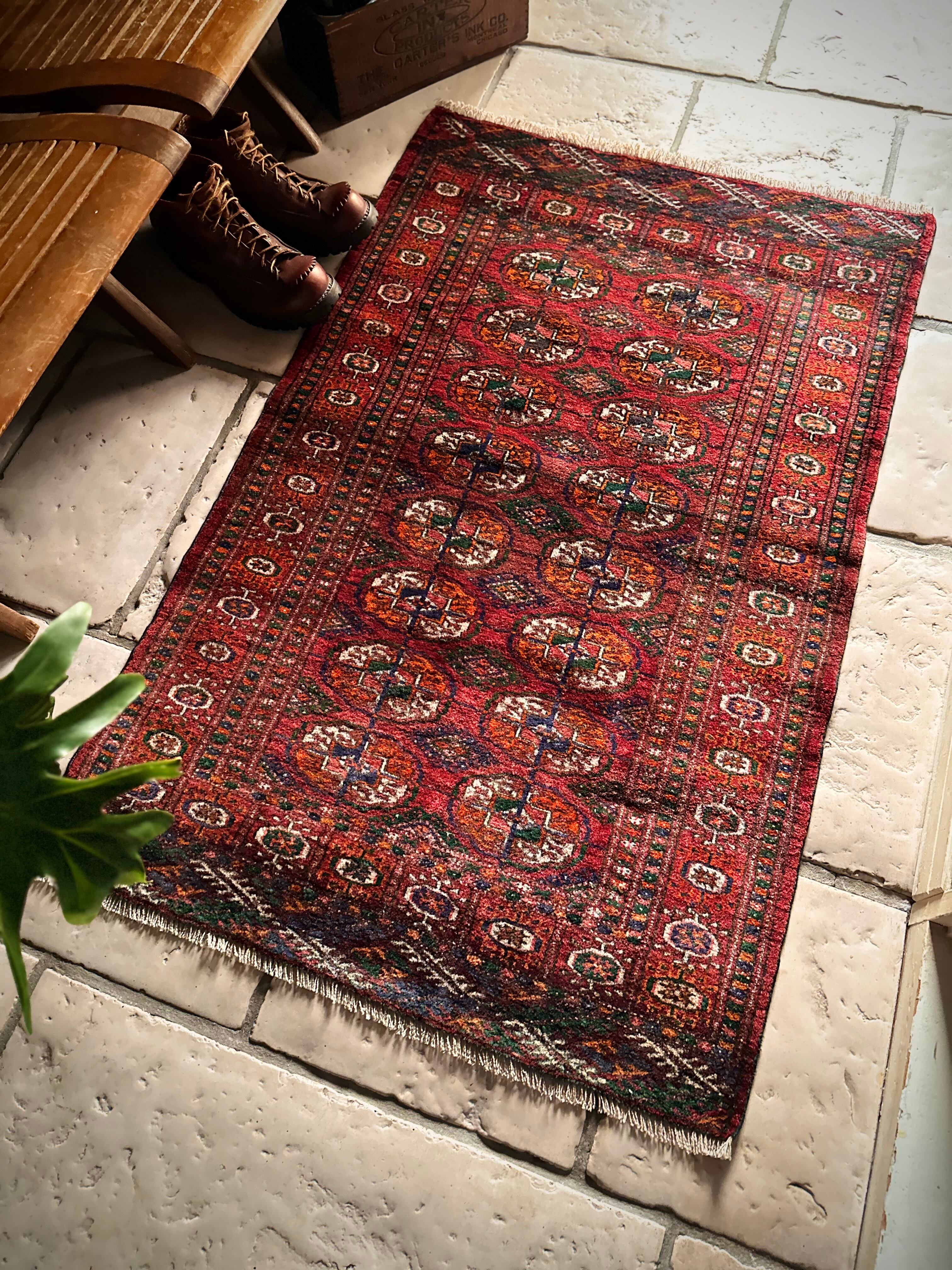 イランやアフガニスタンに住むトルクメンのラグとは趣が違うこちらは、由緒あるテッケ族の家紋が記されたブハラ柄と呼ばれる1枚で、薄手ながらも編み目の細かさが際立つ非常に柔らかな質感となり、短めのパイルながらもしっとりとした肌触りのラグになります。