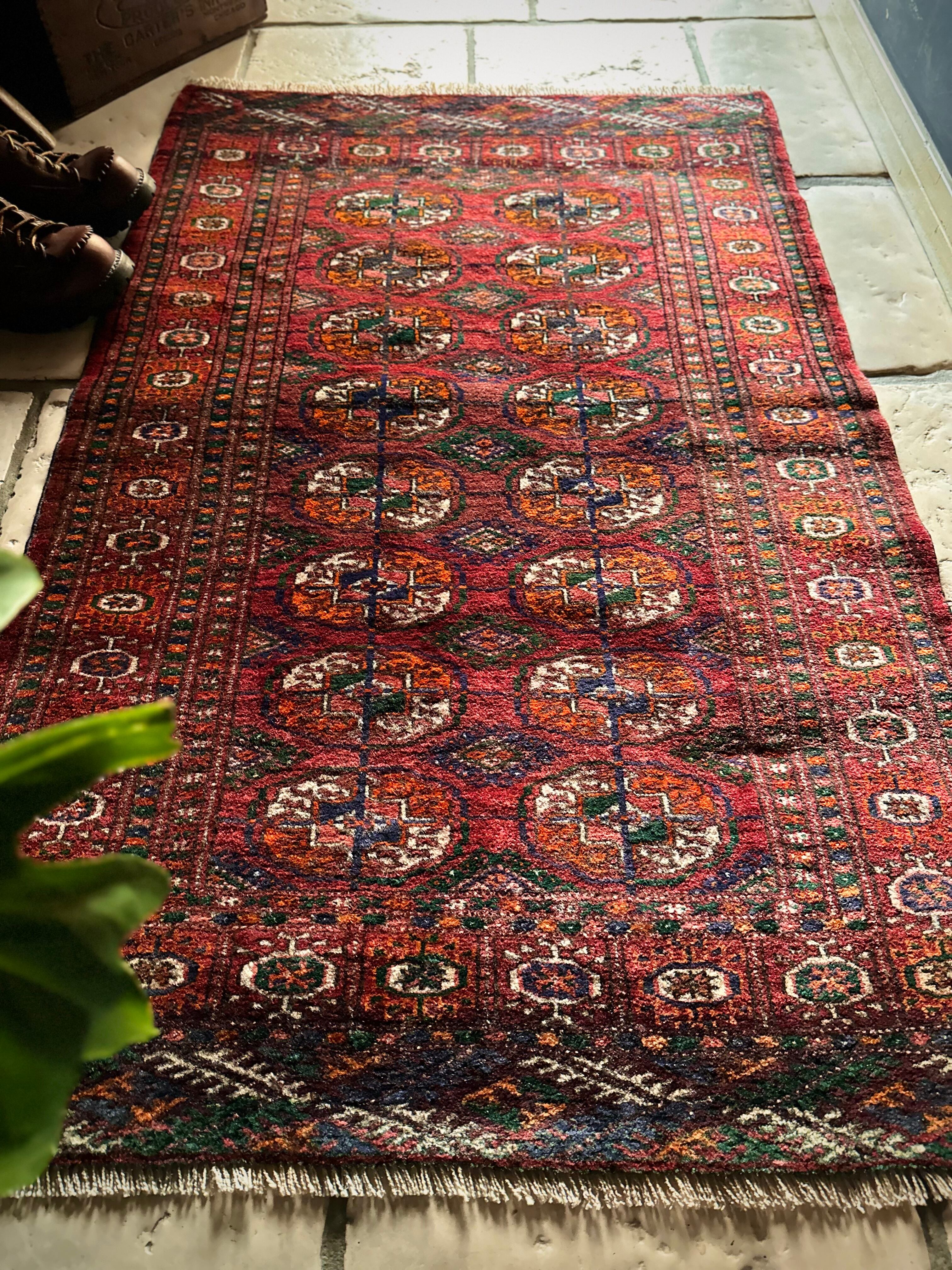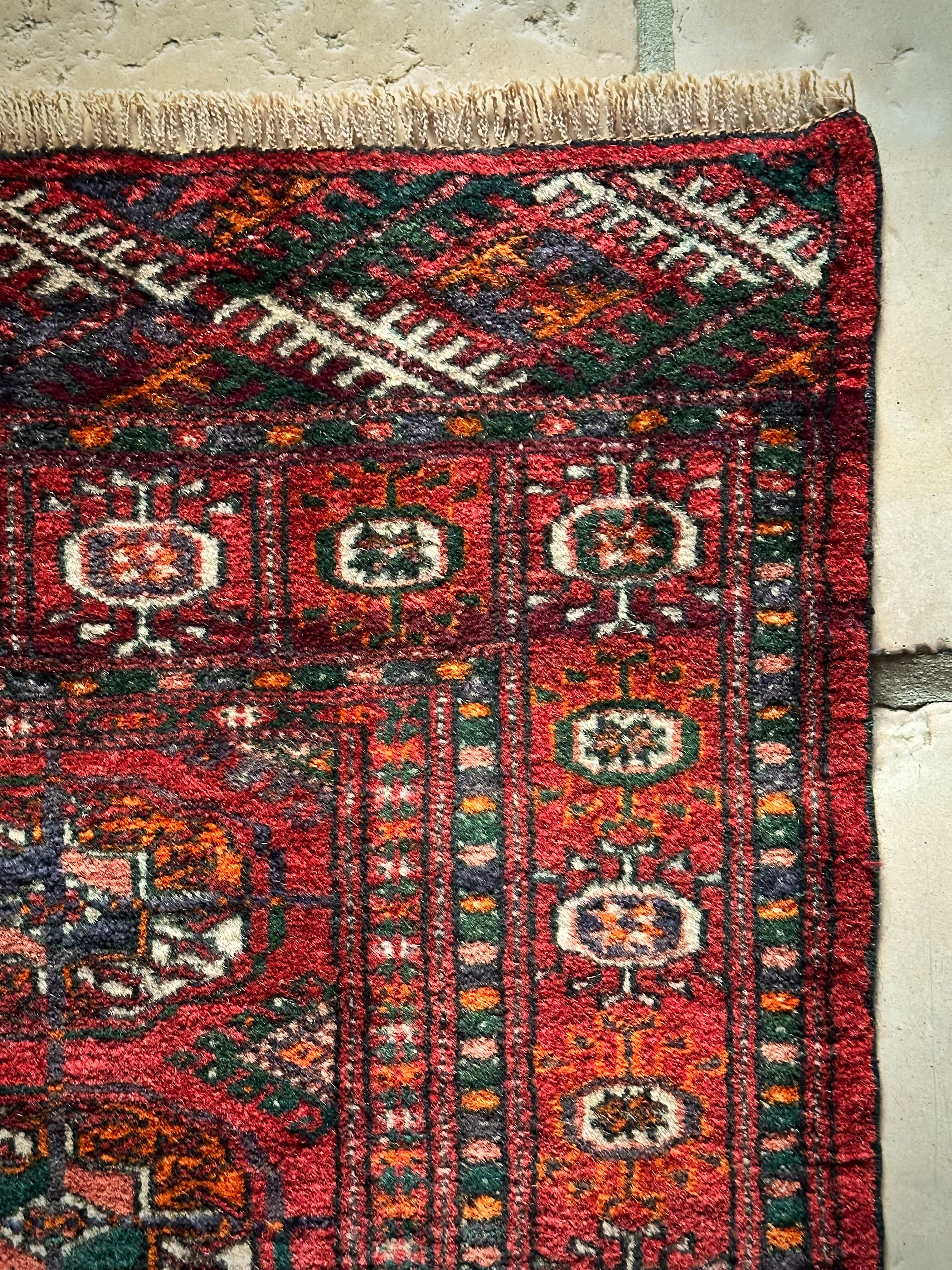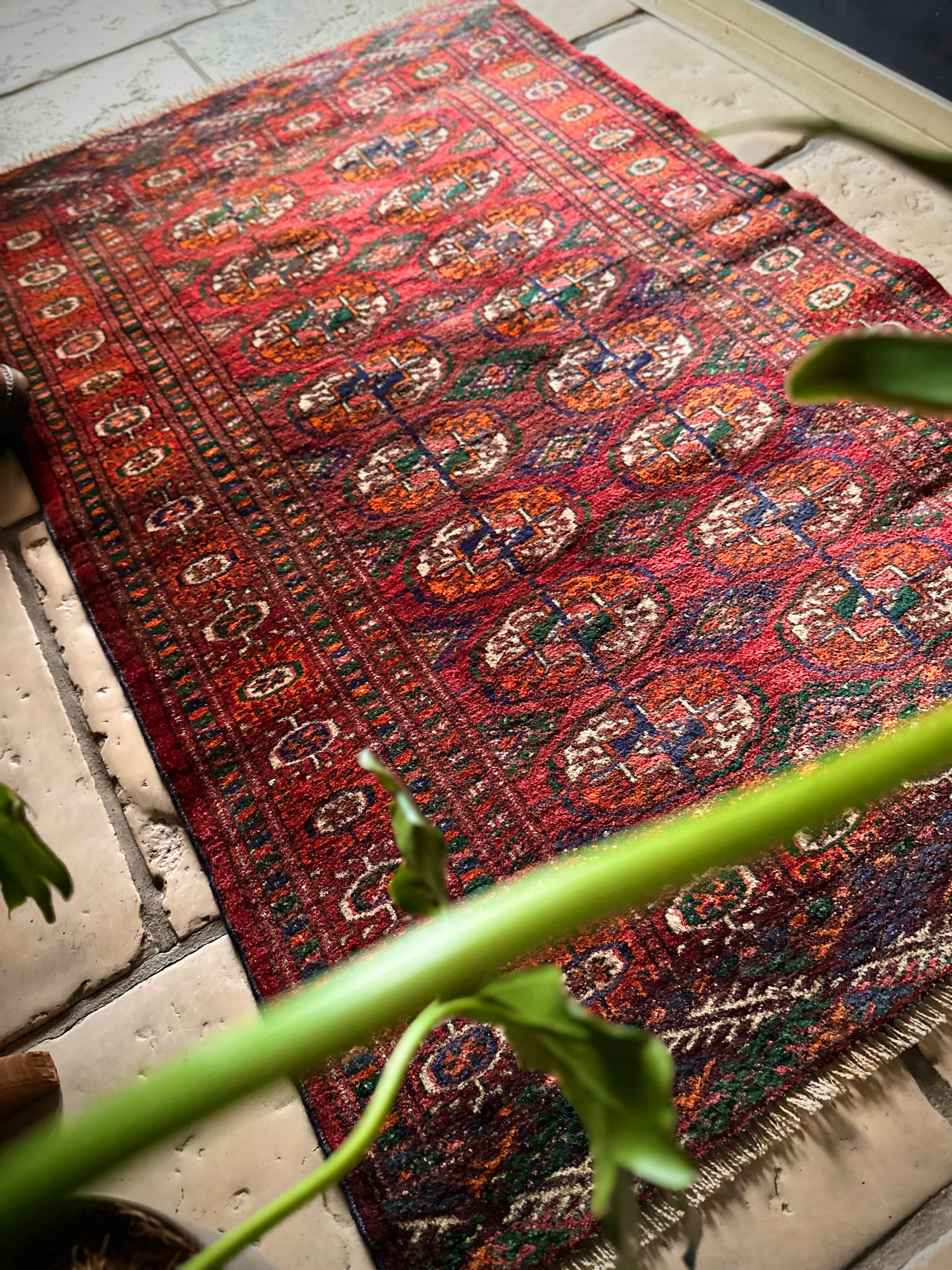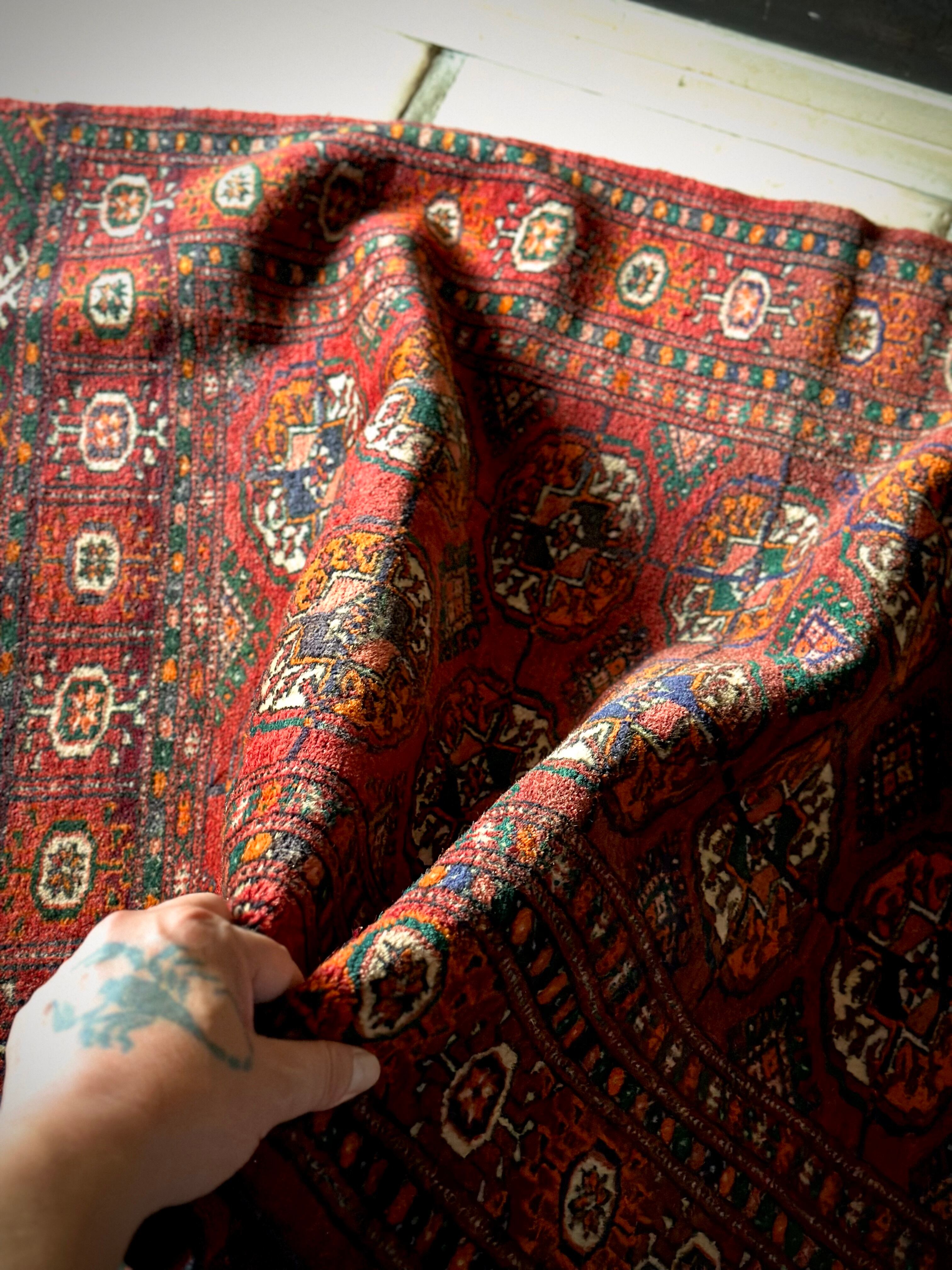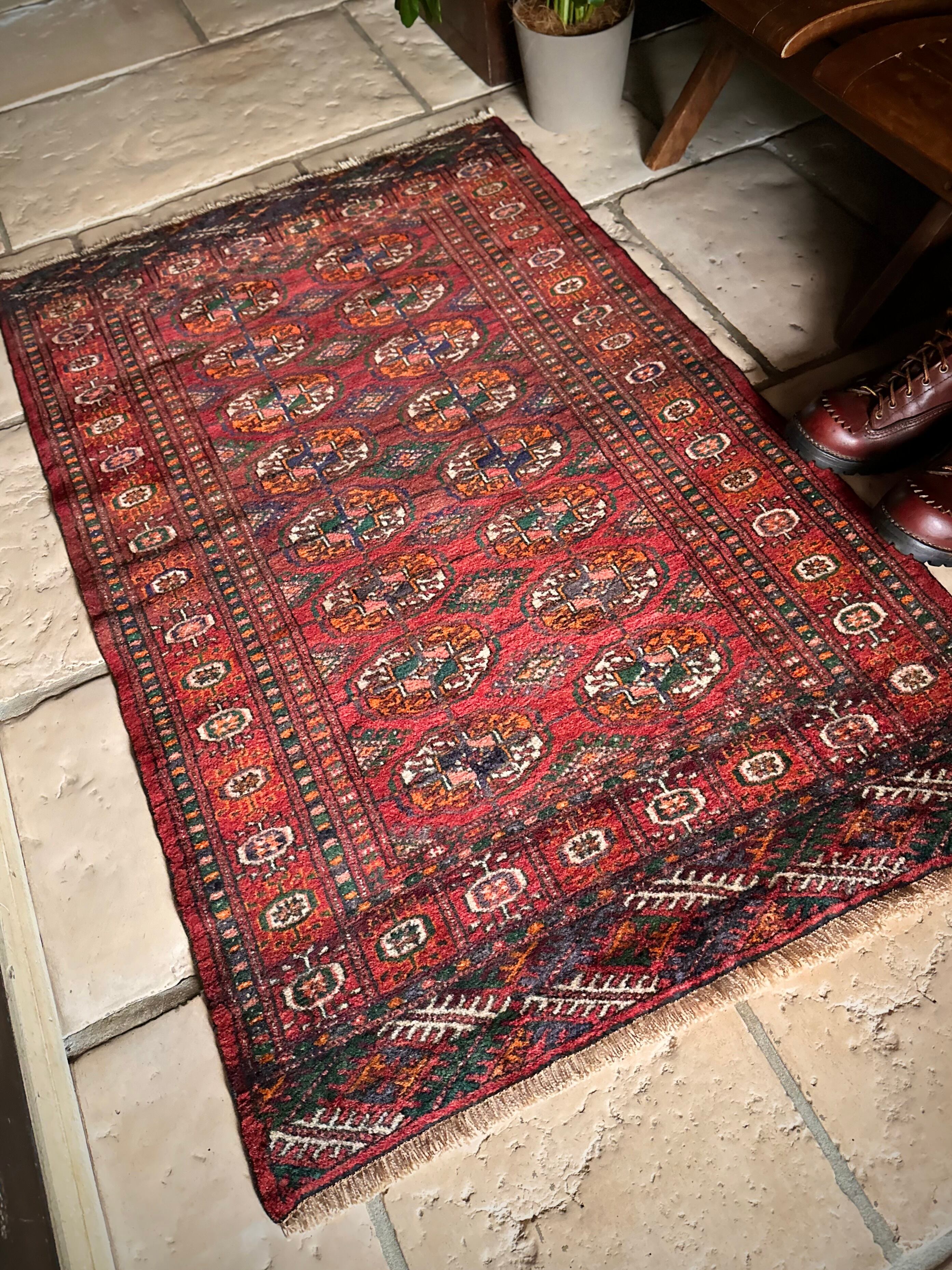 イランやアフガニスタンに住むトルクメンのラグとは趣が違うこちらは、由緒あるテッケ族の家紋が記されたブハラ柄と呼ばれる1枚で、薄手ながらも編み目の細かさが際立つ非常に柔らかな質感となり、短めのパイルながらもしっとりとした肌触りのラグになります。