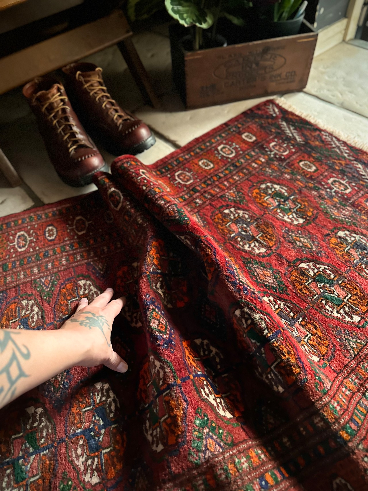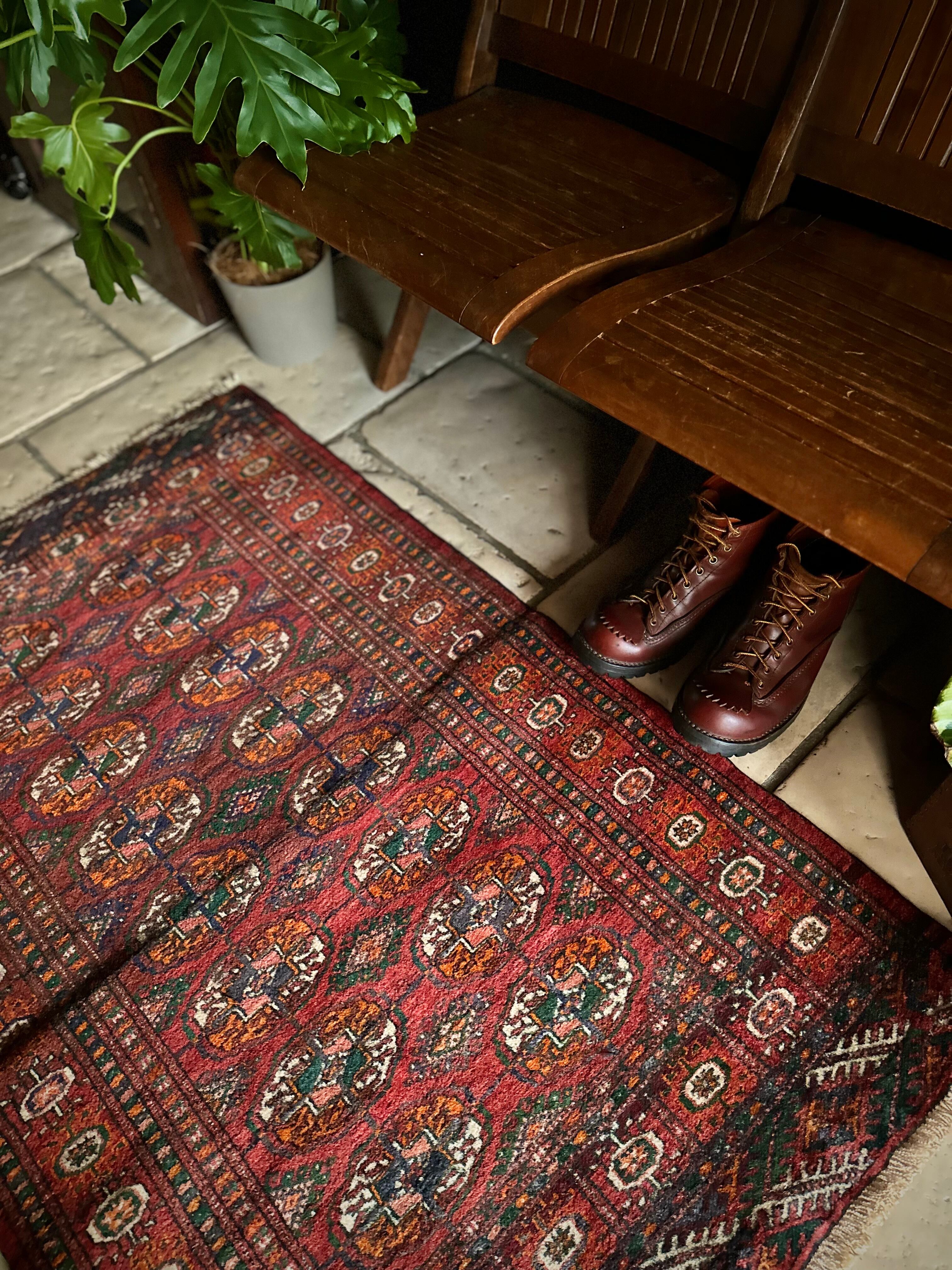 最後にラグそのものに関しては羊毛特有の匂いがあり、採寸は中央付近で計測していますが、手織りならではの歪みによる誤差や水洗いクリーニングによる縮み、また草木染めによる経年劣化の色ムラなどがありますが、それもまたヴィンテージラグの魅力かとご理解ください。