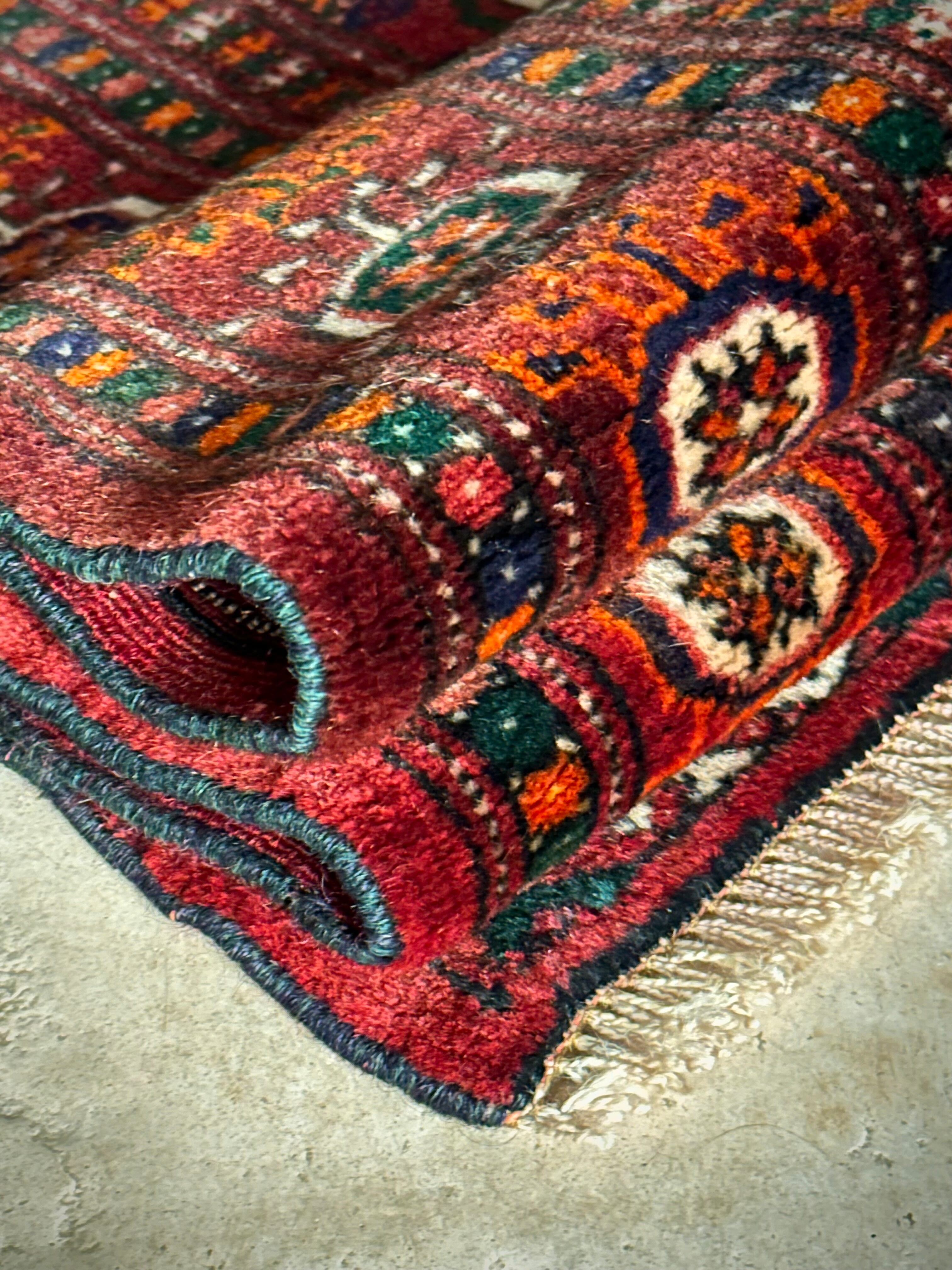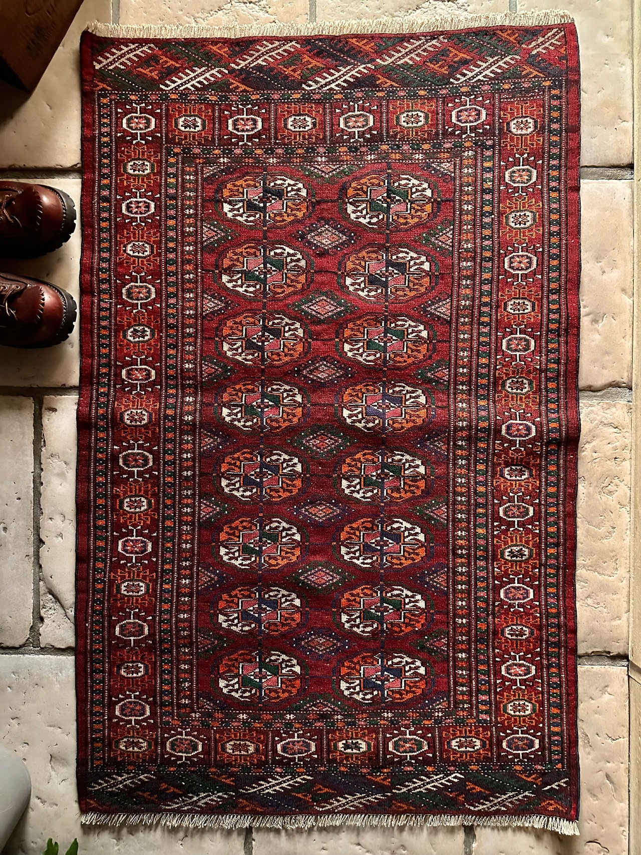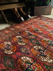 経年としては60年と見た目からしてヴィンテージラグらしい風格でしょうか。特に目立つようなダメージやリペア箇所は見当たらないグッドなコンディションで、他とは違う深みのある色合いがかっこいい本物のトルクメンラグと言えるでしょうか。