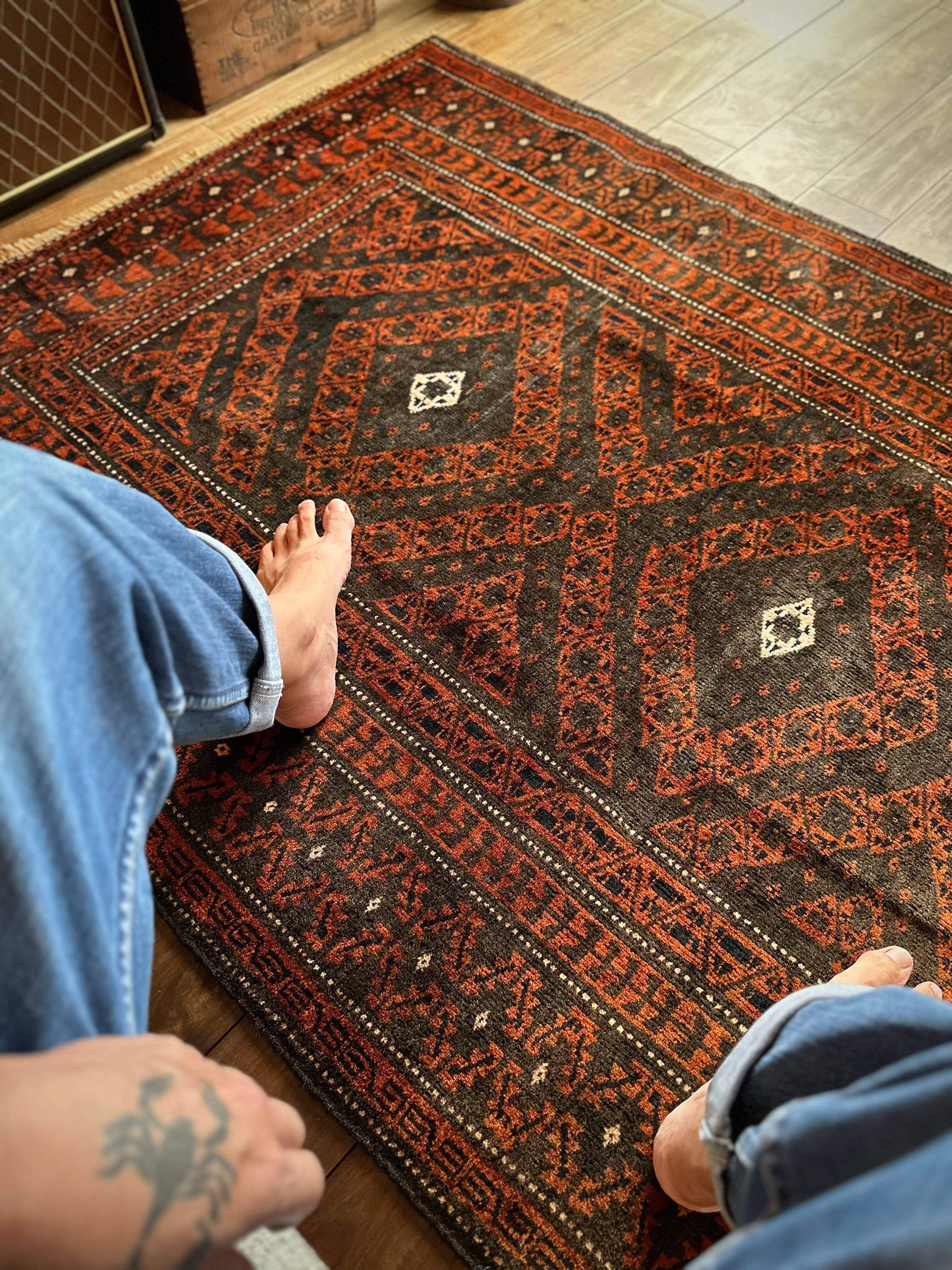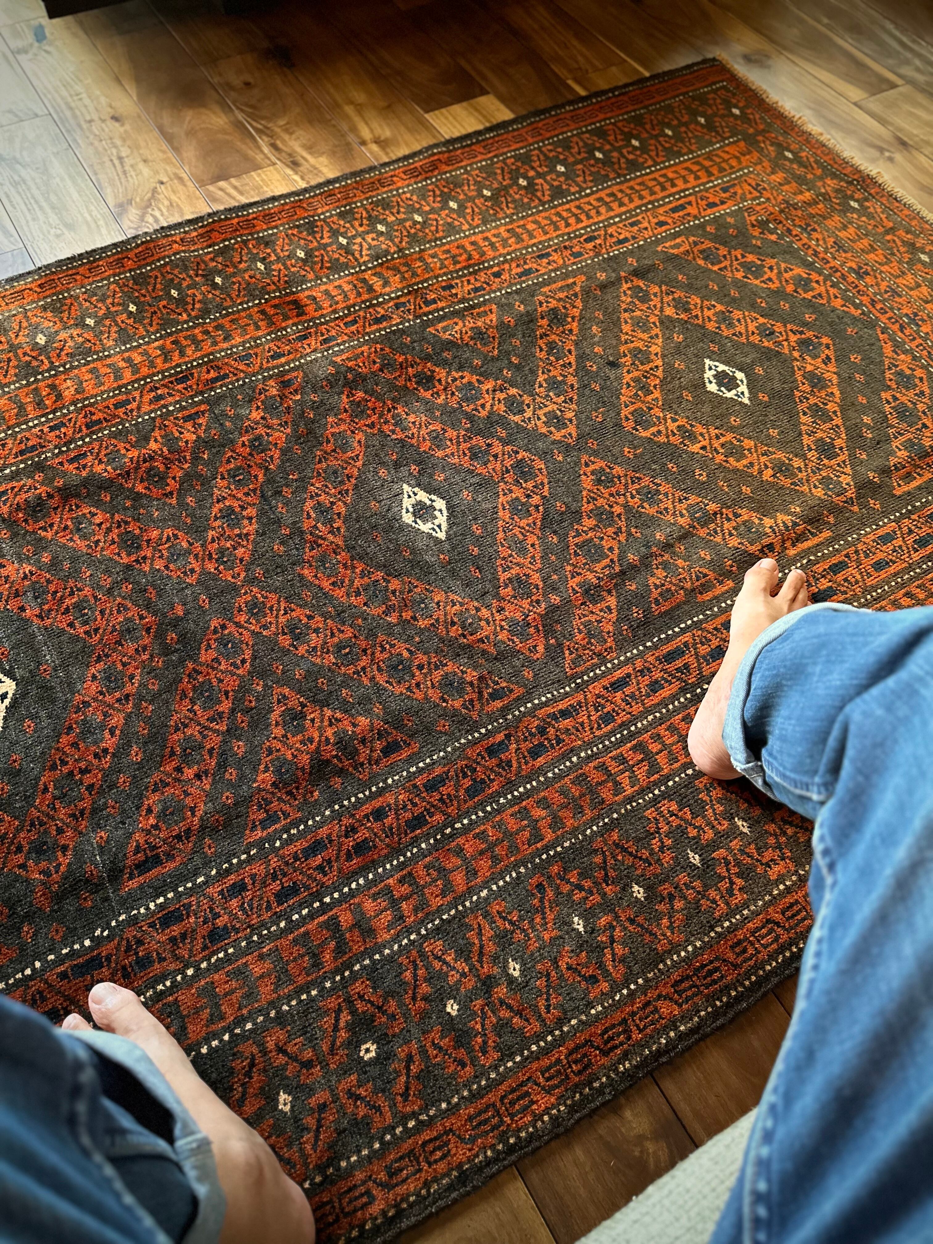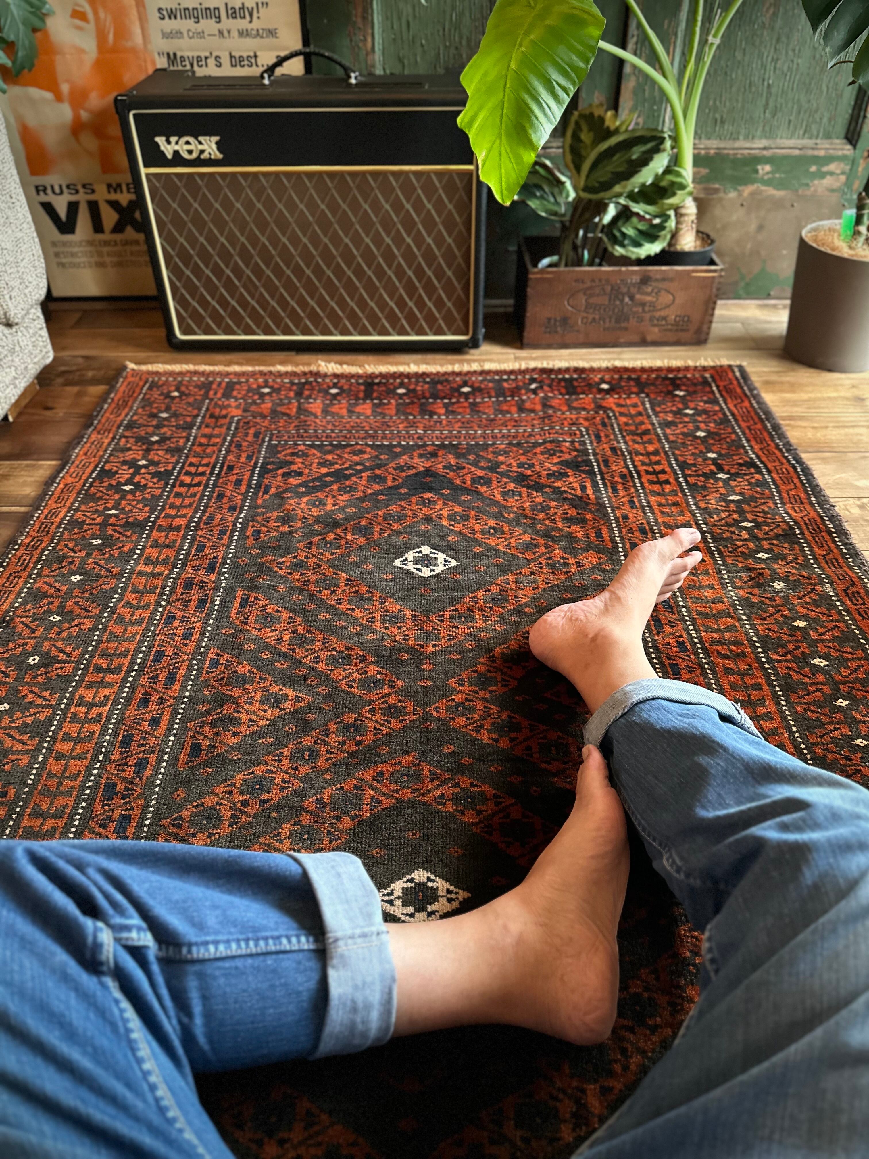 最後にラグそのものに関しては羊毛特有の匂いがあり、採寸は中央付近で計測していますが、手織りならではの歪みによる誤差や水洗いクリーニングによる縮み、また草木染めによる経年劣化の色ムラなどがありますが、それもまたヴィンテージラグの魅力かとご理解ください。