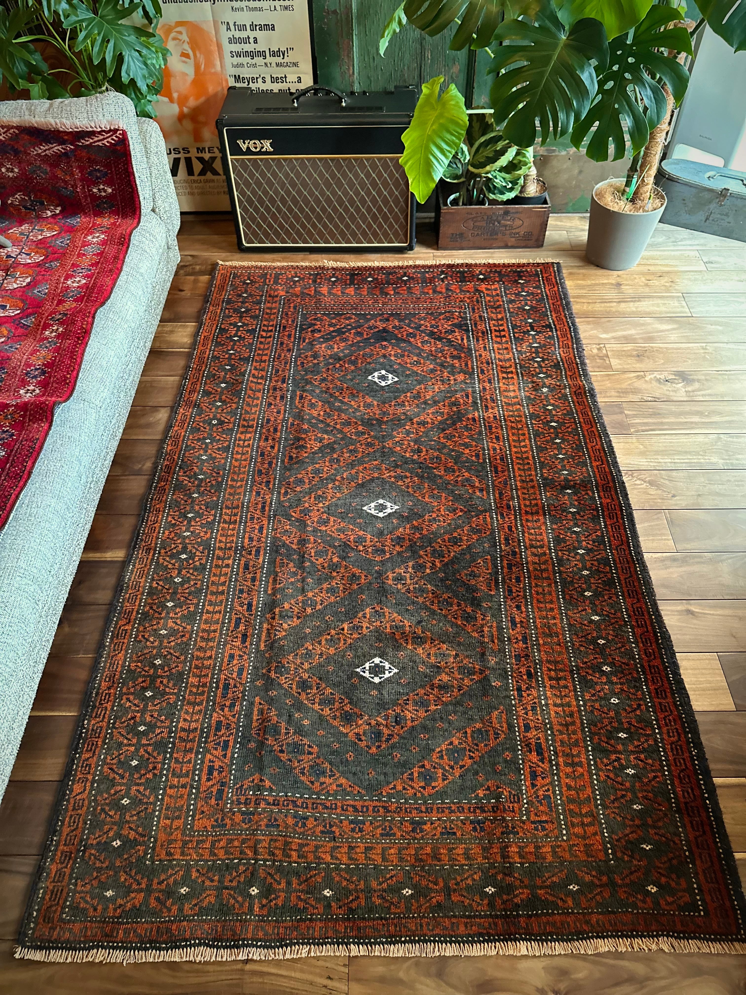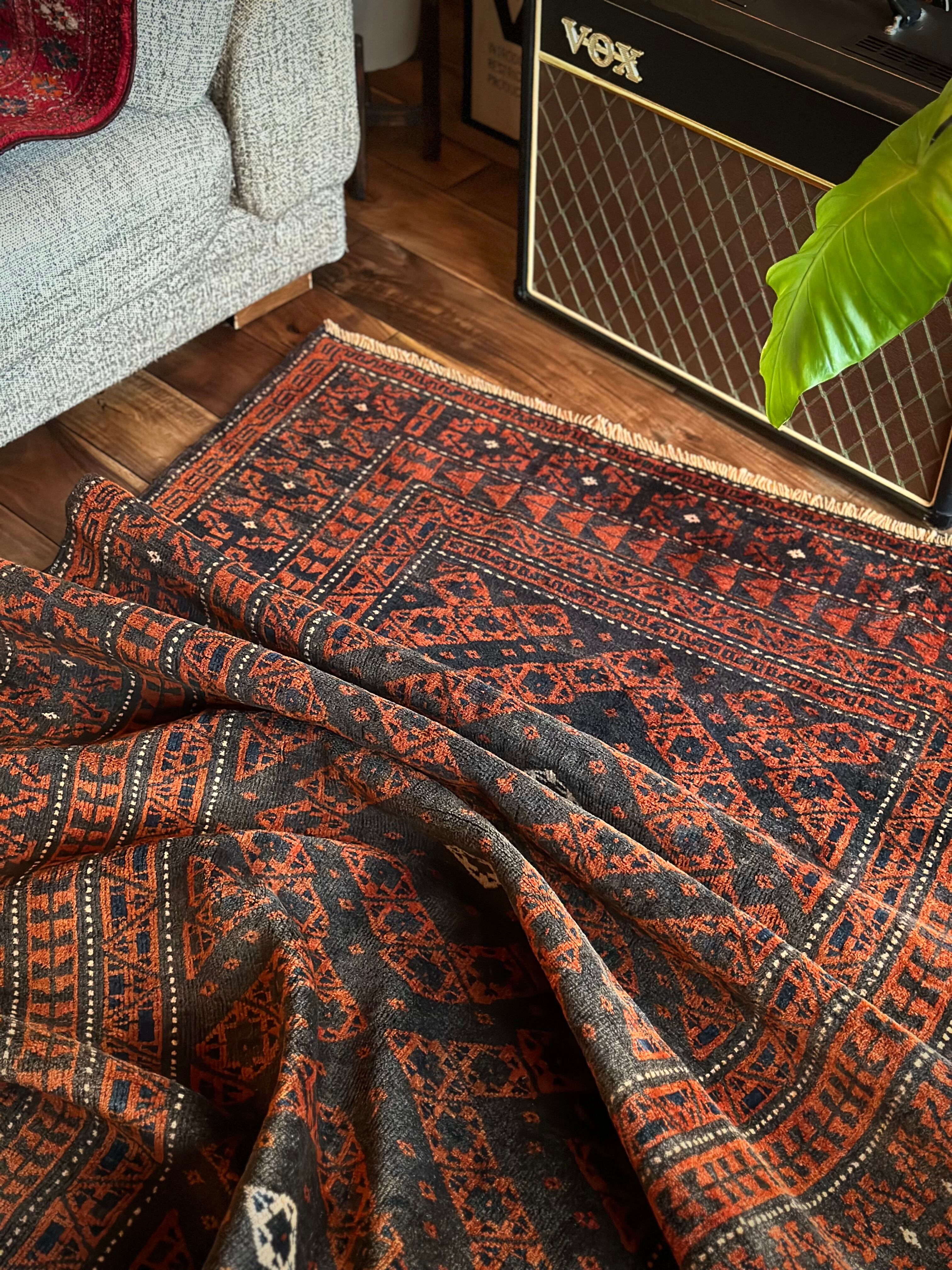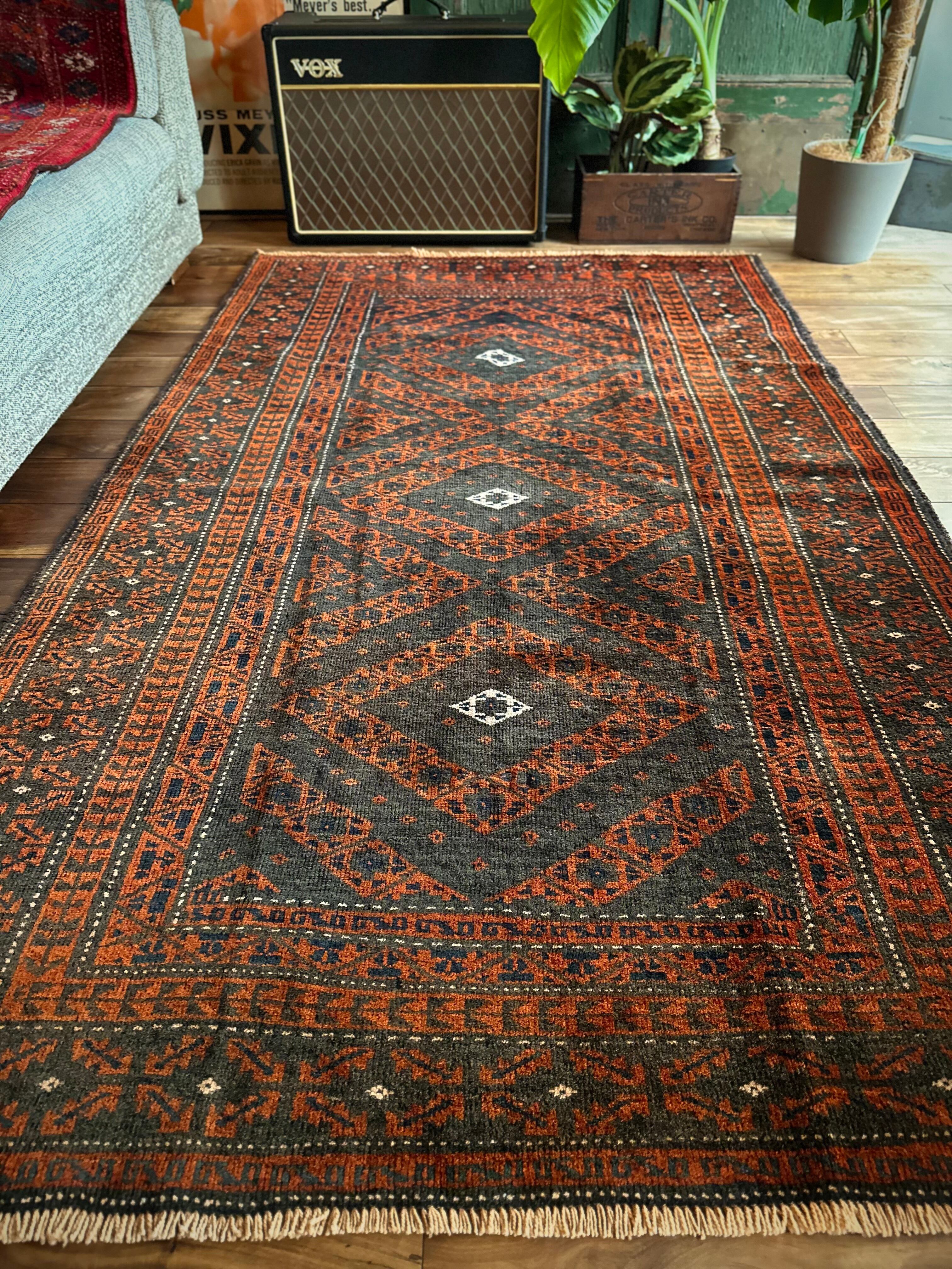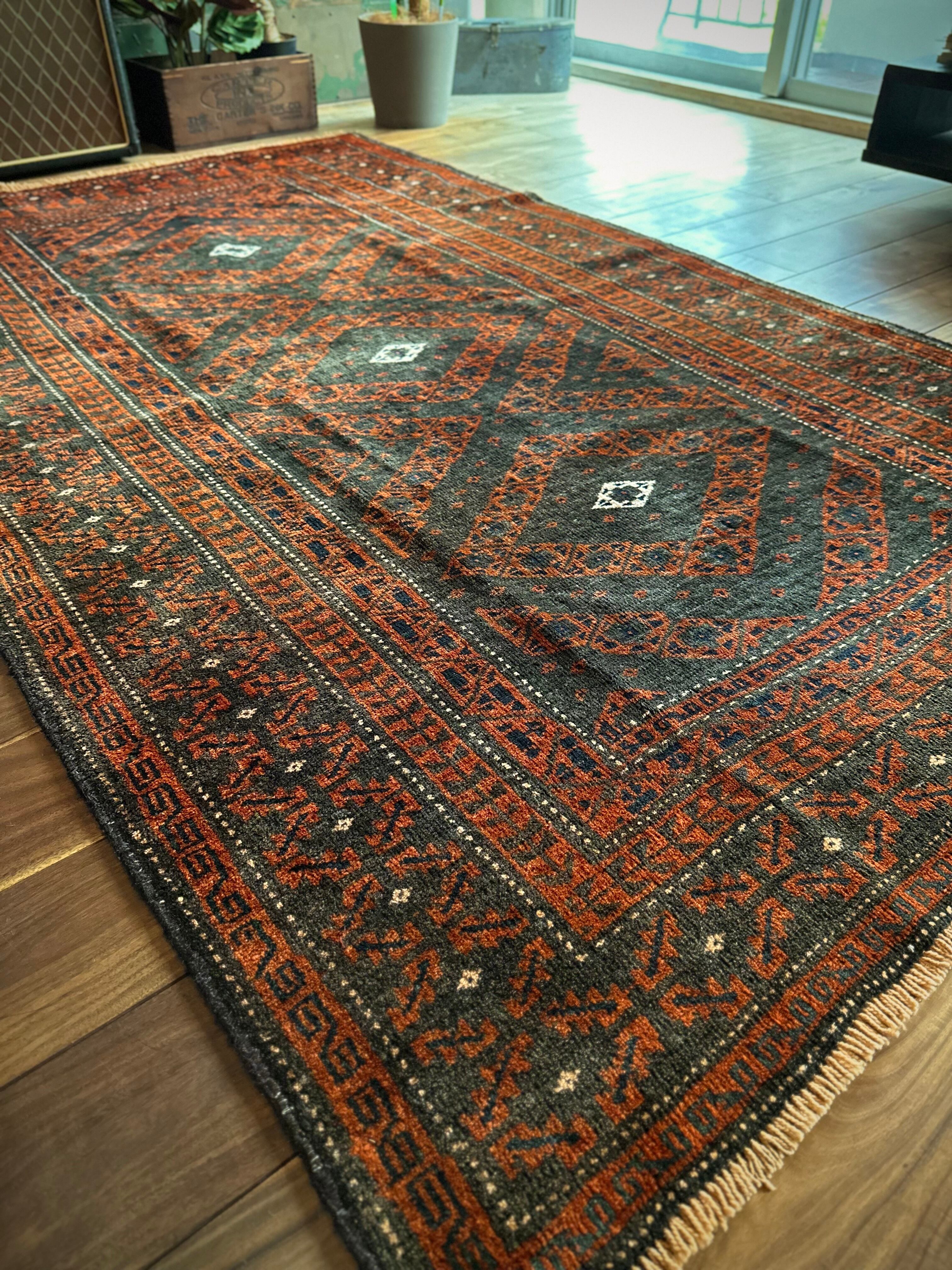 長年の経年劣化によって色褪せたテラコッタとブラックベースが渋い雰囲気を醸し出しているアンティークな1枚で、アフガニスタンはヘラート州に居住するバルーチ族のトライバルラグになります。