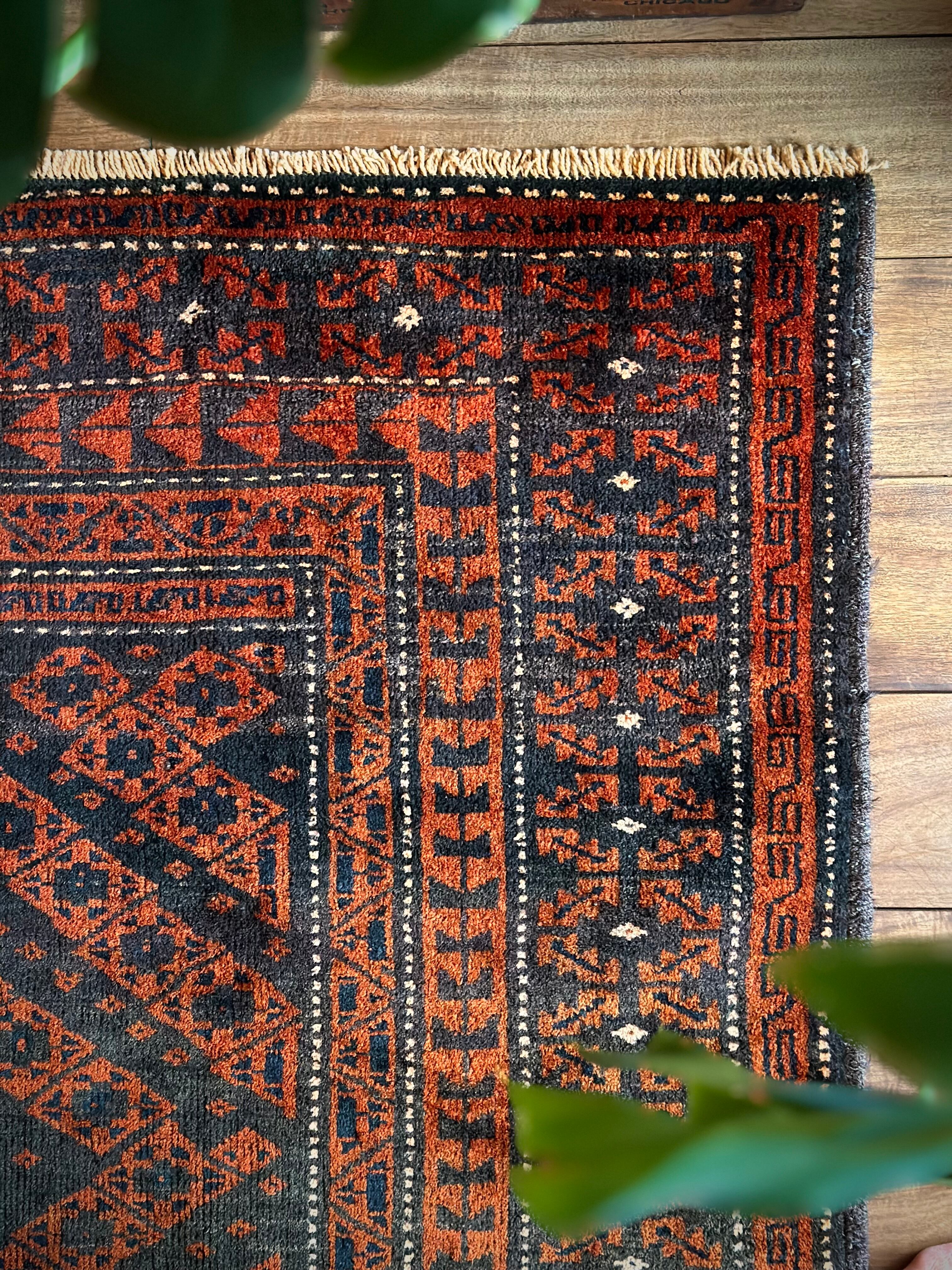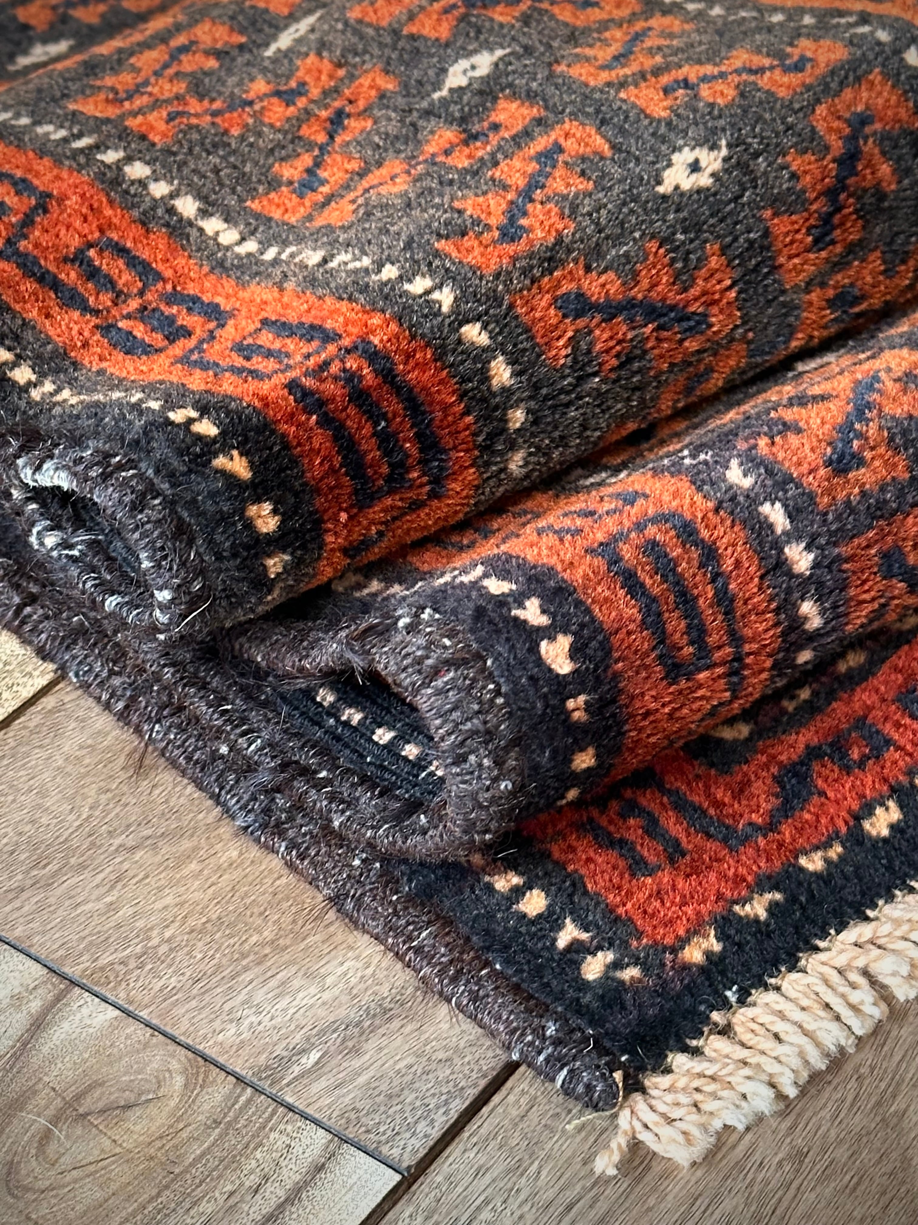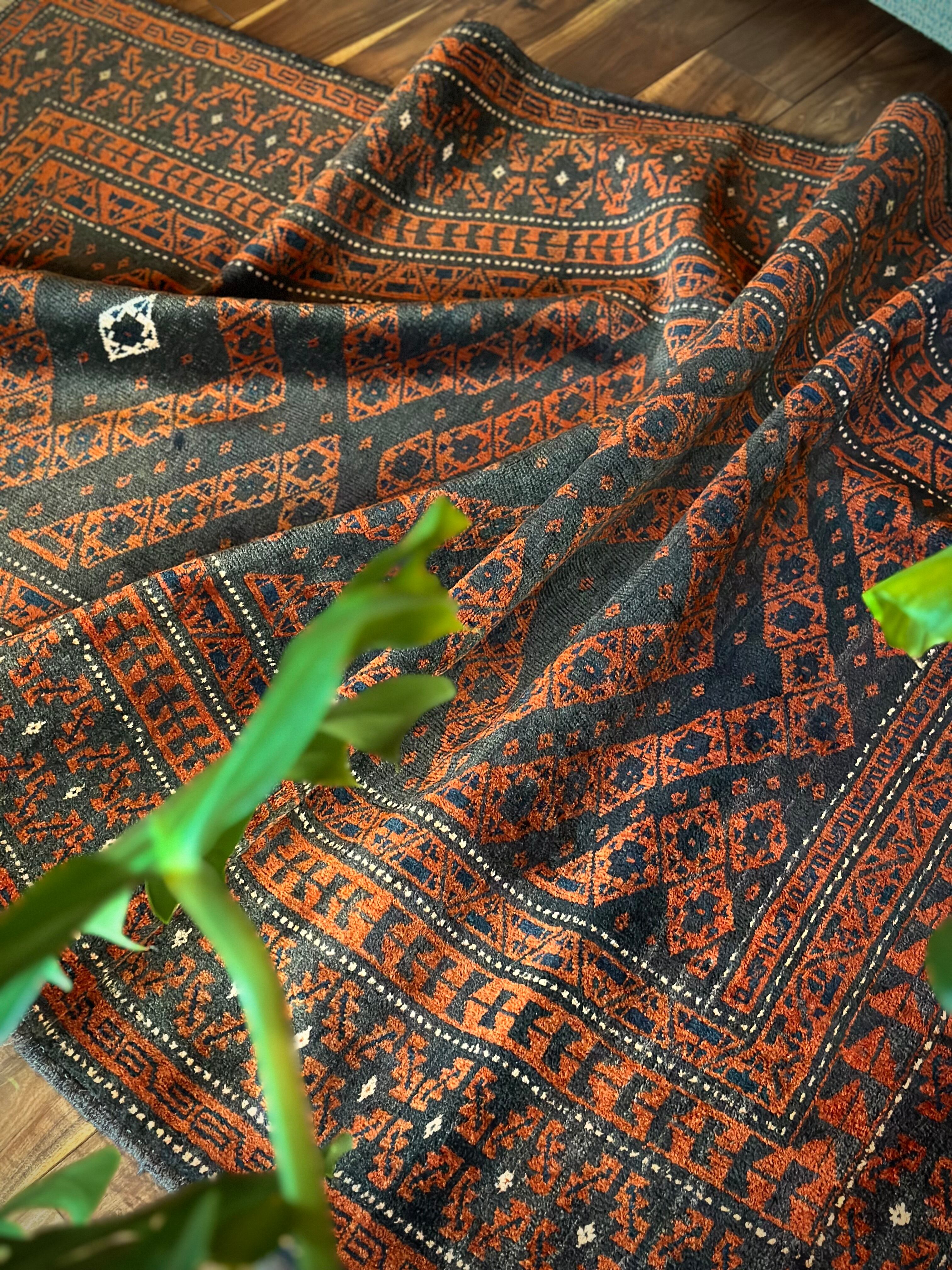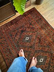 長年の経年劣化によって色褪せたテラコッタとブラックベースが渋い雰囲気を醸し出しているアンティークな1枚で、アフガニスタンはヘラート州に居住するバルーチ族のトライバルラグになります。