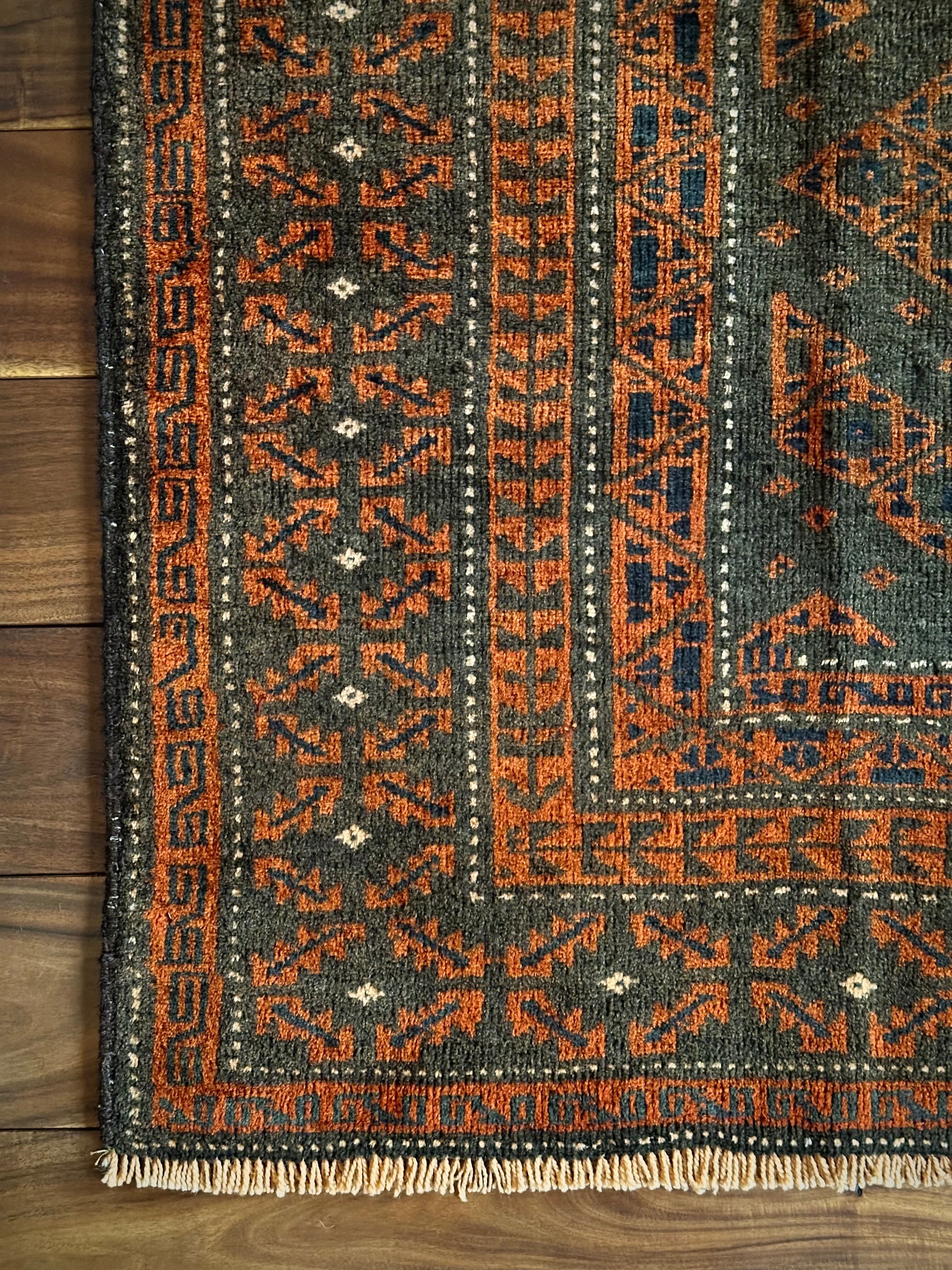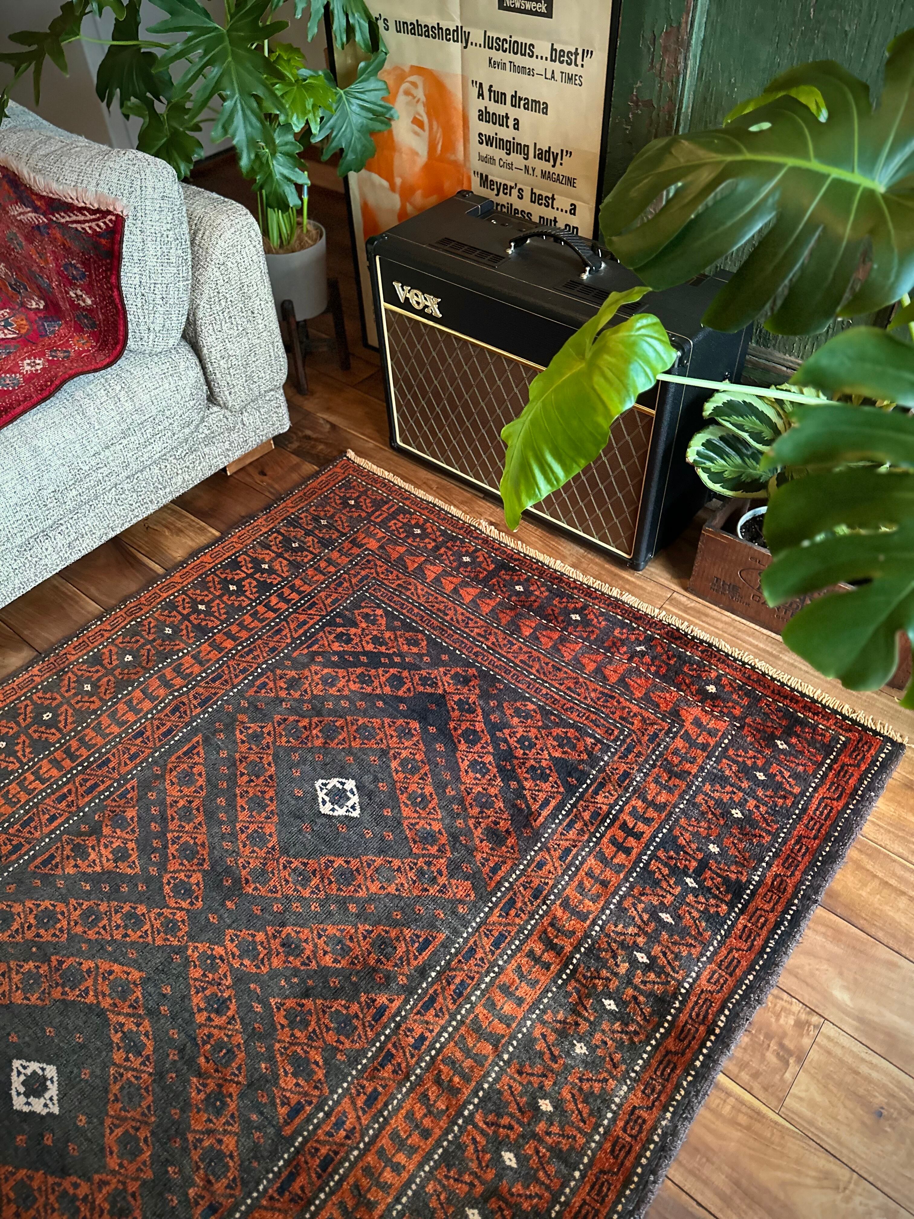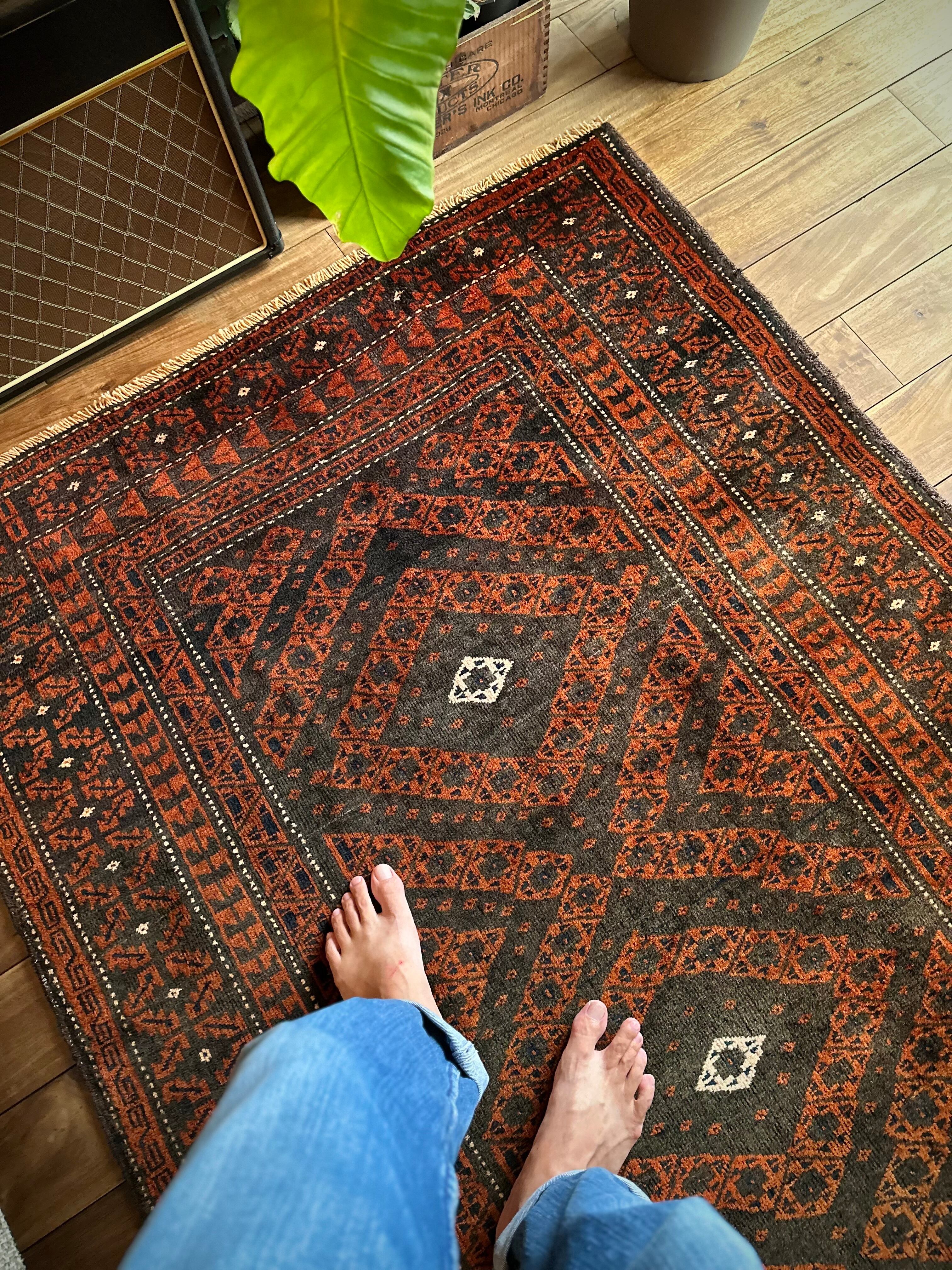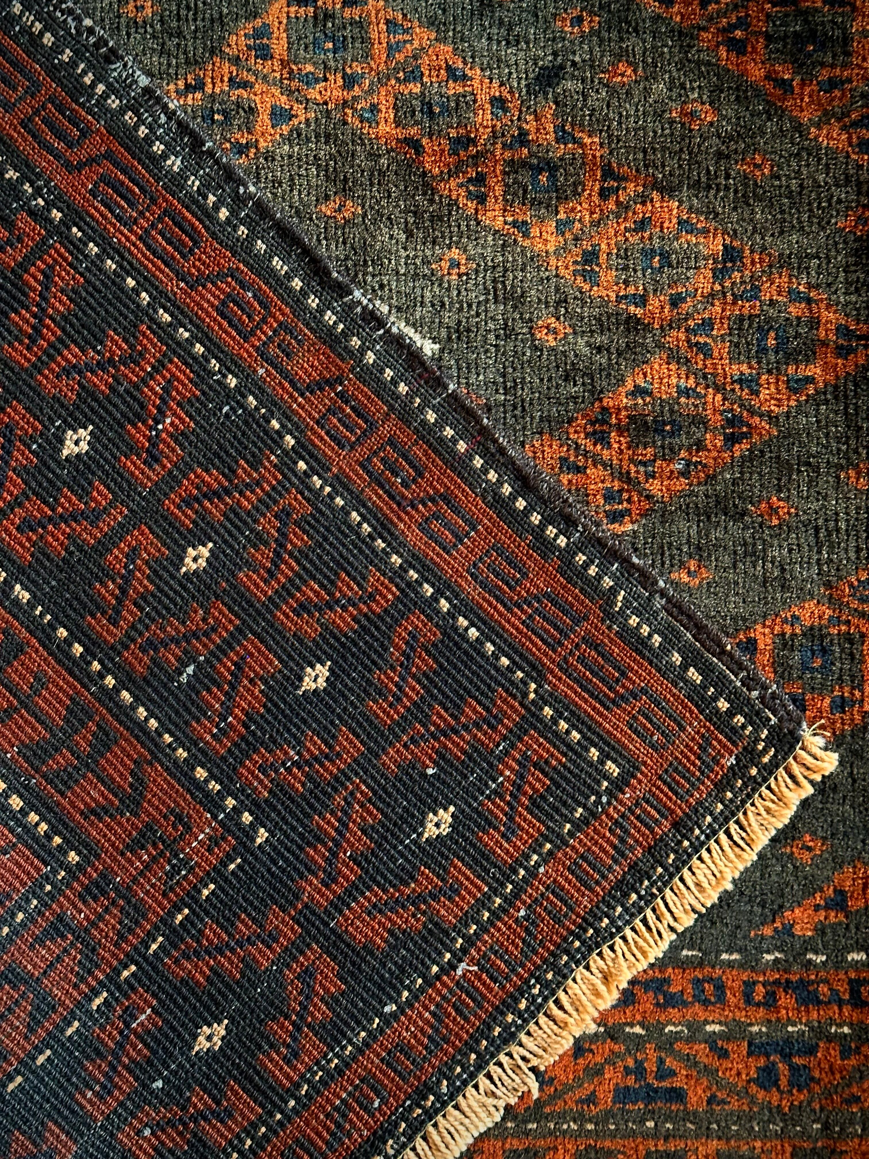 長年の経年劣化によって色褪せたテラコッタとブラックベースが渋い雰囲気を醸し出しているアンティークな1枚で、アフガニスタンはヘラート州に居住するバルーチ族のトライバルラグになります。