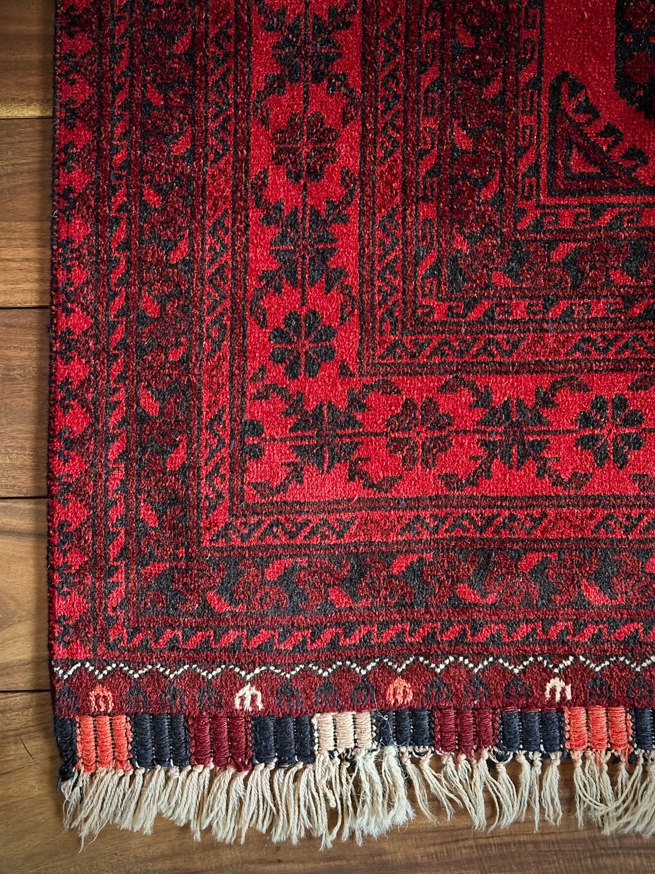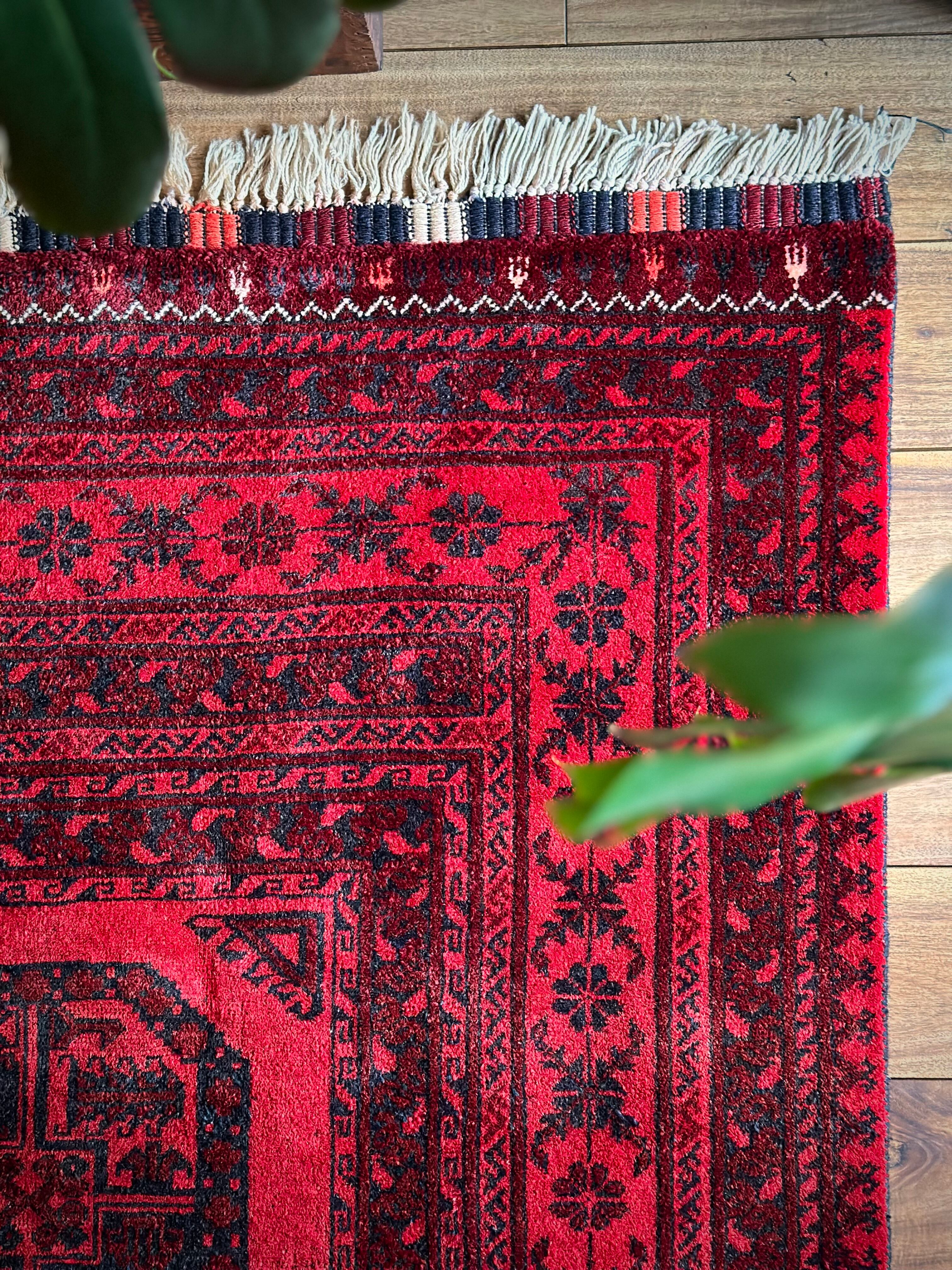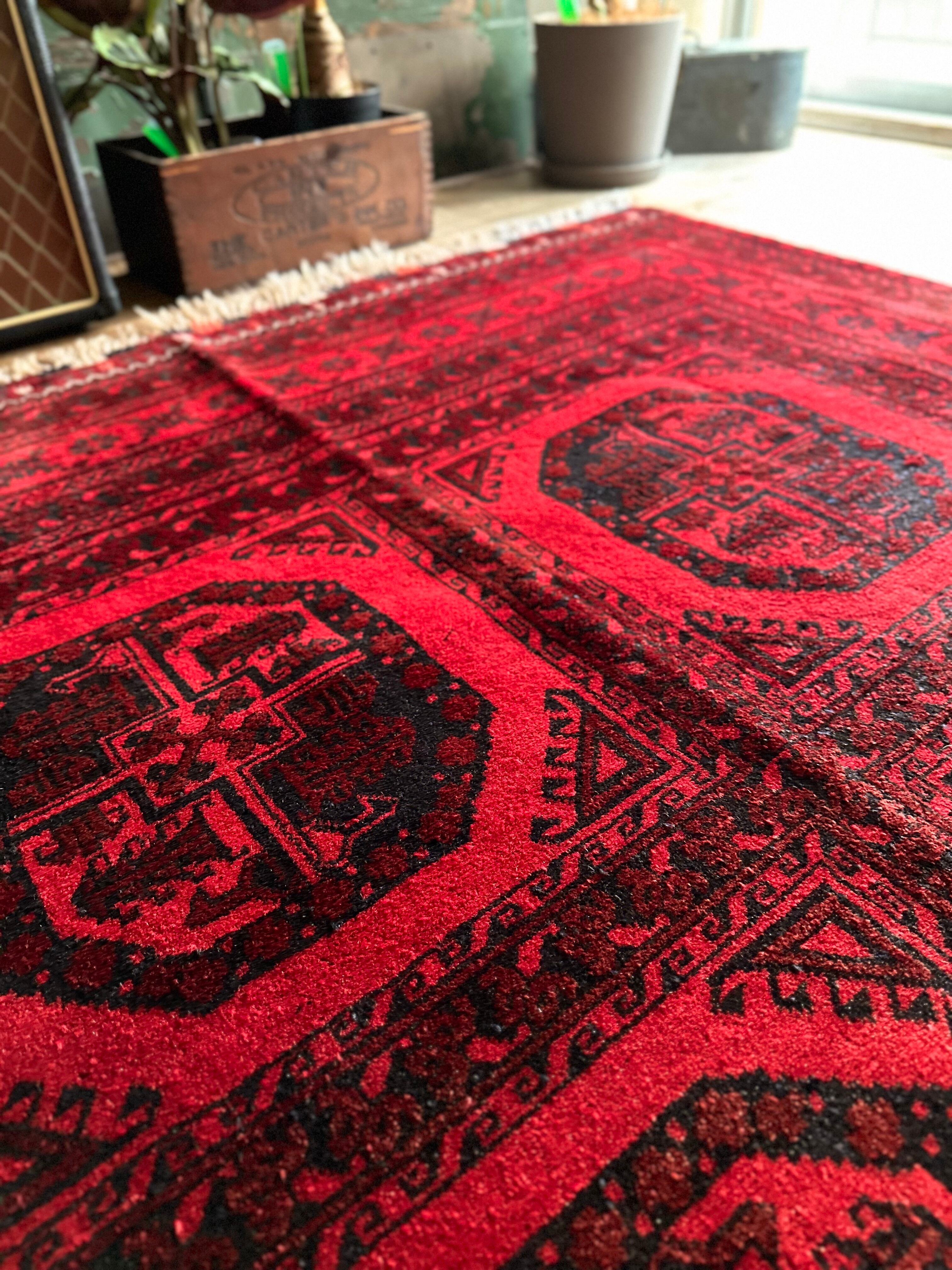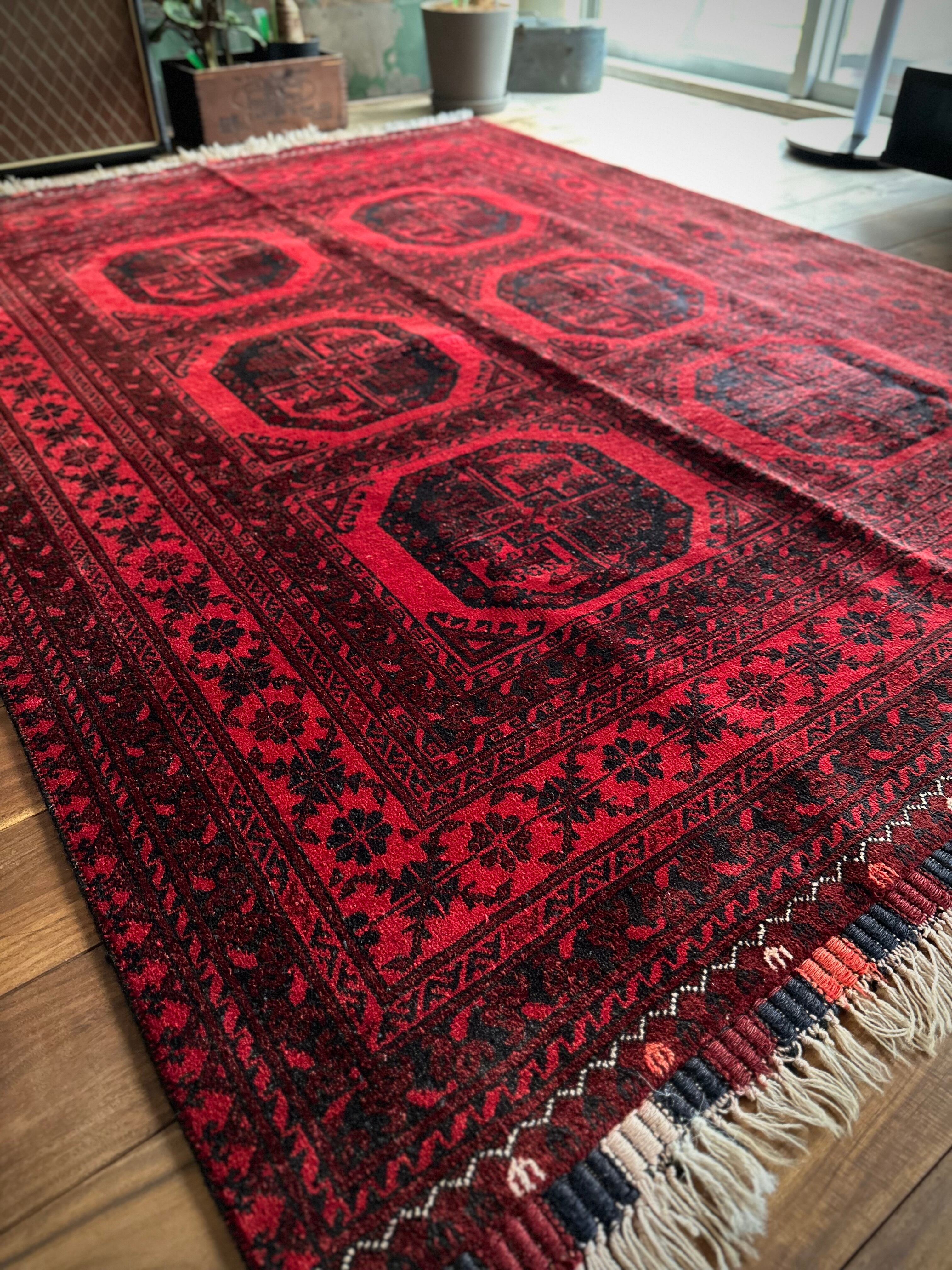 目を見張る真っ赤な色彩に象の足跡と称される6連のフィルパイ紋様が威風堂々としていてかっこいい、アフガニスタン北部の国境付近アンドホイに居住するトルクメンの支族であるエルサリ族のトライバルラグになります。