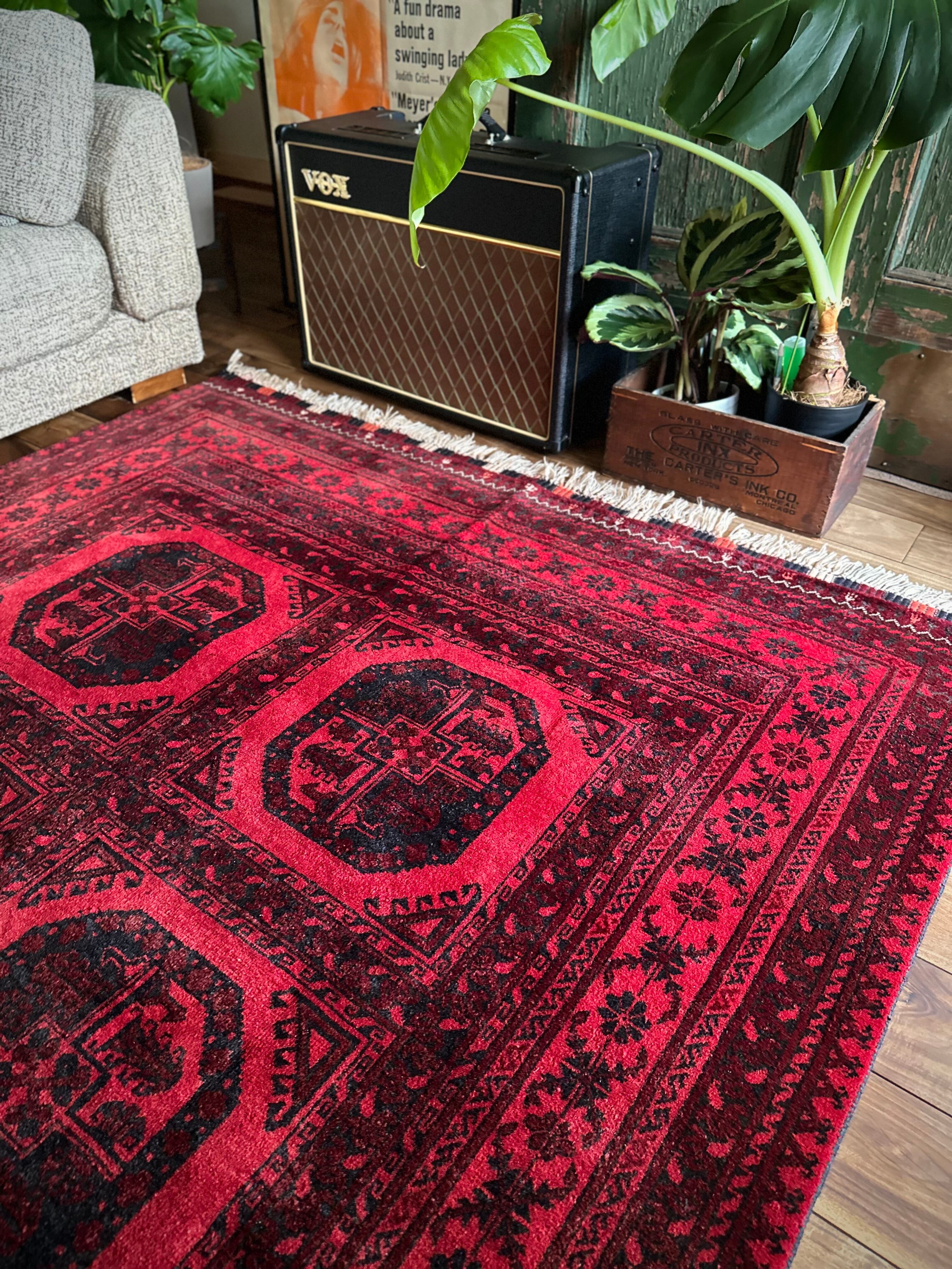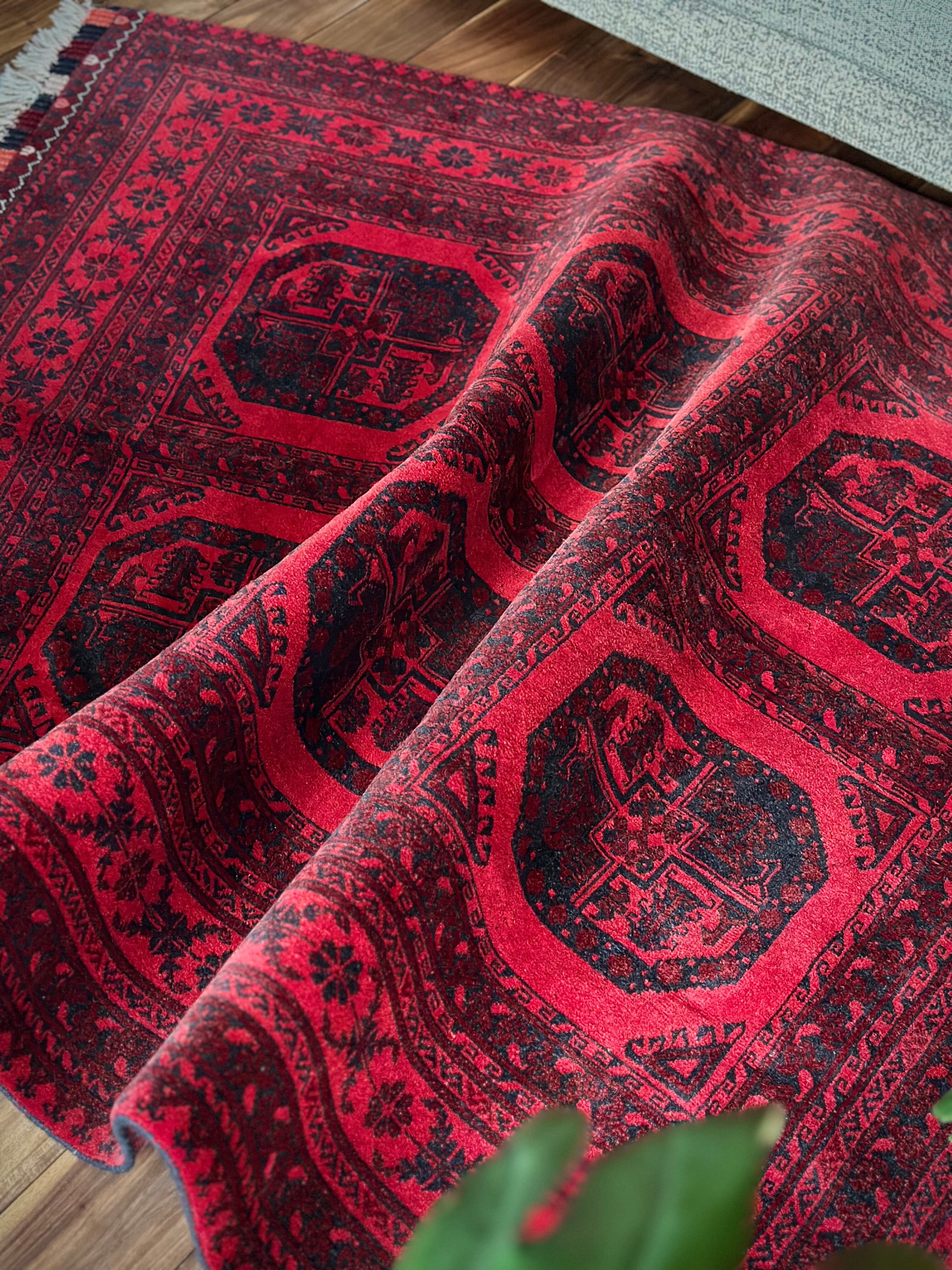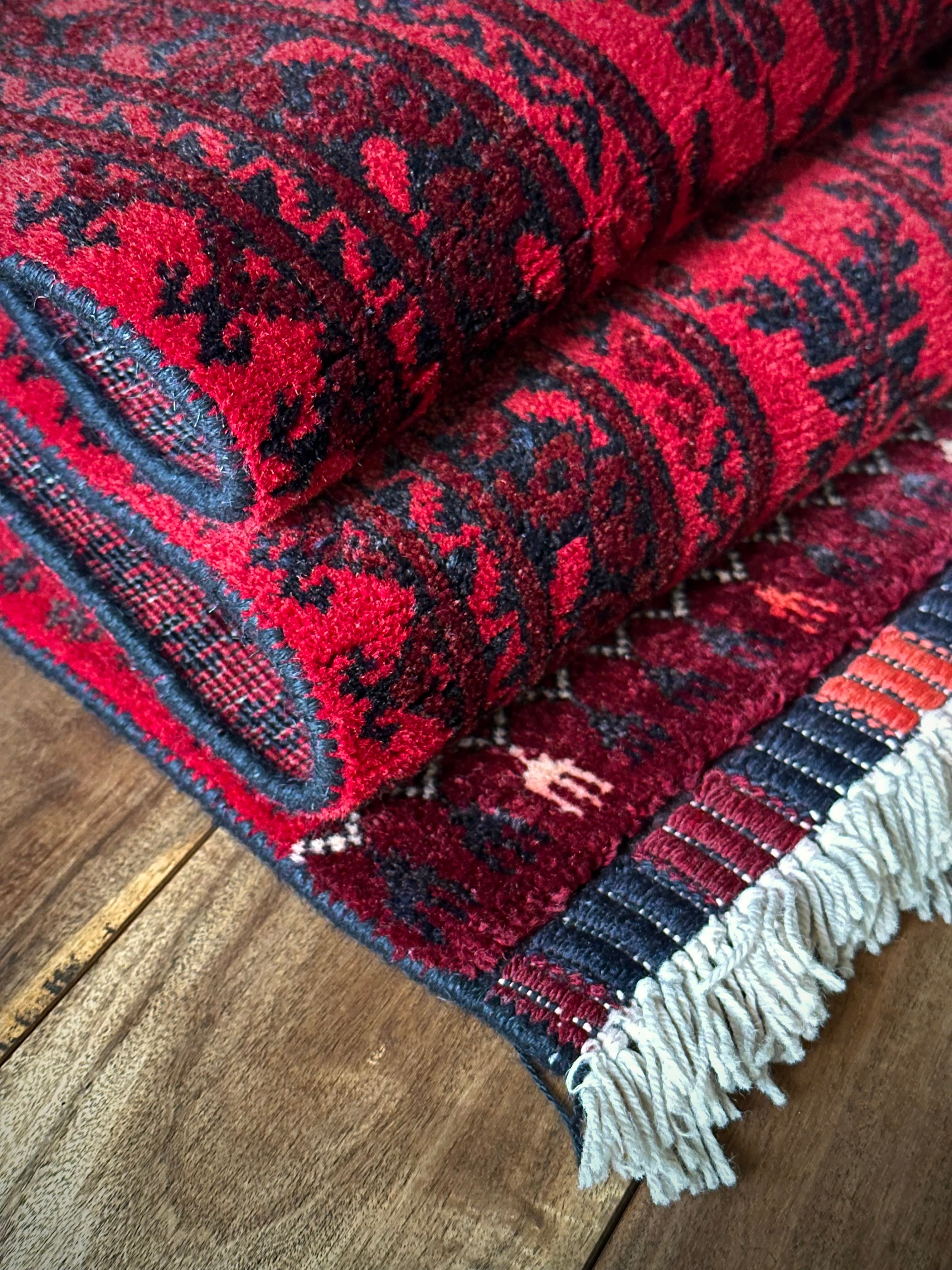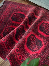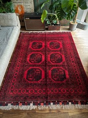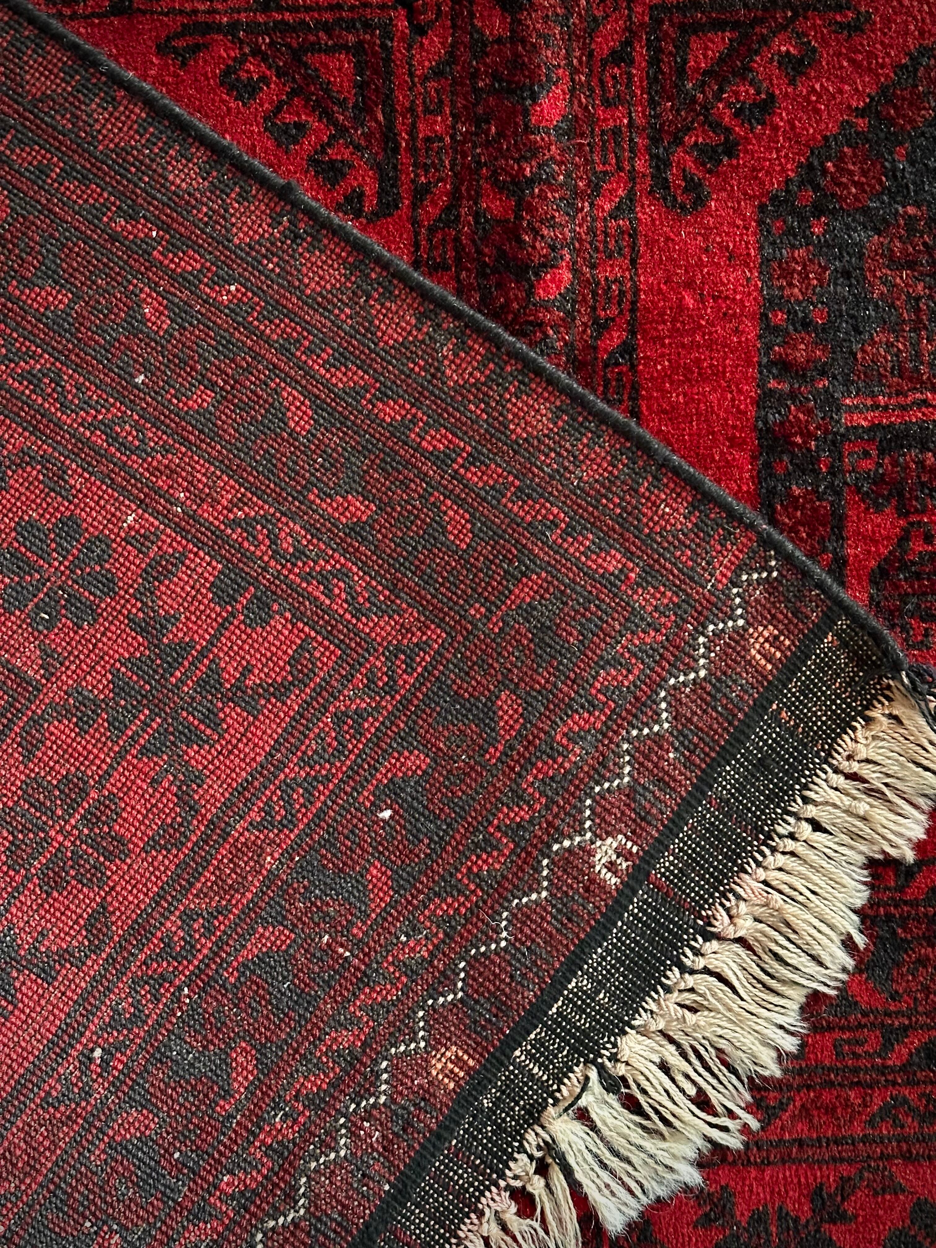 目を見張る真っ赤な色彩に象の足跡と称される6連のフィルパイ紋様が威風堂々としていてかっこいい、アフガニスタン北部の国境付近アンドホイに居住するトルクメンの支族であるエルサリ族のトライバルラグになります。