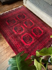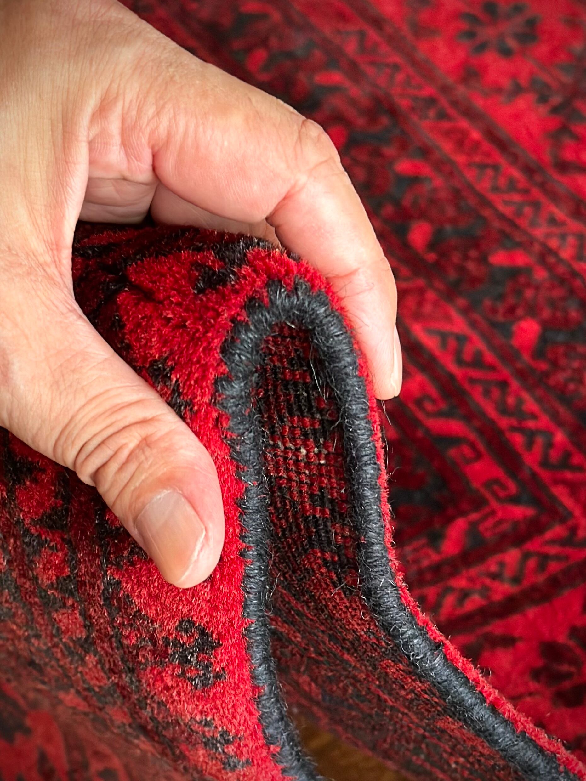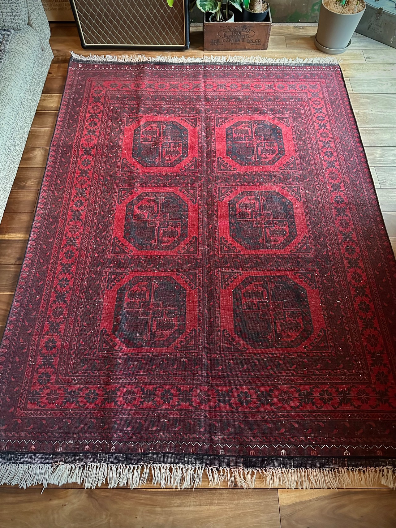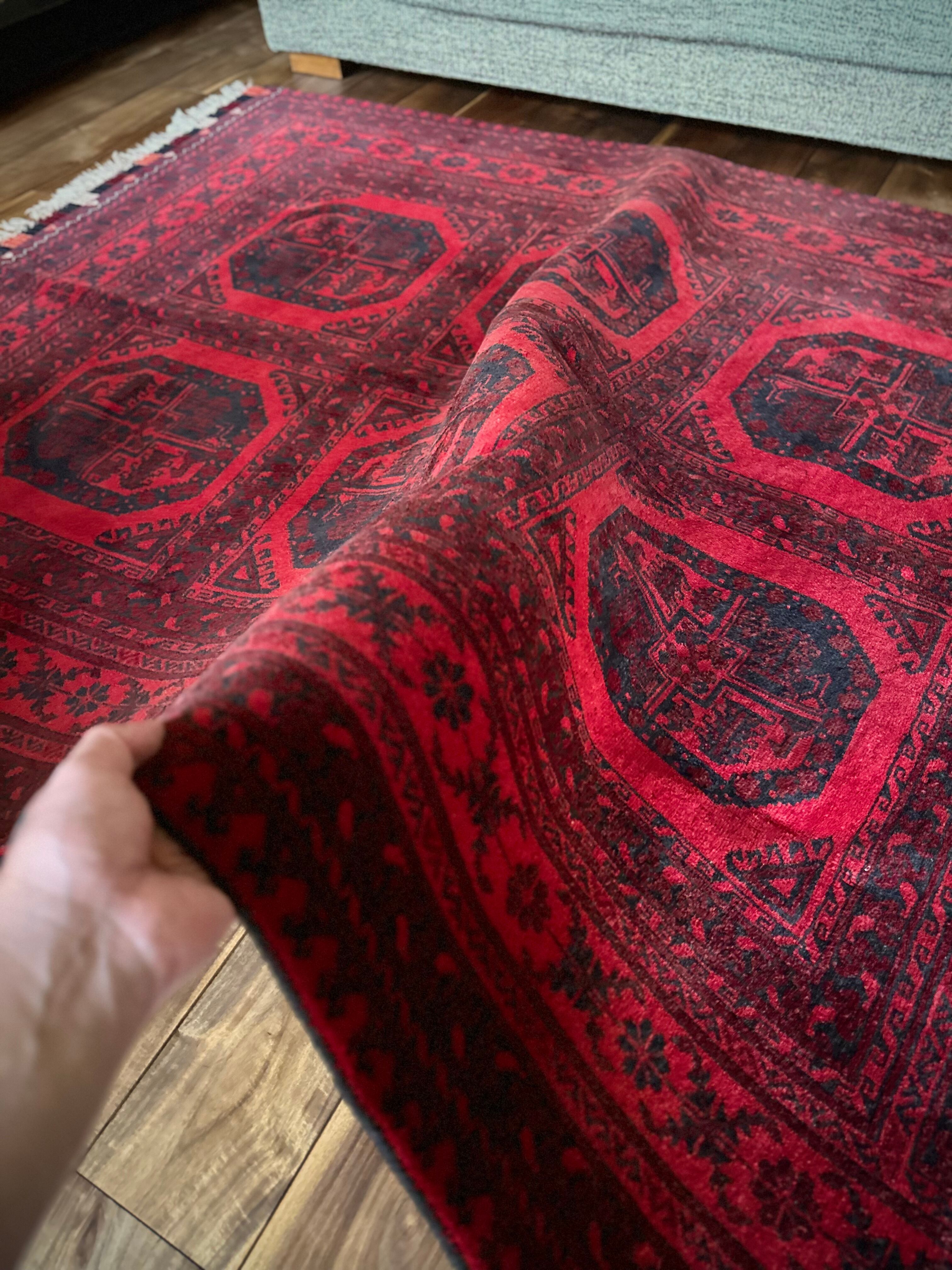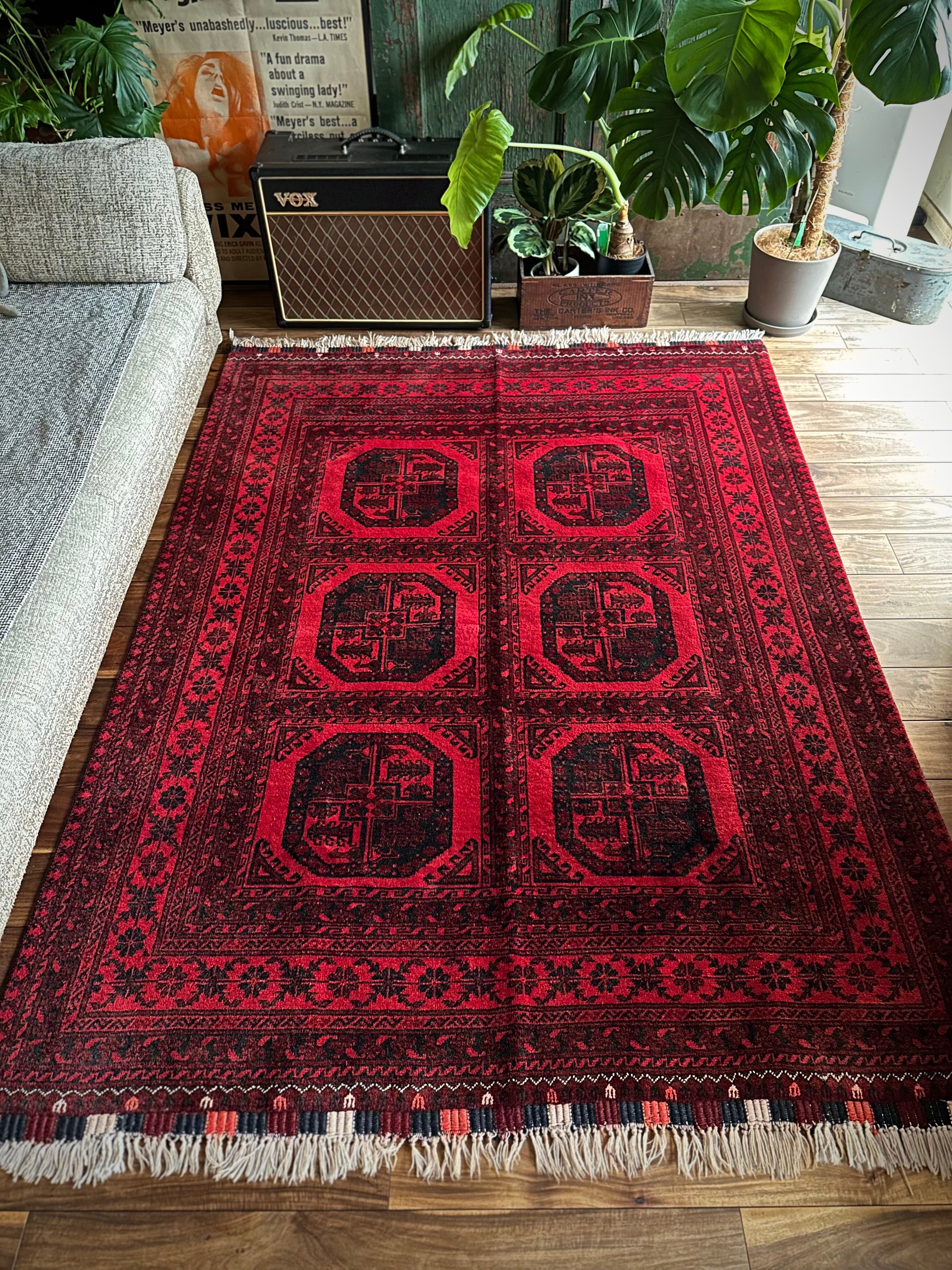 目を見張る真っ赤な色彩に象の足跡と称される6連のフィルパイ紋様が威風堂々としていてかっこいい、アフガニスタン北部の国境付近アンドホイに居住するトルクメンの支族であるエルサリ族のトライバルラグになります。