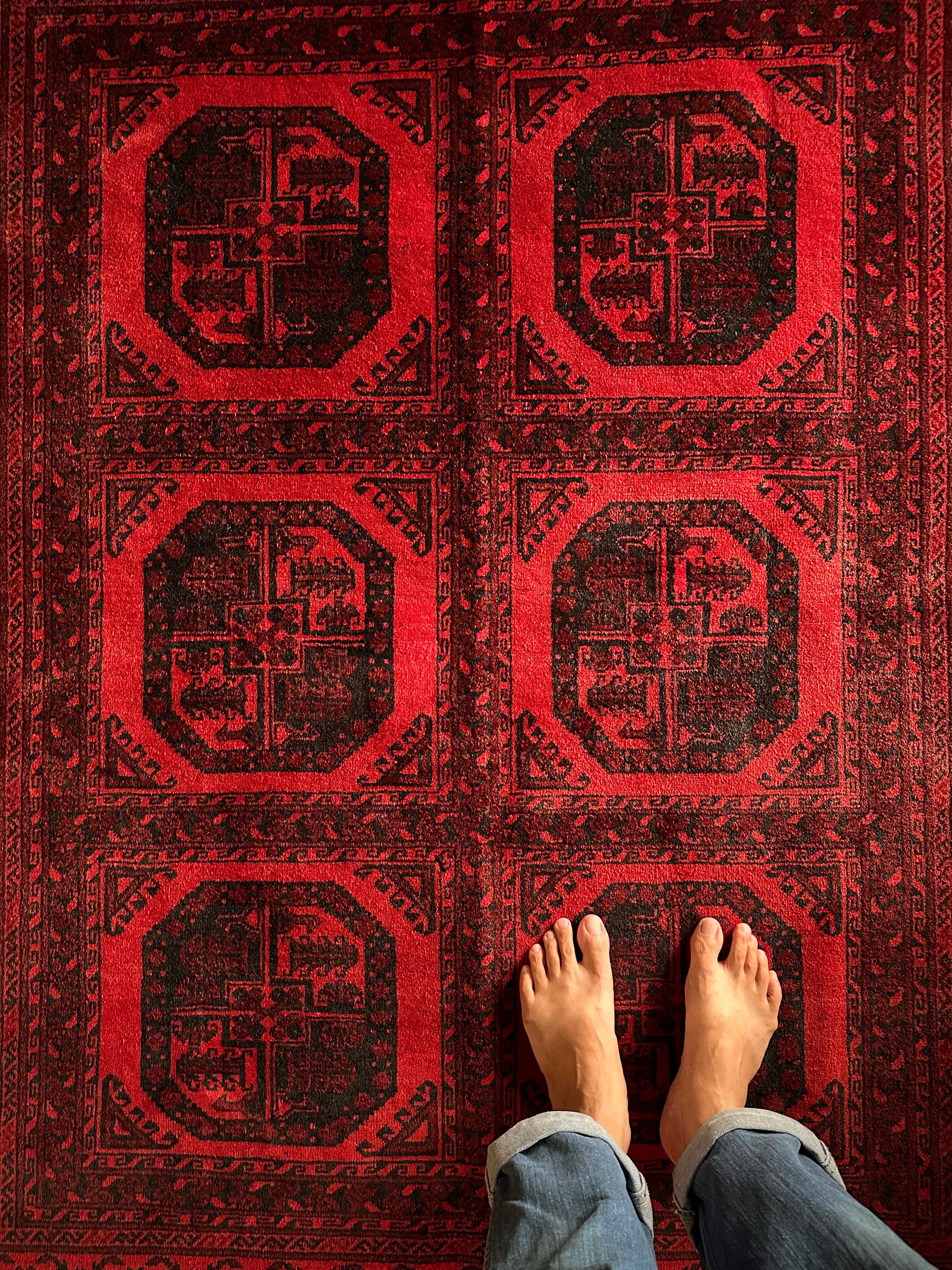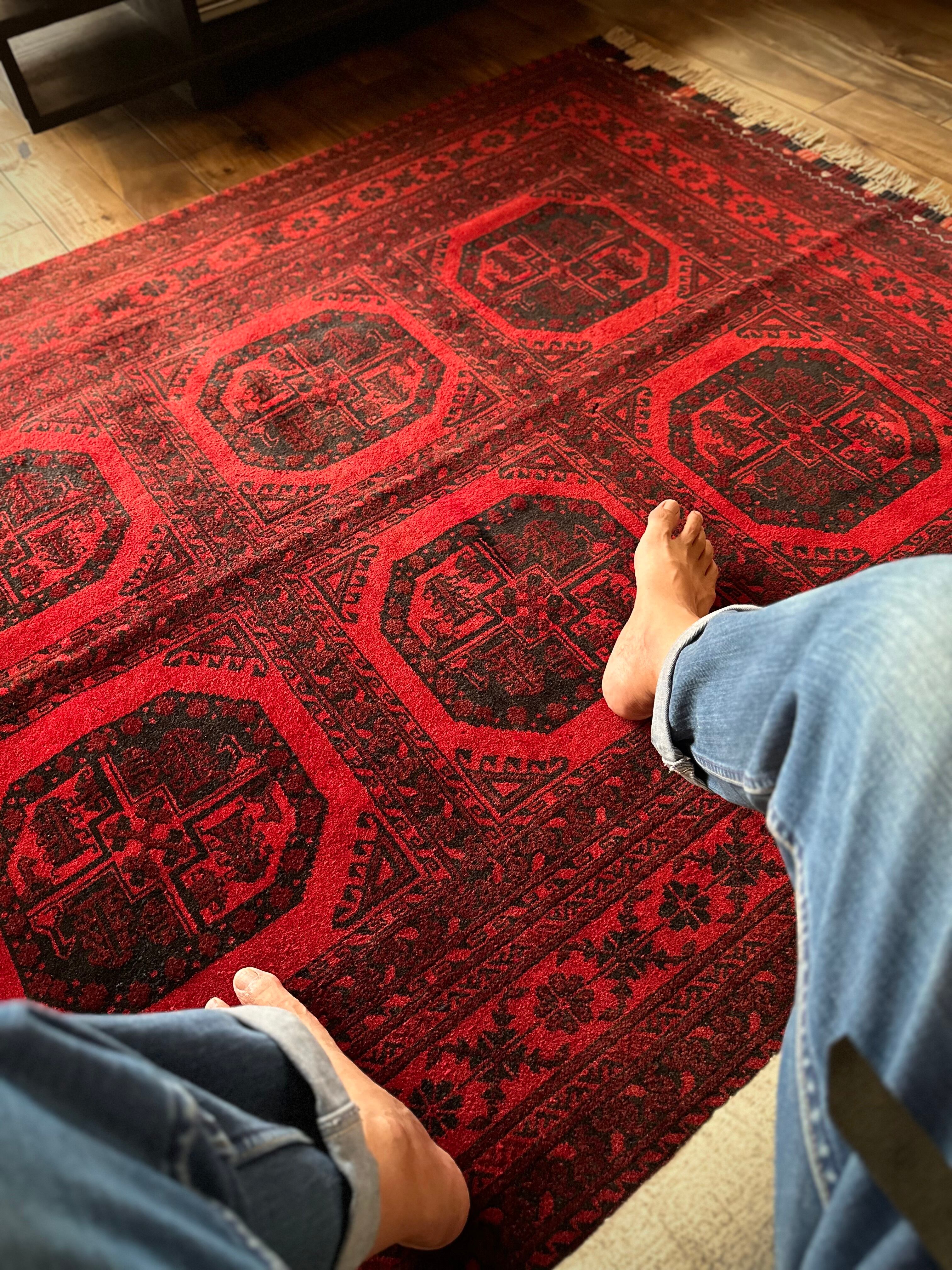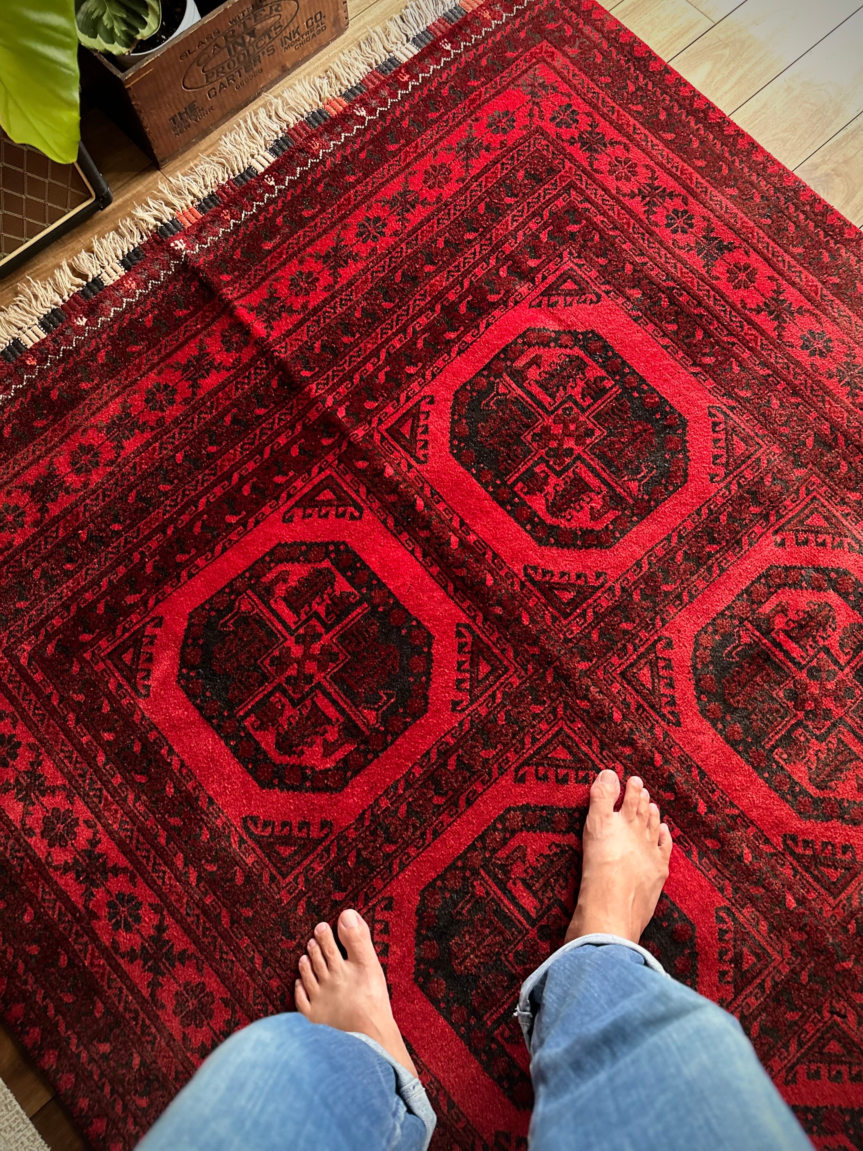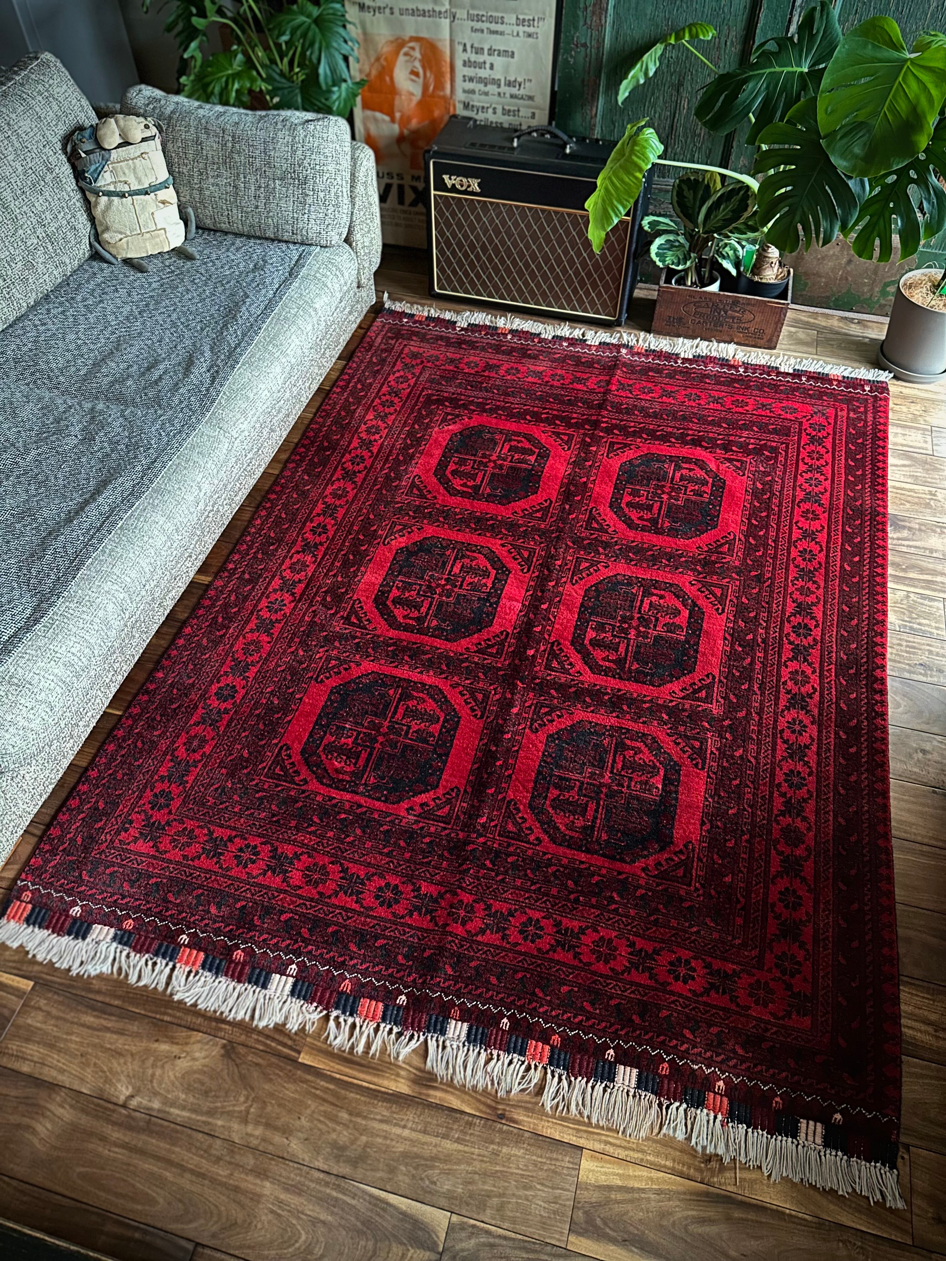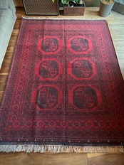 目を見張る真っ赤な色彩に象の足跡と称される6連のフィルパイ紋様が威風堂々としていてかっこいい、アフガニスタン北部の国境付近アンドホイに居住するトルクメンの支族であるエルサリ族のトライバルラグになります。
