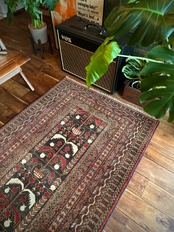 経年としては50年となりそれなりの経年劣化にヴィンテージらしい雰囲気が漂っているでしょうか。特に目立つダメージやリペア箇所は見当たらないグッドなコンディションで、大きさ的にも敷く場所を選ばないアクセントラグになります。