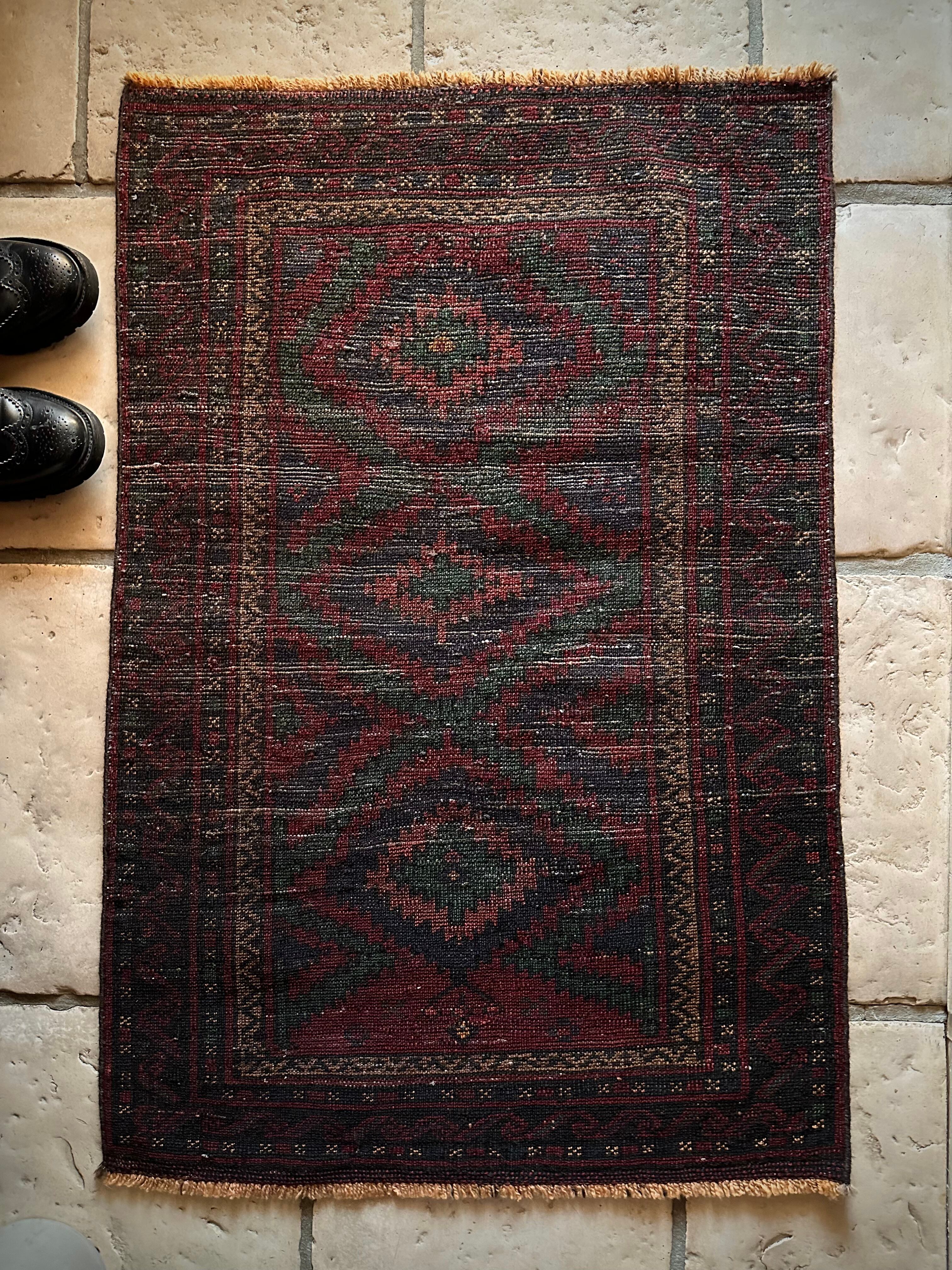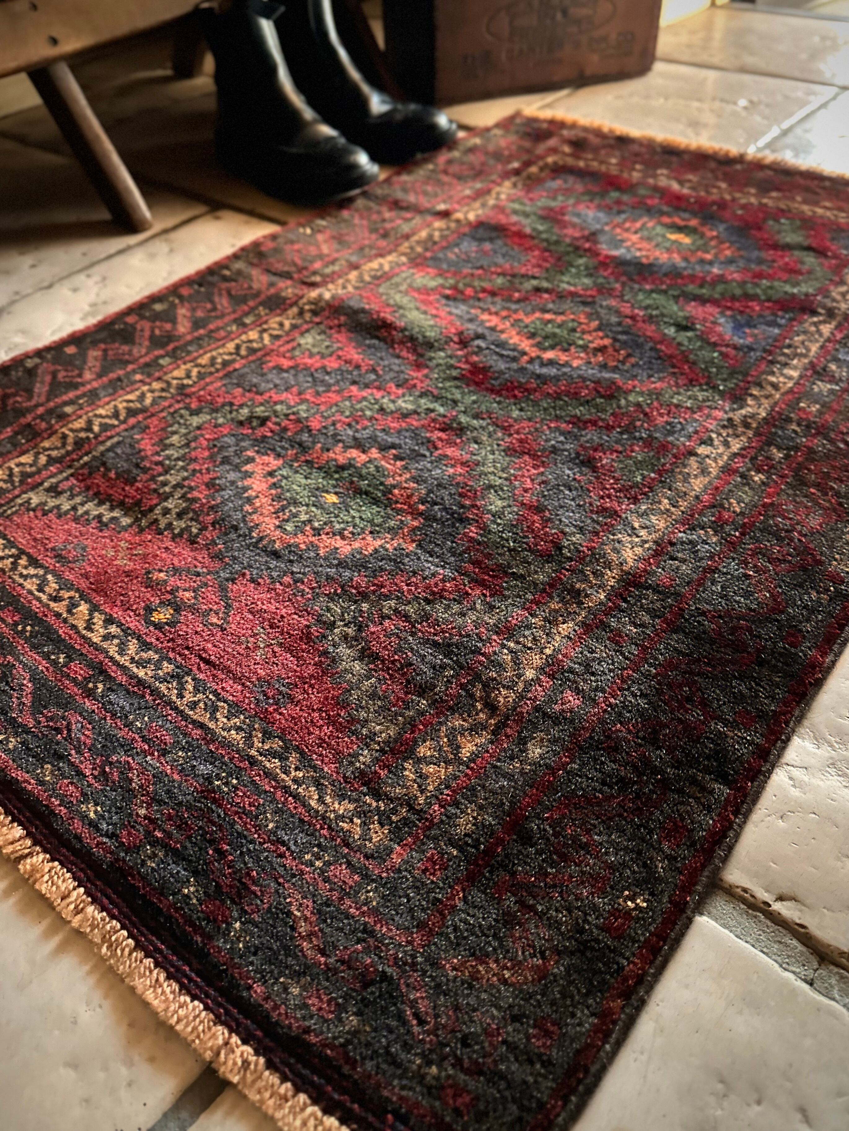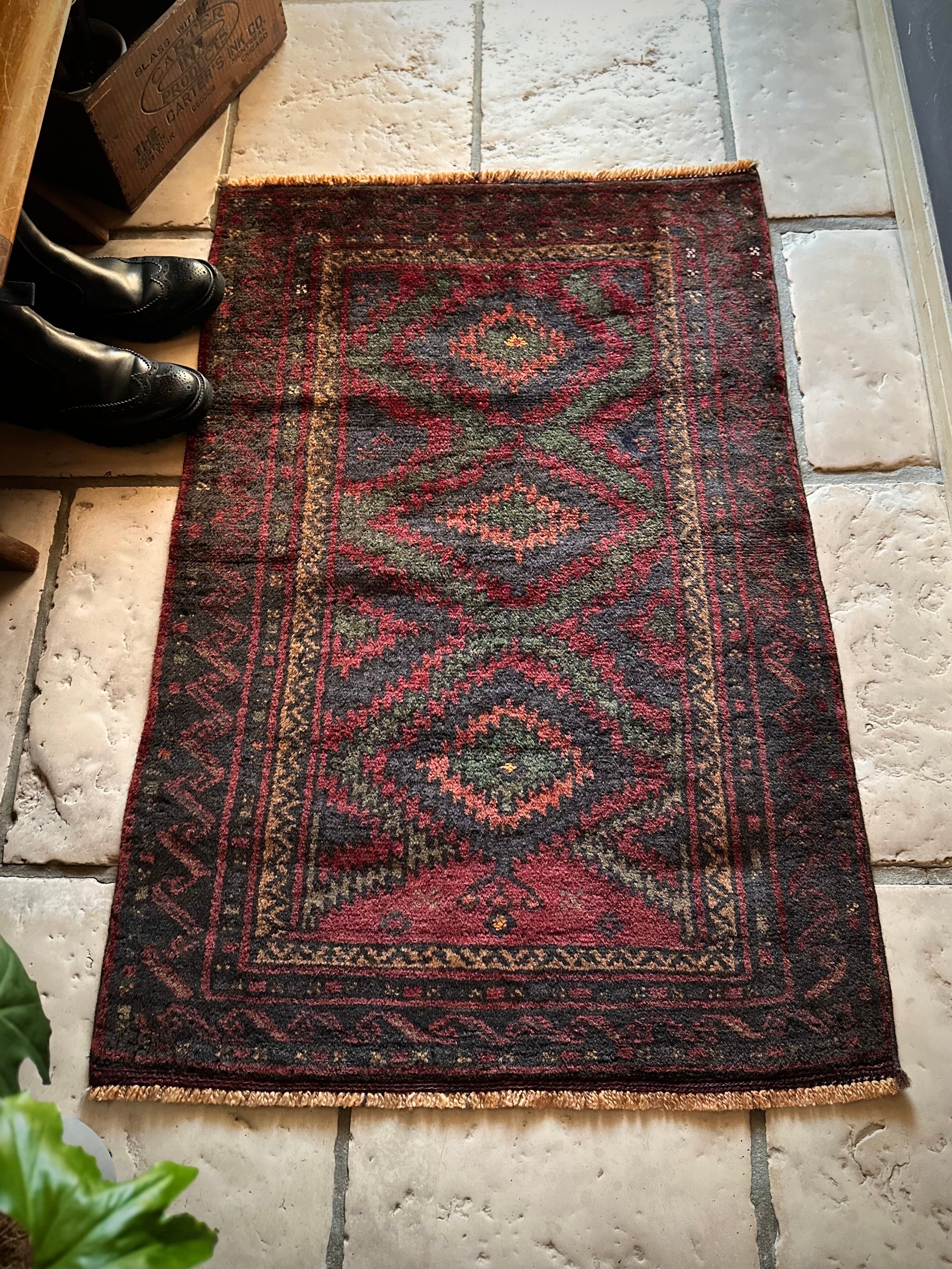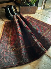 なんとも言えない歪な構図にそのダークな色彩が力強さを感じさせる1枚で、個人的にはこれこそが部族絨毯の面白さかとついついピックアップしてしまいますが、素朴かつワイルドな見映えが男心をくすぐります。