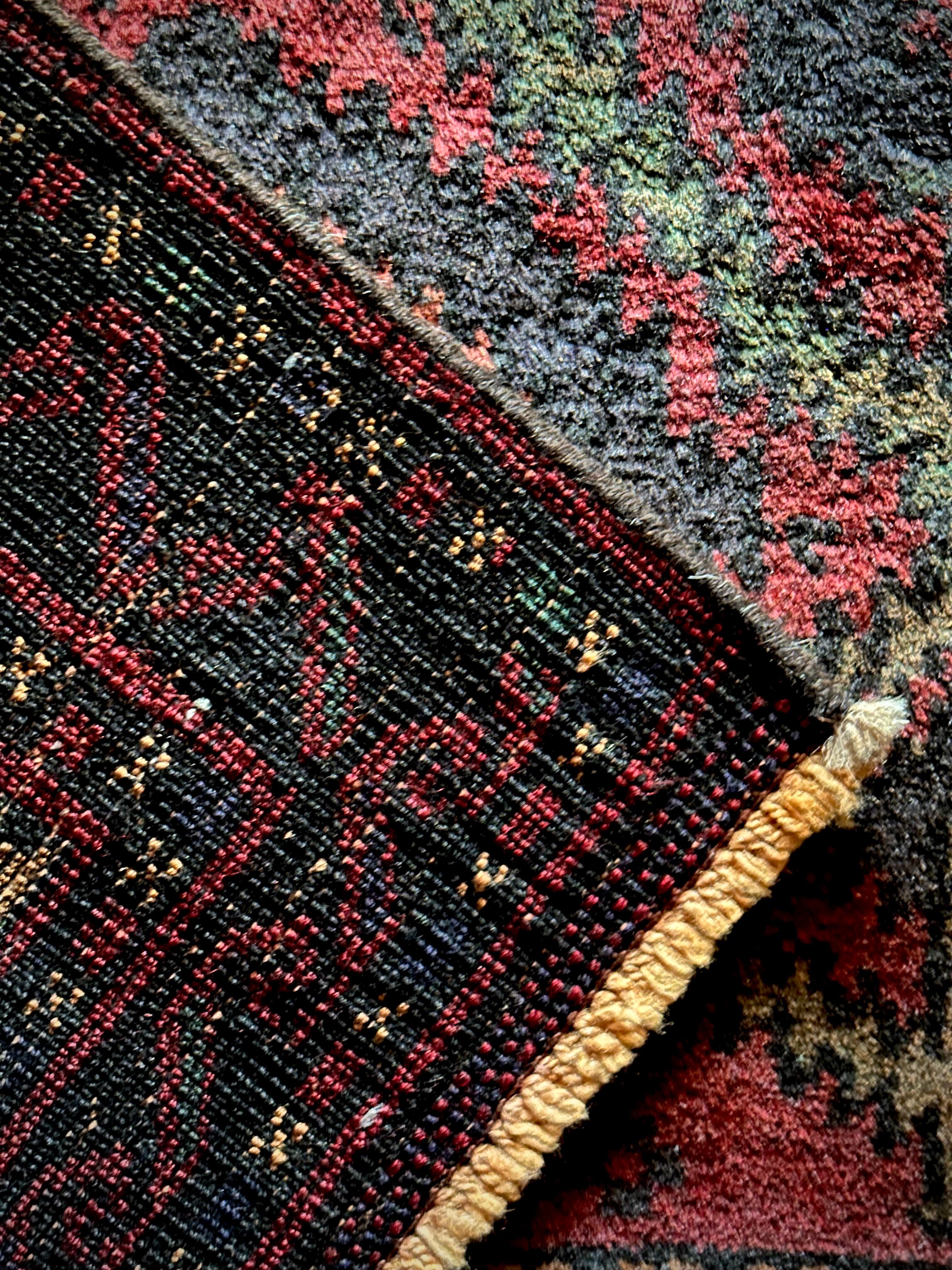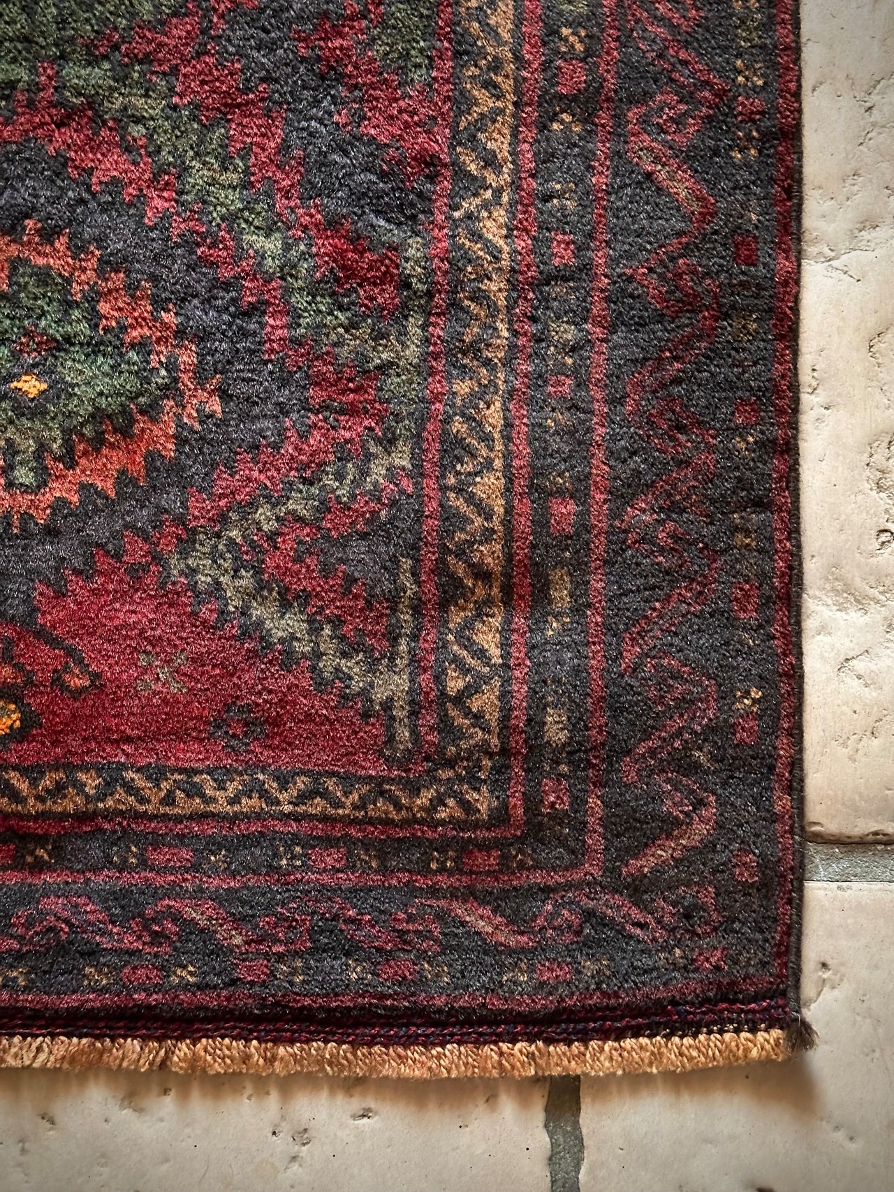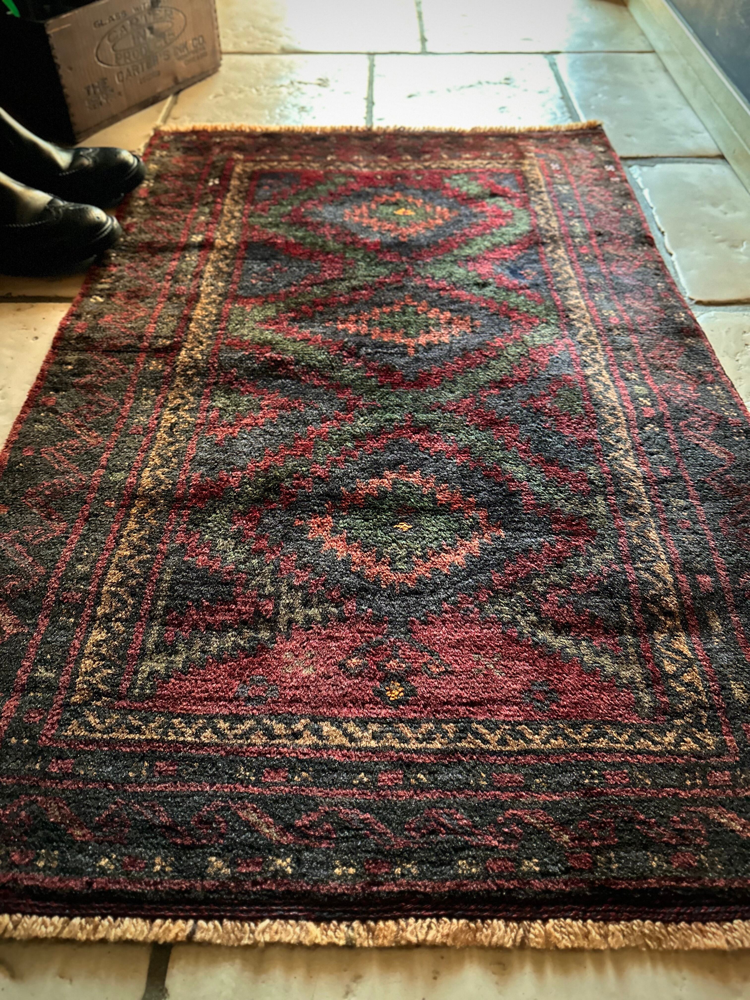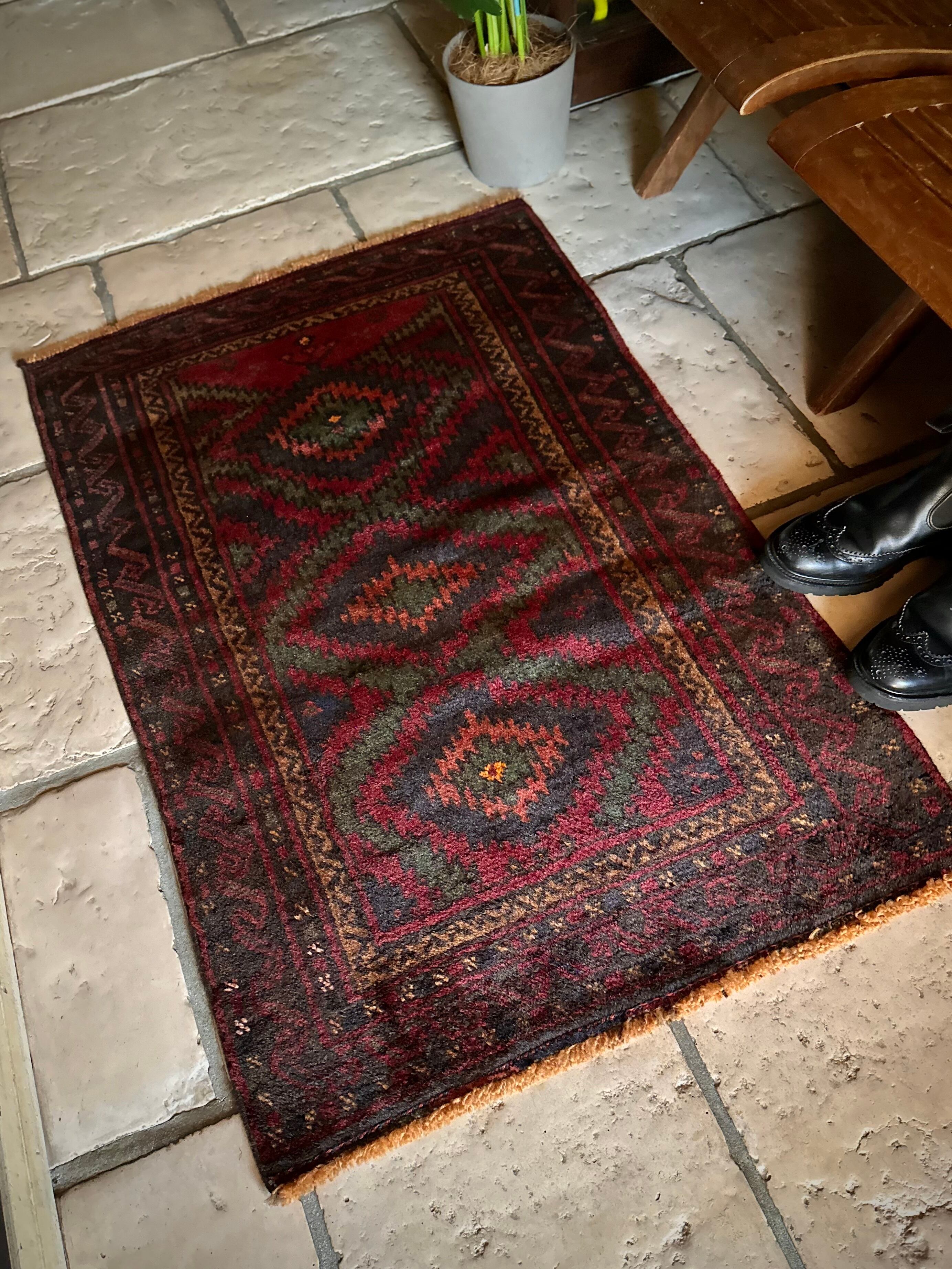 なんとも言えない歪な構図にそのダークな色彩が力強さを感じさせる1枚で、個人的にはこれこそが部族絨毯の面白さかとついついピックアップしてしまいますが、素朴かつワイルドな見映えが男心をくすぐります。