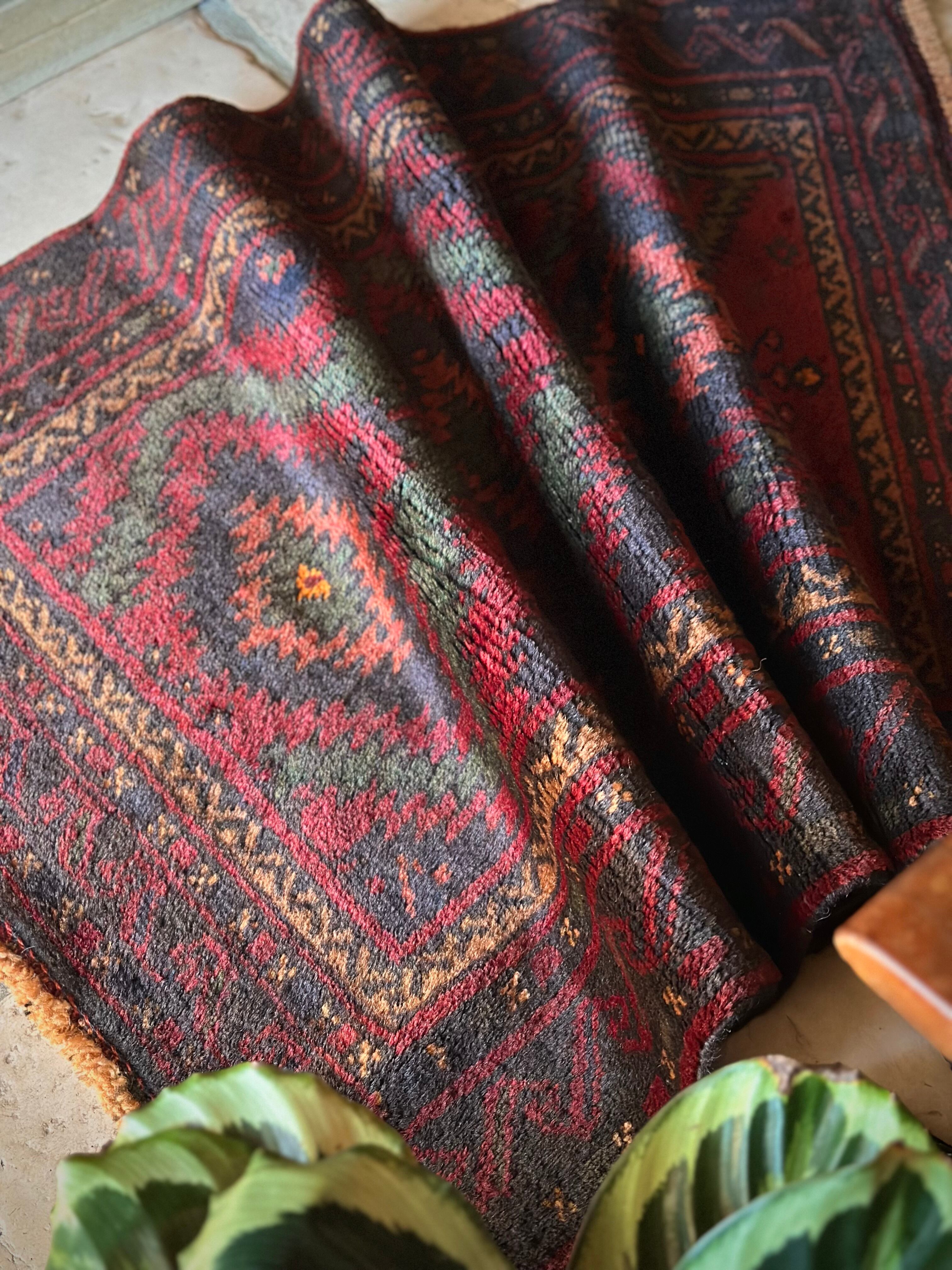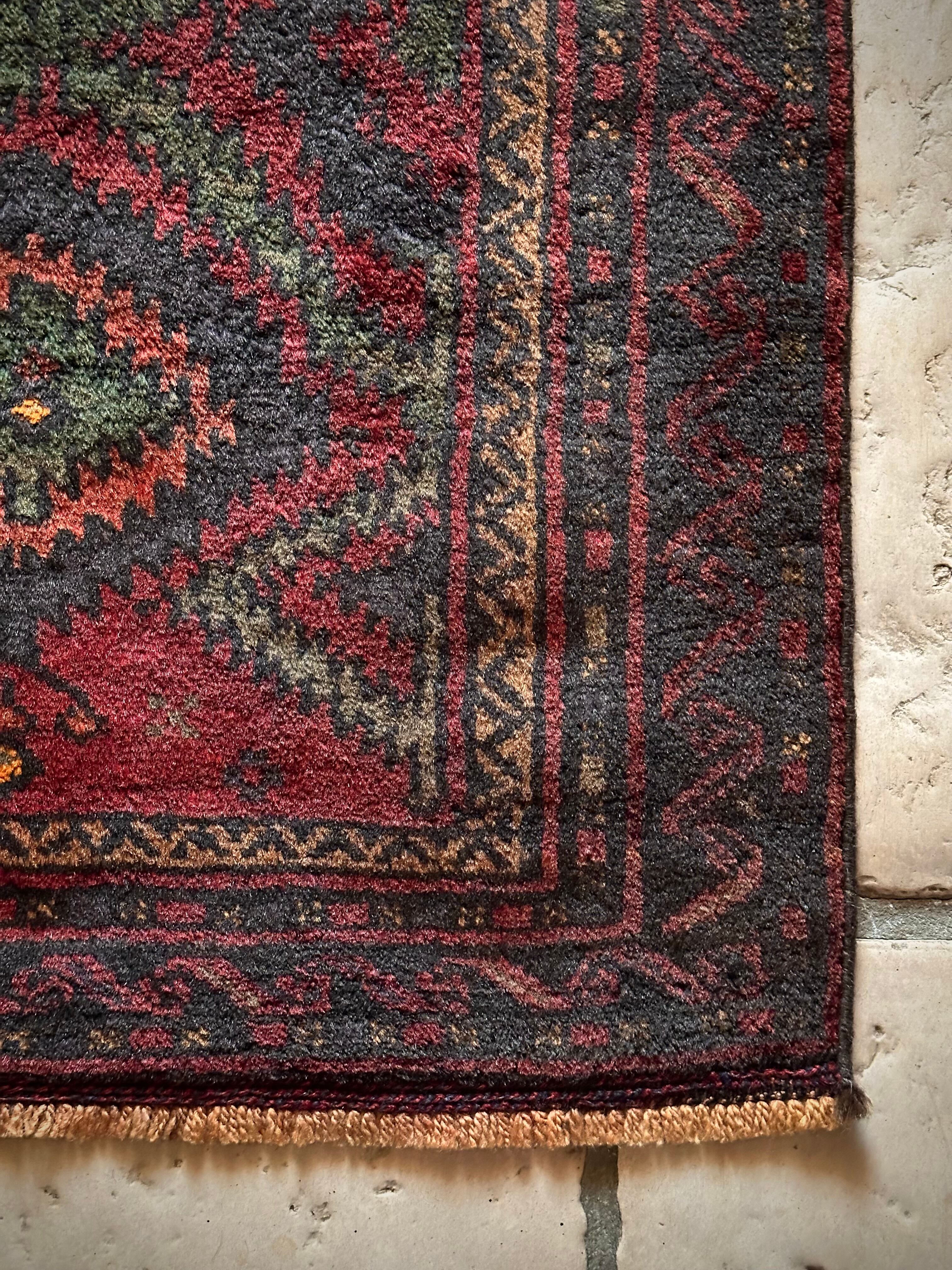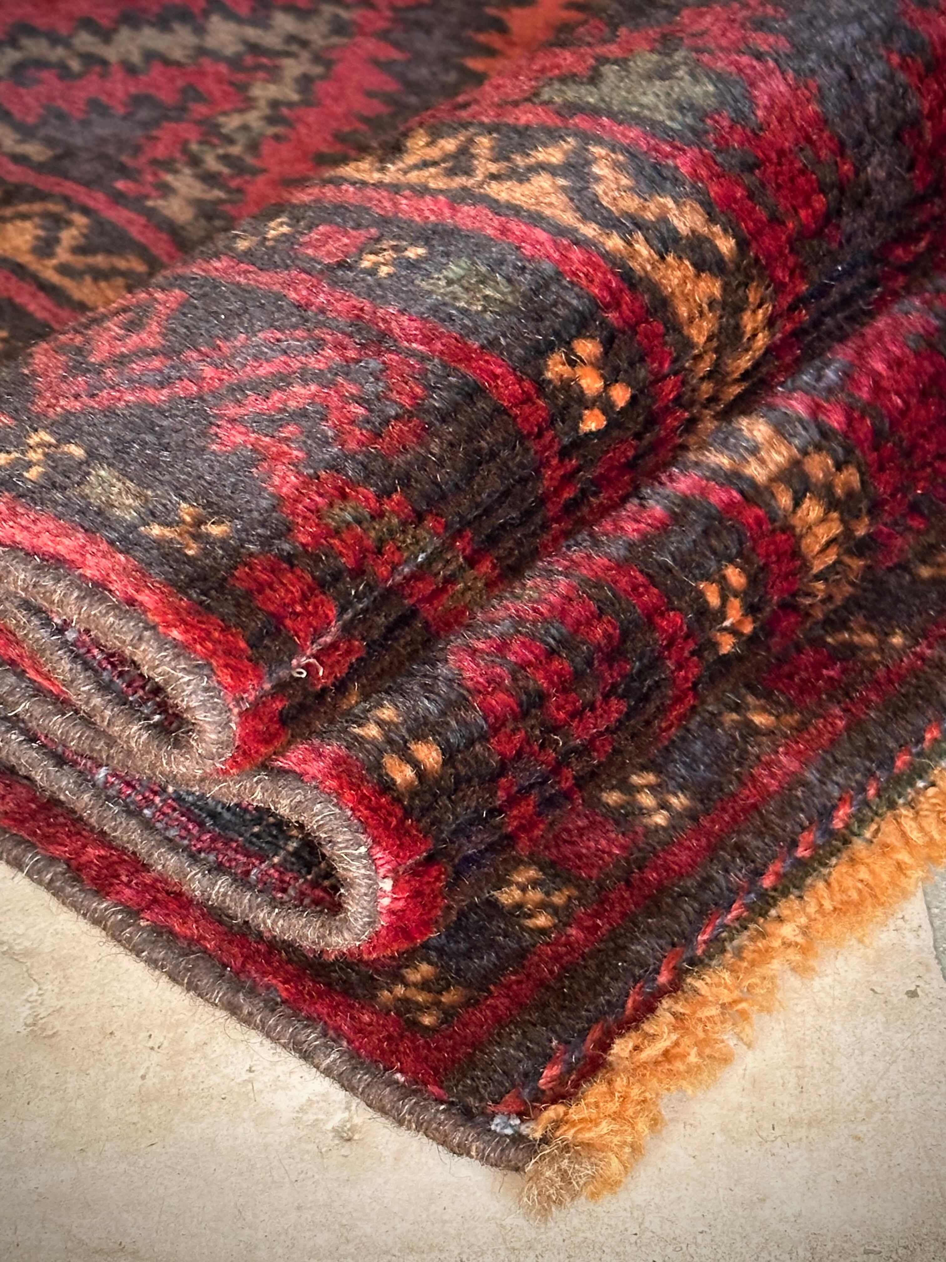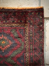 まるでカシュガイ族のオールドギャッベのようなプリミティブ感満載のこちらは、アフガニスタンはヘラート州に居住するバルーチ族の支族で、半遊牧生活を送るマリダリ族のトライバルラグになります。