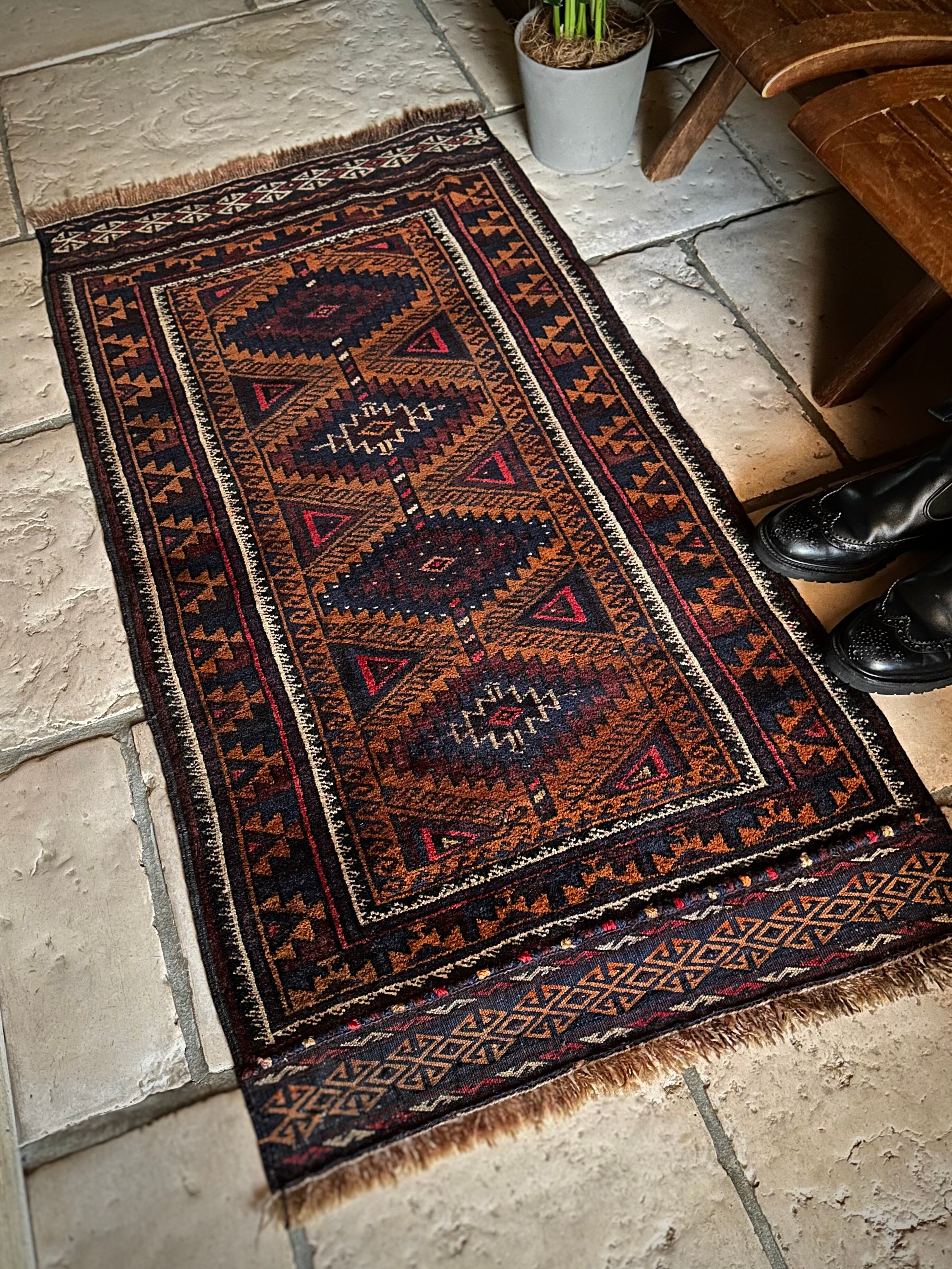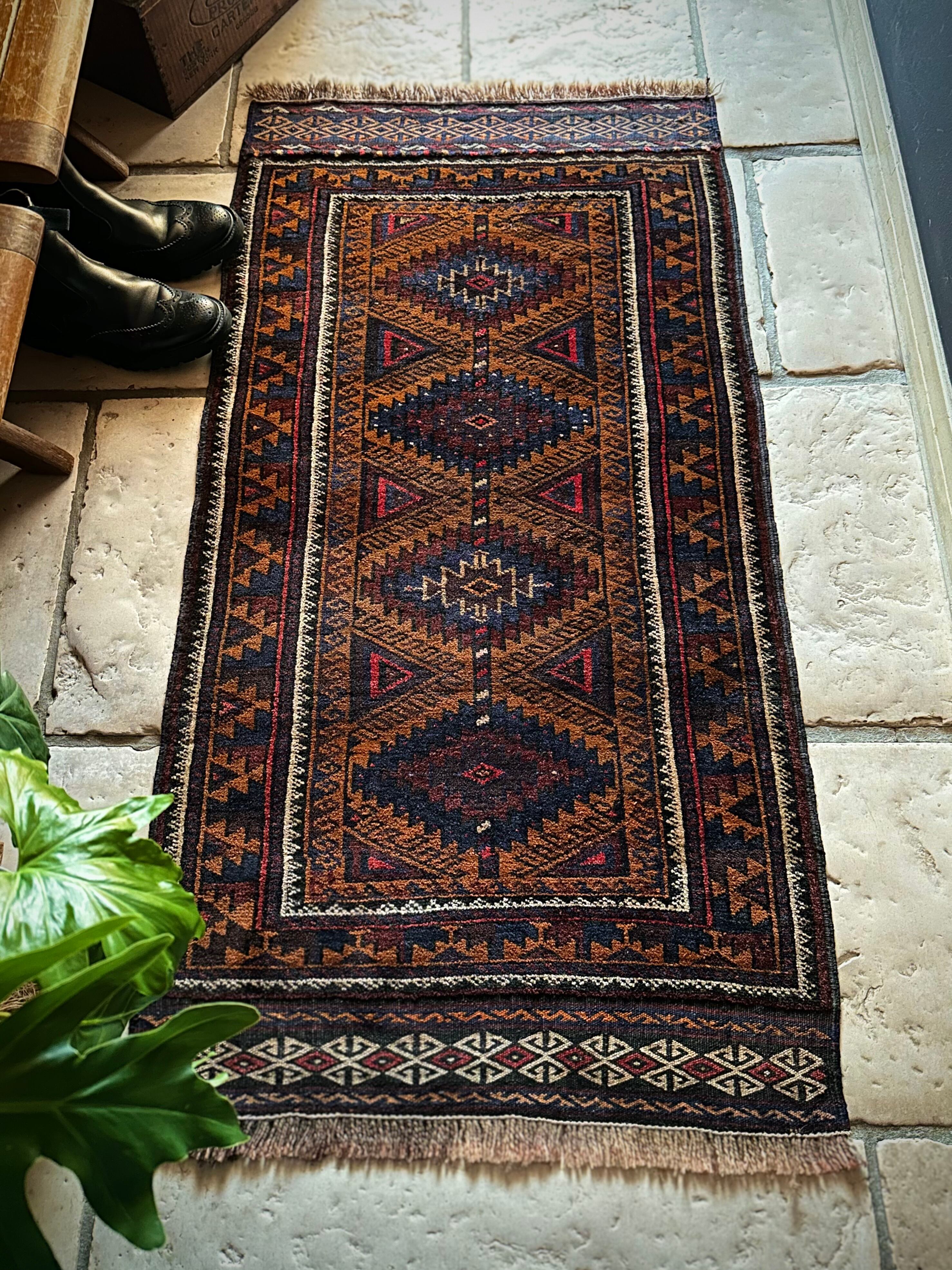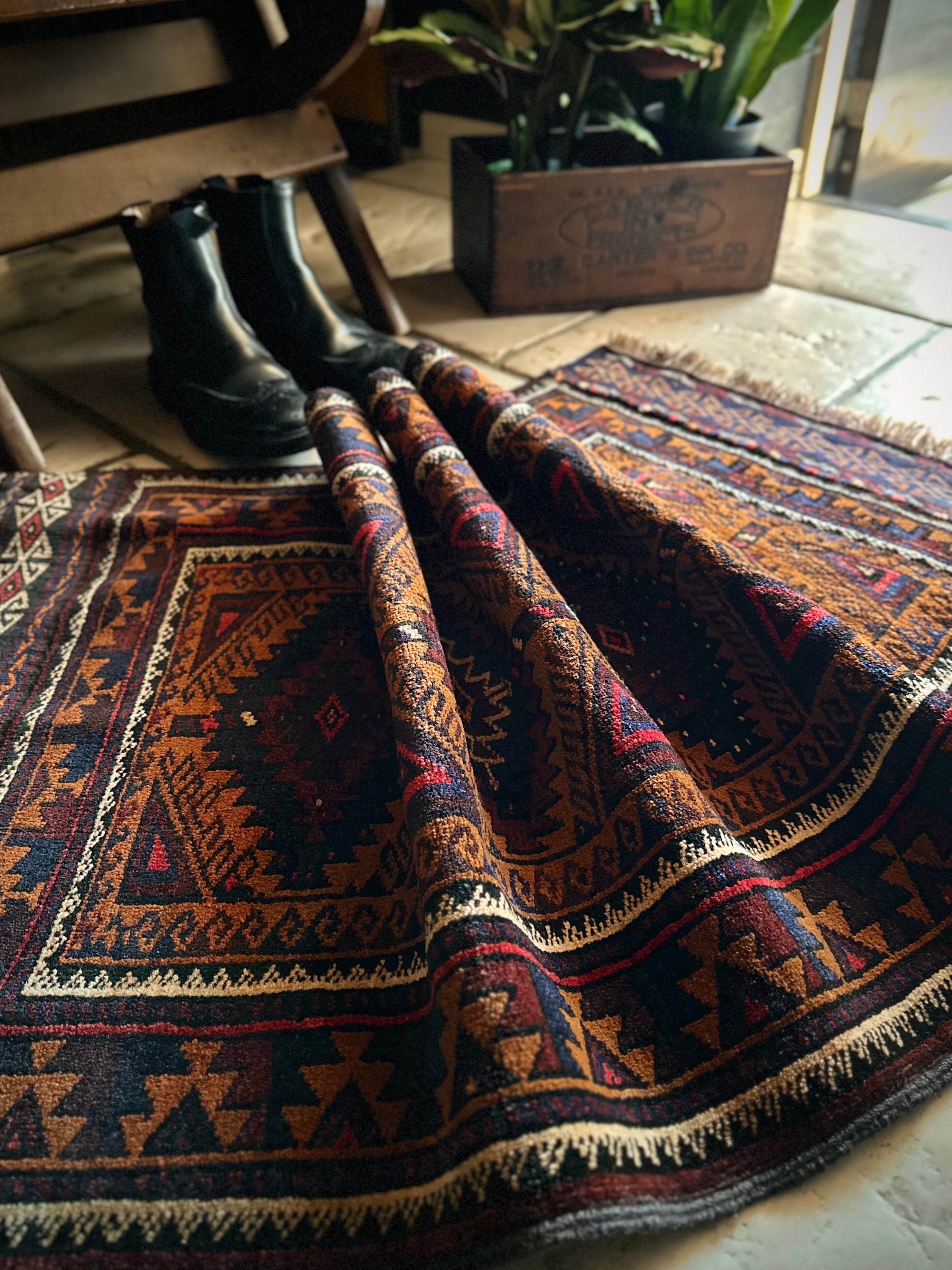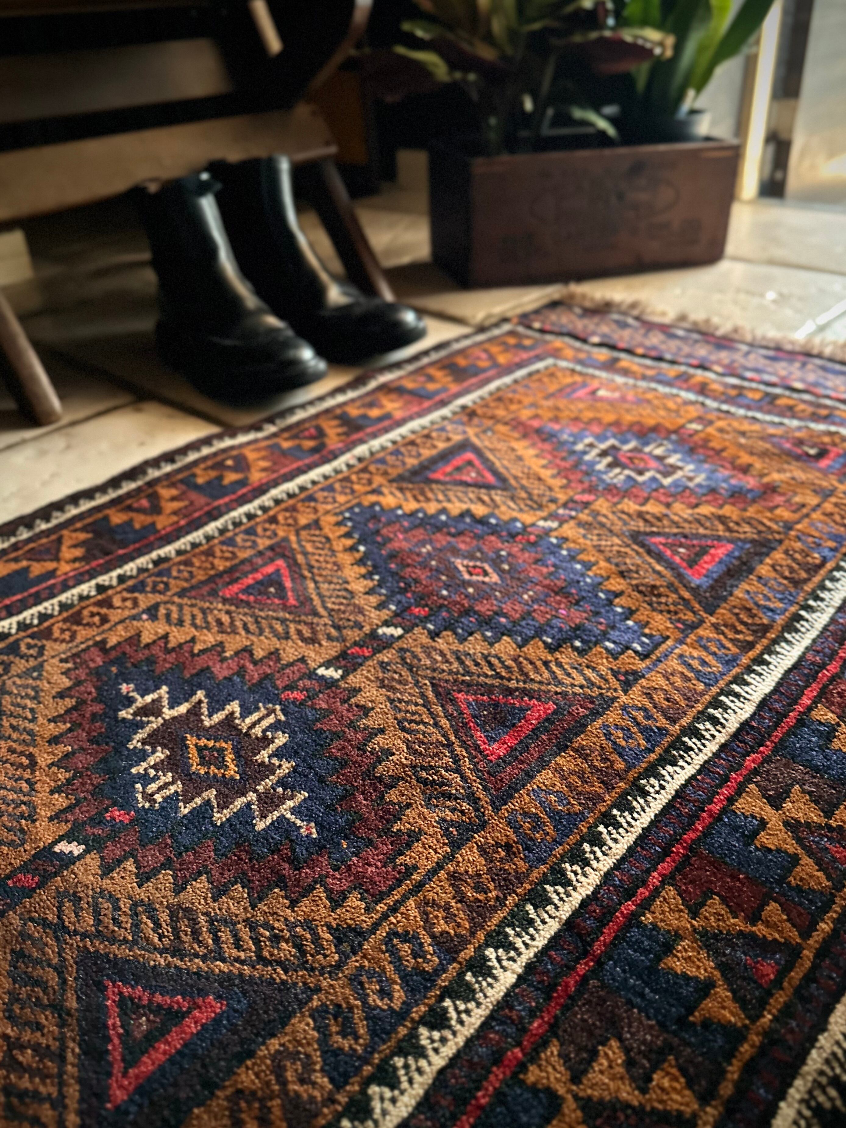 最後にラグそのものに関しては羊毛特有の匂いがあり、採寸は中央付近で計測していますが、手織りならではの歪みによる誤差や水洗いクリーニングによる縮み、また草木染めによる経年劣化の色ムラなどがありますが、それもまたヴィンテージラグの魅力かとご理解ください。