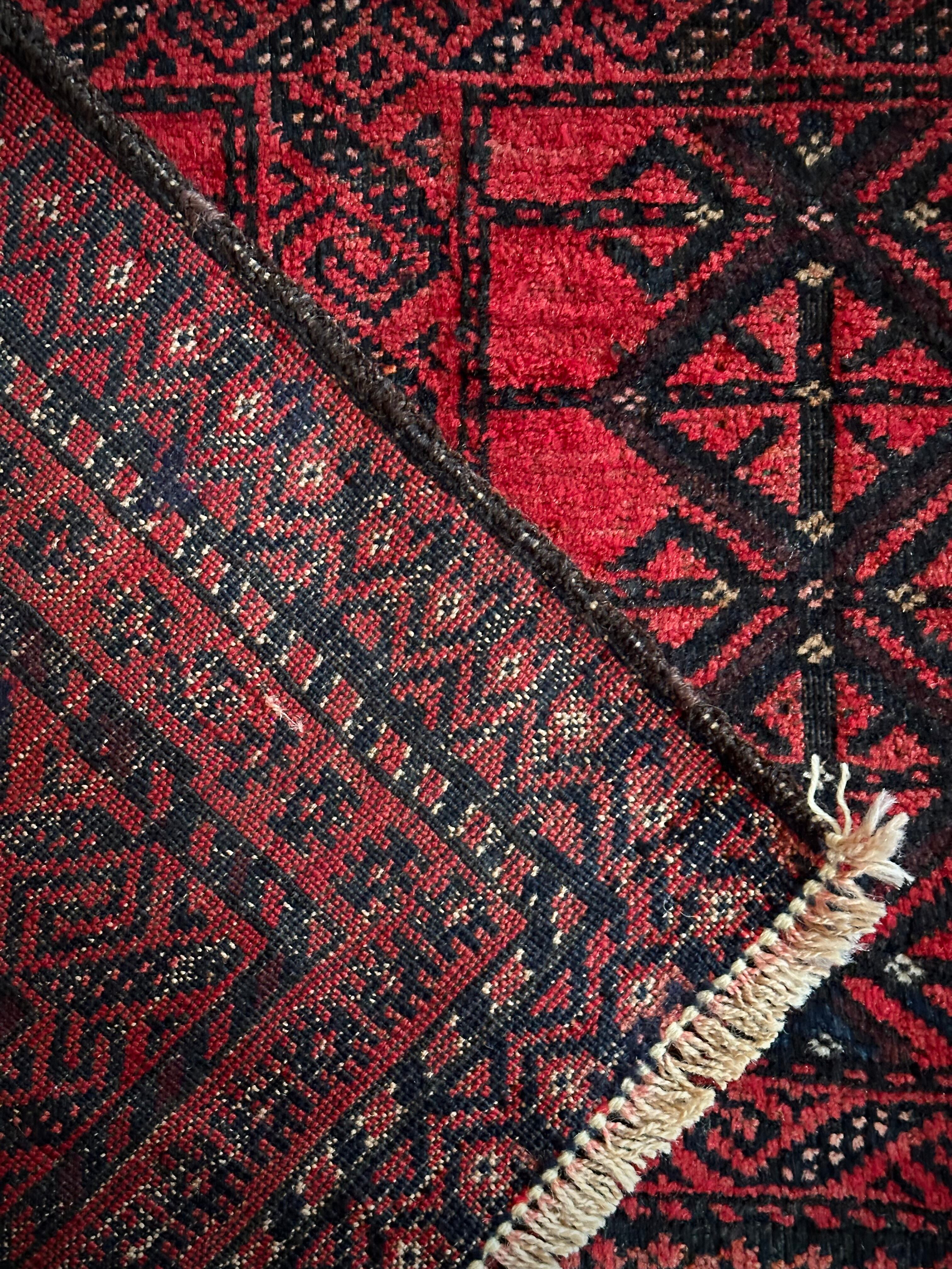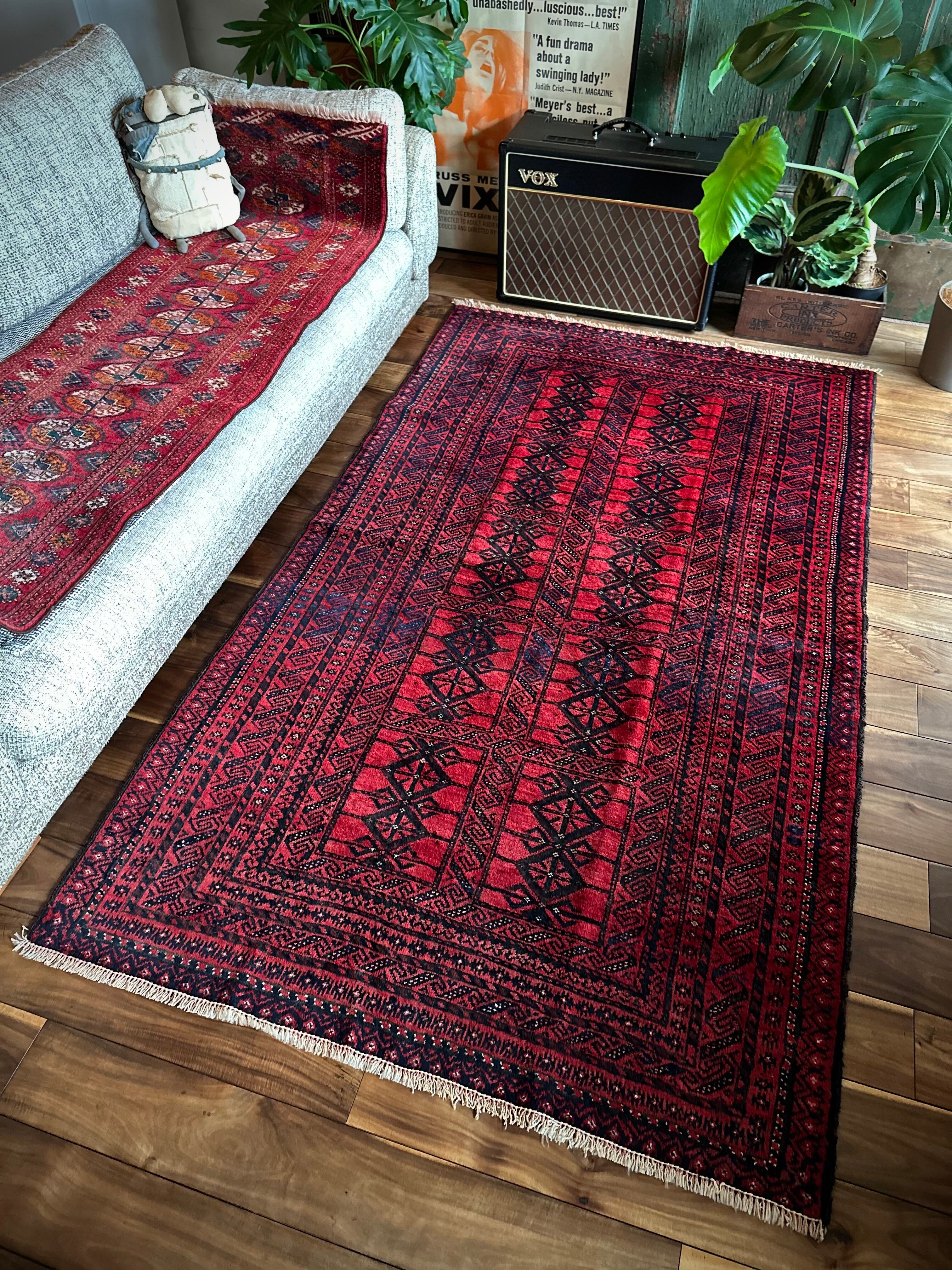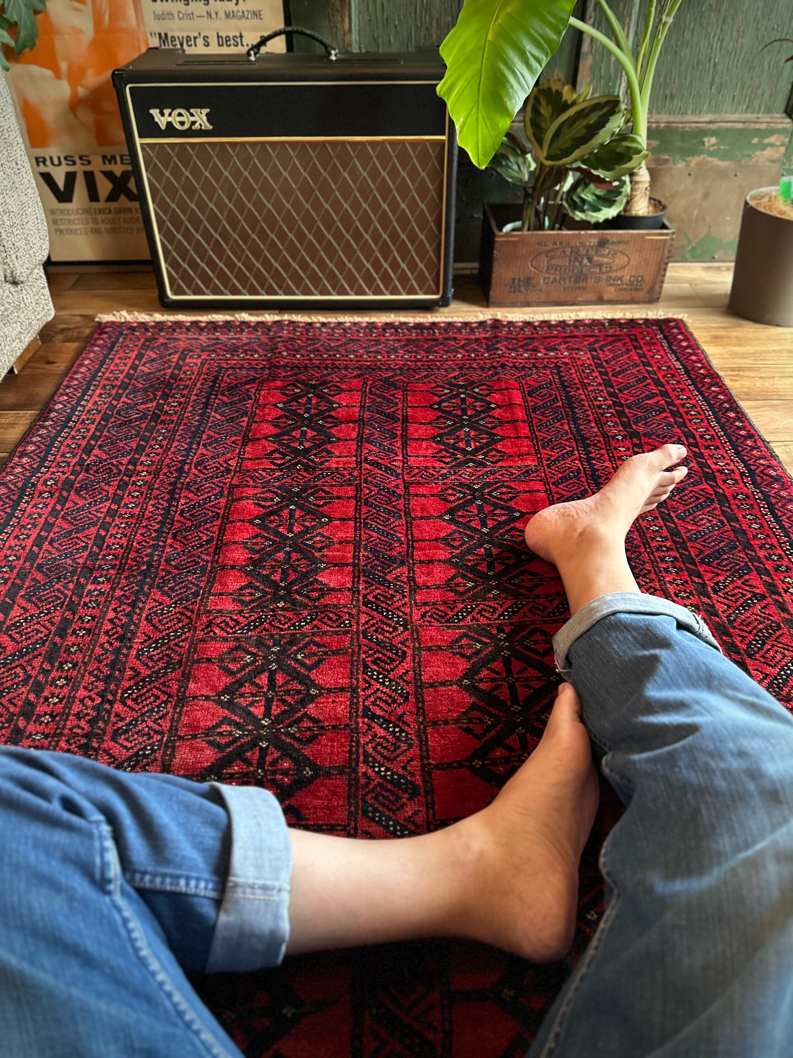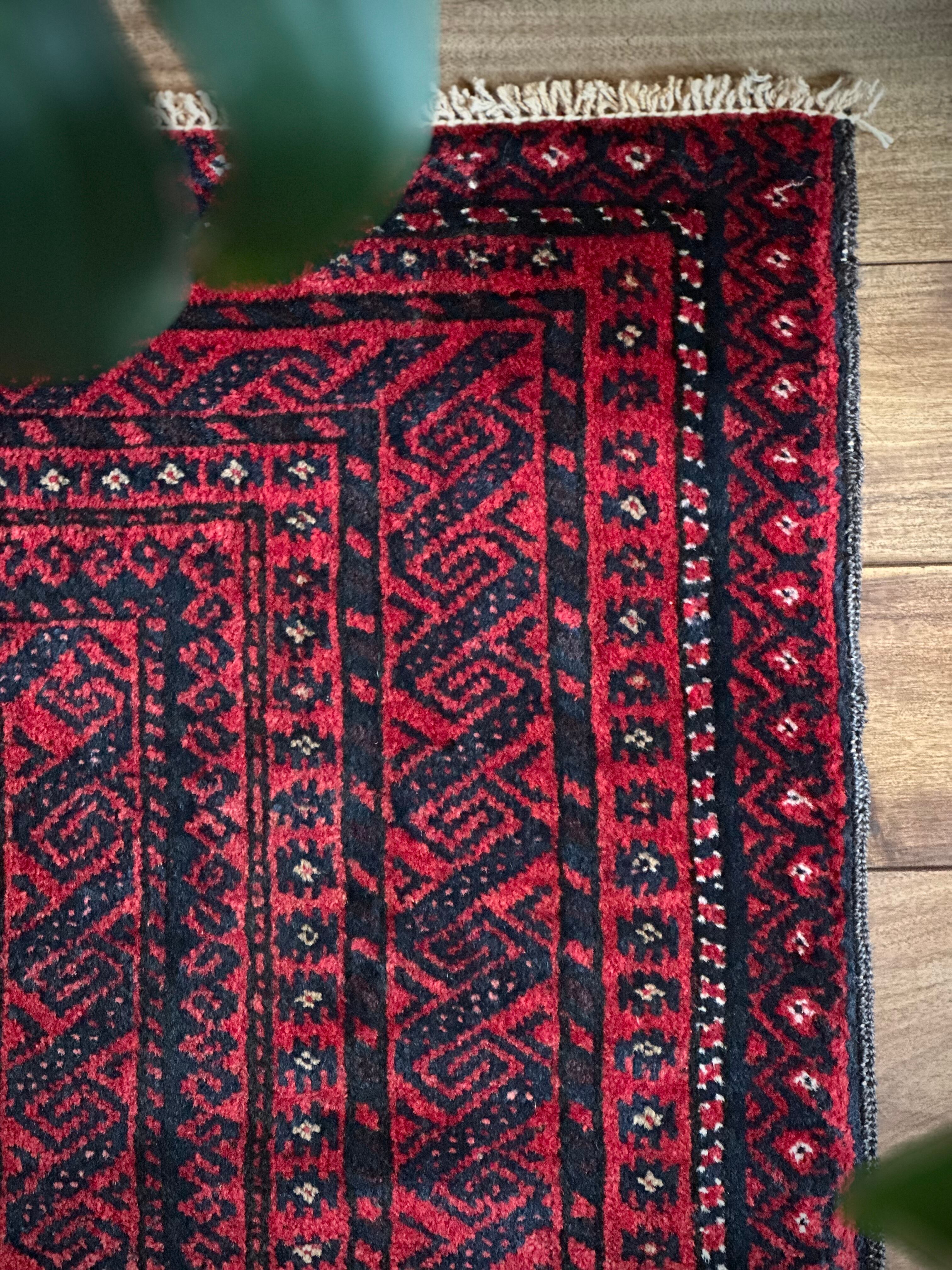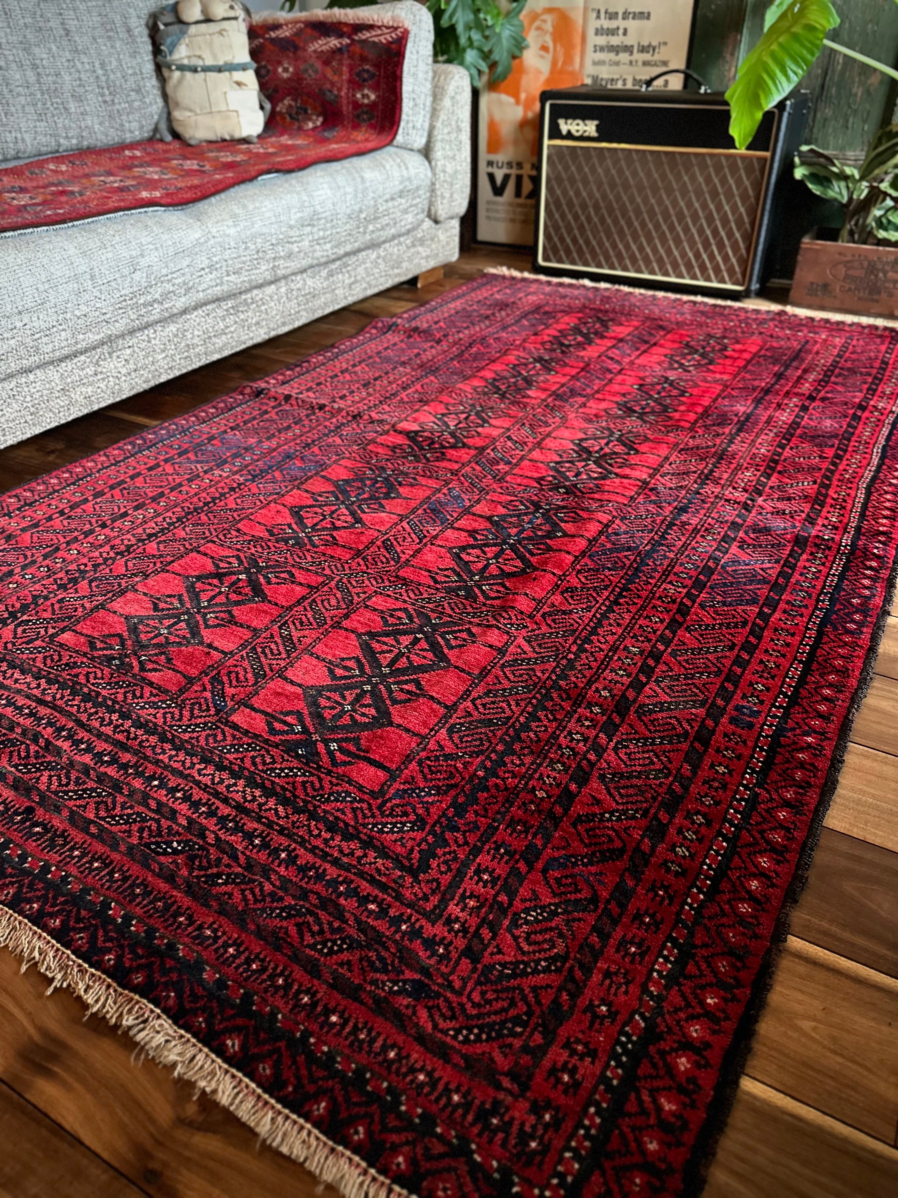 真っ赤な艶めかしい表情にブラックとネイビーが合わさり、全体的な経年劣化による色褪せ具合がかっこいい、アフガニスタンはヘラート州で手織りされたバルーチ族のトライバルラグで、ポイントとしてのホワイトバランスが上手く表現された1枚になります。
