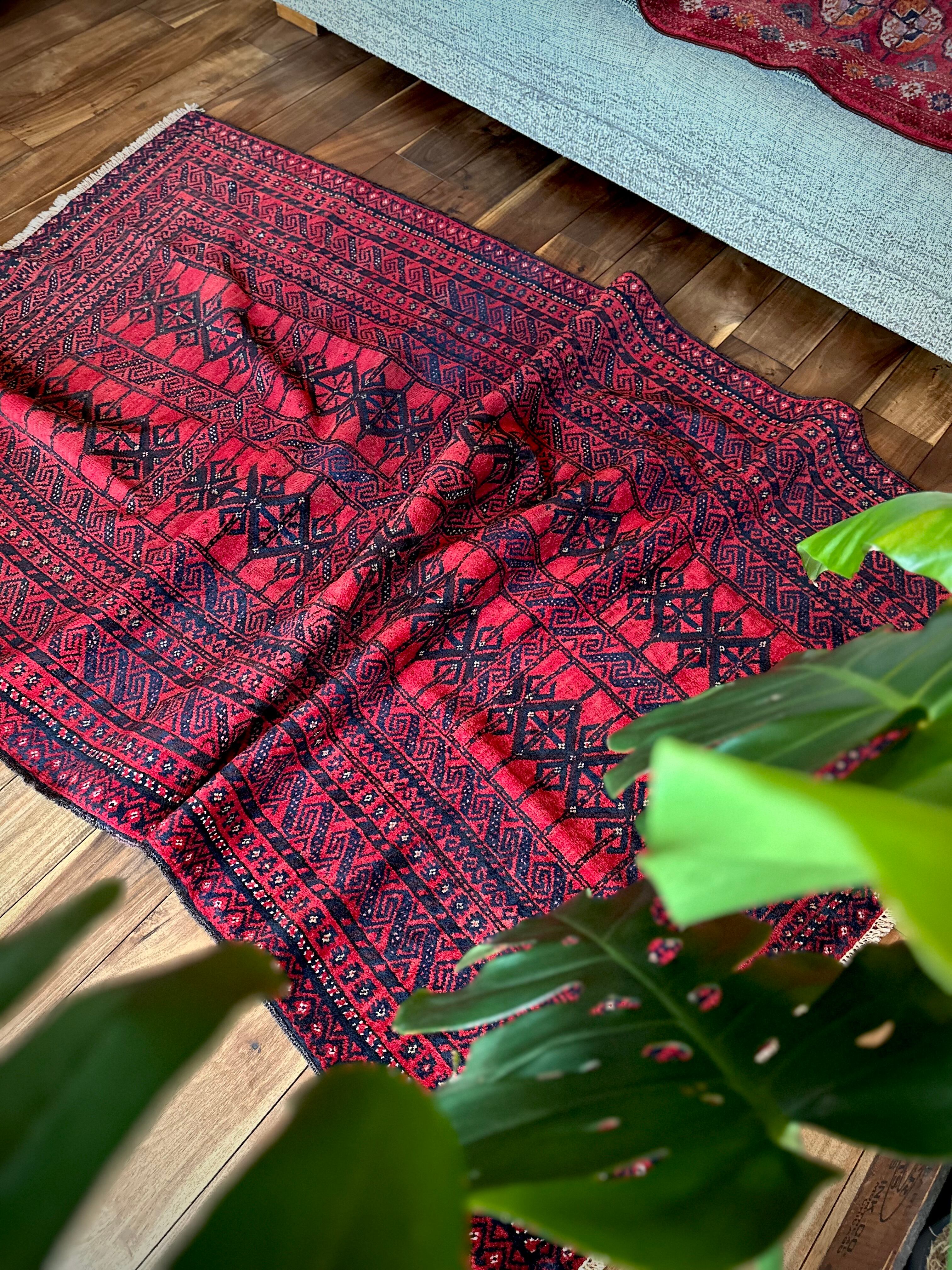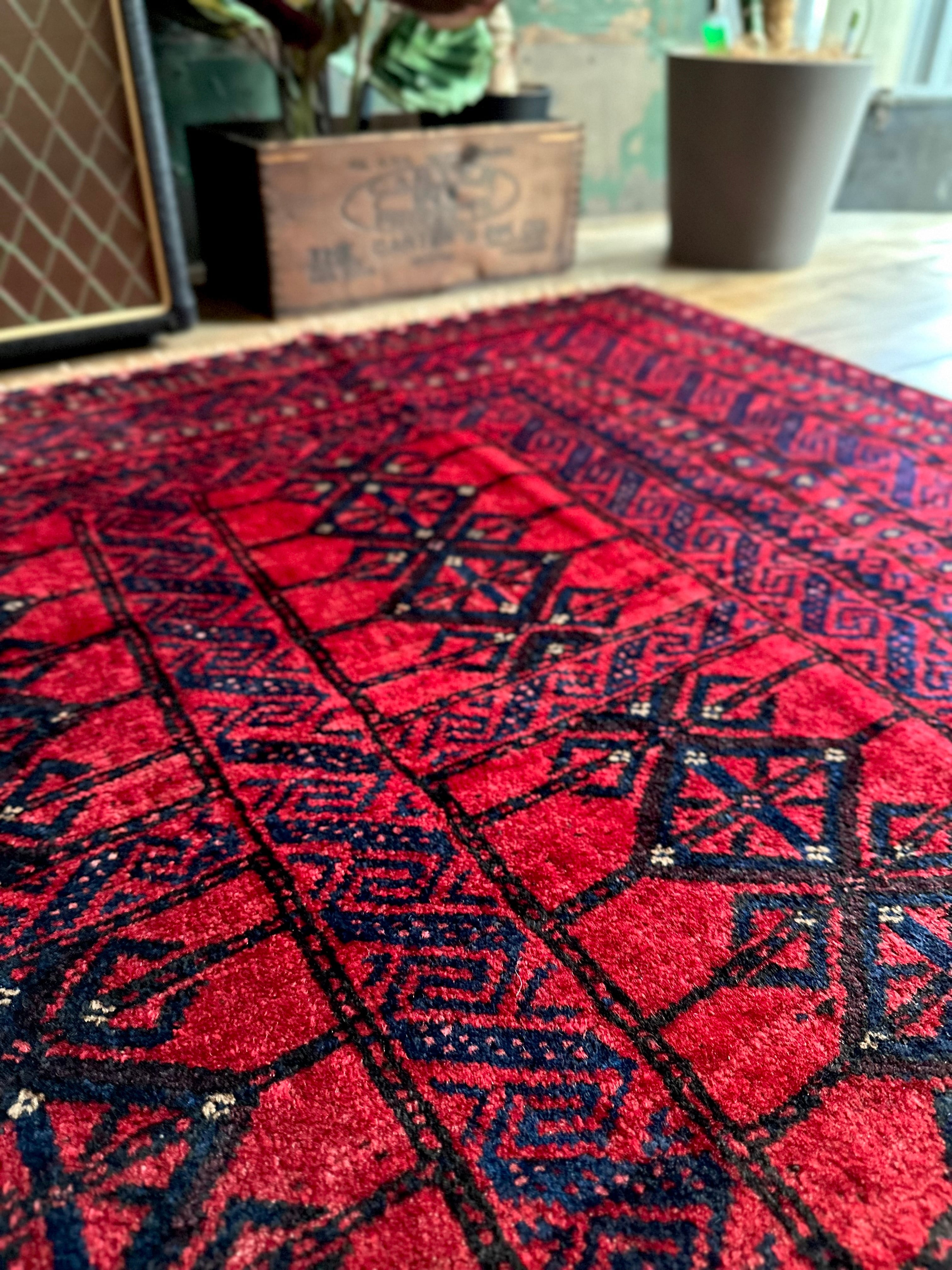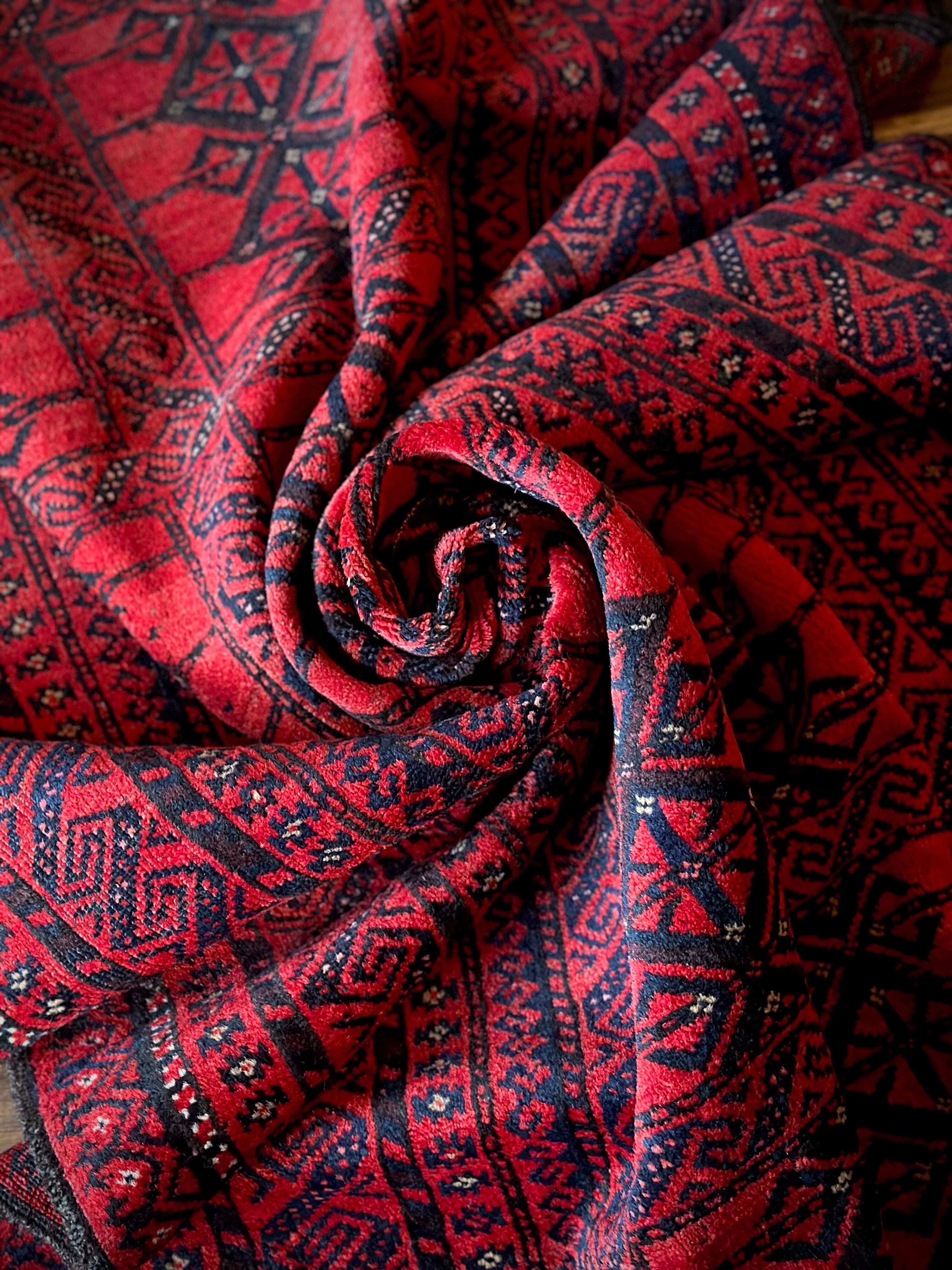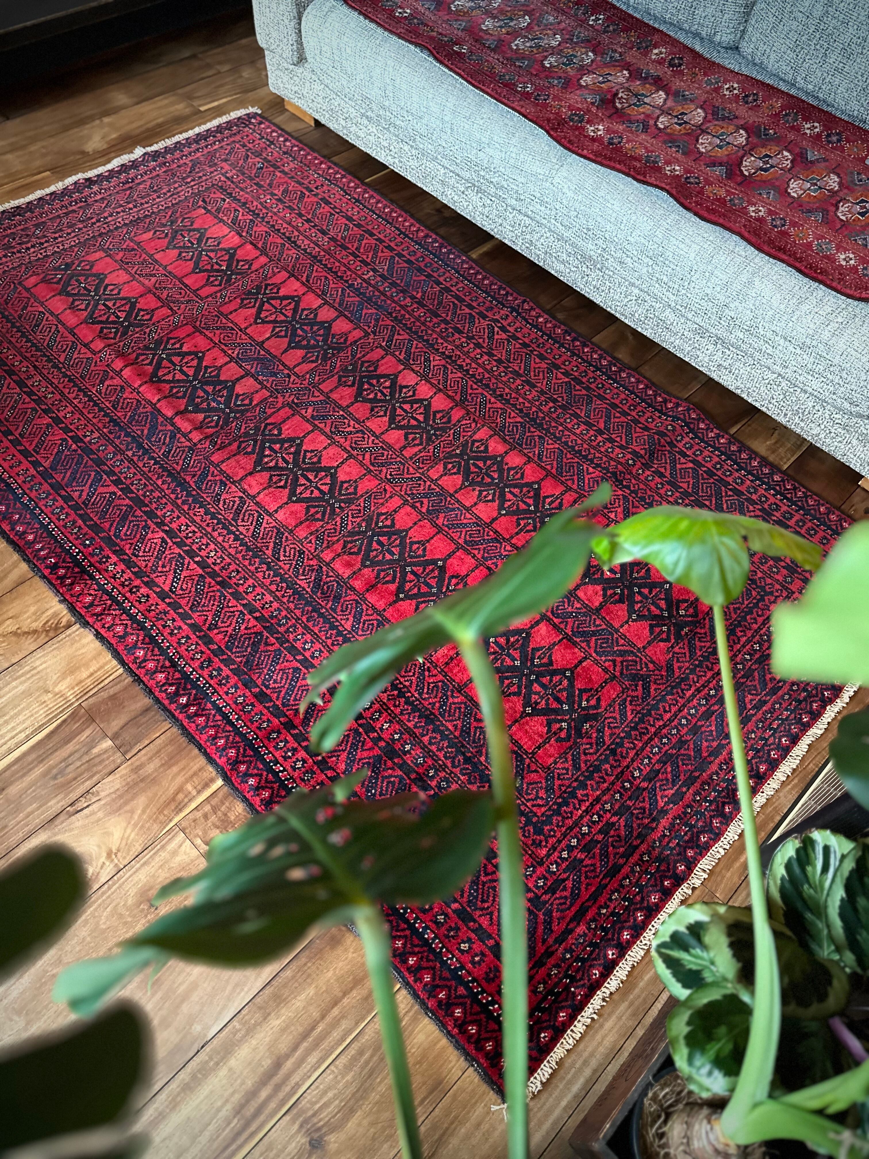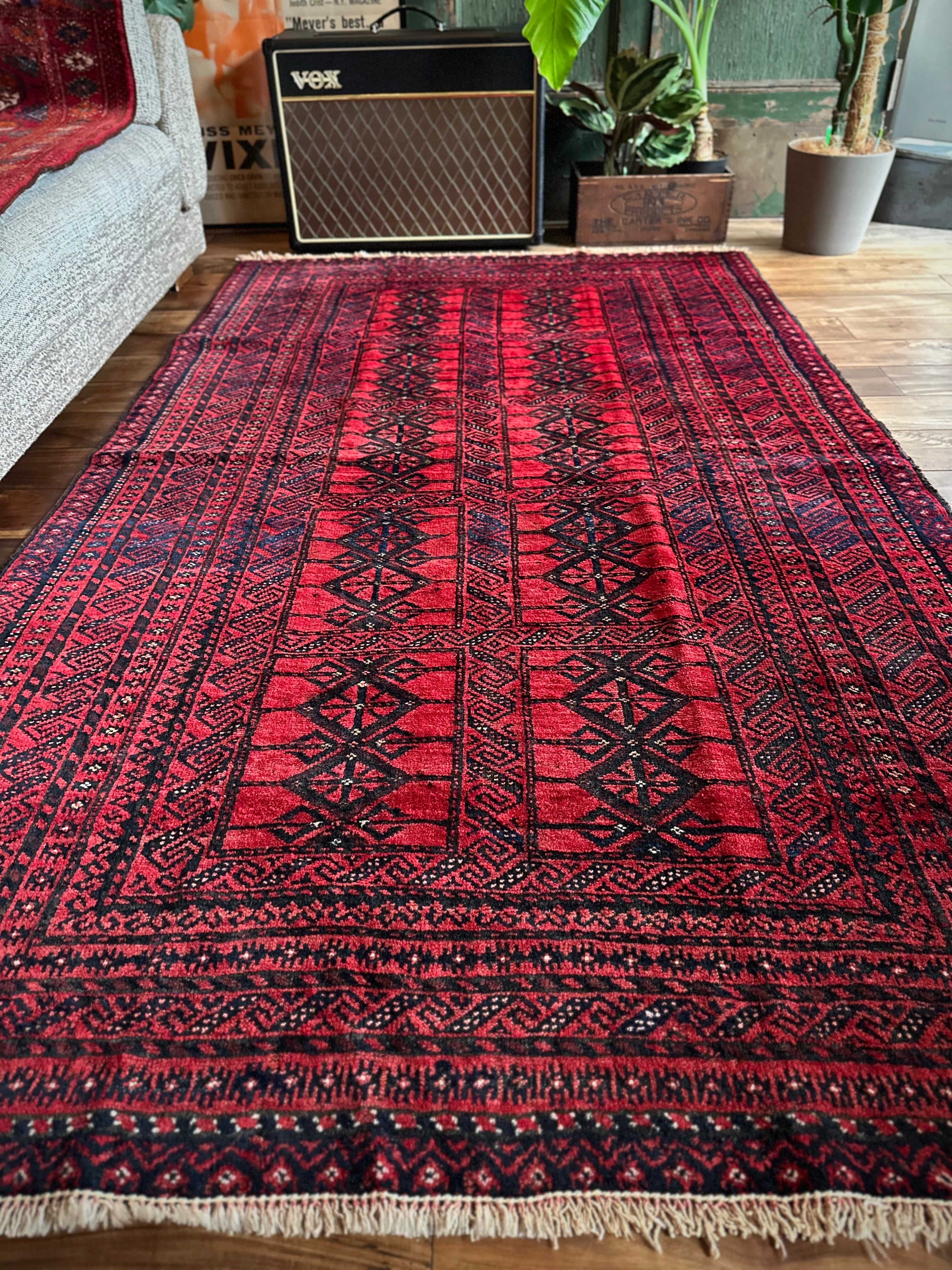 真っ赤な艶めかしい表情にブラックとネイビーが合わさり、全体的な経年劣化による色褪せ具合がかっこいい、アフガニスタンはヘラート州で手織りされたバルーチ族のトライバルラグで、ポイントとしてのホワイトバランスが上手く表現された1枚になります。