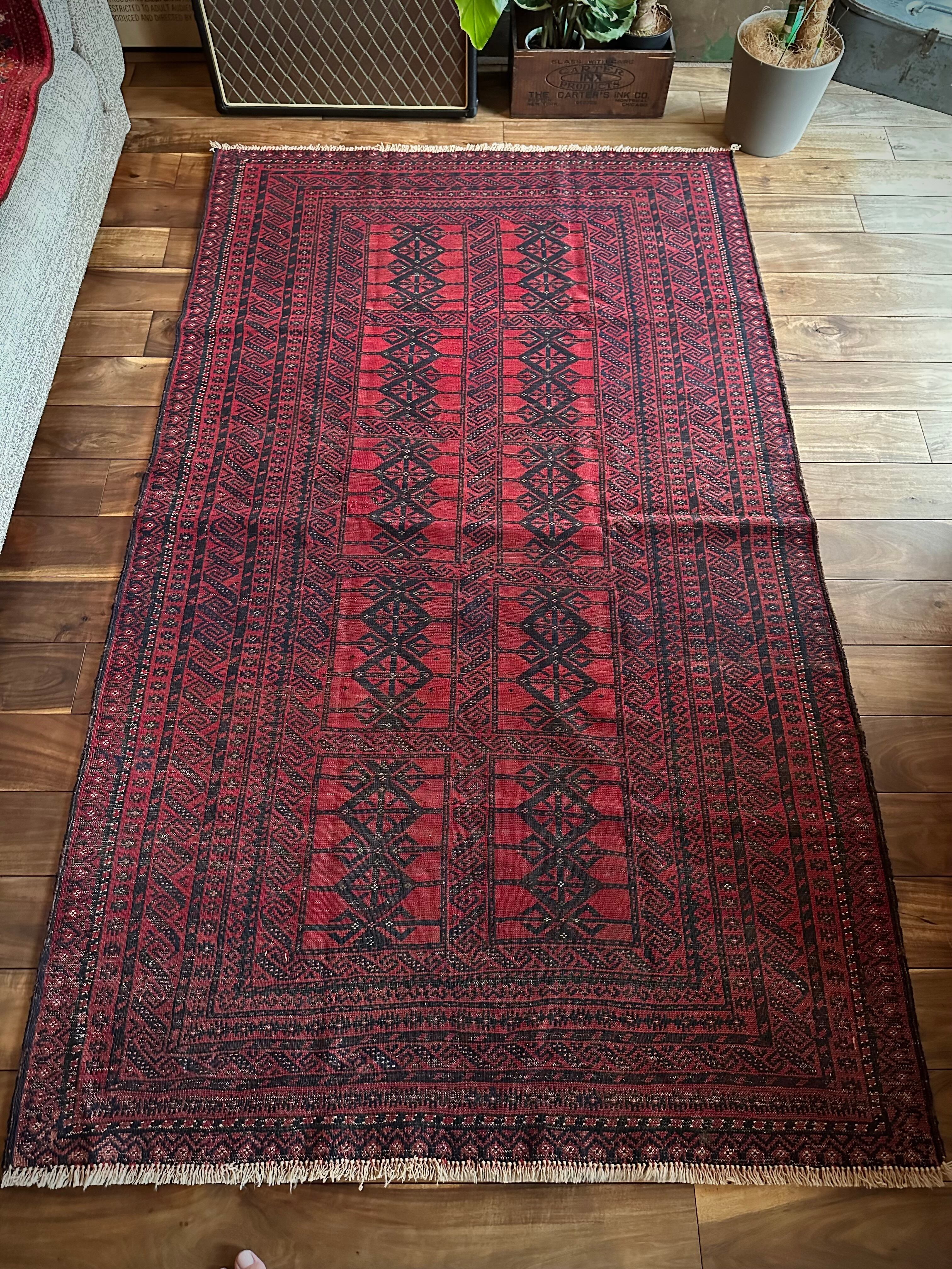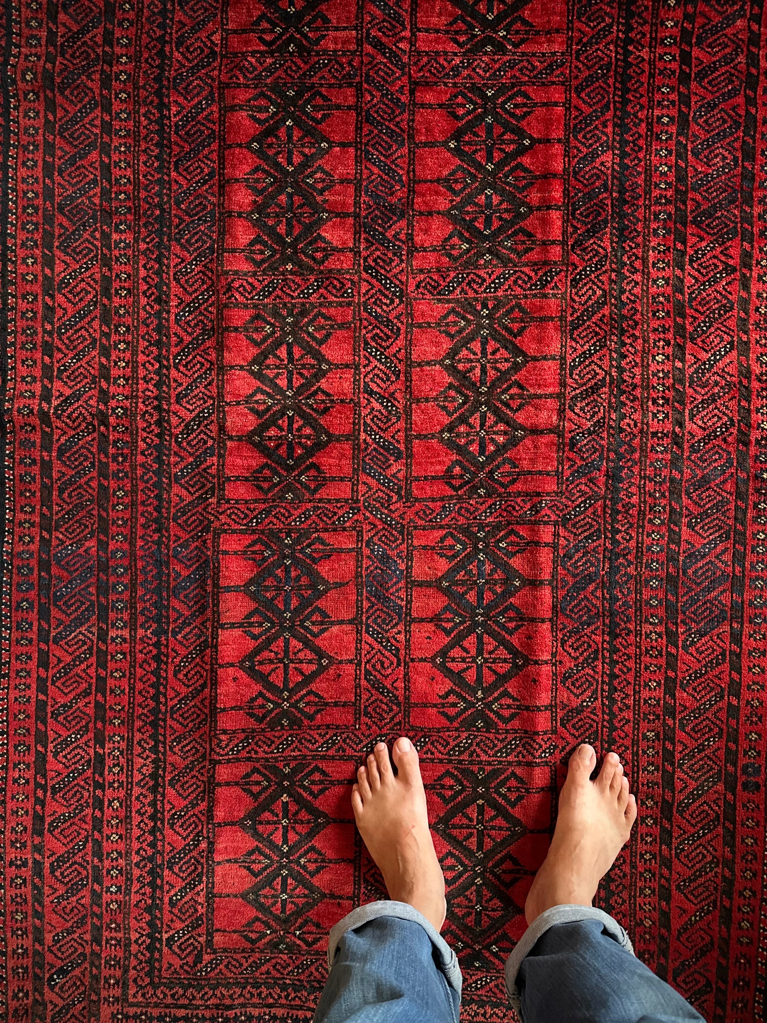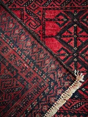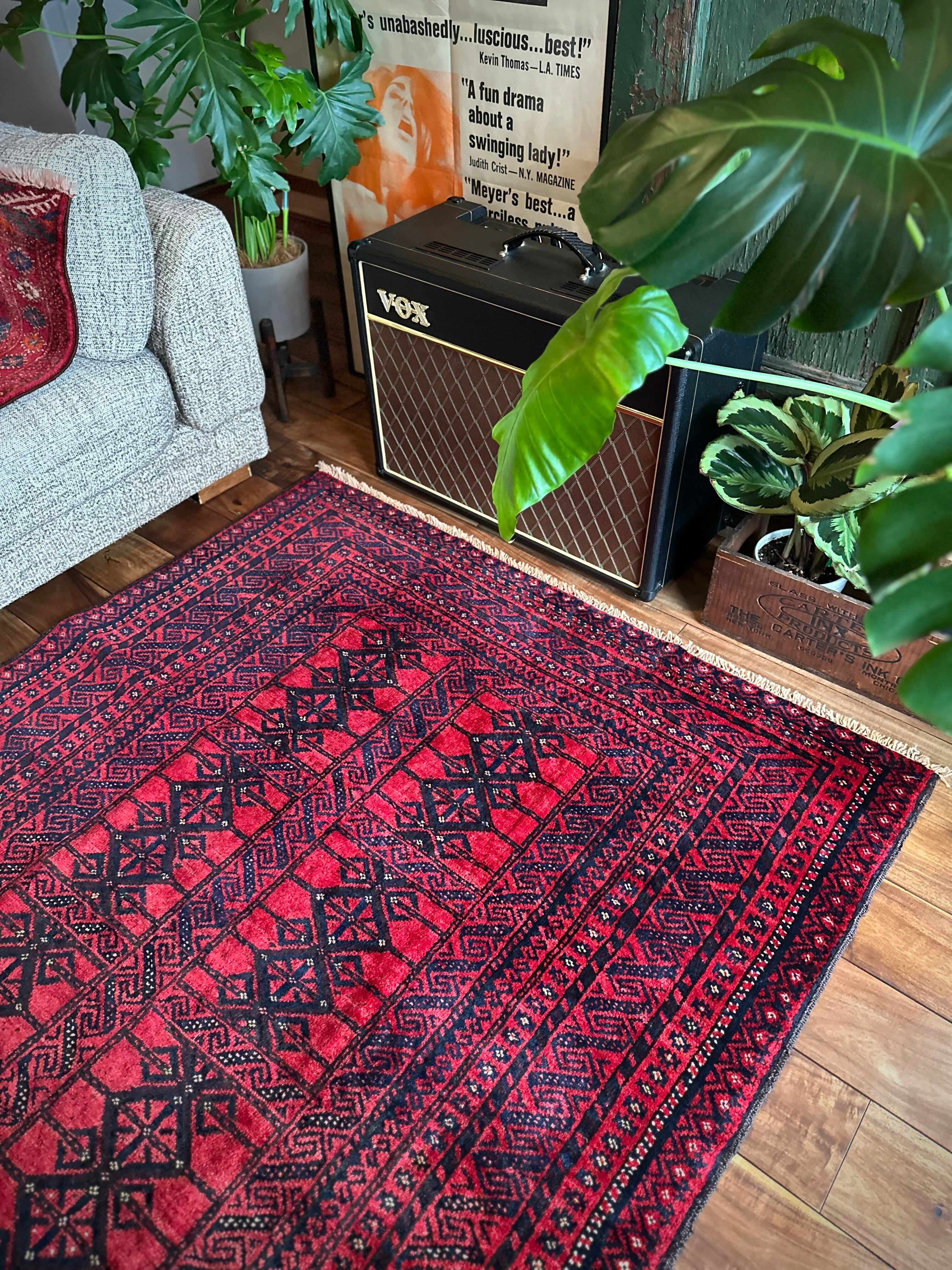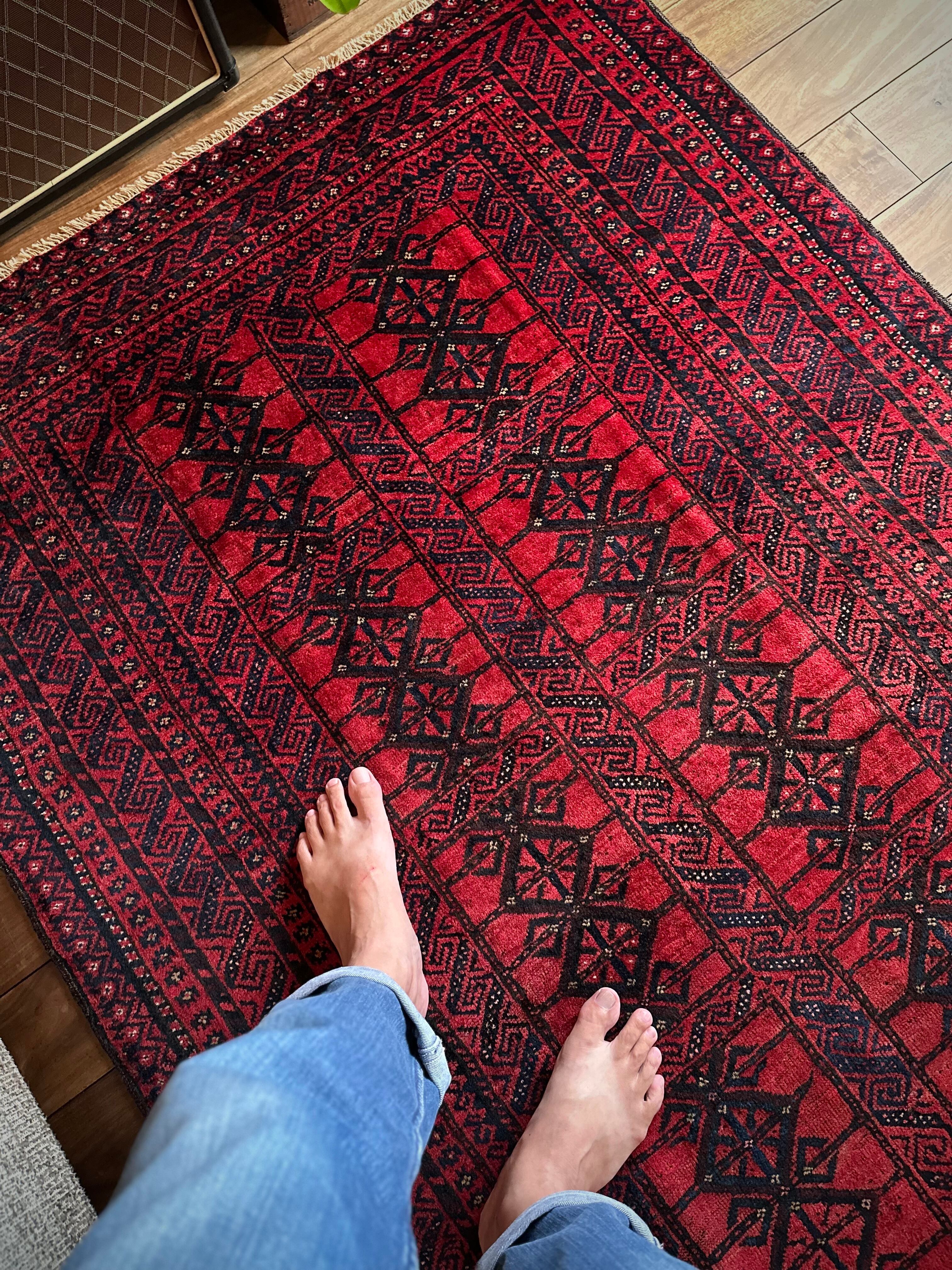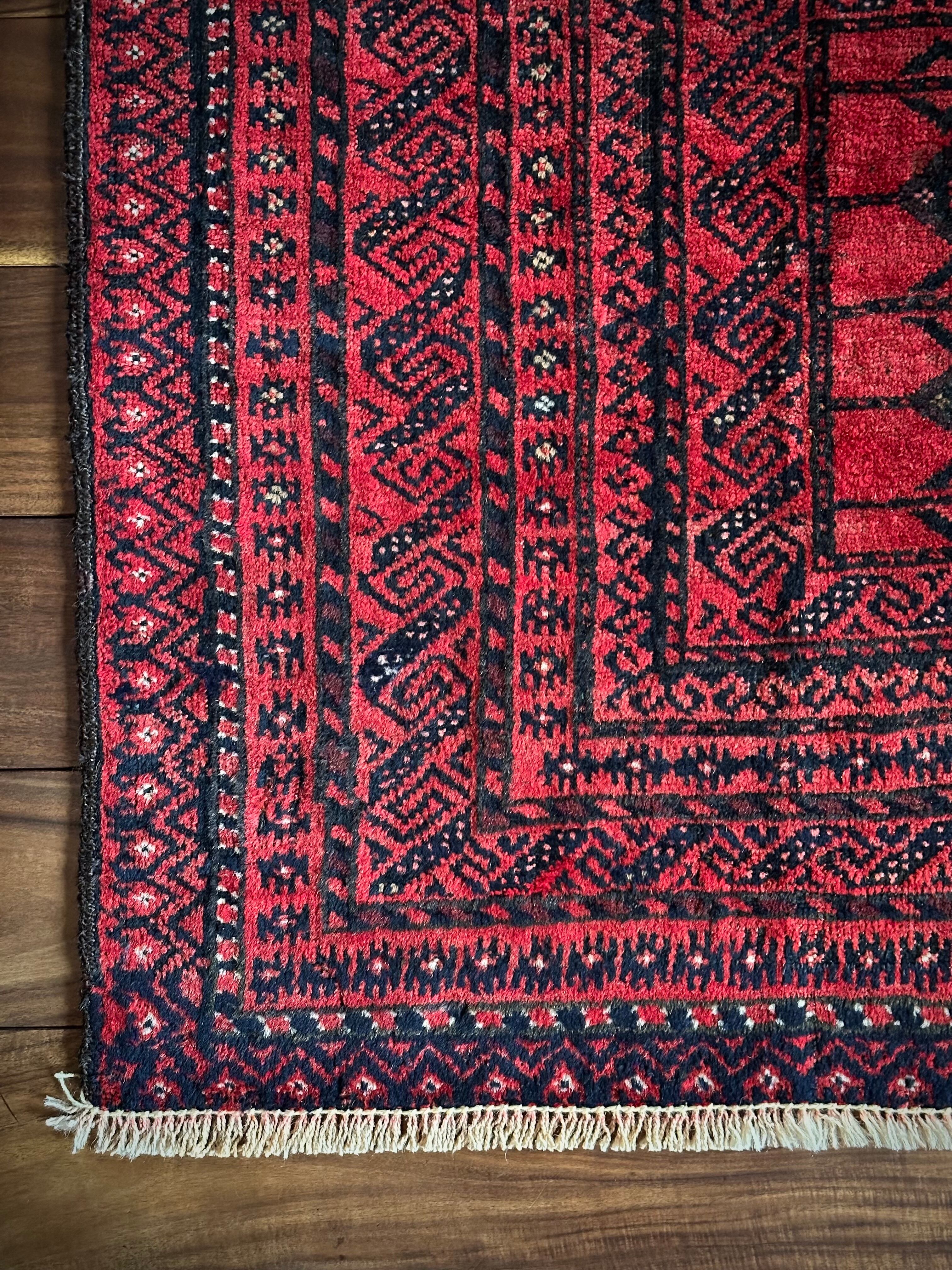 真っ赤な艶めかしい表情にブラックとネイビーが合わさり、全体的な経年劣化による色褪せ具合がかっこいい、アフガニスタンはヘラート州で手織りされたバルーチ族のトライバルラグで、ポイントとしてのホワイトバランスが上手く表現された1枚になります。