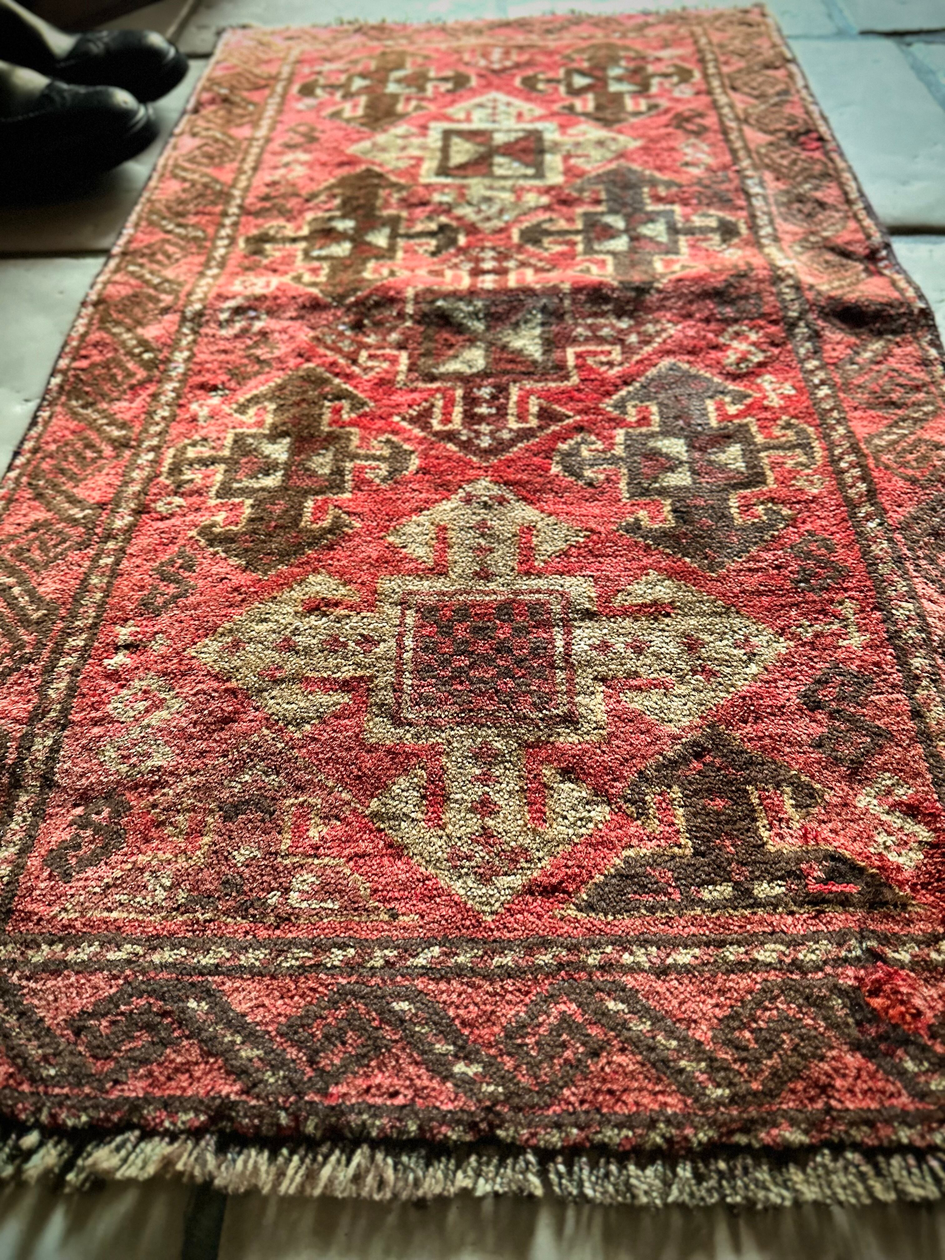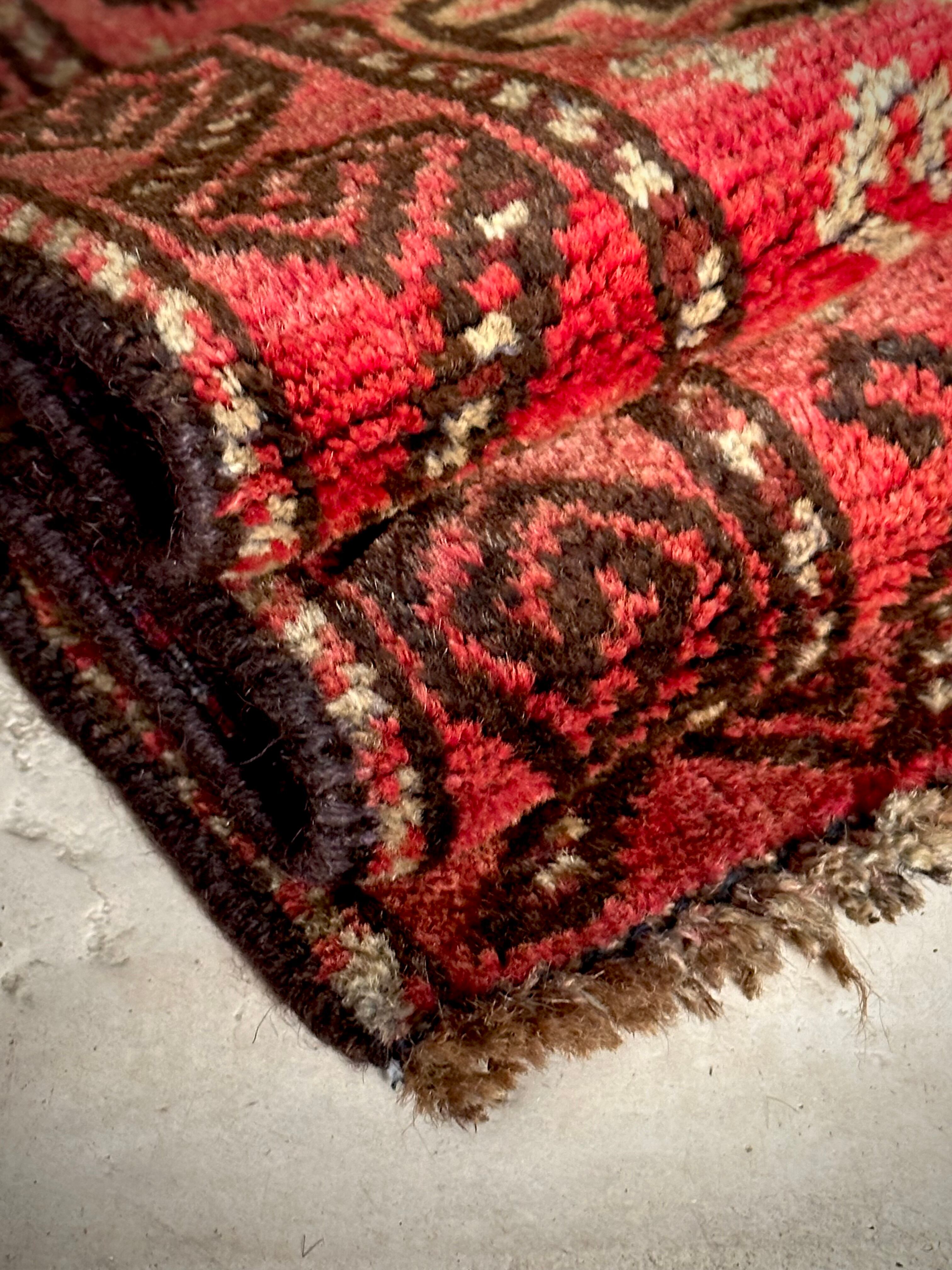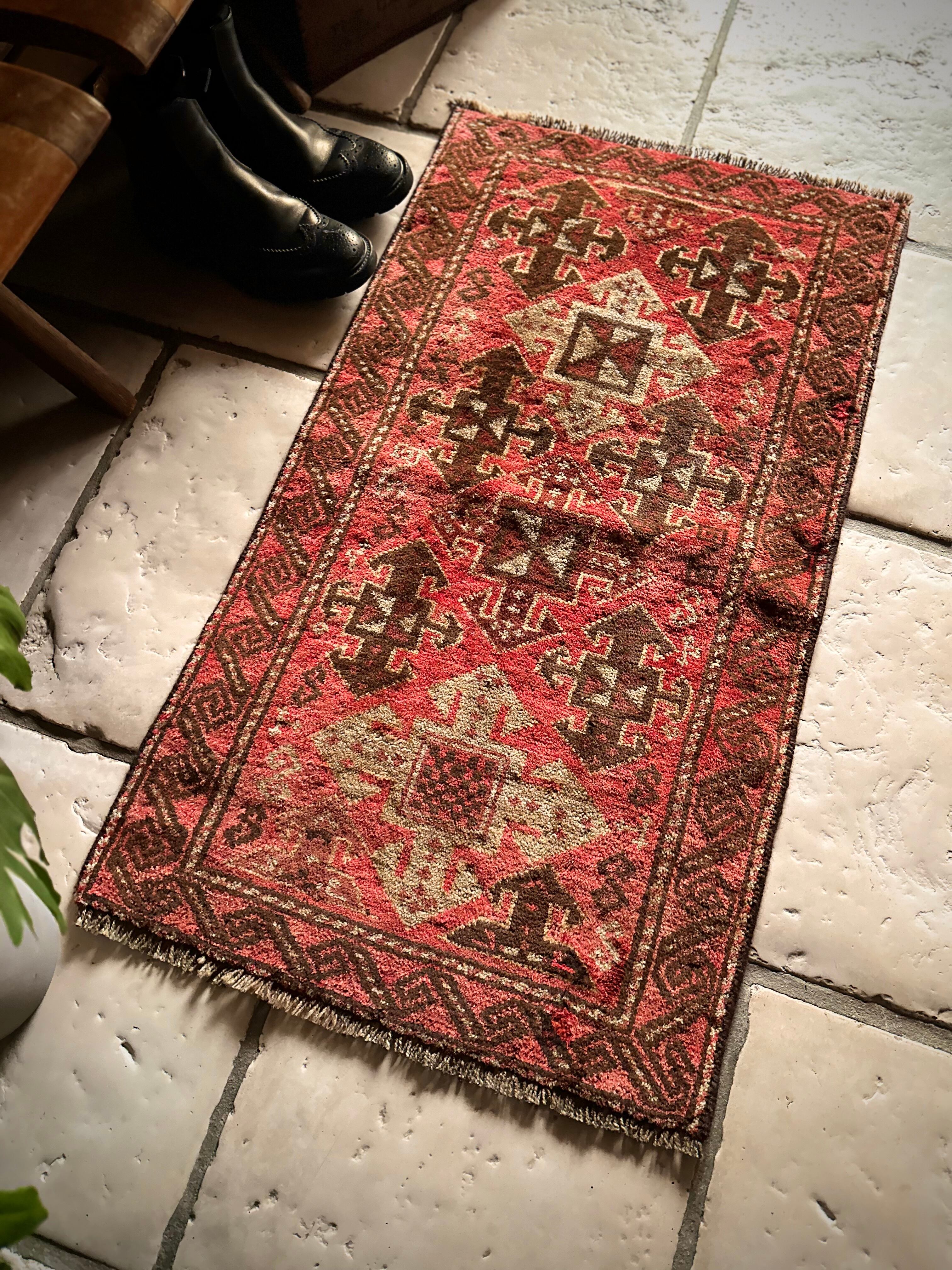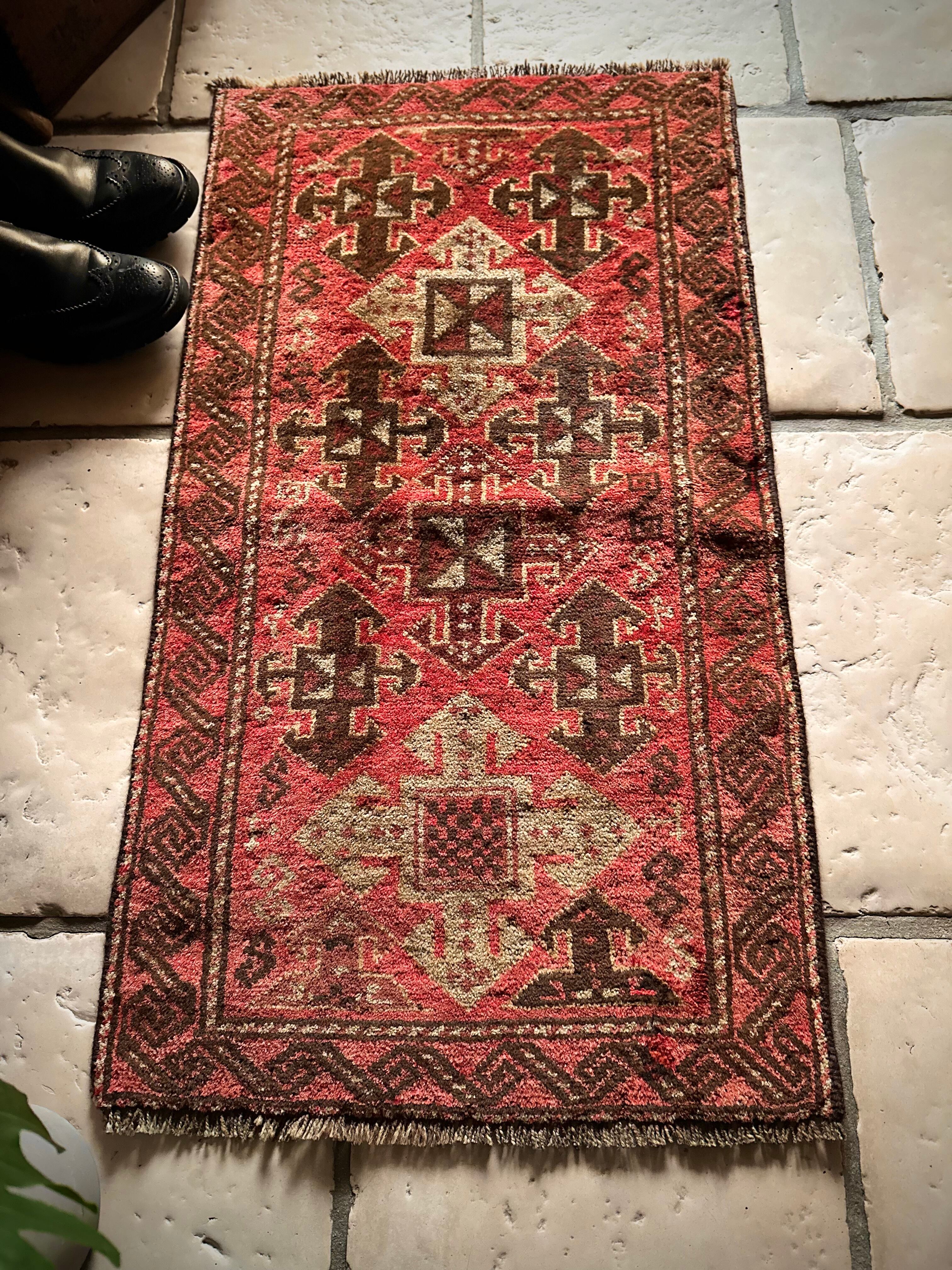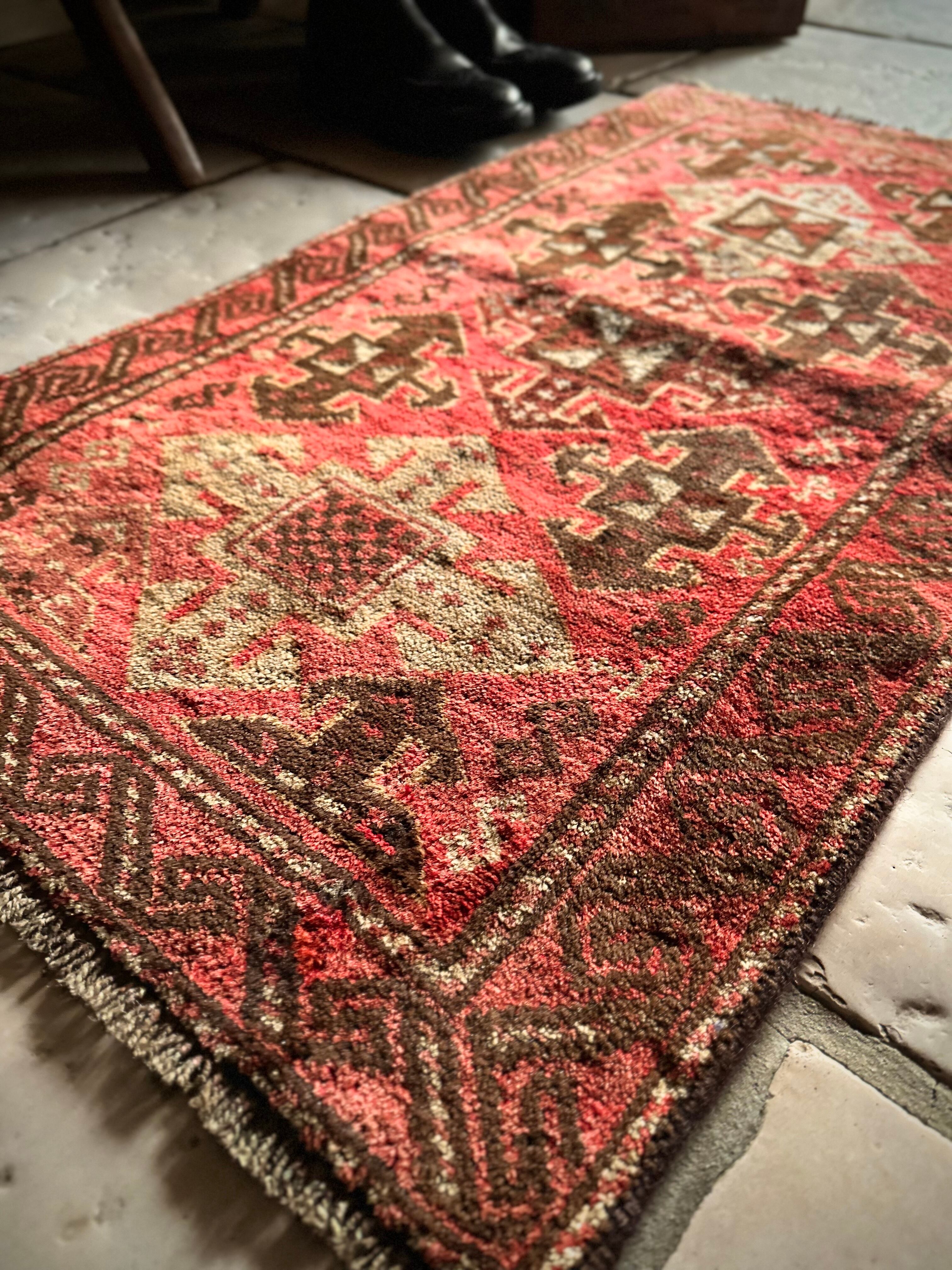 くすんだ赤をベースにべージュやバーガンディと全体的な色褪せ具合がプリミティブ感満載の、アフガニスタンはヘラート州に居住するバルーチ族のトライバルラグで、元々はクッションとしと使用したり、家財道具などを収納するバーリシトと呼ばれる袋状の表皮のみをラグに仕立て直してもらったモノになります。