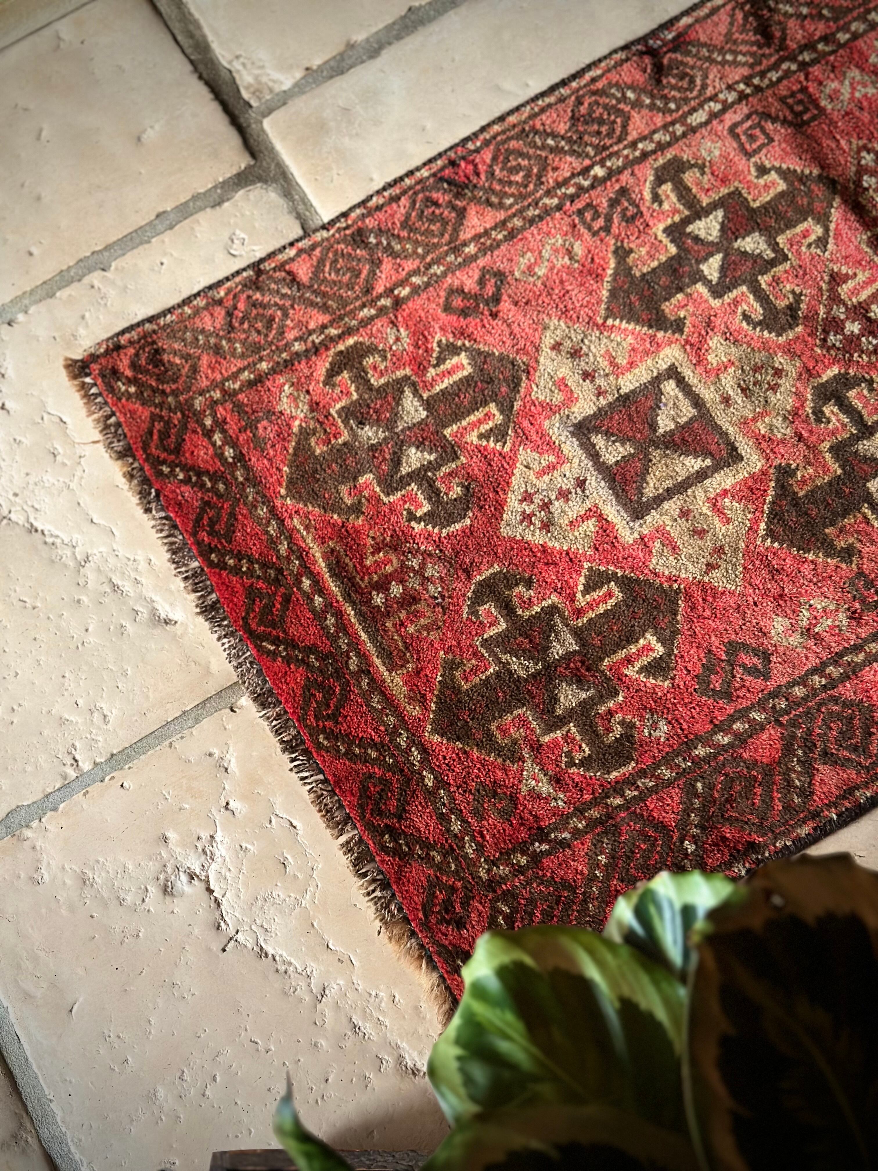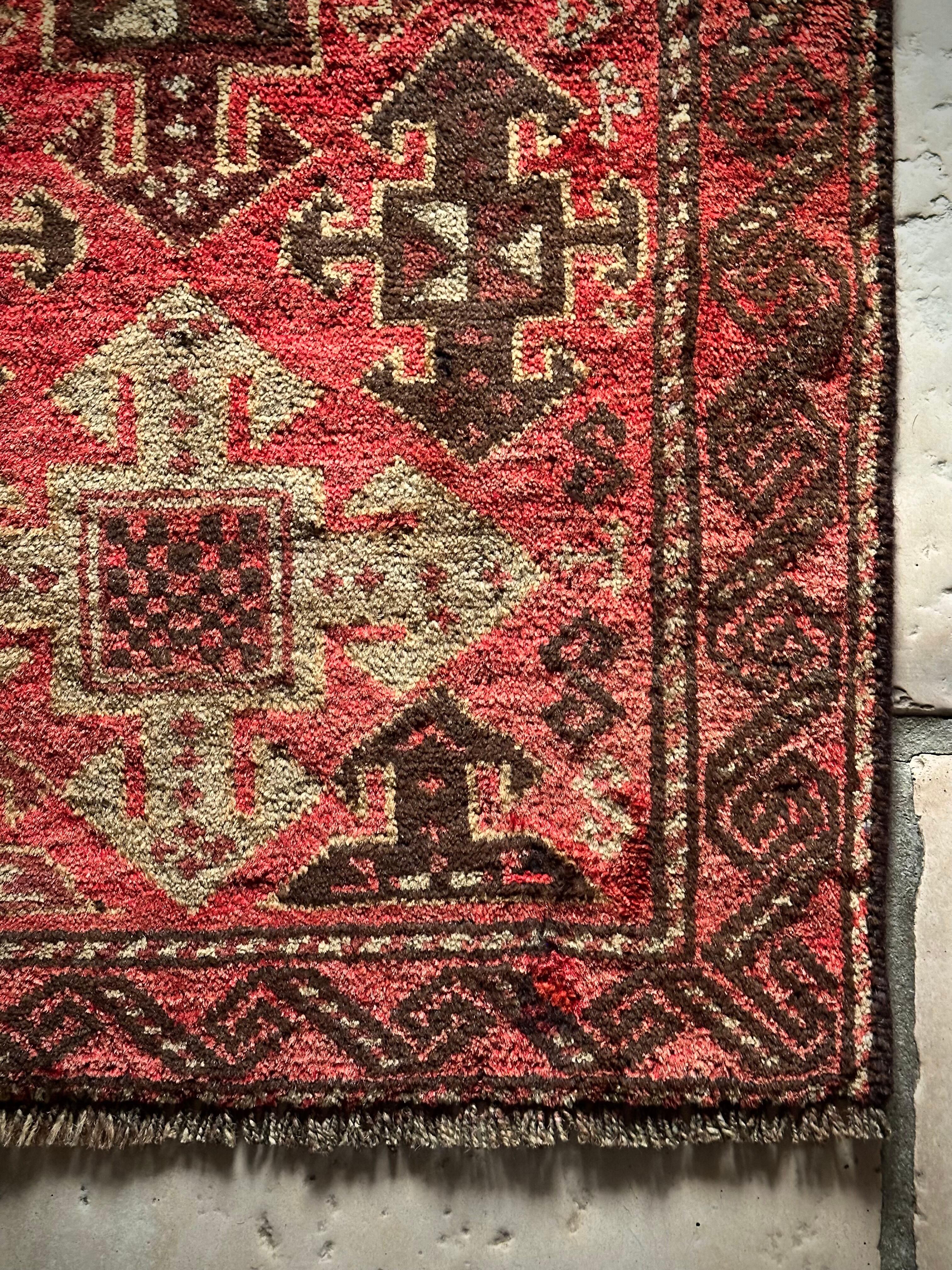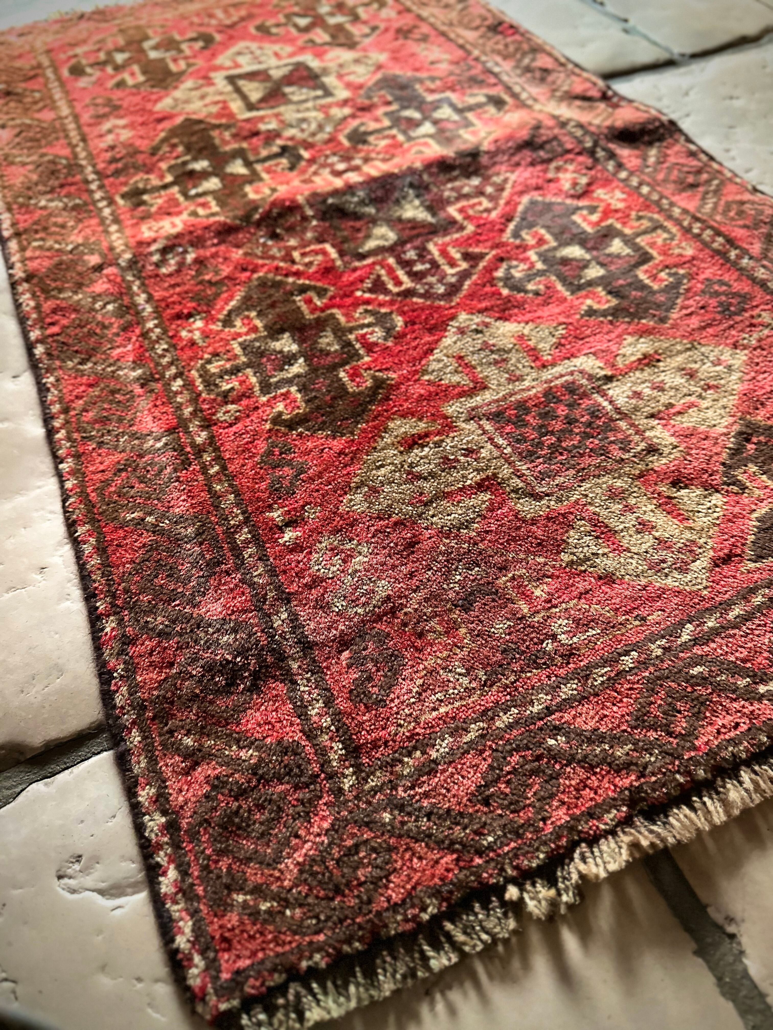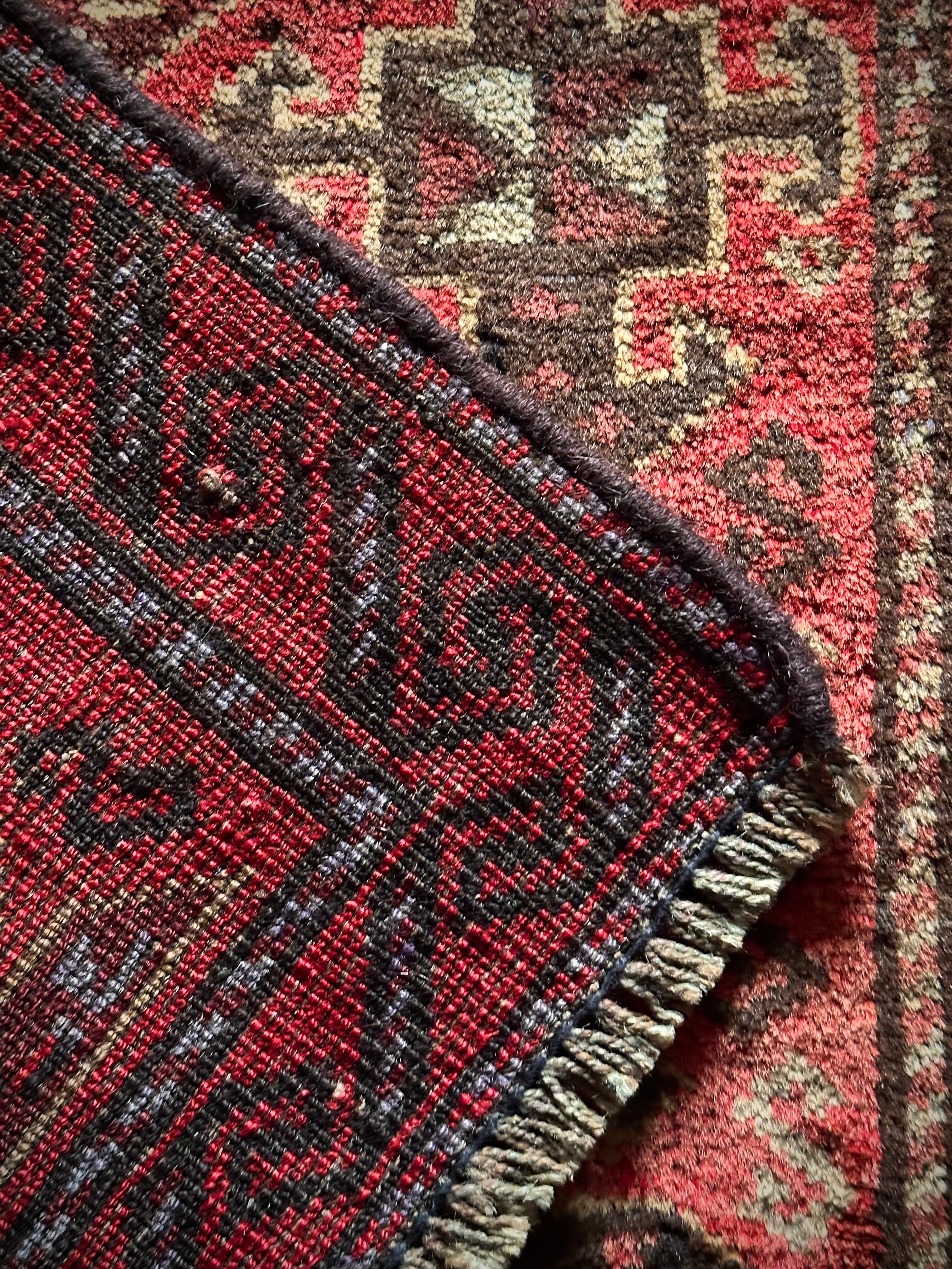 くすんだ赤をベースにべージュやバーガンディと全体的な色褪せ具合がプリミティブ感満載の、アフガニスタンはヘラート州に居住するバルーチ族のトライバルラグで、元々はクッションとしと使用したり、家財道具などを収納するバーリシトと呼ばれる袋状の表皮のみをラグに仕立て直してもらったモノになります。