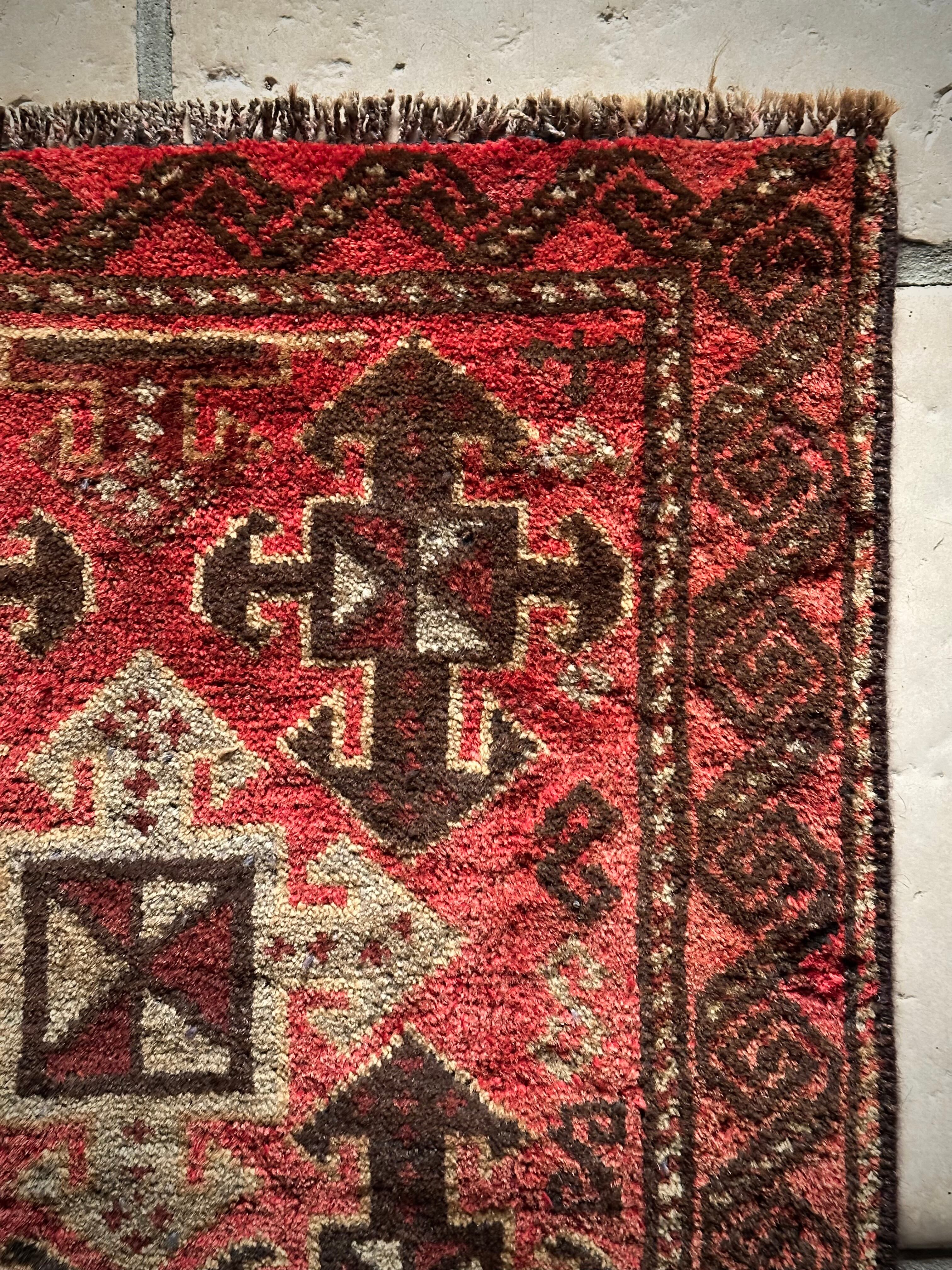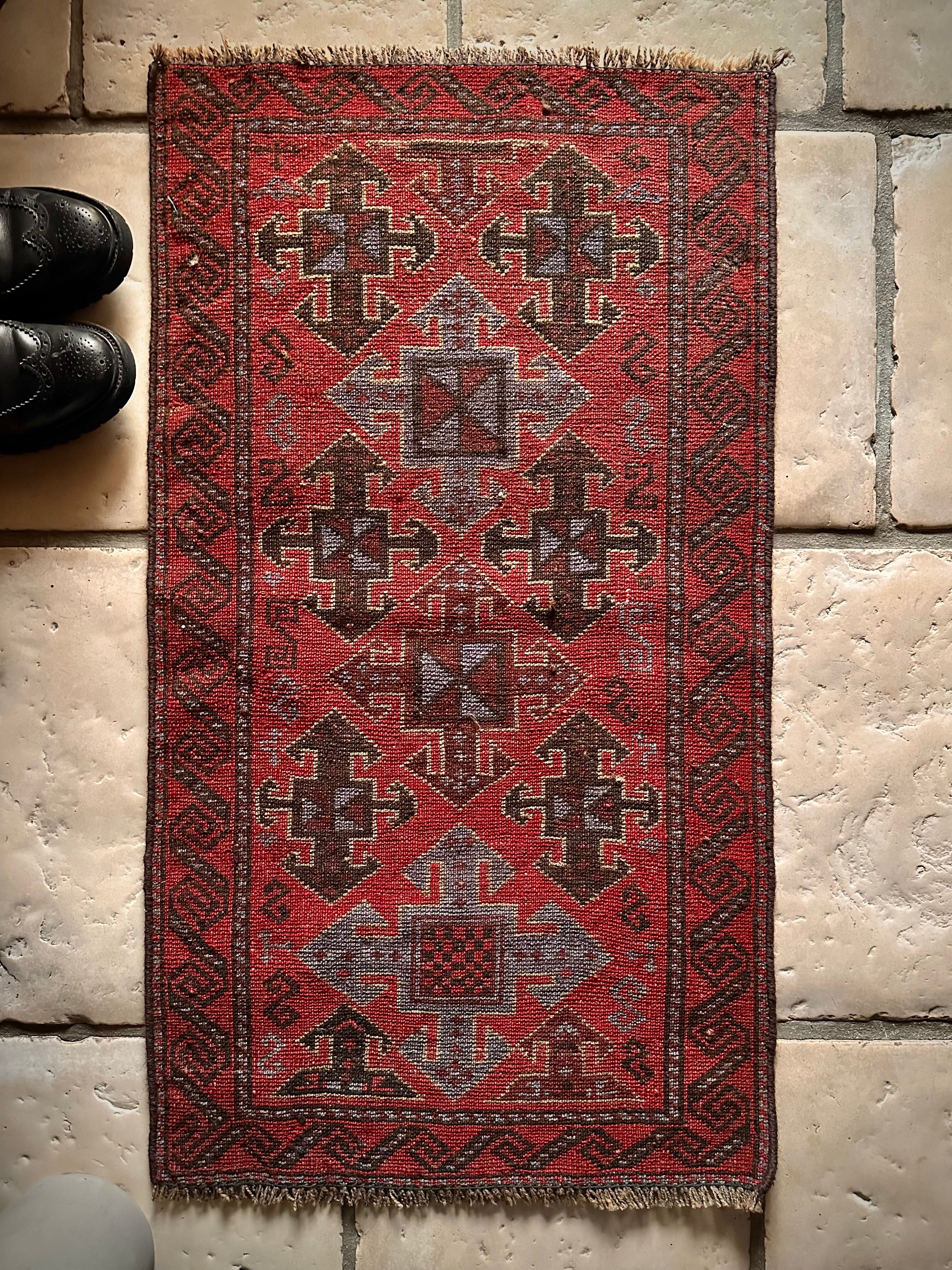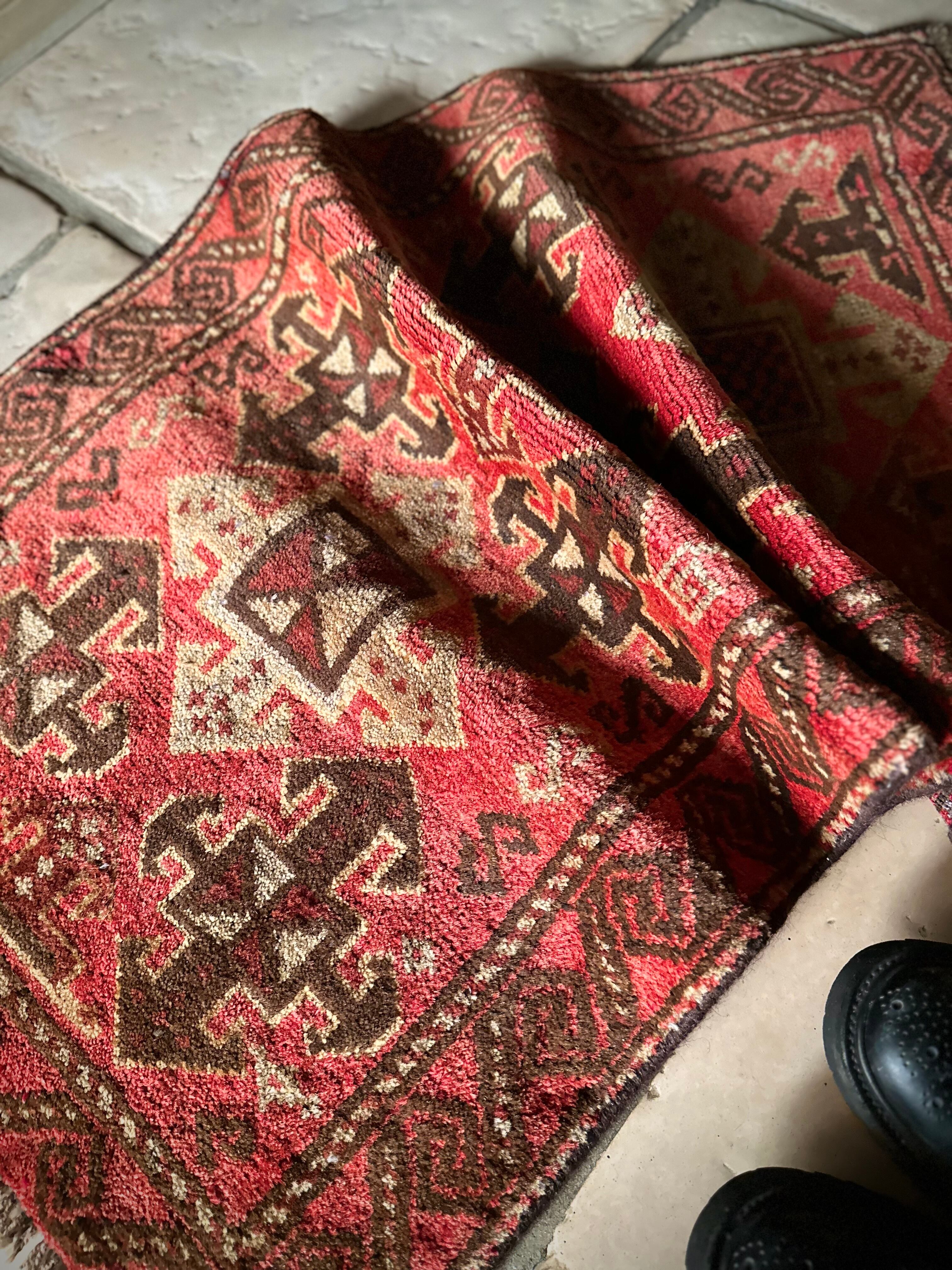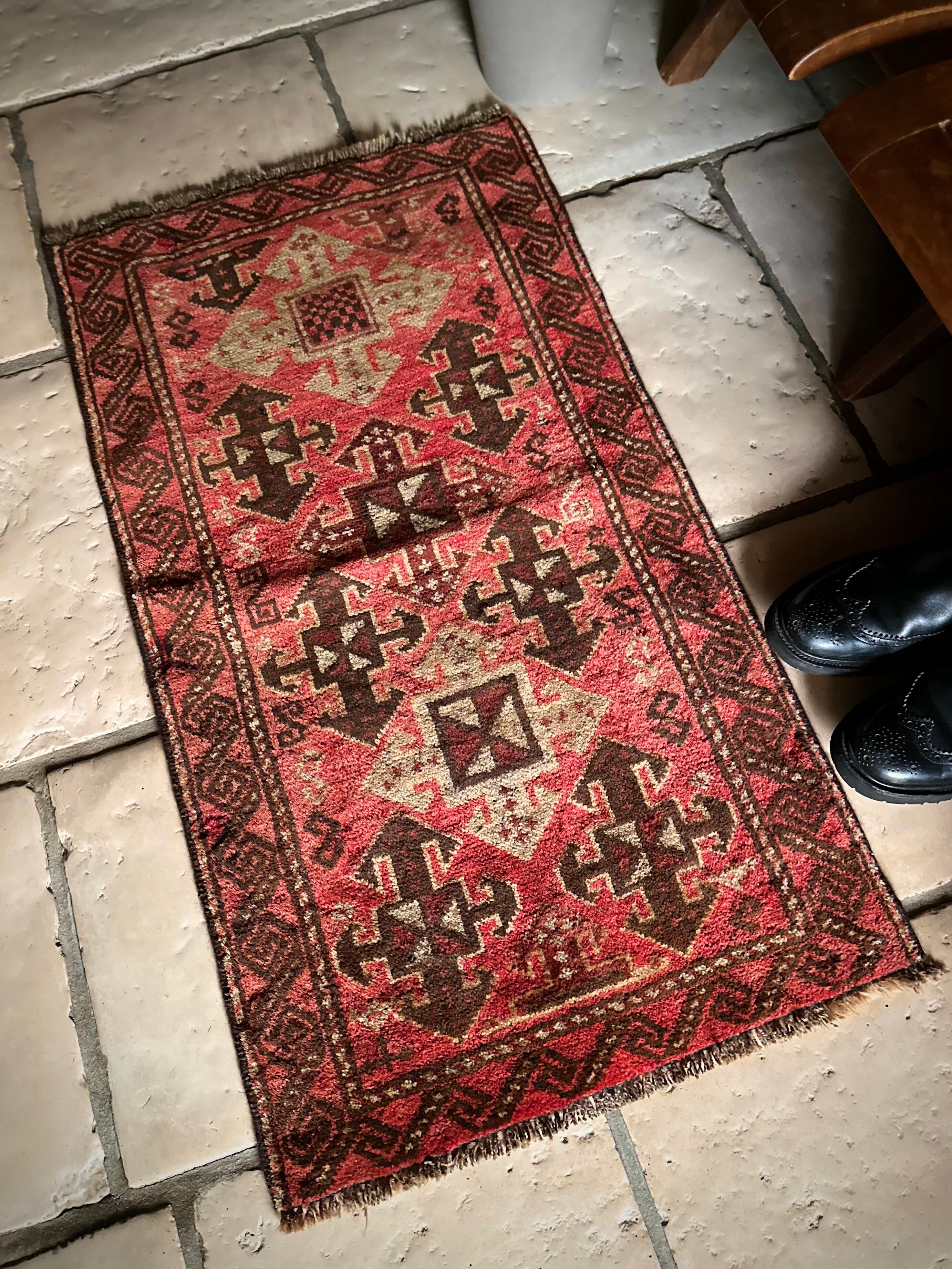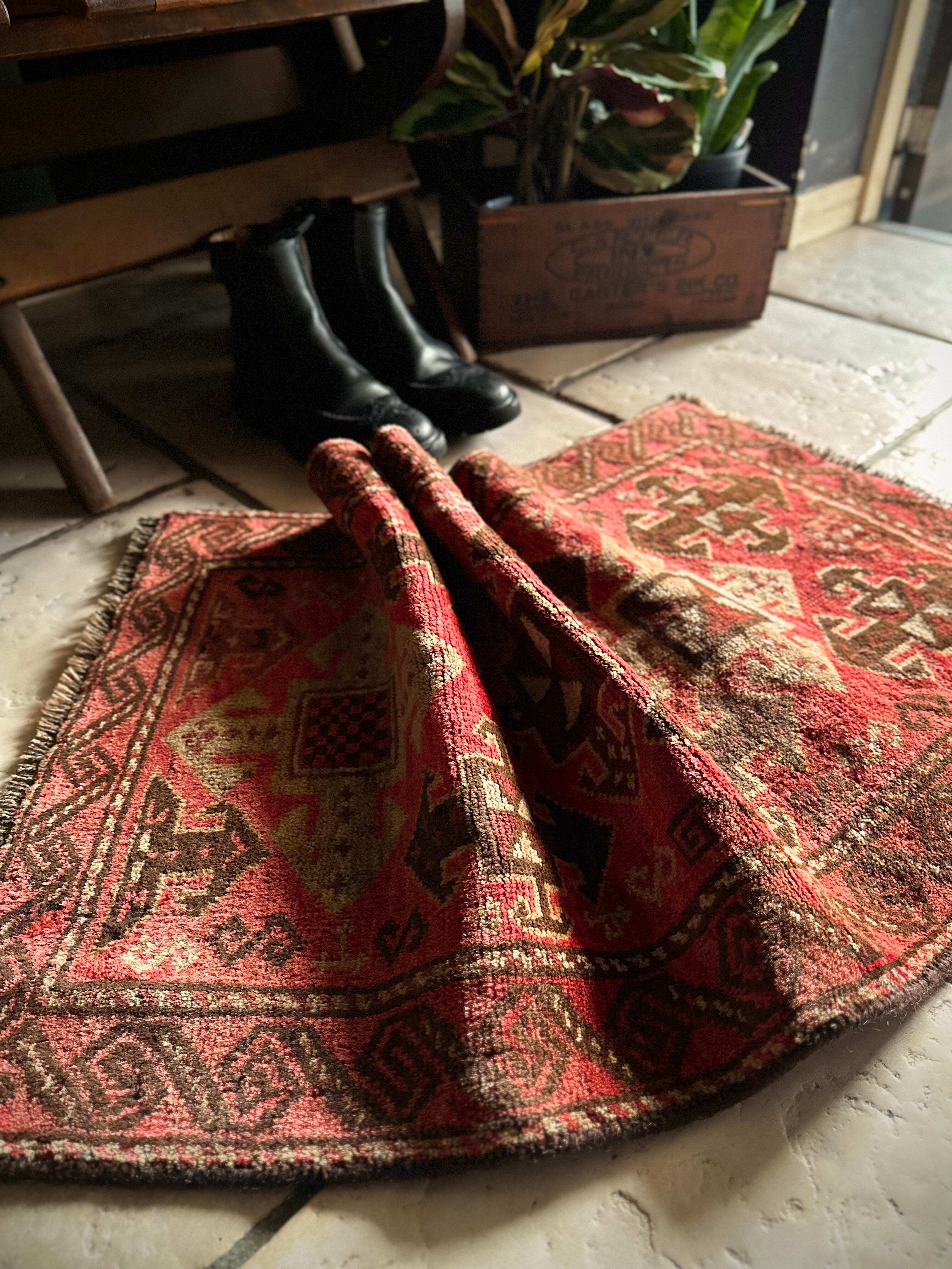 くすんだ赤をベースにべージュやバーガンディと全体的な色褪せ具合がプリミティブ感満載の、アフガニスタンはヘラート州に居住するバルーチ族のトライバルラグで、元々はクッションとしと使用したり、家財道具などを収納するバーリシトと呼ばれる袋状の表皮のみをラグに仕立て直してもらったモノになります。