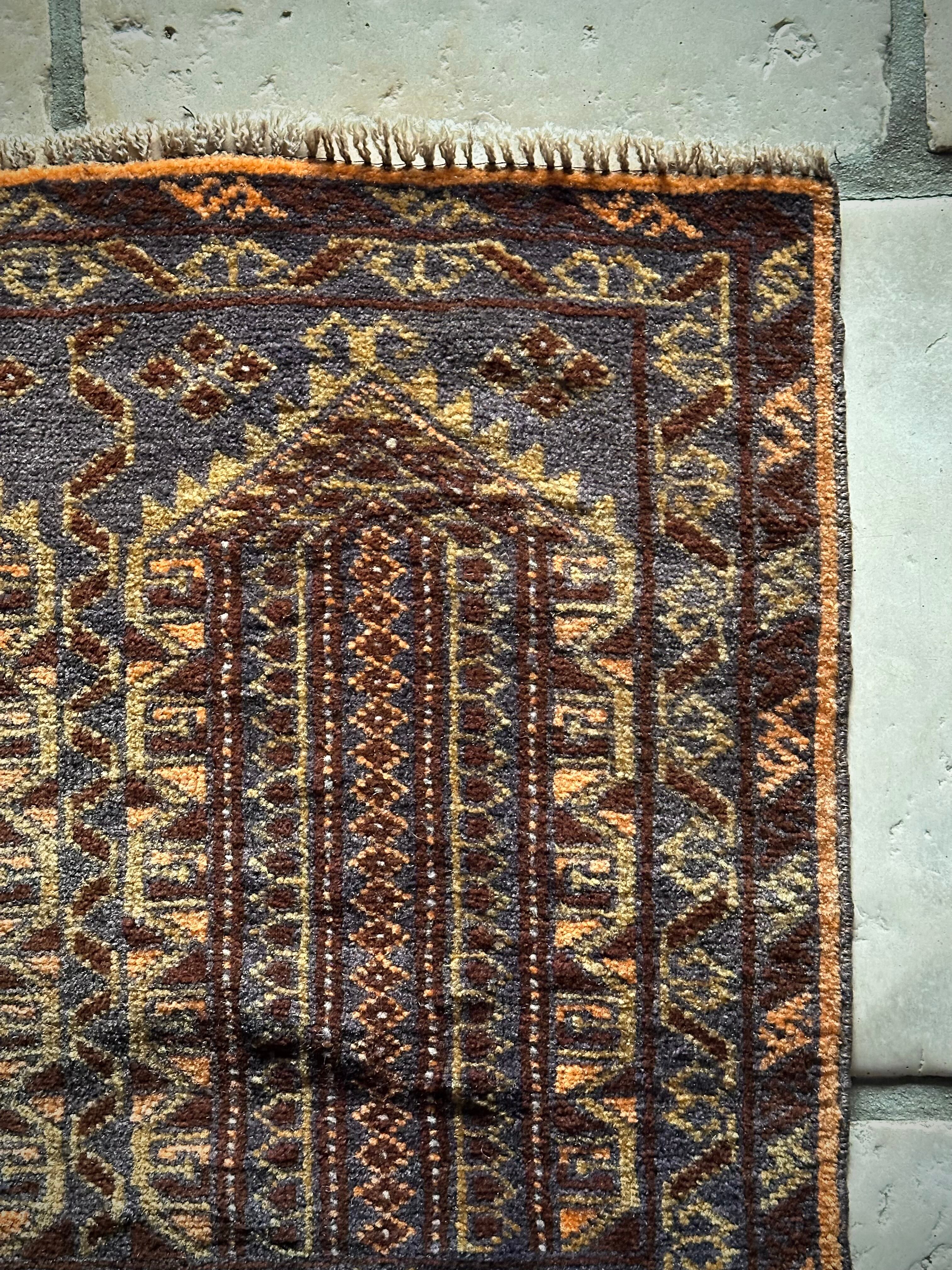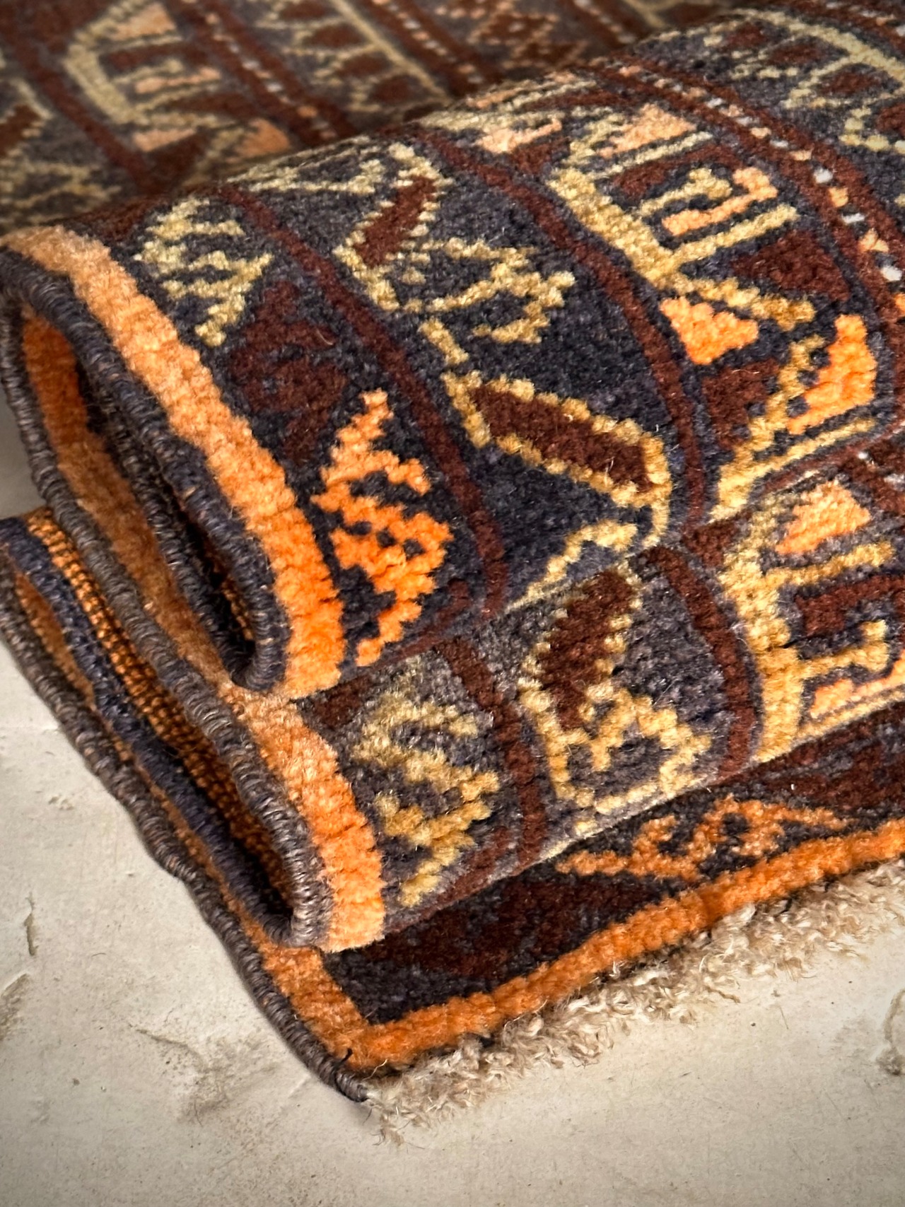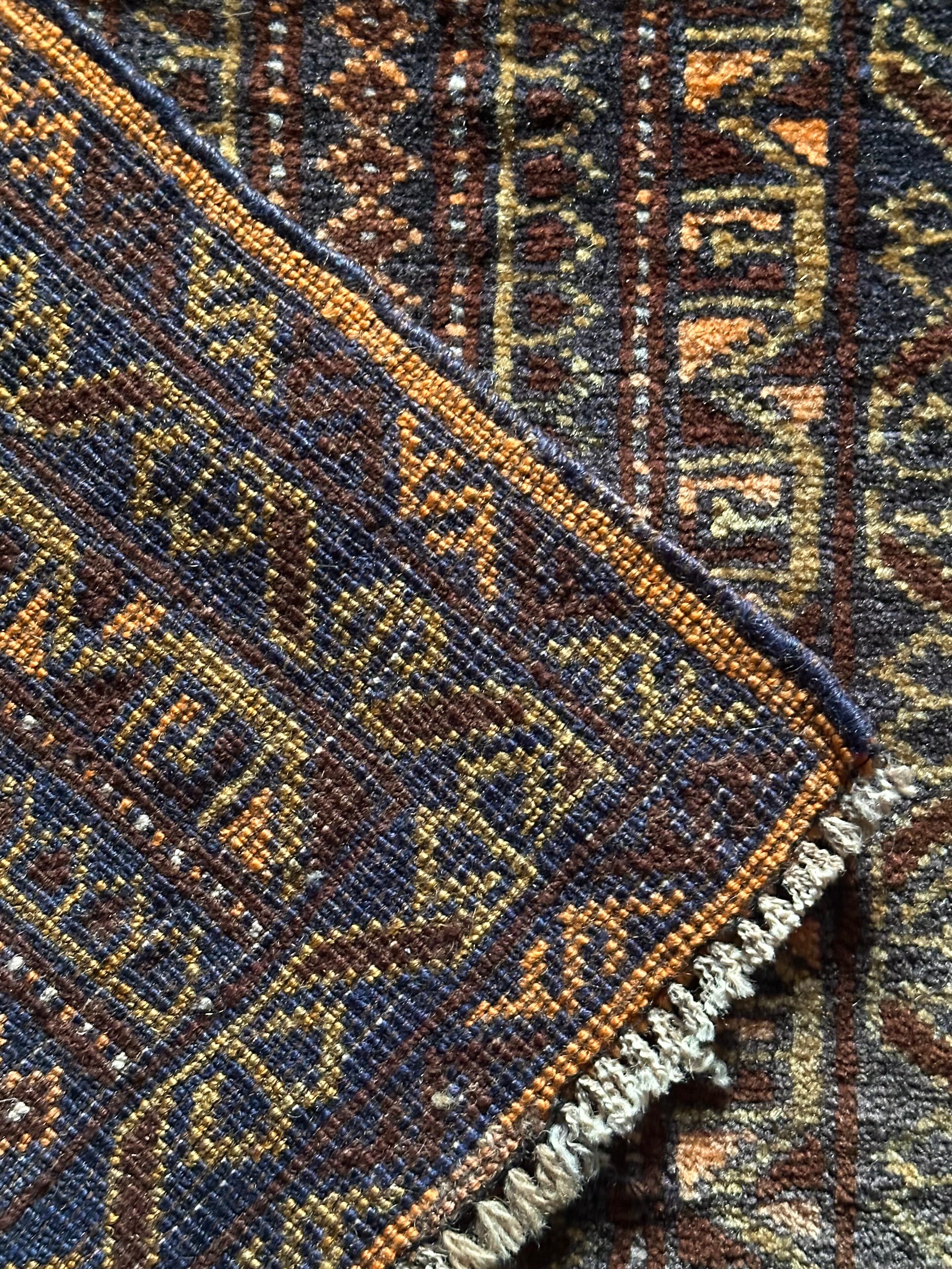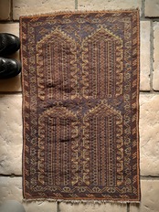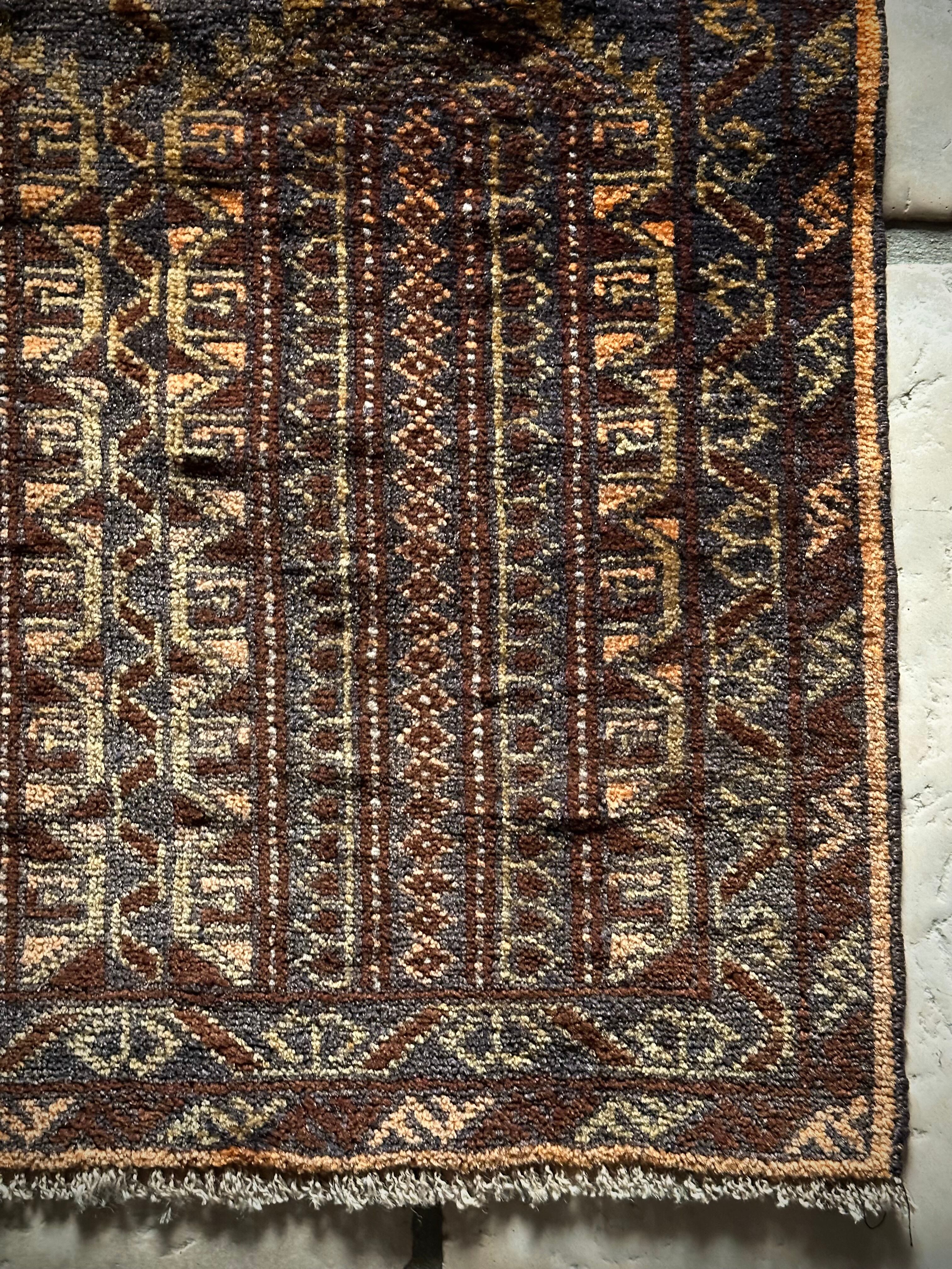 ブラウンベースに褪せたネイビーがグレーに褪色した雰囲気がかっこいい、トルクメニスタンとの国境付近にあるチットチャックトゥ村で織られた、トルクメン族のアリホジャと呼ばれるトライバルラグになります。