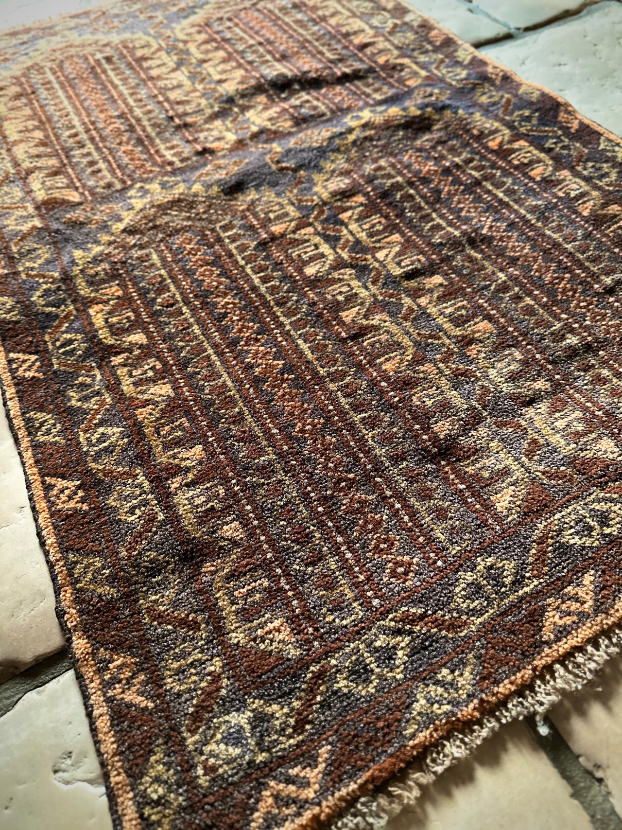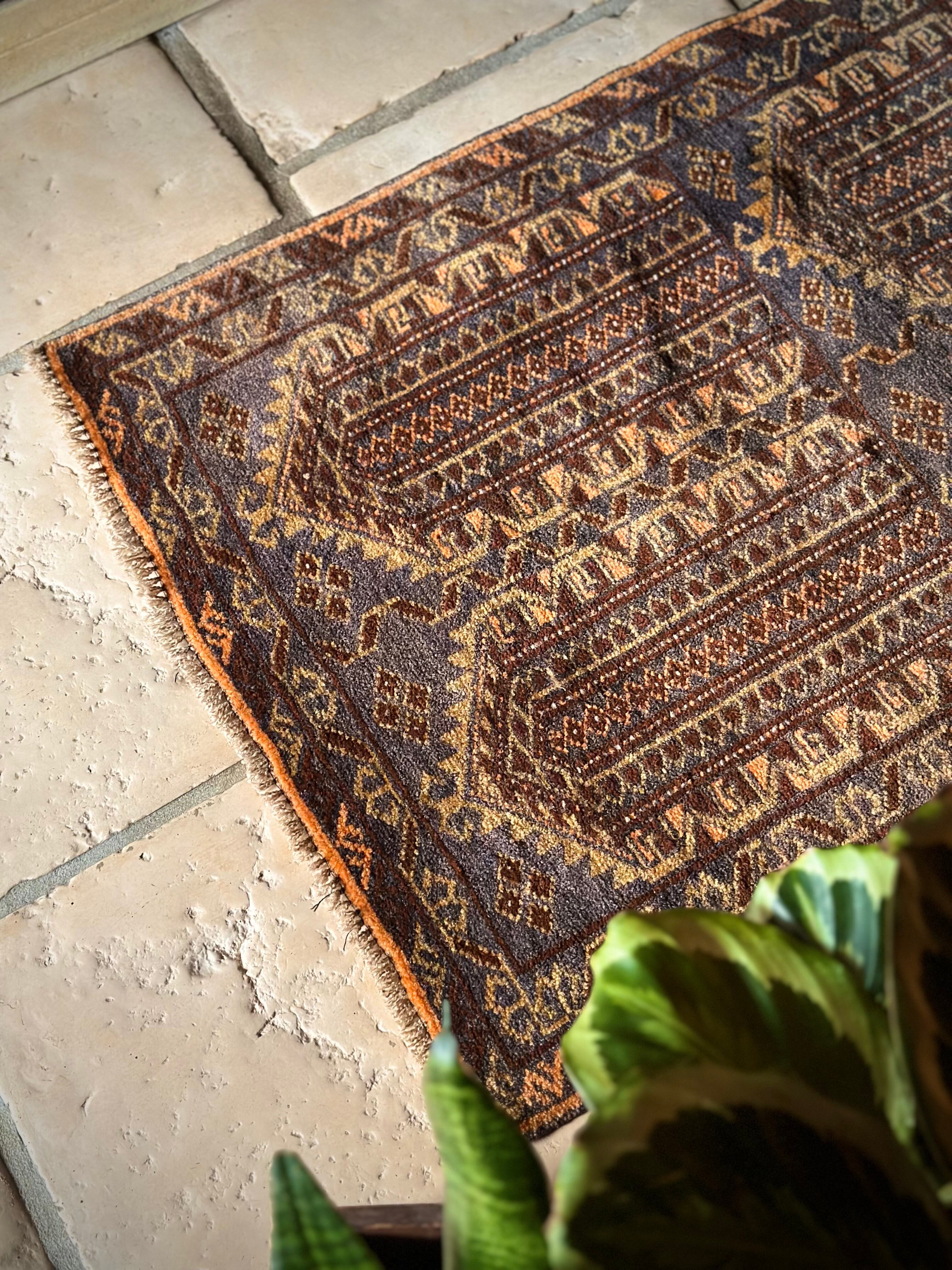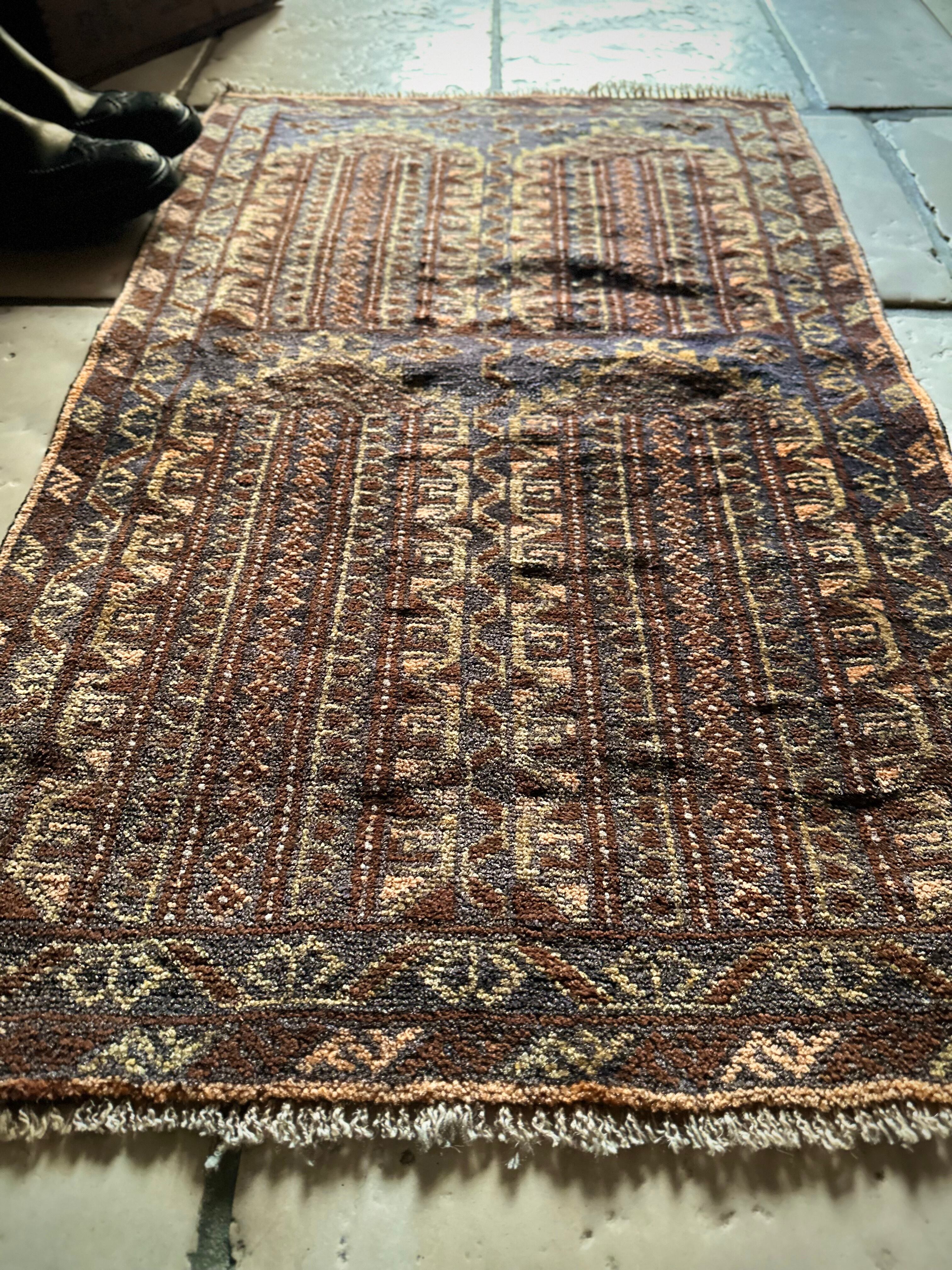 経年としては55年となり経年劣化による色褪せはありますが、特に目立つダメージやリペア箇所は見当たらないグッドなコンディションで、大きさ的にも玄関マットからちょっとしたアクセントラグとして使い勝手の良いサイズ感になります。