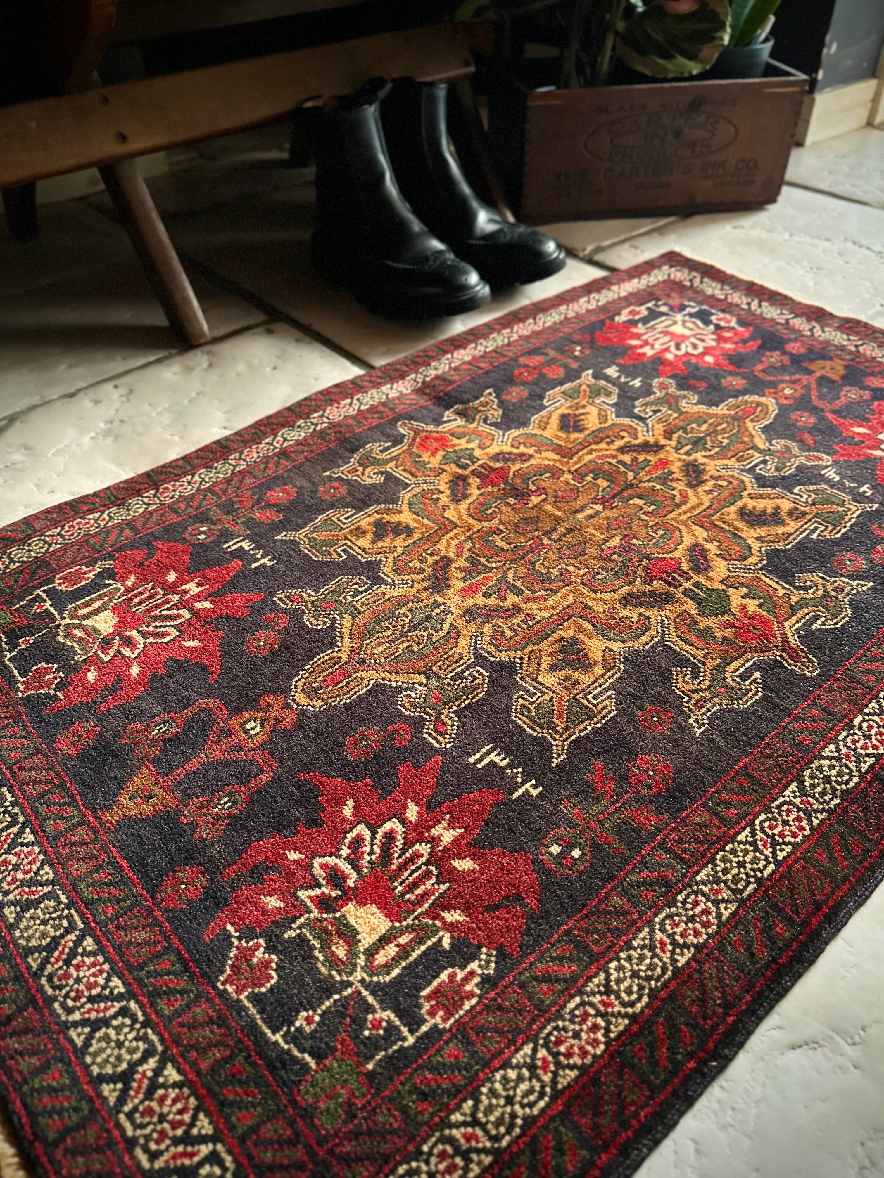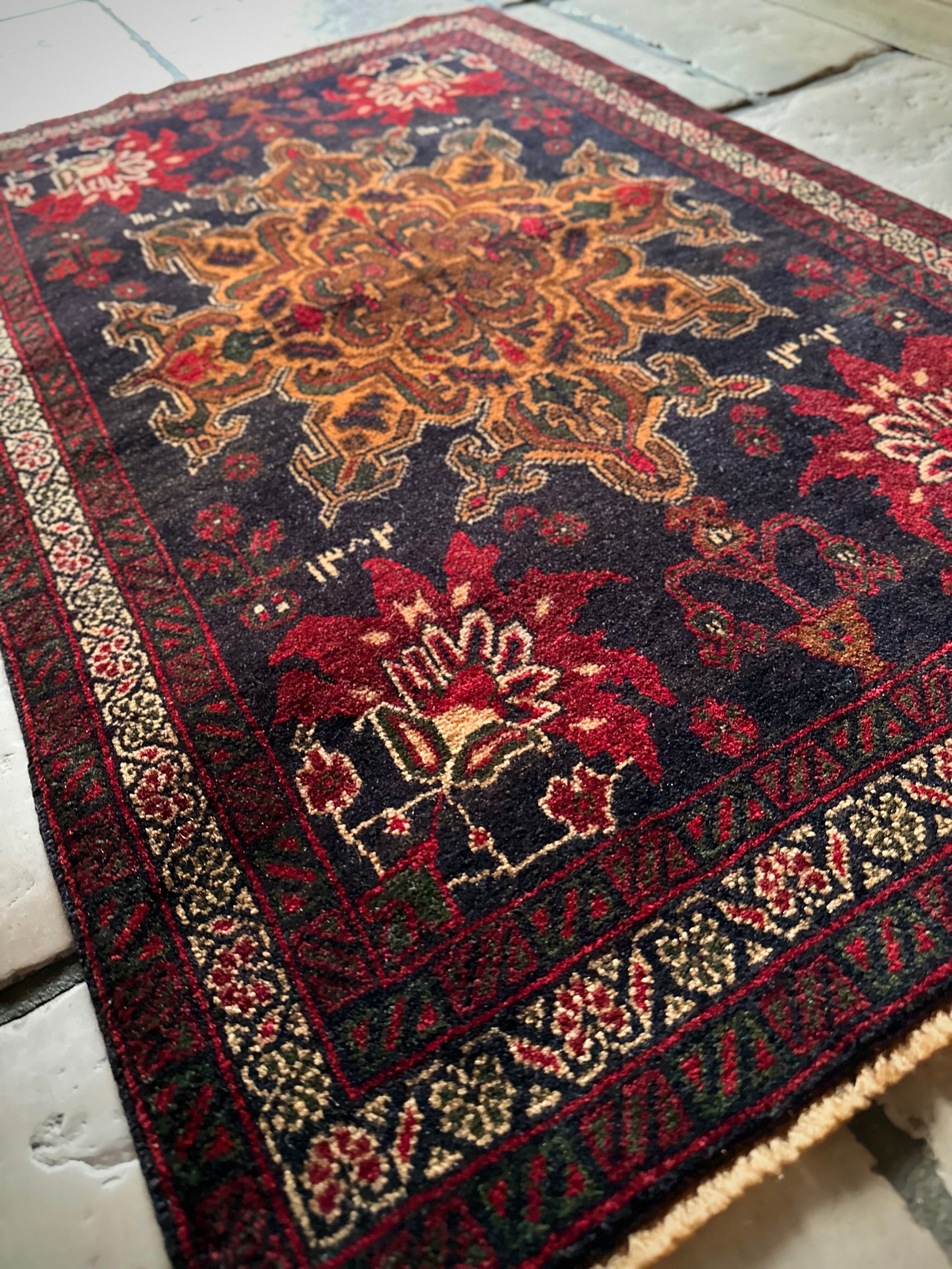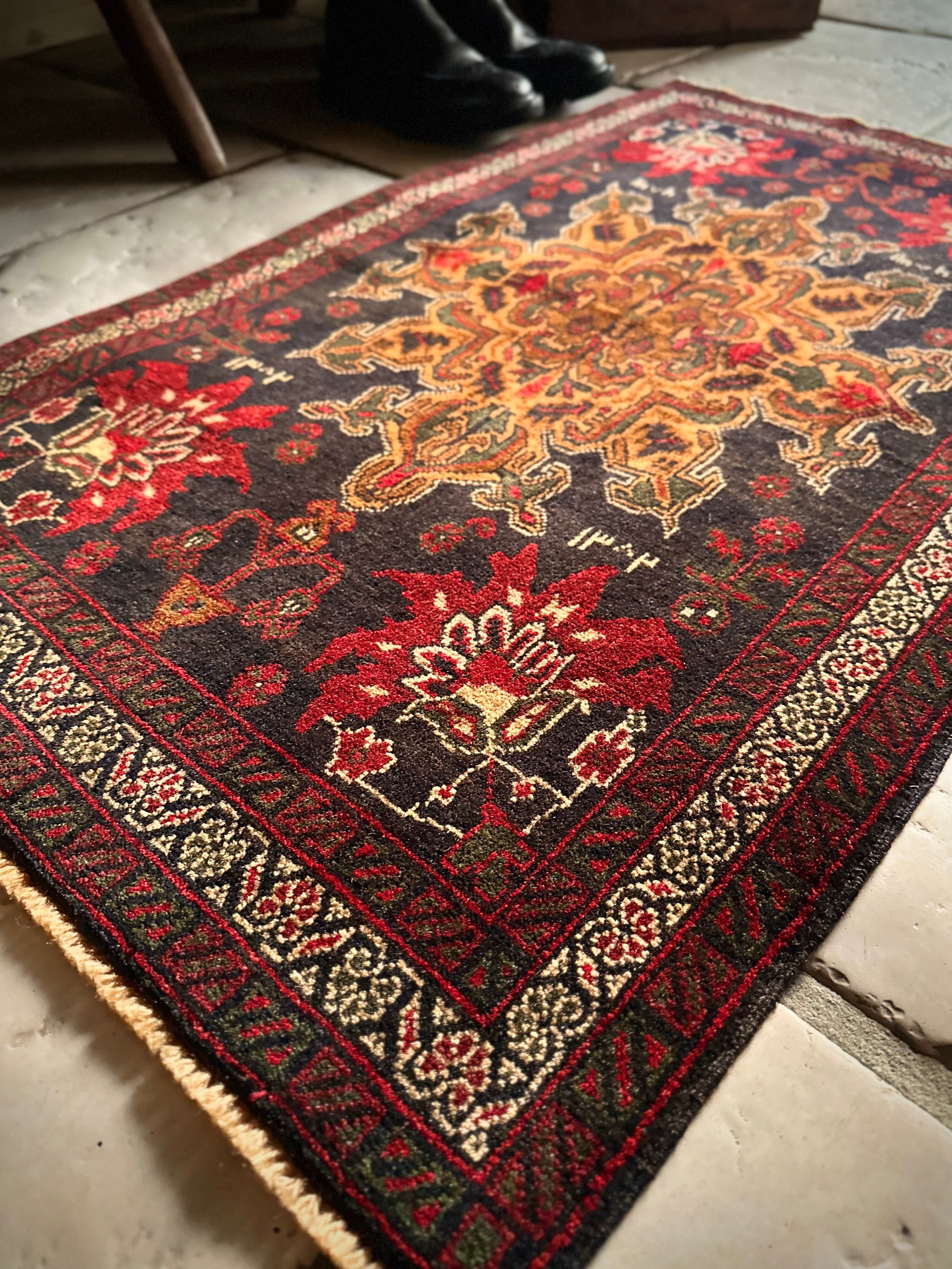 経年としては50年のヴィンテージ品ながらも特に目立つダメージにリペア箇所はなく、織りもしっかりとしていて、パイル自体は短めですがしっとりとした肌触りになり、小振りなサイズが多目的に使えそうなアクセントラグになります。