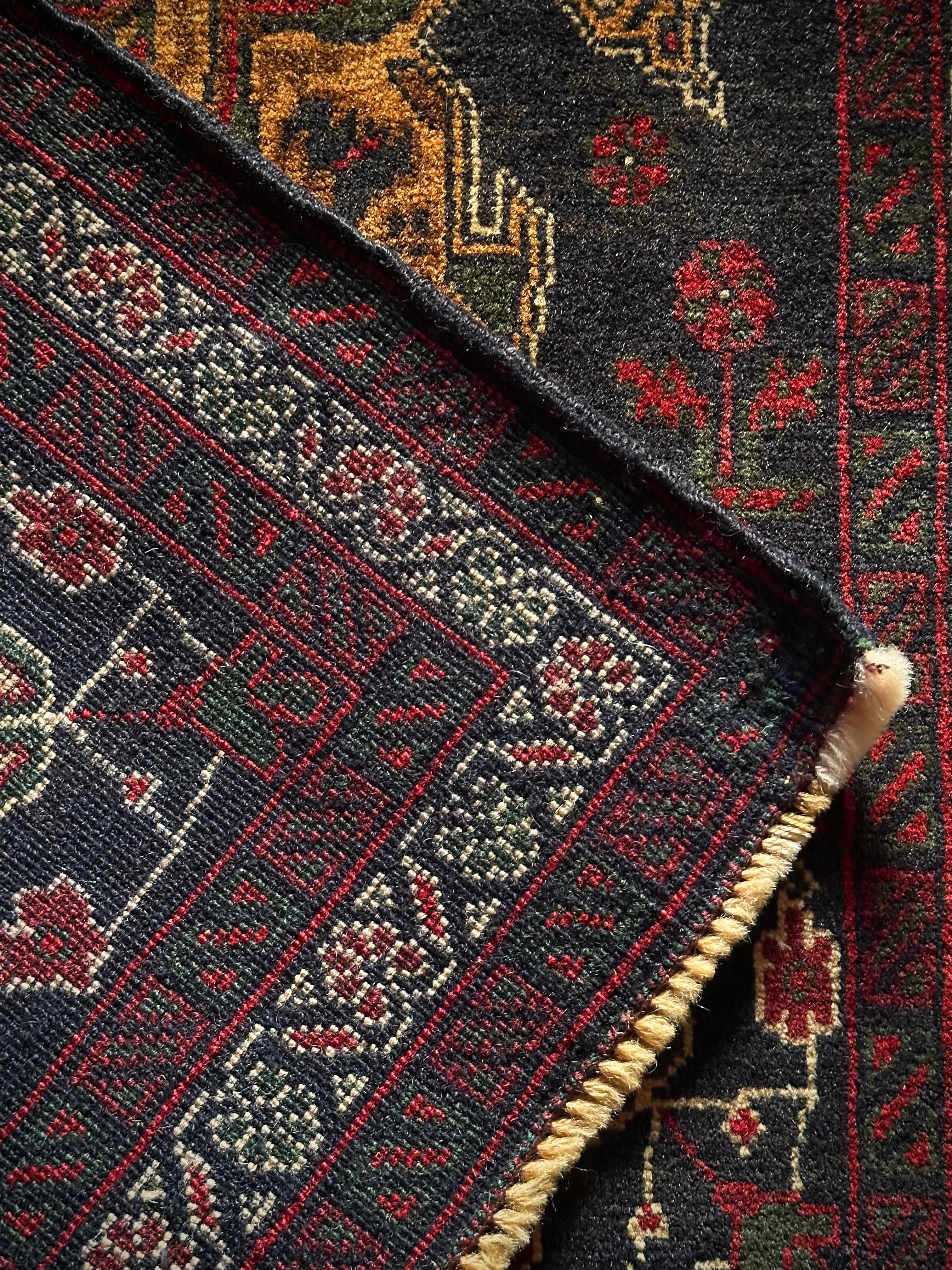 ブラックベースにホワイトラインで浮き彫りにされたヘラティ紋様のような絵図が、独特な不気味さを漂わせているアフガニスタン産らしいバルーチ族のトライバルラグになります。