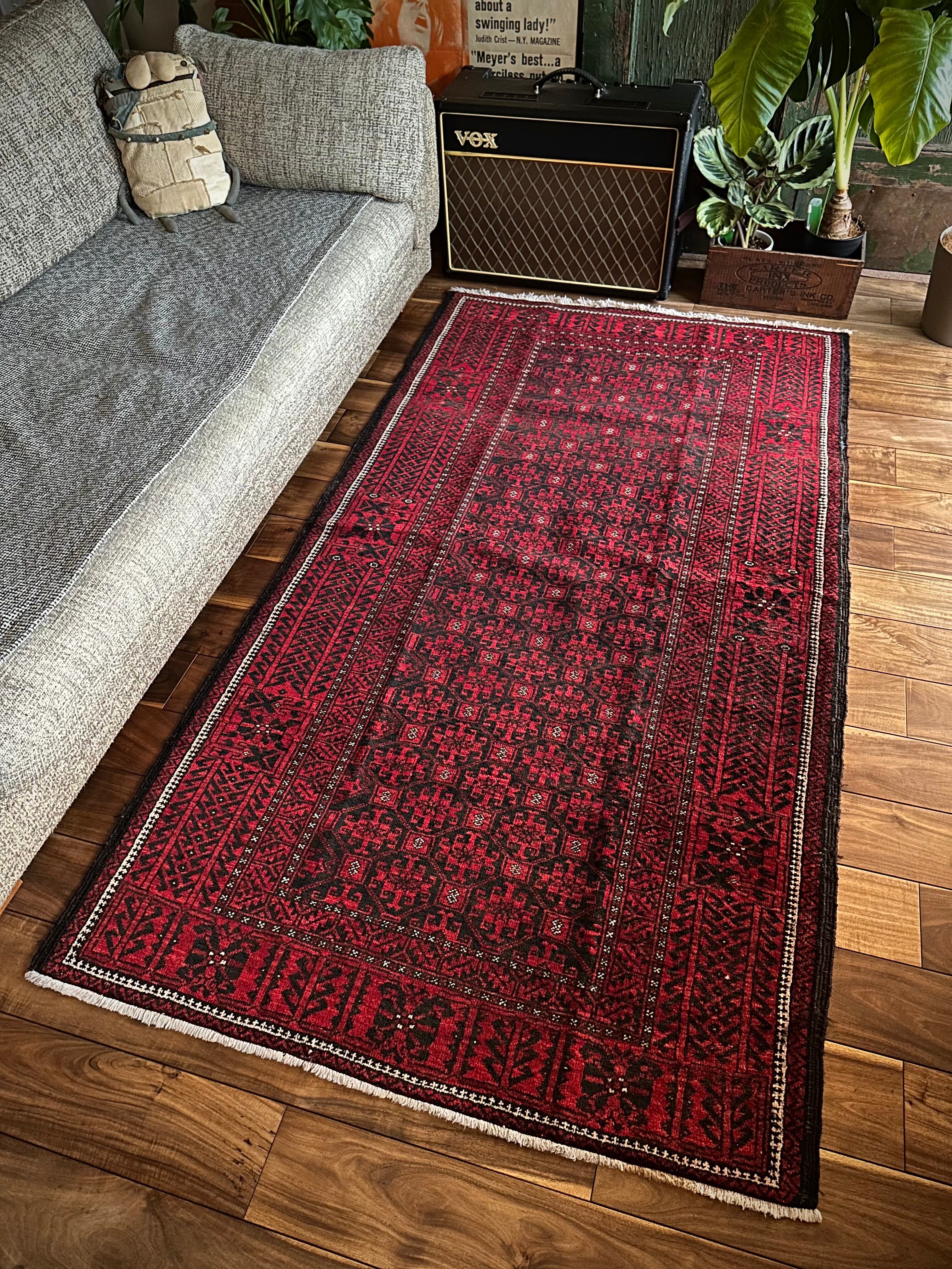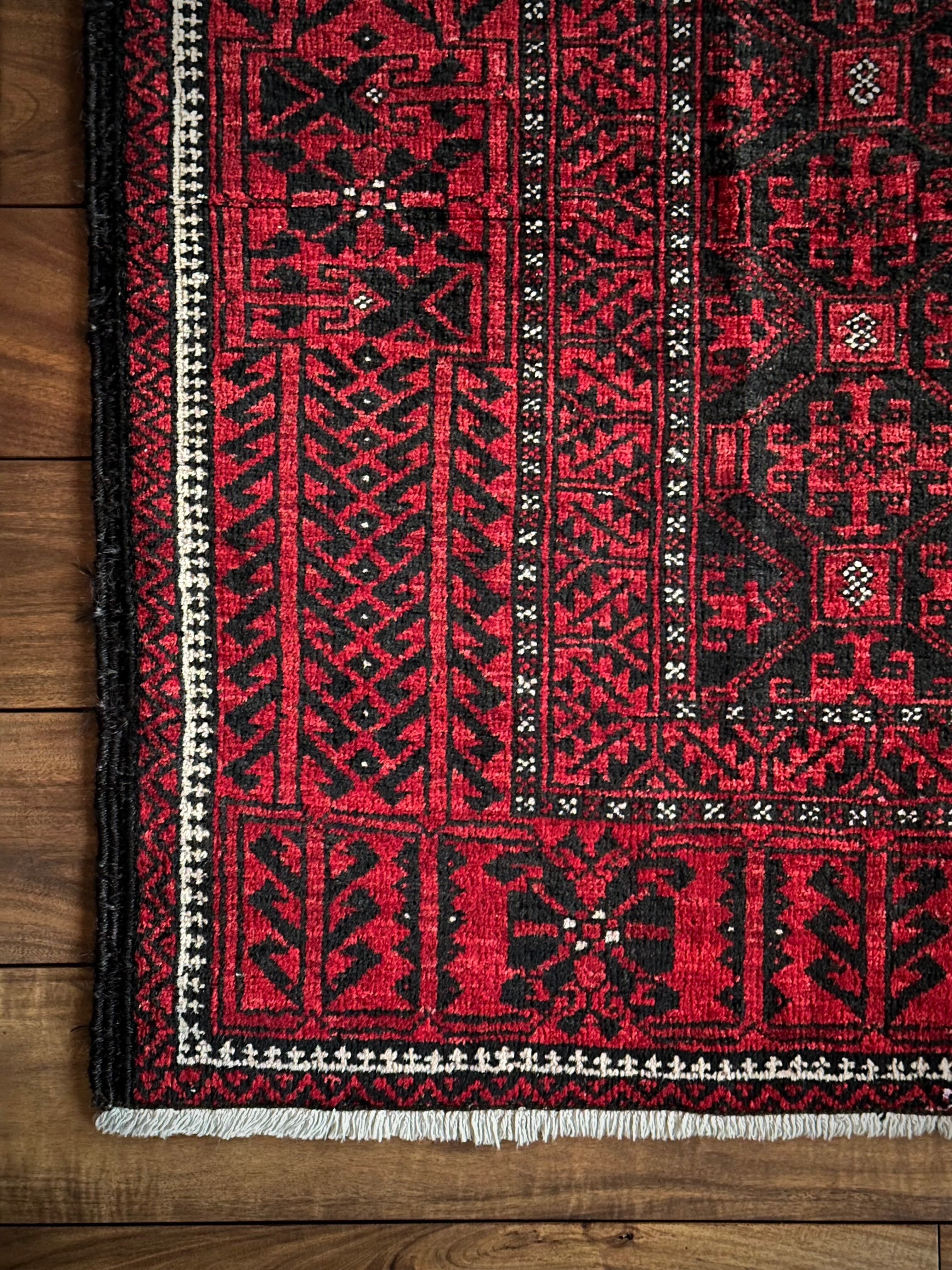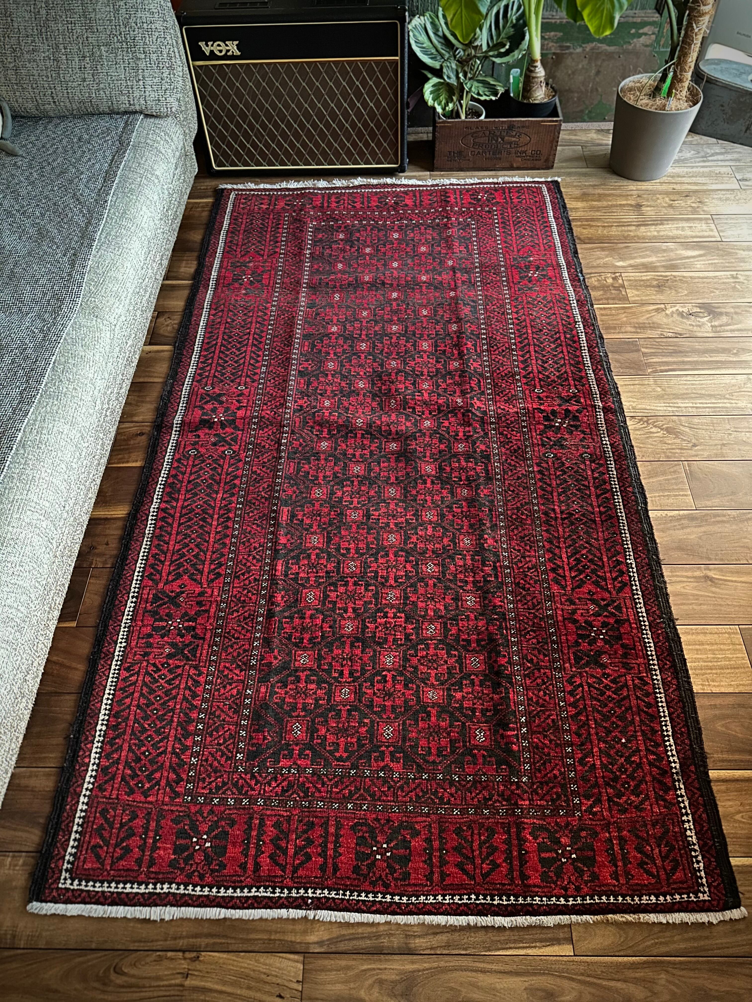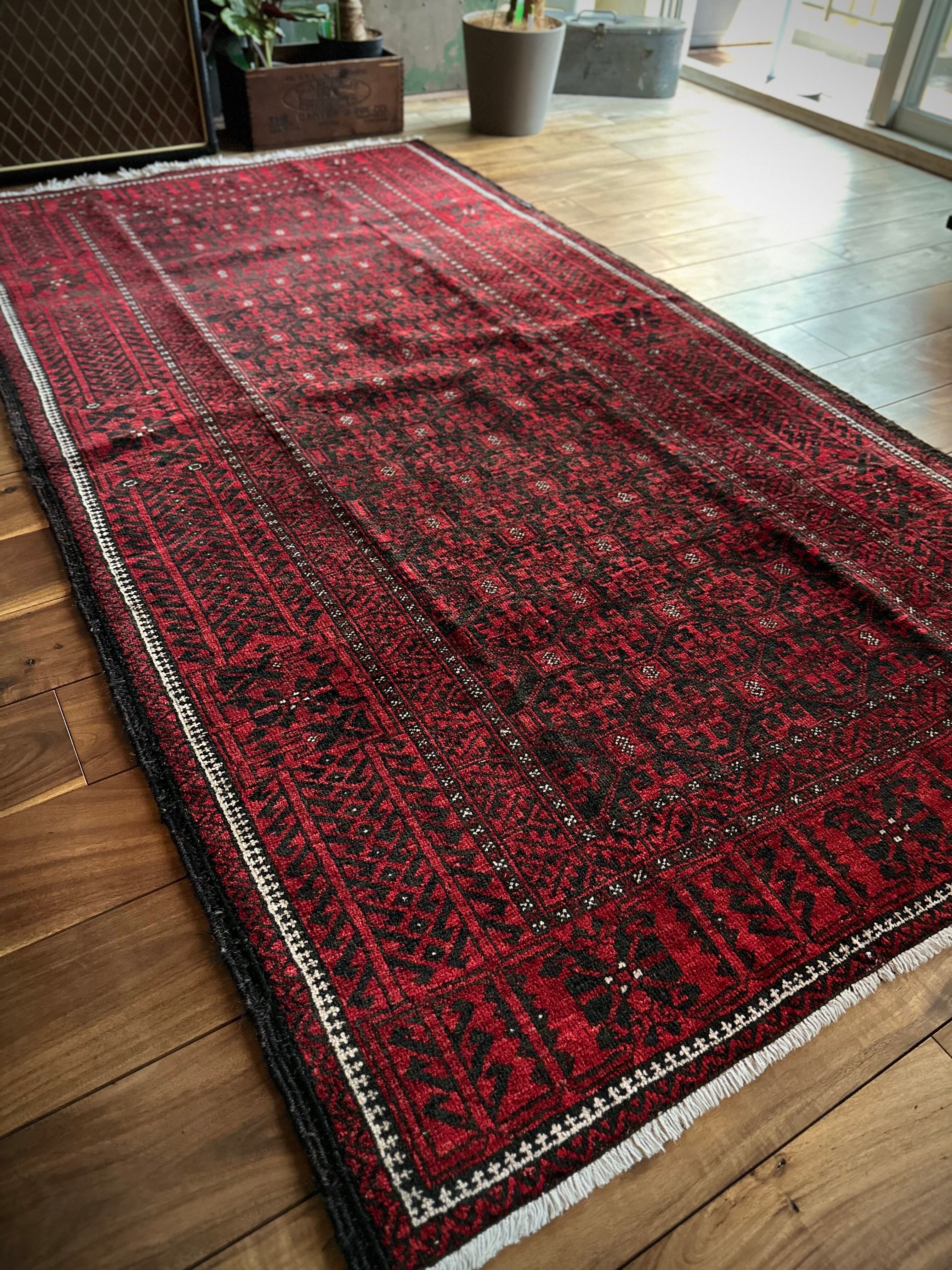 緻密に計算された細かな連続紋様に小さな白い花をモチーフとしたミナハニ模様が散りばめられた、イラン東部に居住するバルーチ族のトライバルラグで、ブラック&レッドのバルーチらしいシンプルな色合いがかっこいい1枚になります。
