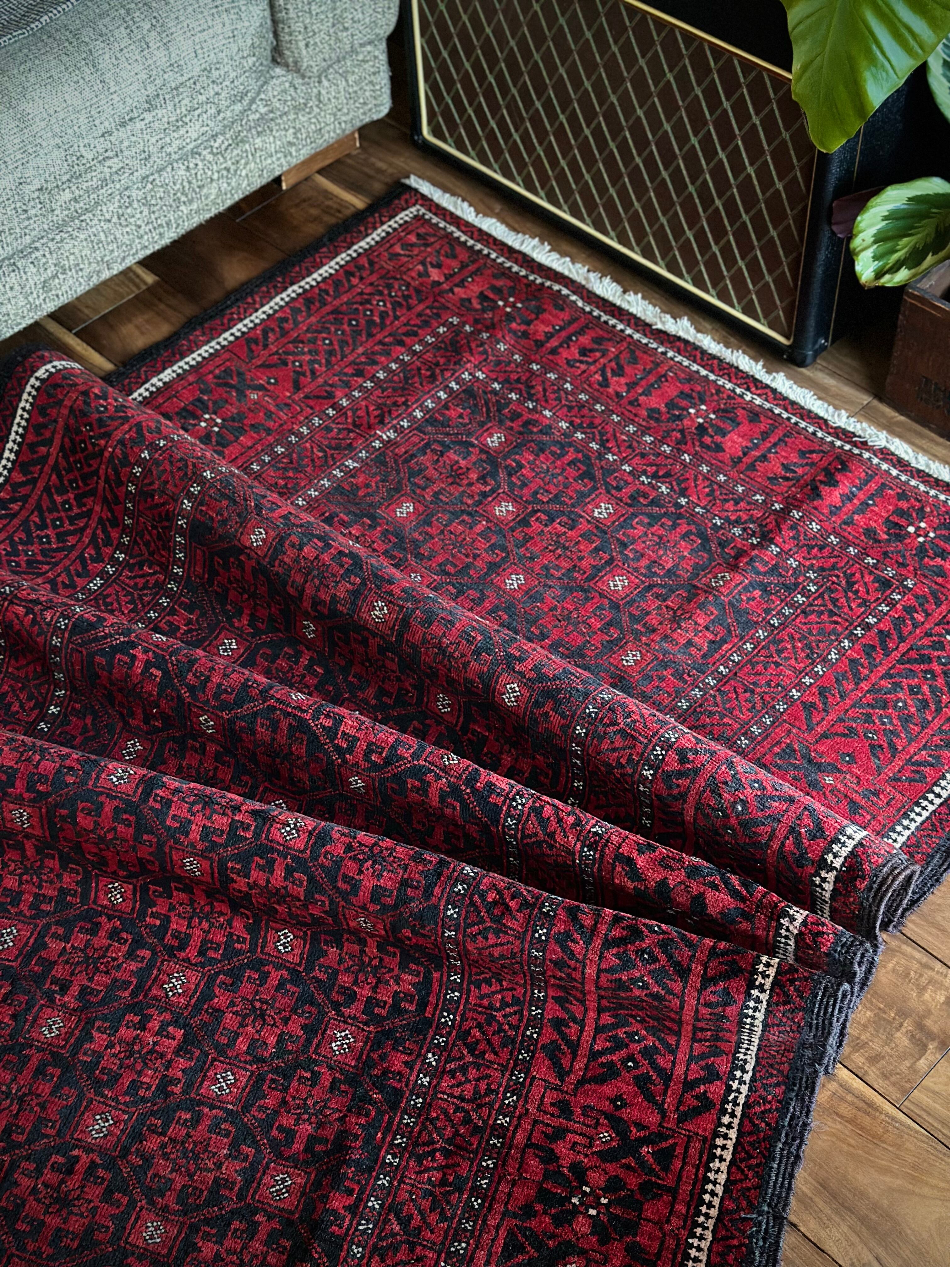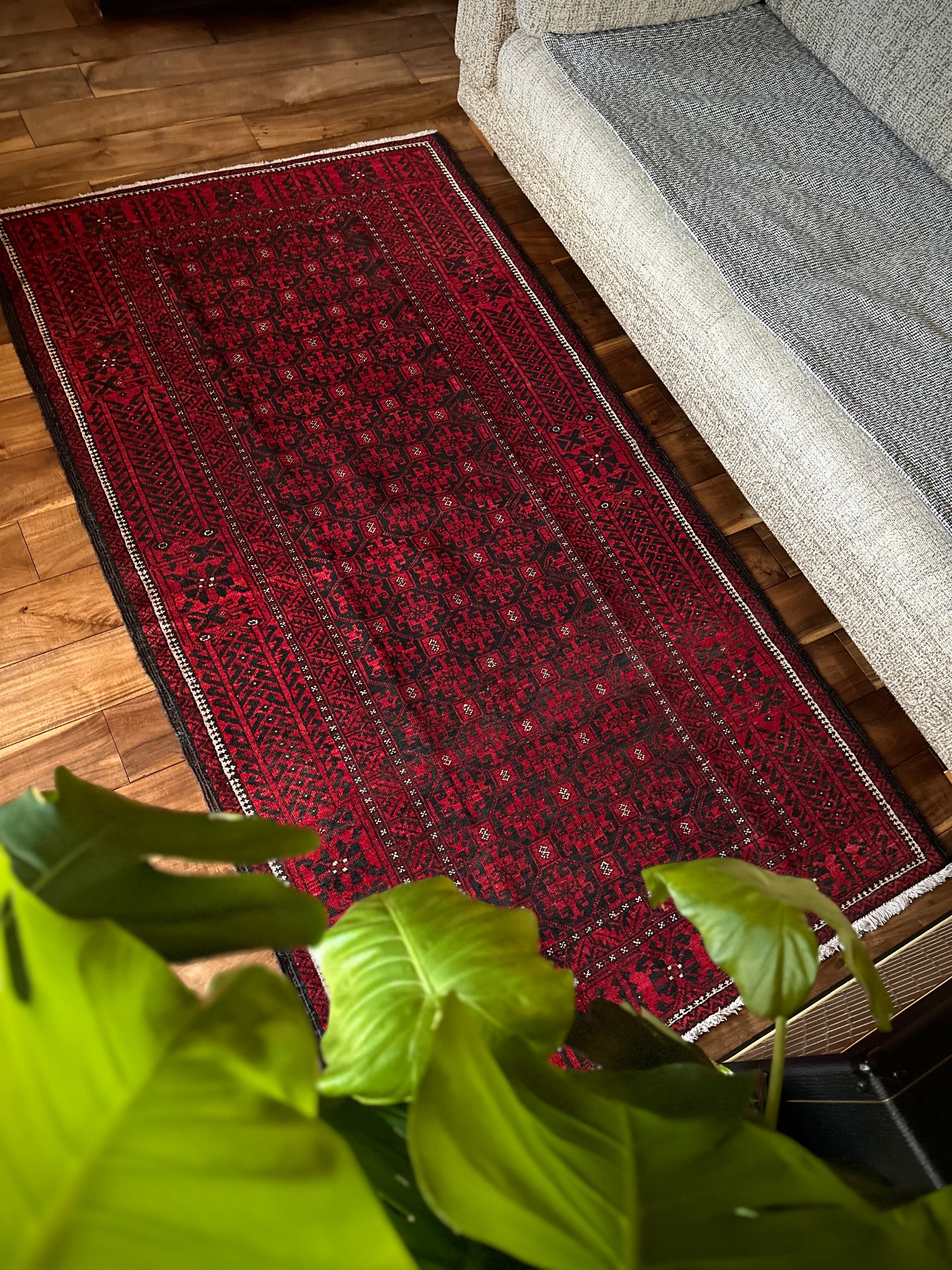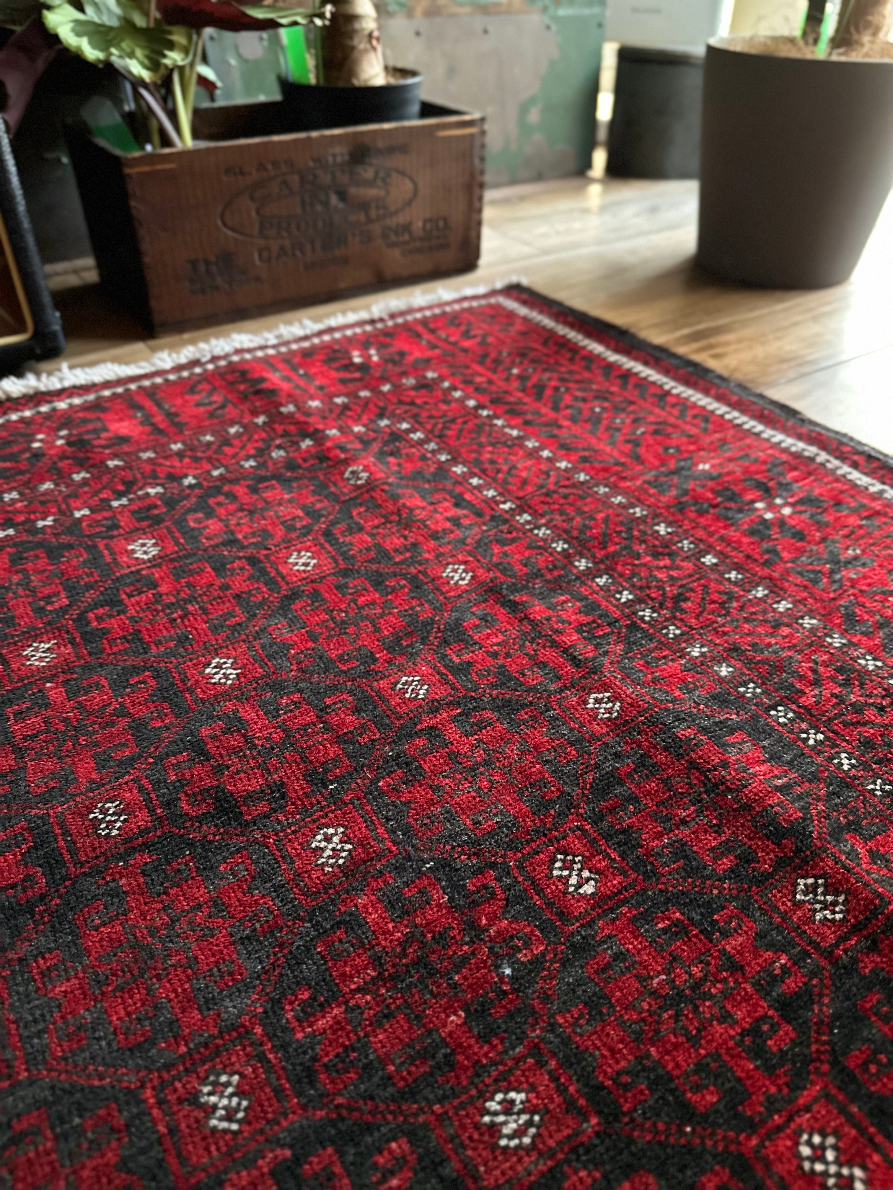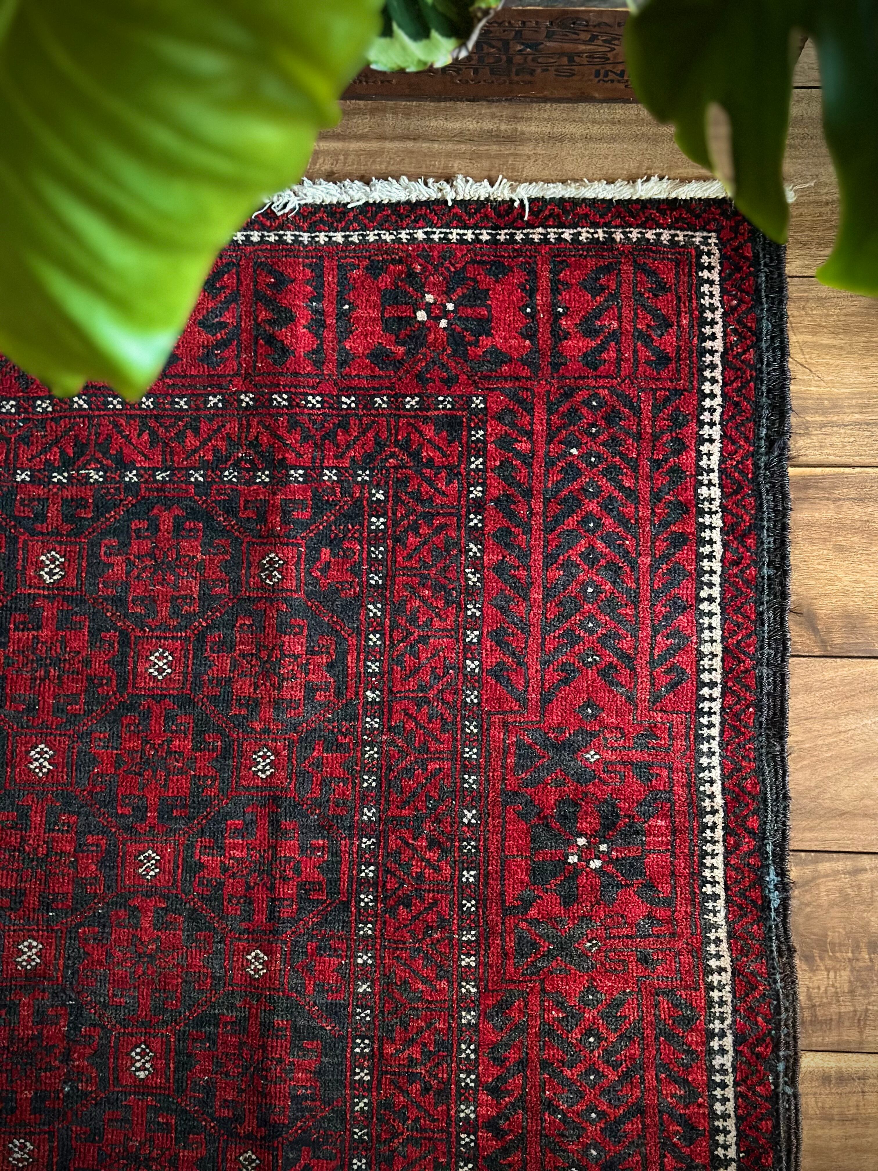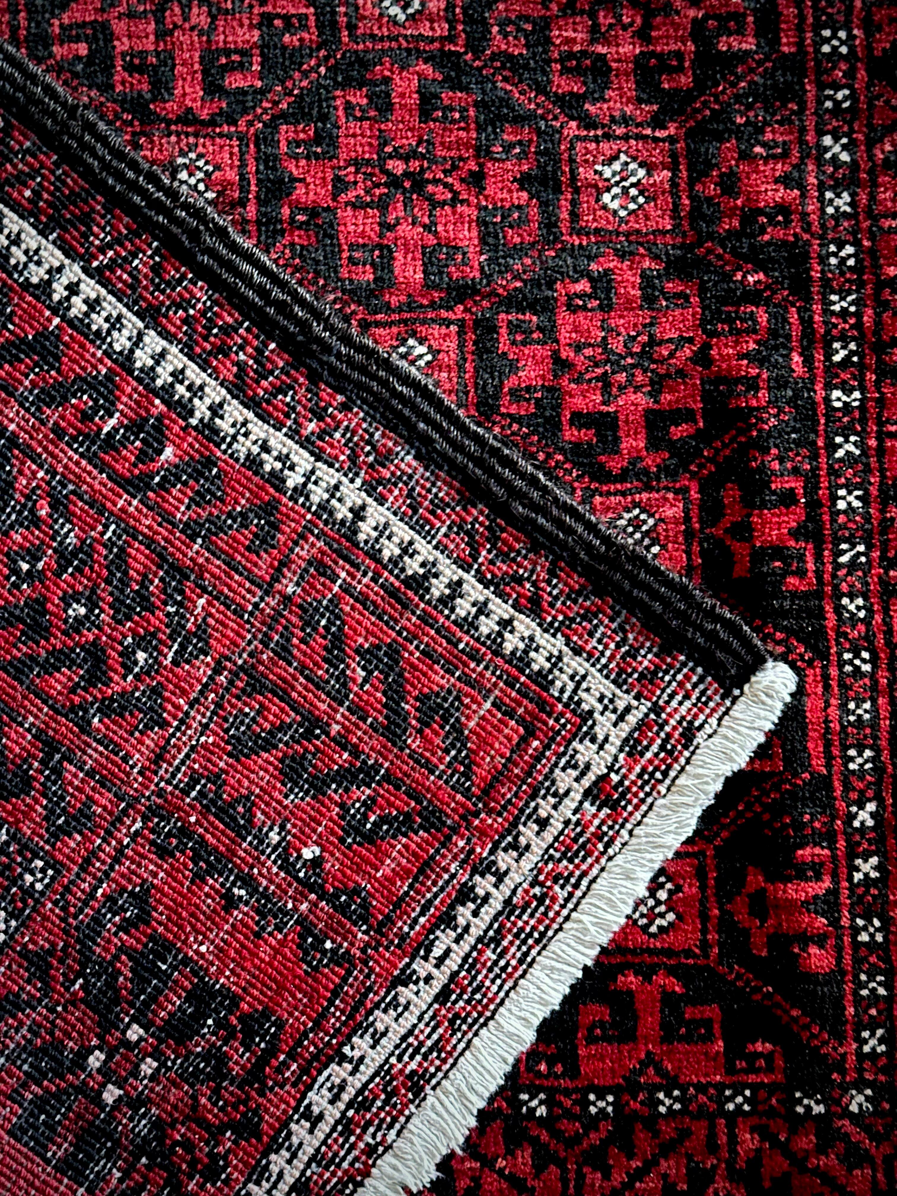 緻密に計算された細かな連続紋様に小さな白い花をモチーフとしたミナハニ模様が散りばめられた、イラン東部に居住するバルーチ族のトライバルラグで、ブラック&レッドのバルーチらしいシンプルな色合いがかっこいい1枚になります。
